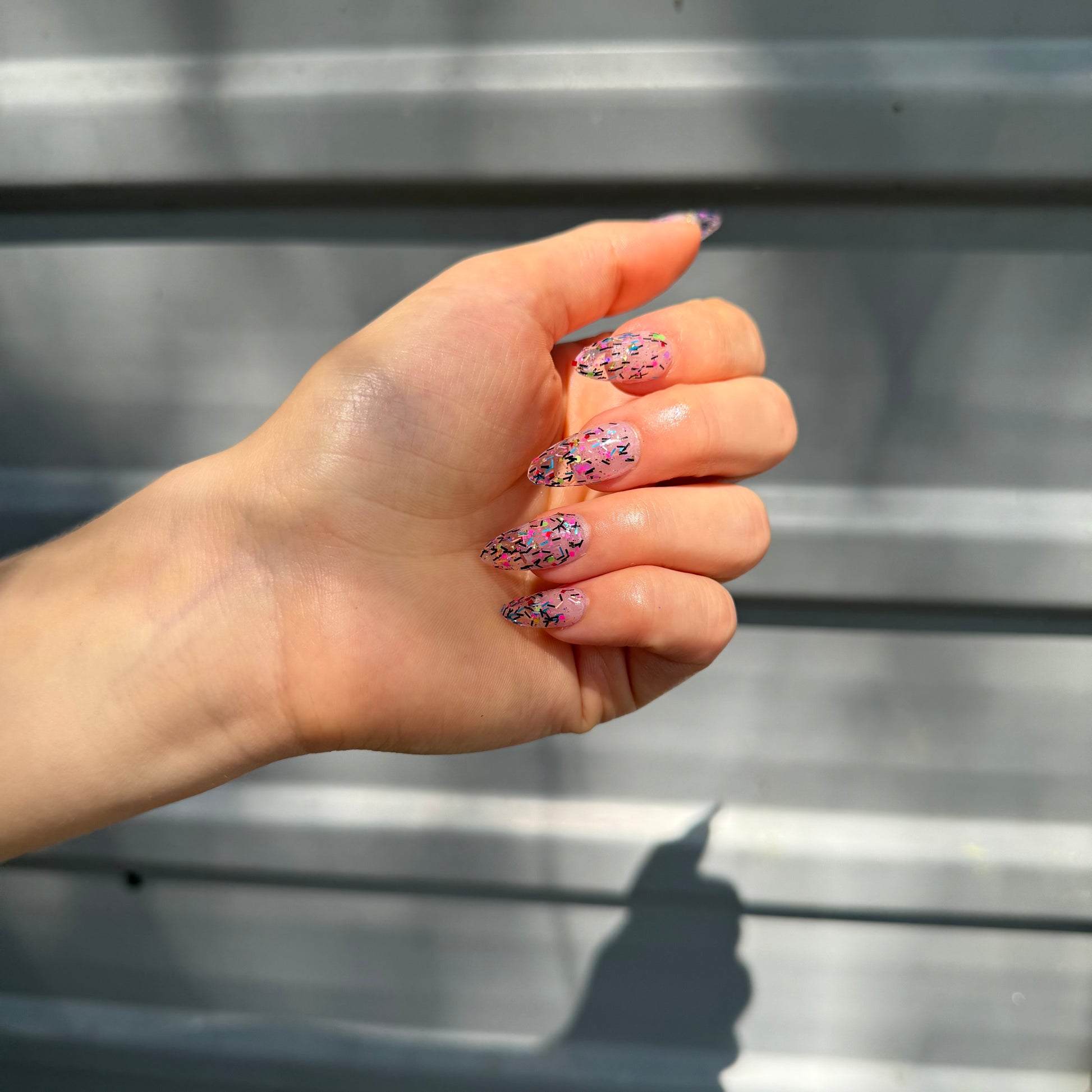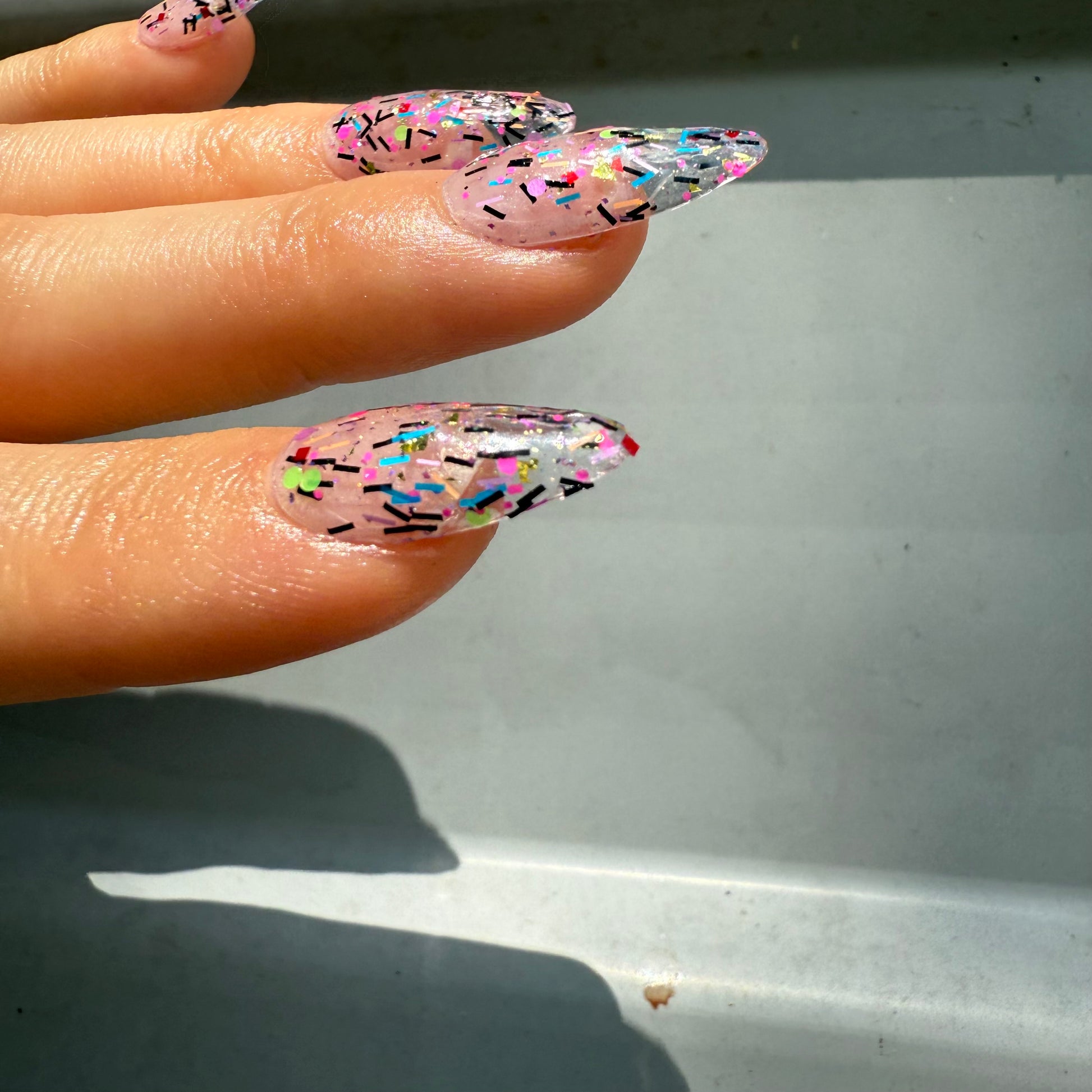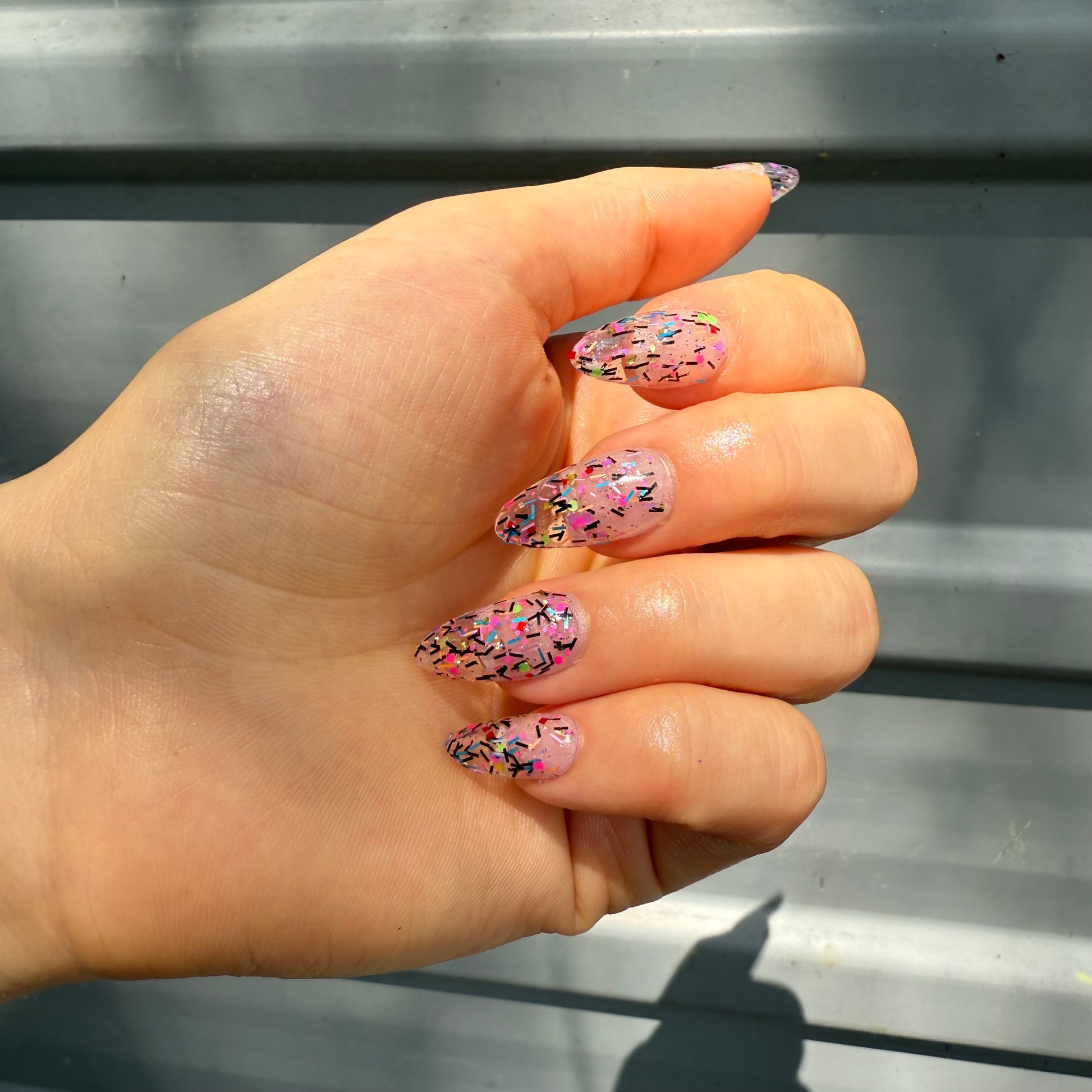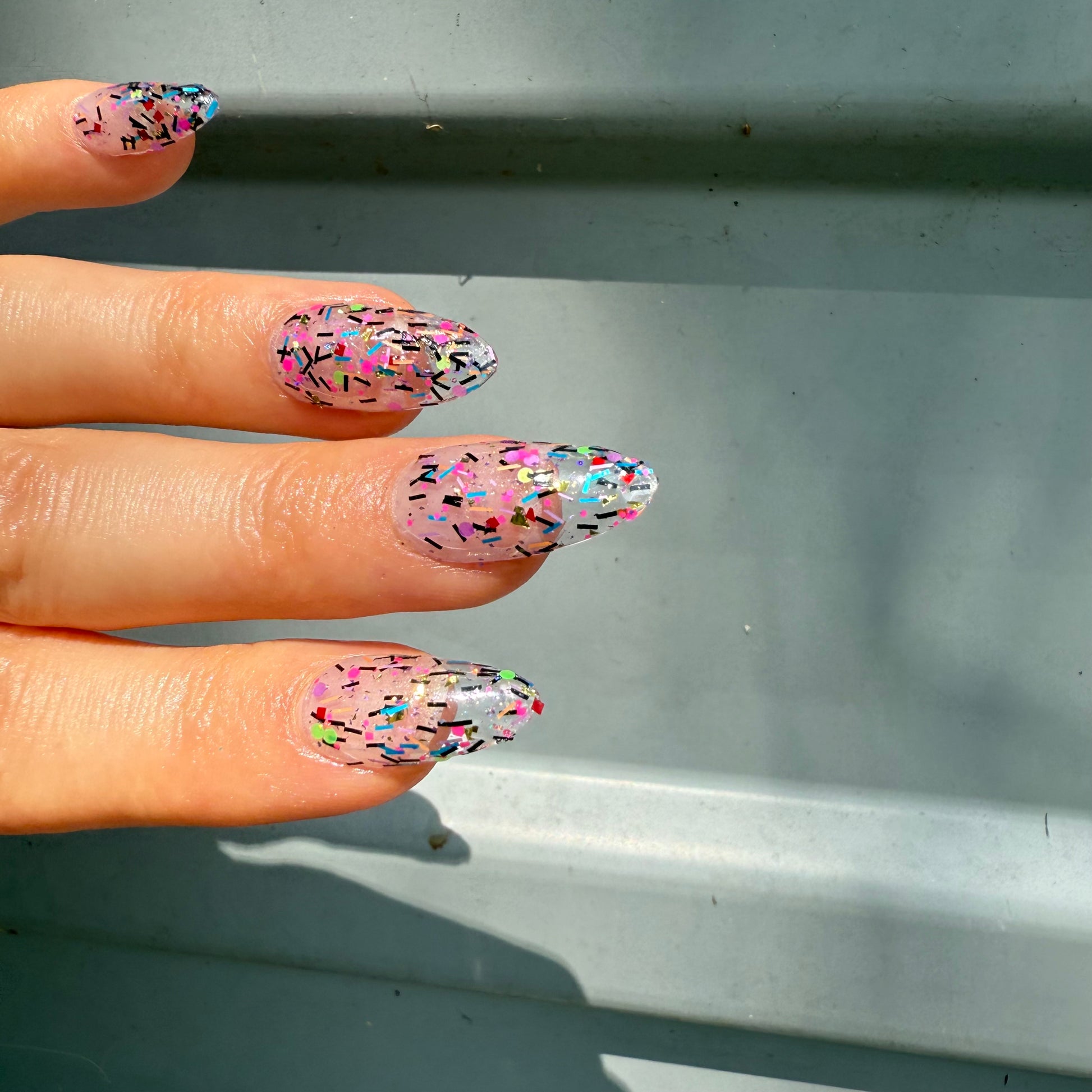 Sheer base with a variety of neon glitter shapes and shards paired with stark black bars. The clash of color and shape gives this polish an offbeat, almost collage-like effect. Playful and over the top. It’s a shade that feels like Friday night at the skate rink when you discovered how to fly on rollerblades. Or, strangely, cats. Chaotic cats.