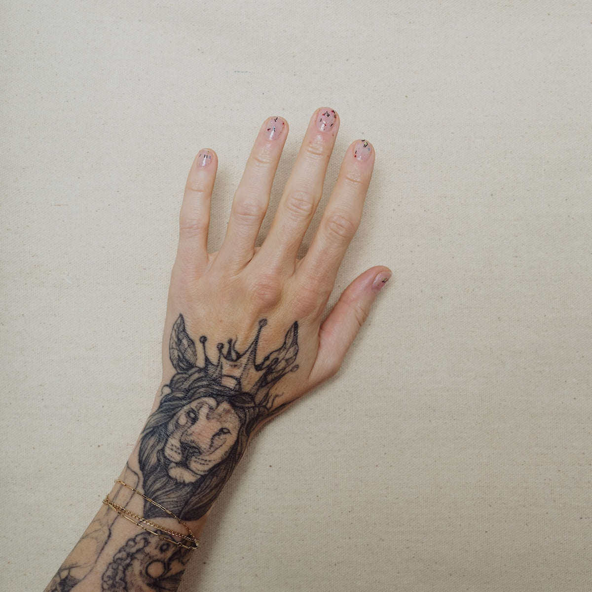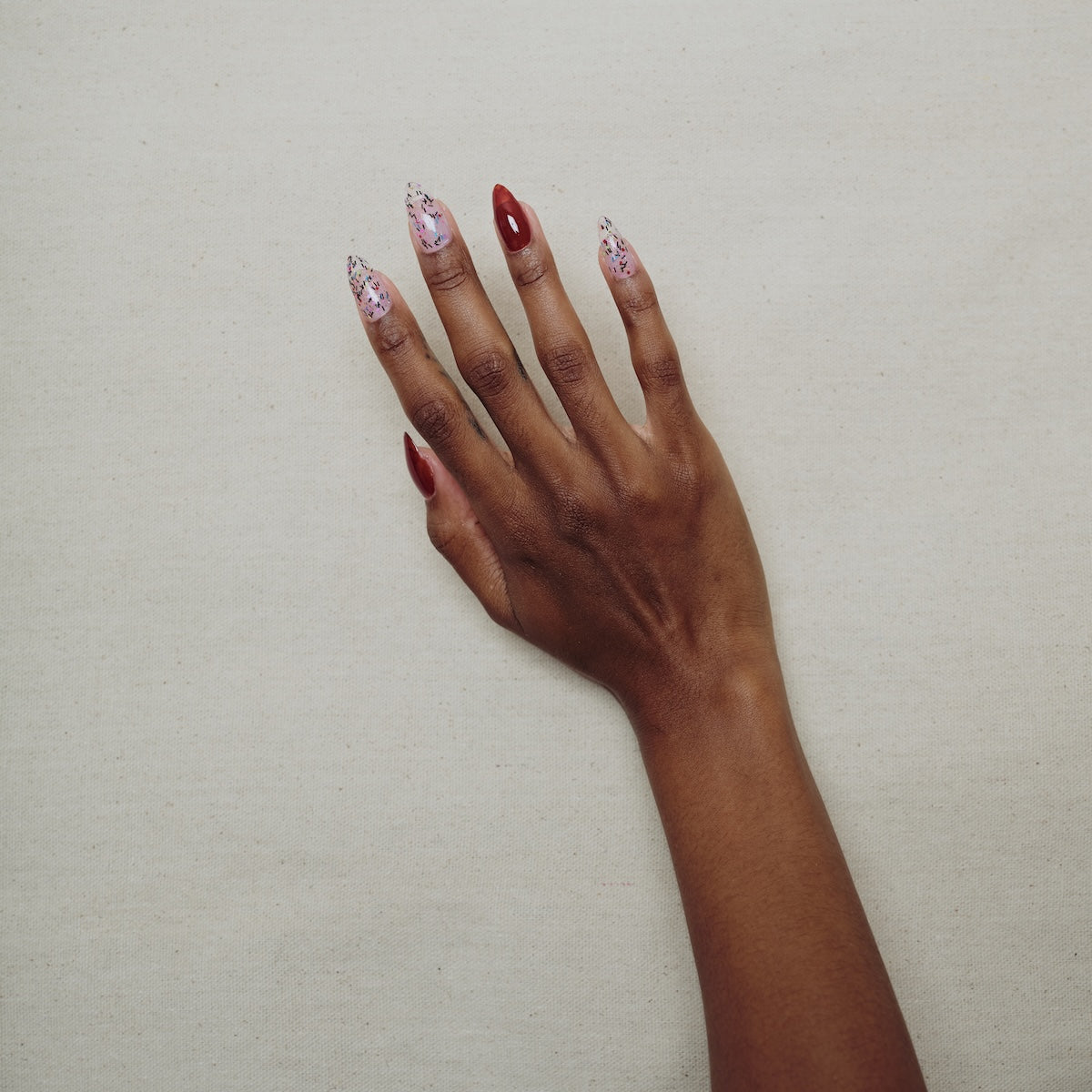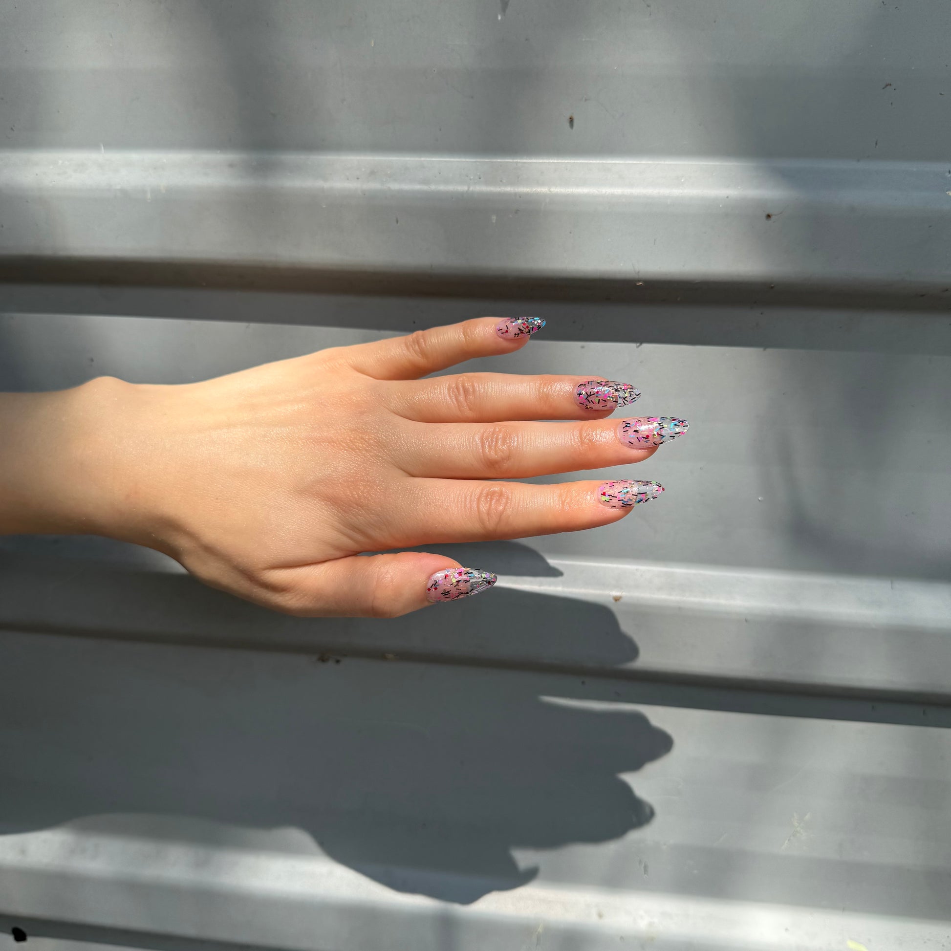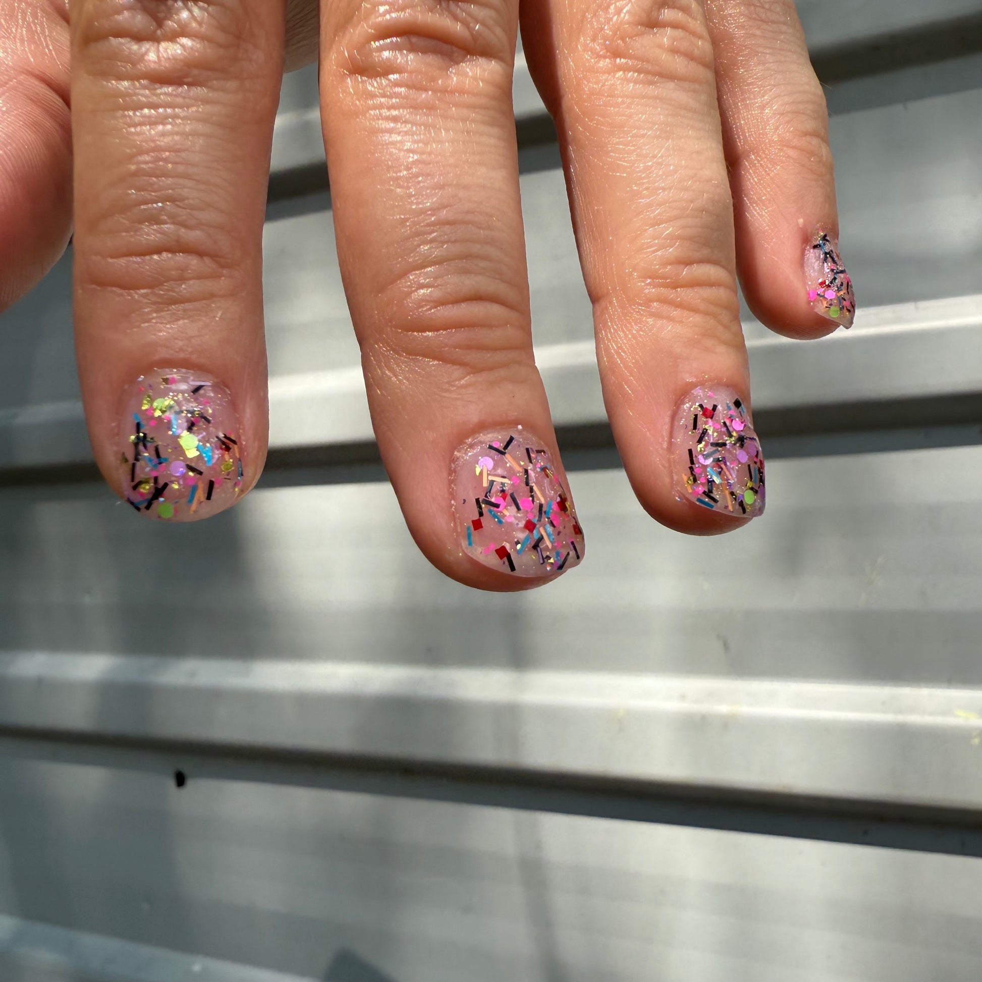 Sheer base with a variety of neon glitter shapes and shards paired with stark black bars. The clash of color and shape gives this polish an offbeat, almost collage-like effect. Playful and over the top. It’s a shade that feels like Friday night at the skate rink when you discovered how to fly on rollerblades. Or, strangely, cats. Chaotic cats.