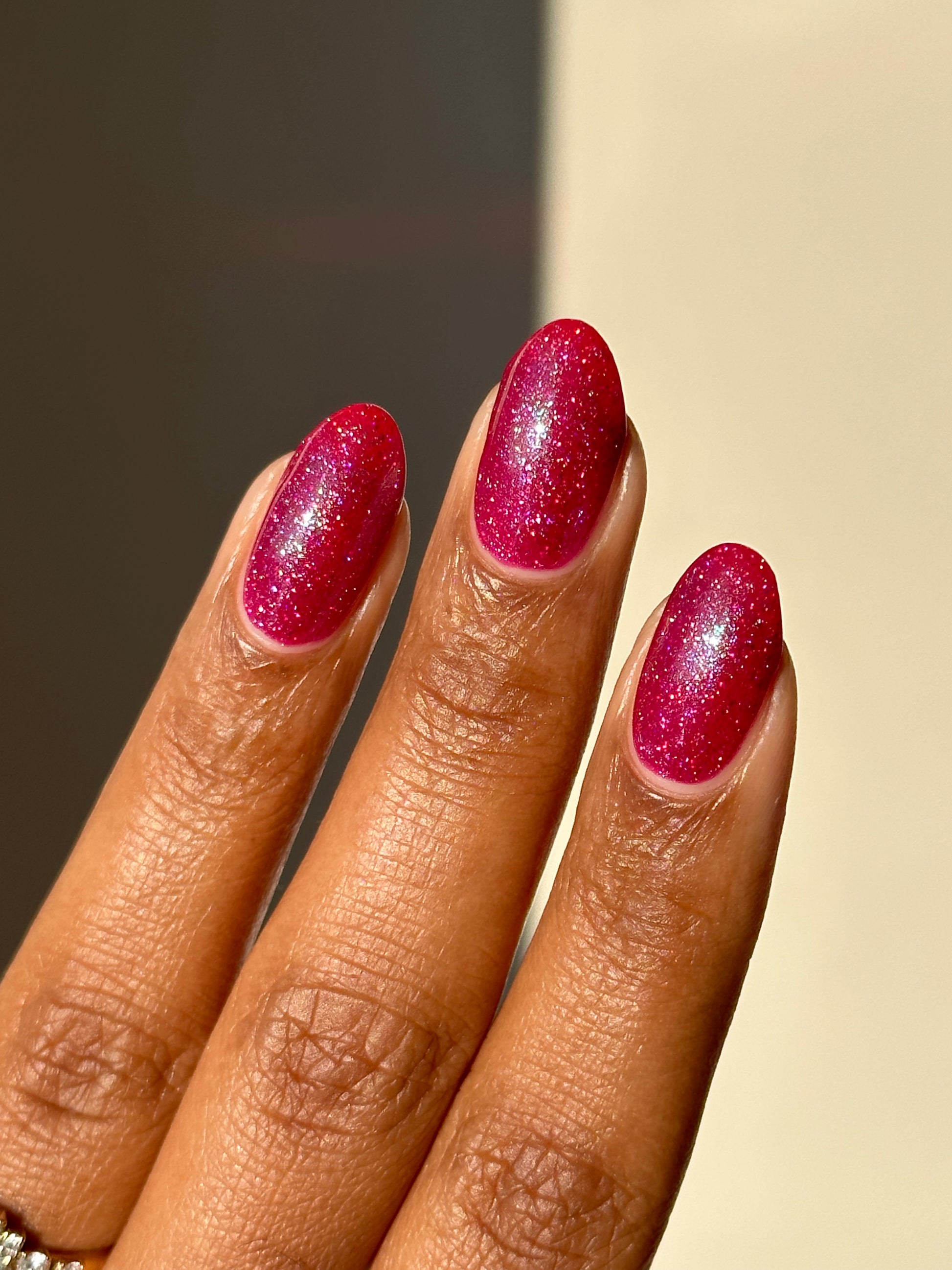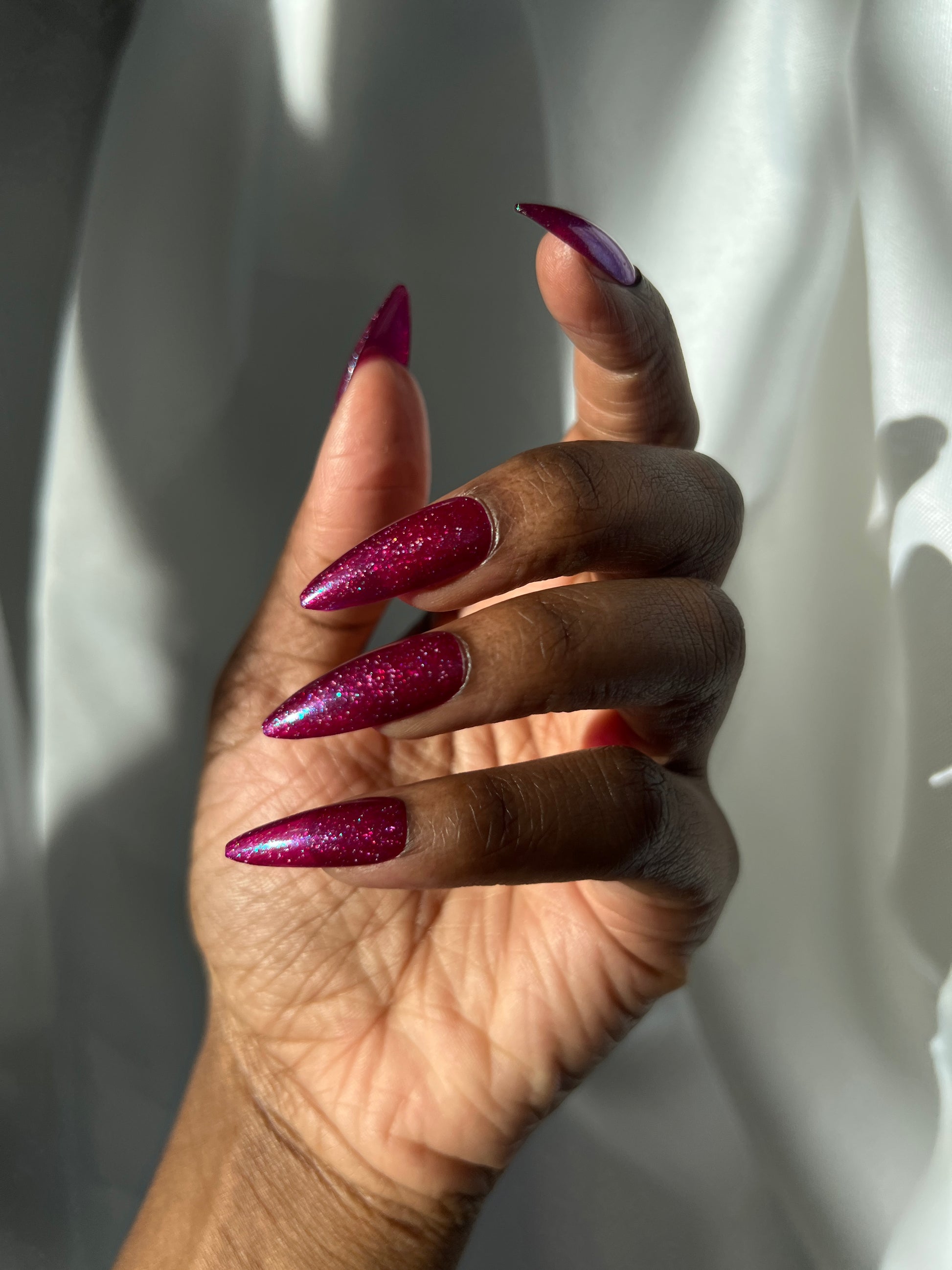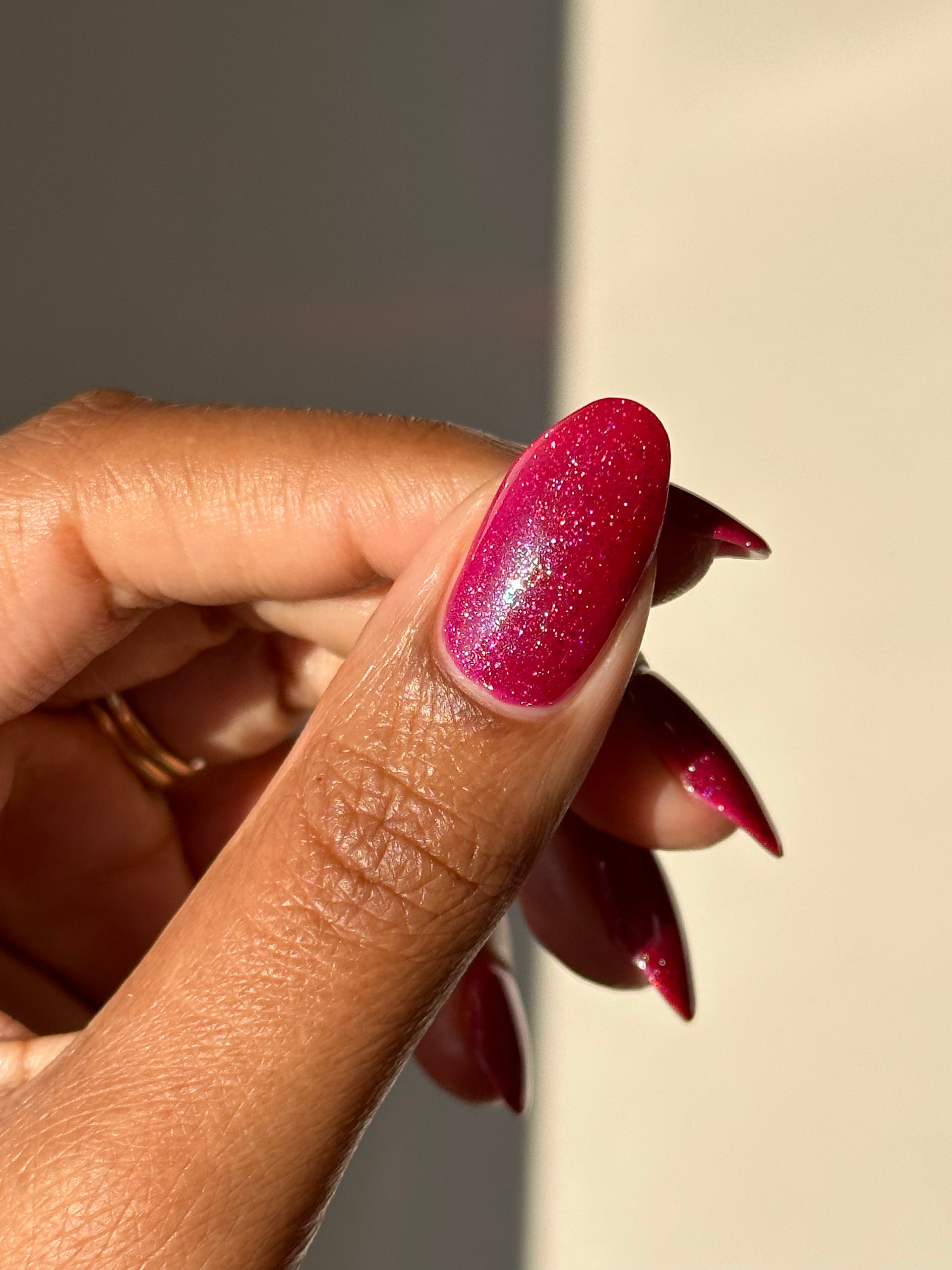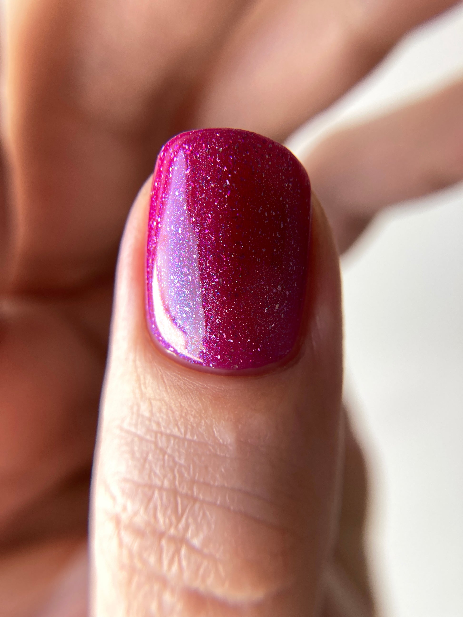 Berry jelly base with iridescent emerald/indigo/violet aurora shimmer, micro-holo flakes and scattered holo.