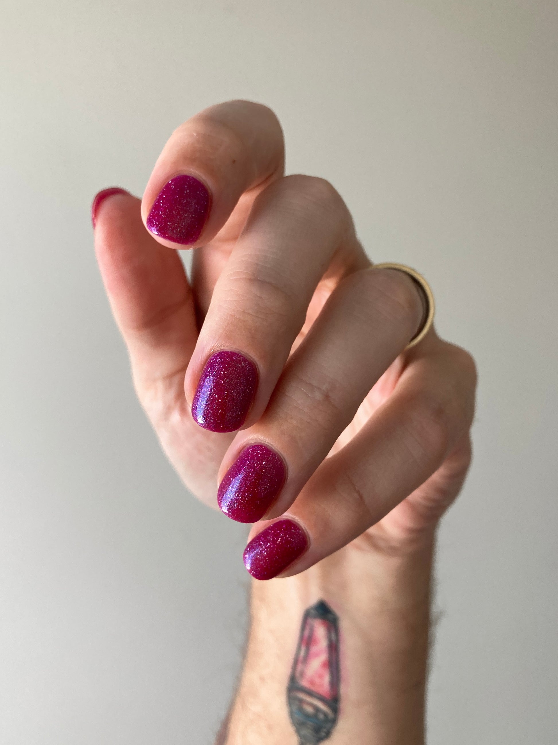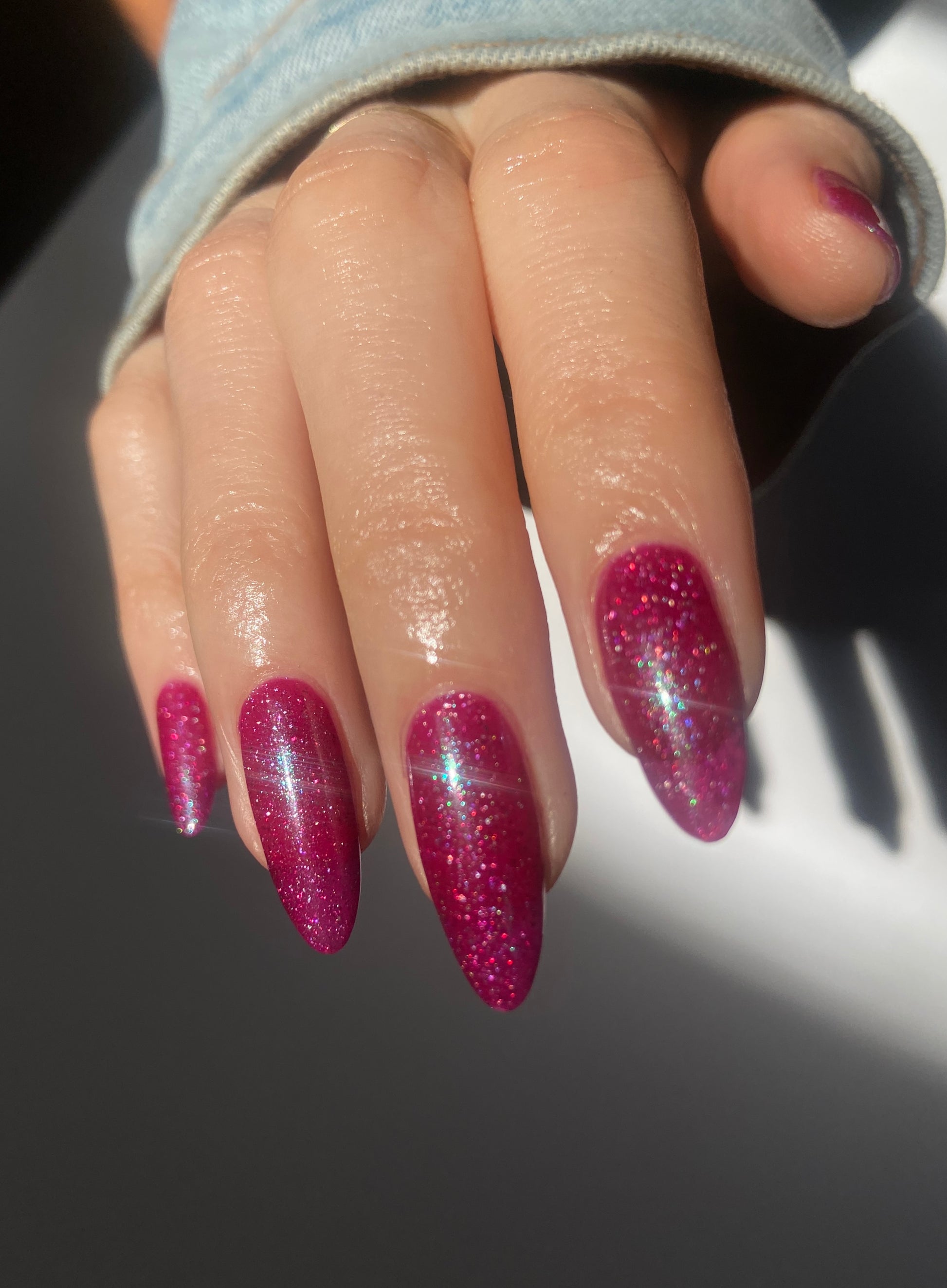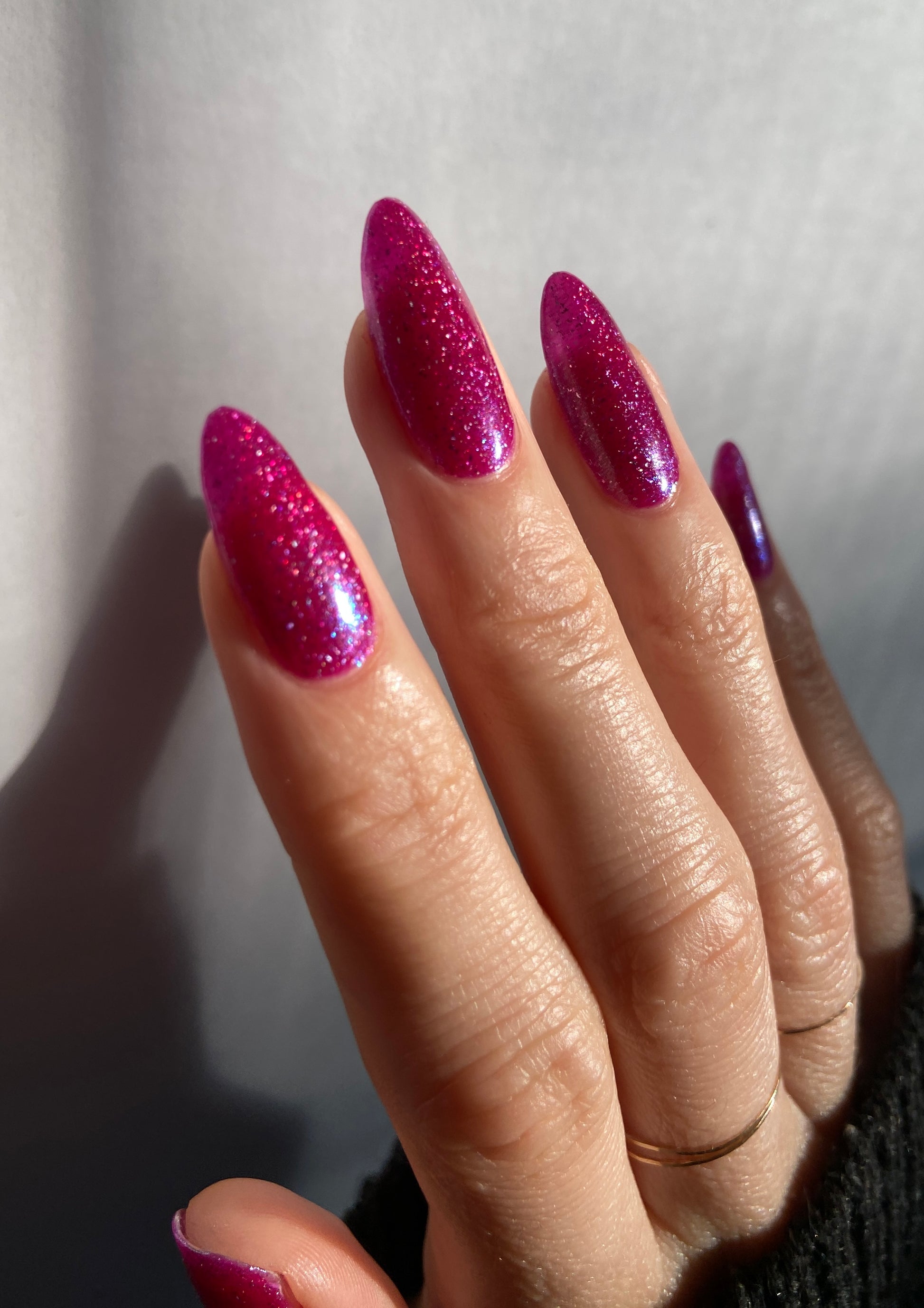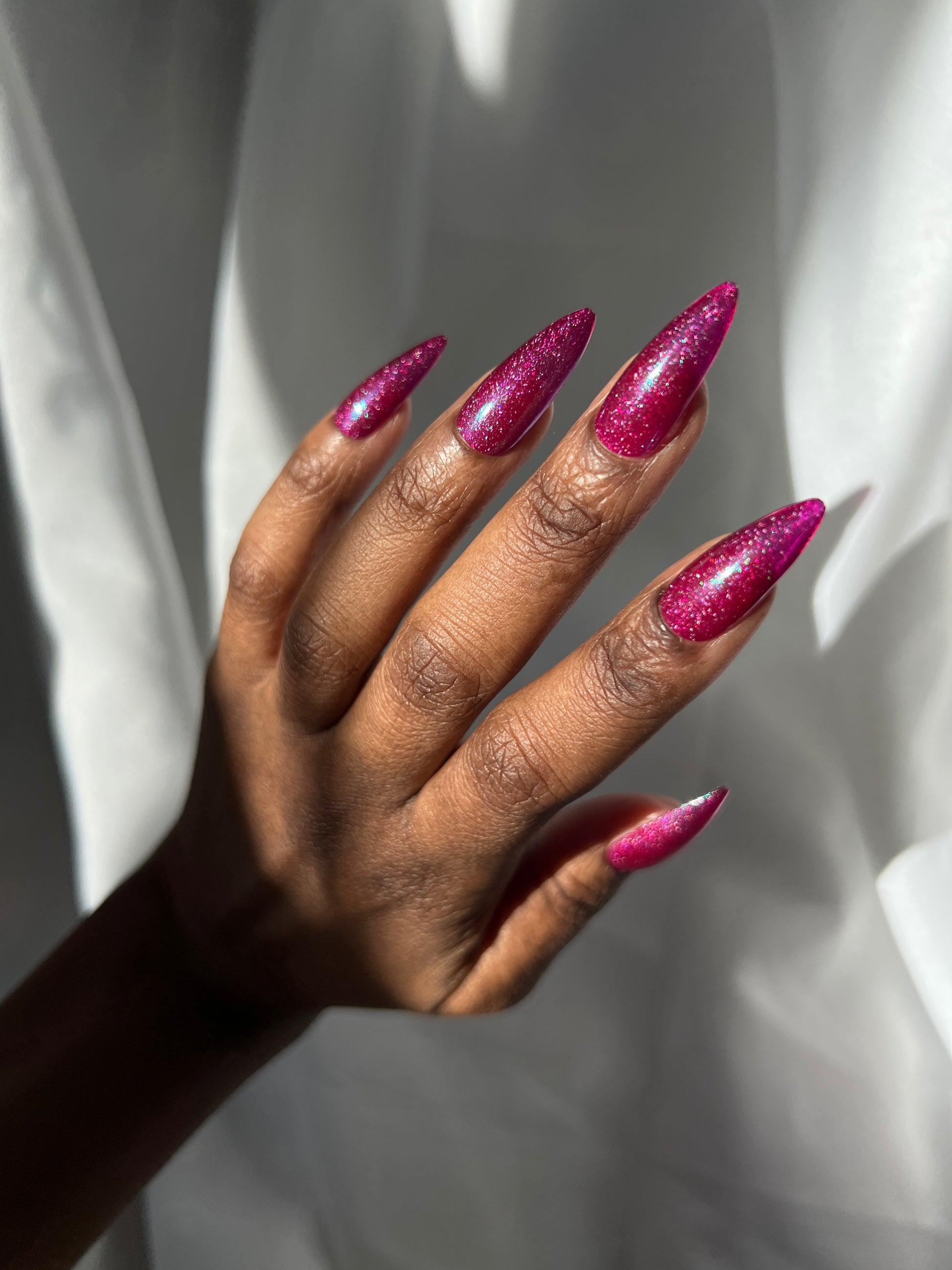 Berry jelly base with iridescent emerald/indigo/violet aurora shimmer, micro-holo flakes and scattered holo.