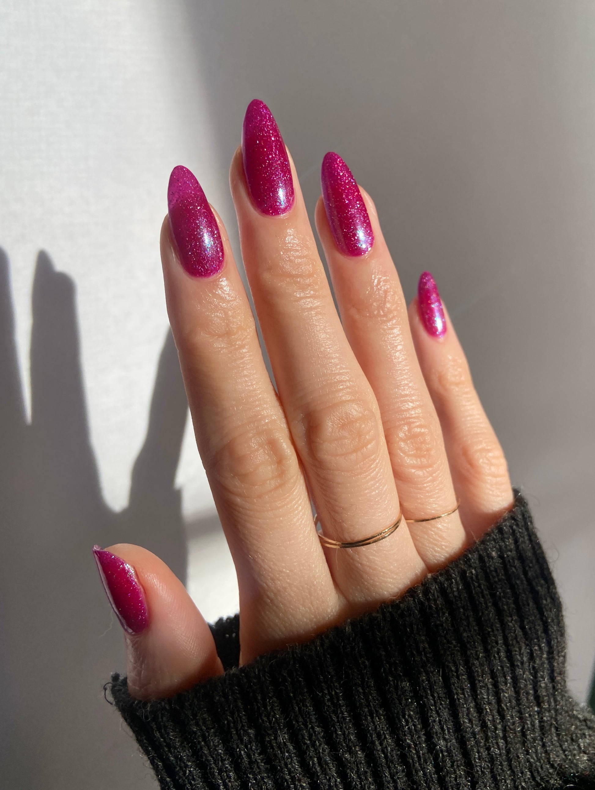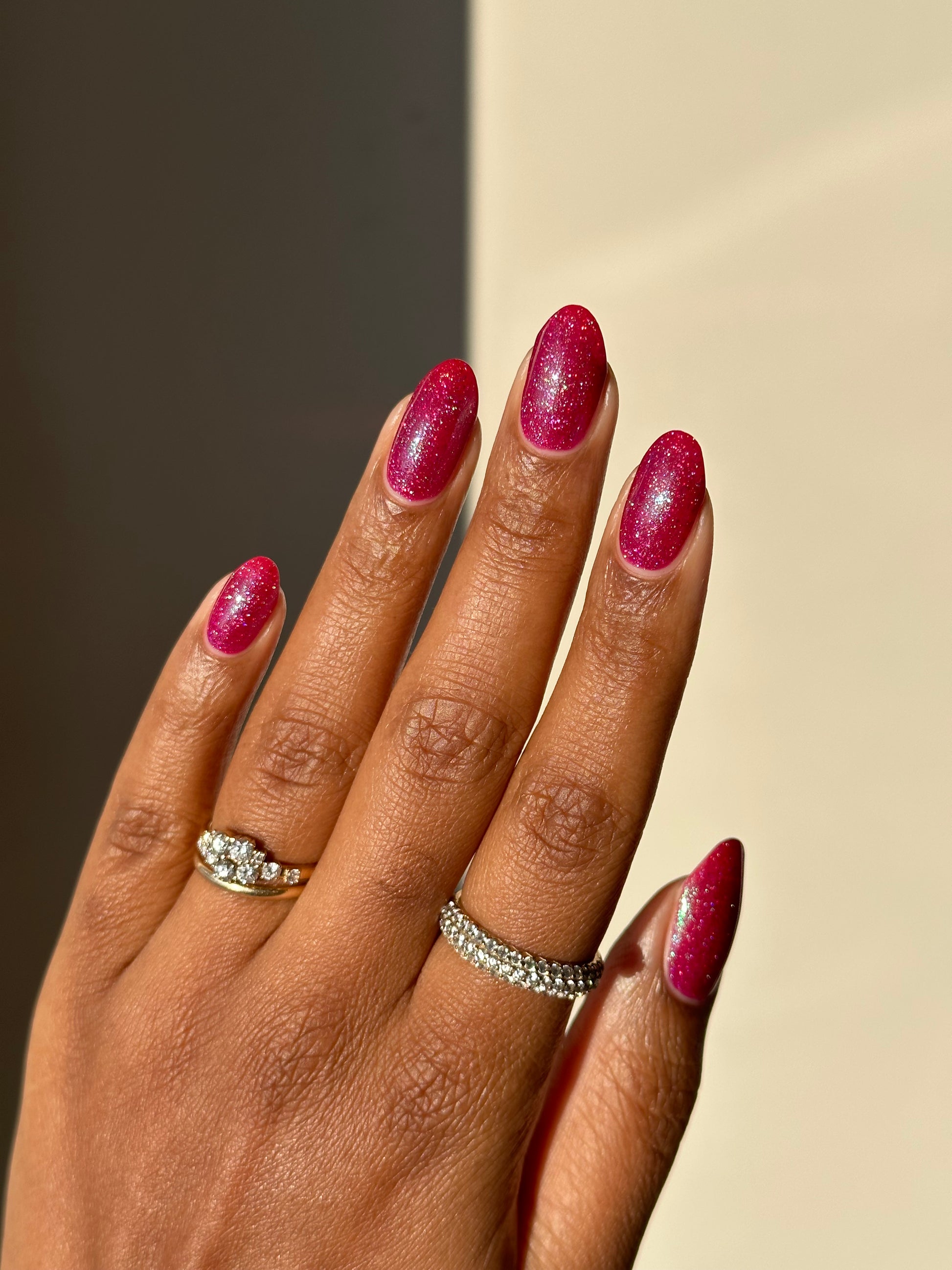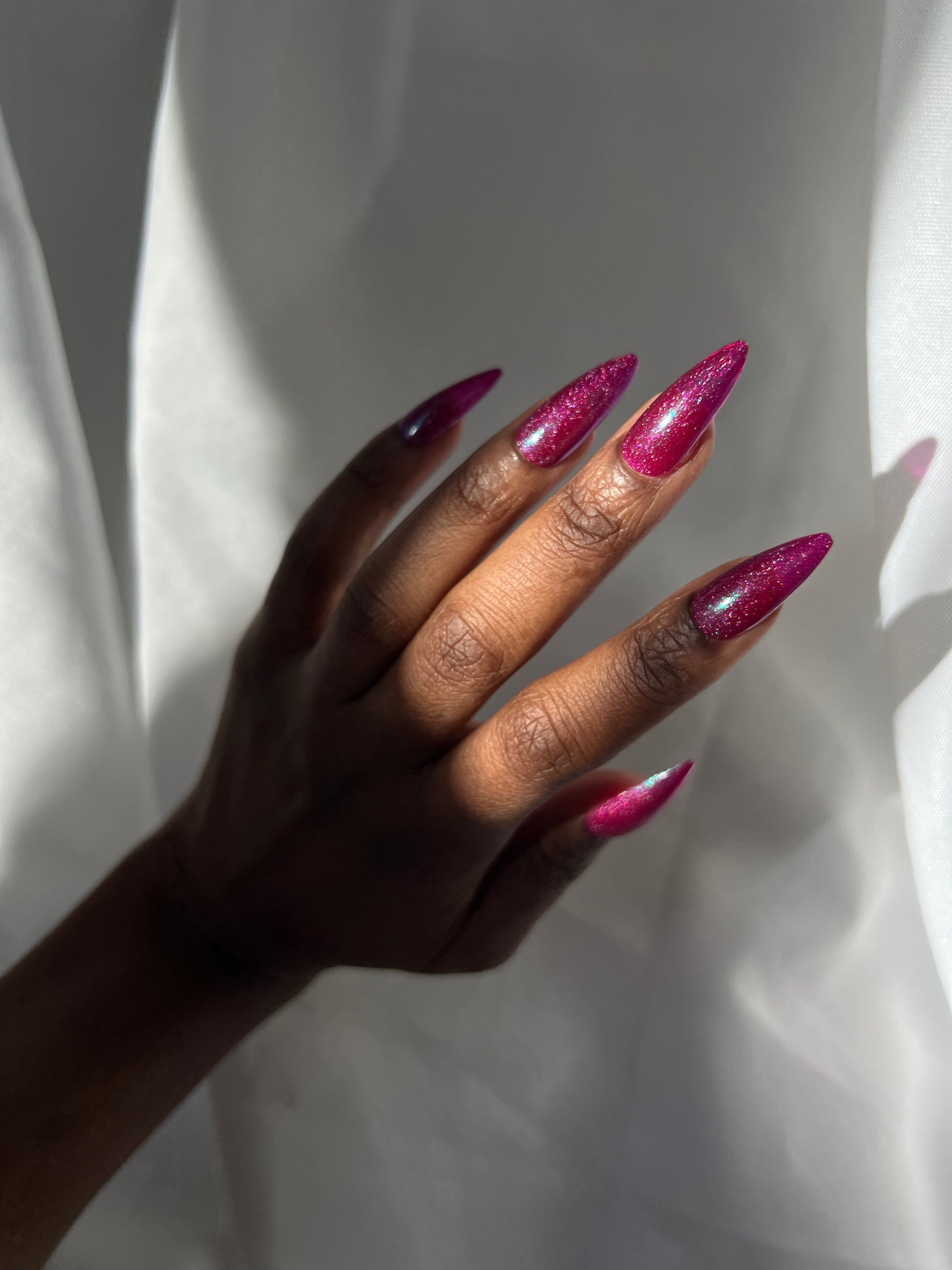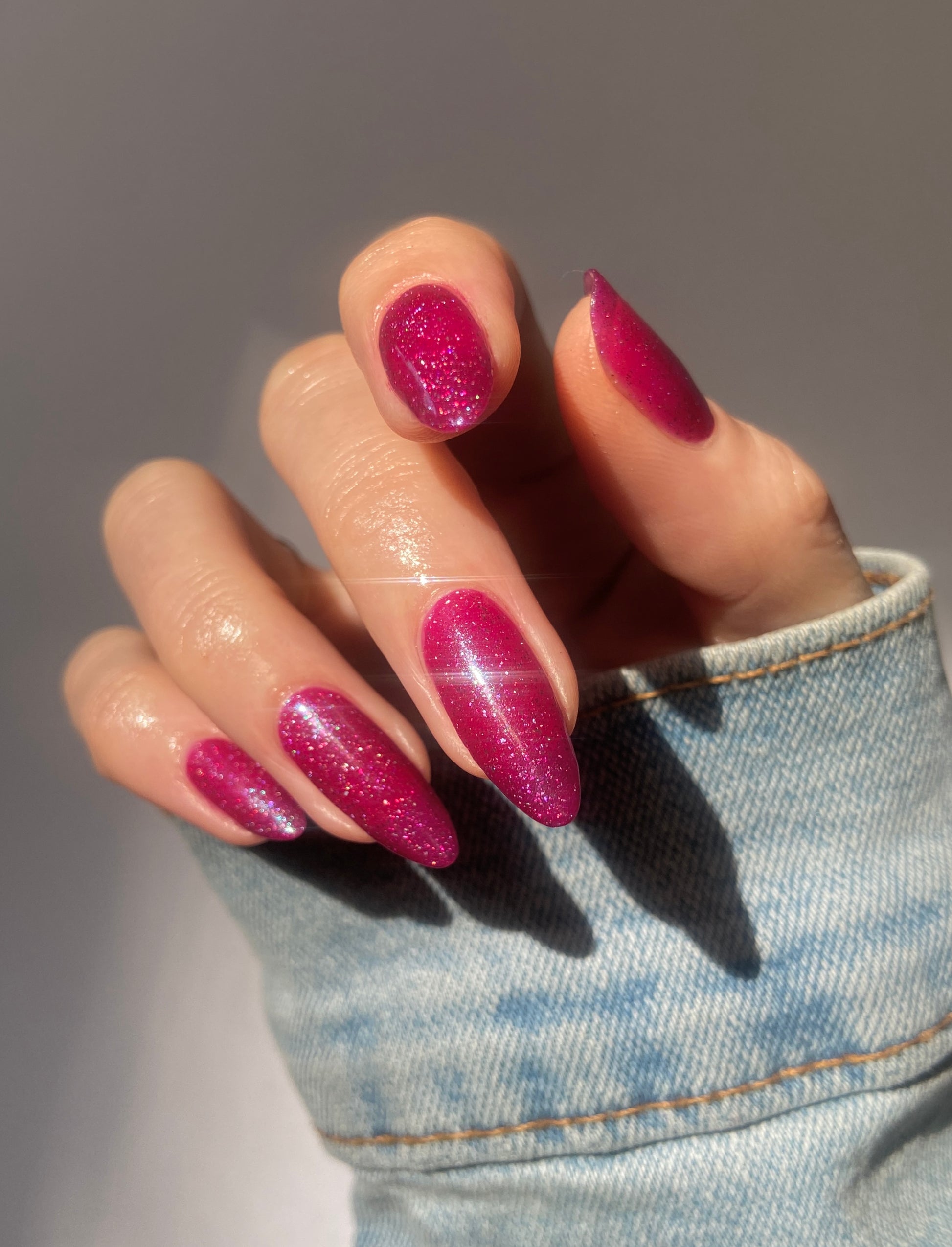 Berry jelly base with iridescent emerald/indigo/violet aurora shimmer, micro-holo flakes and scattered holo.