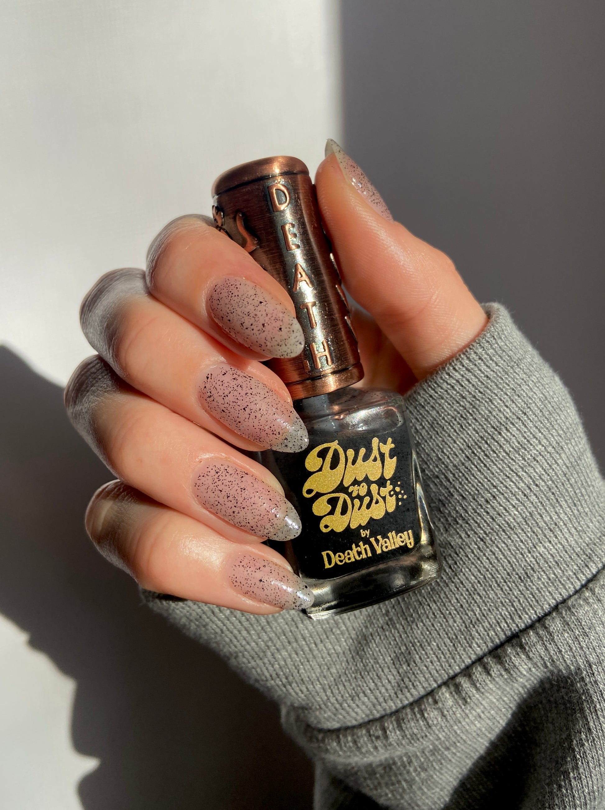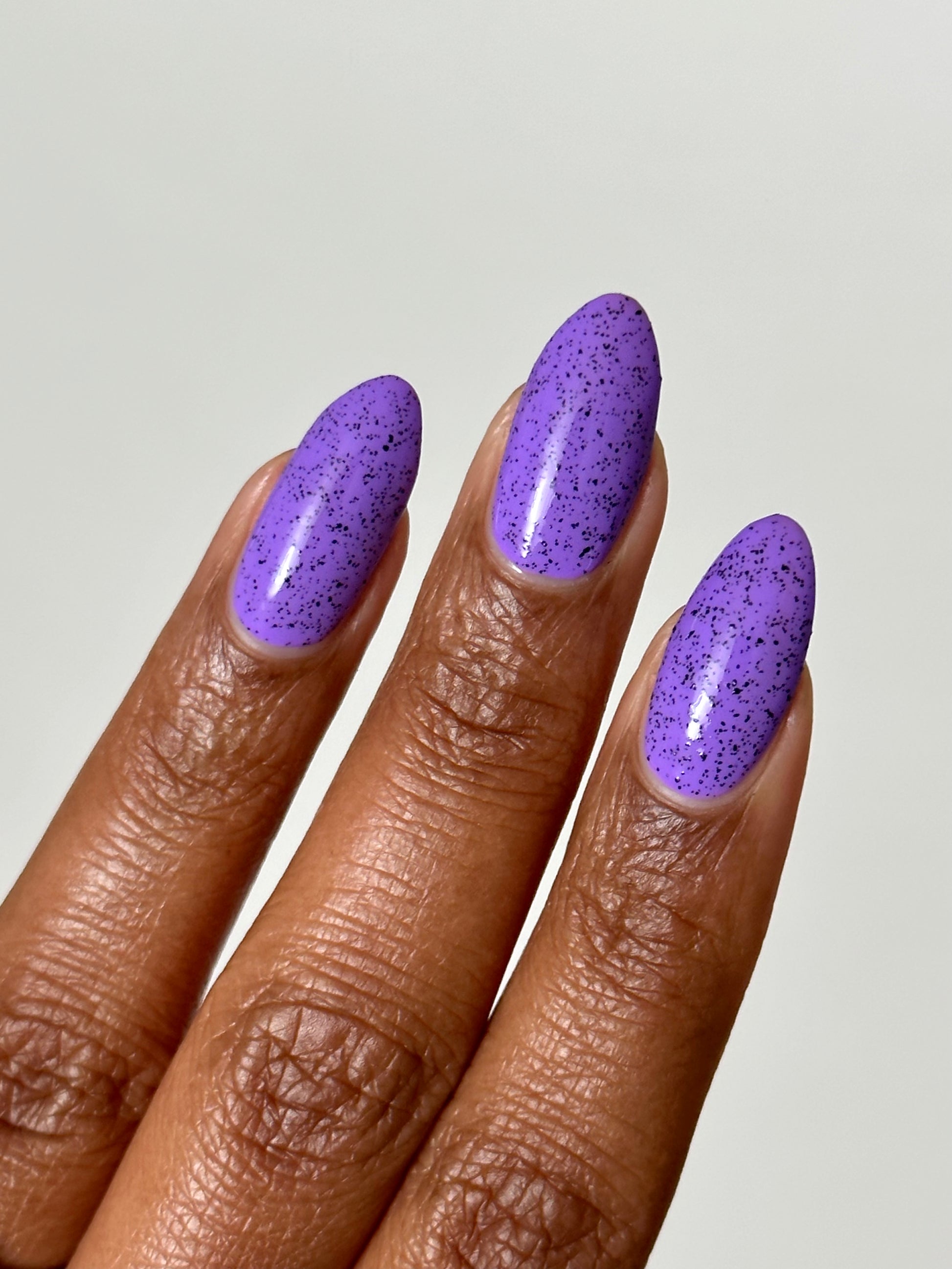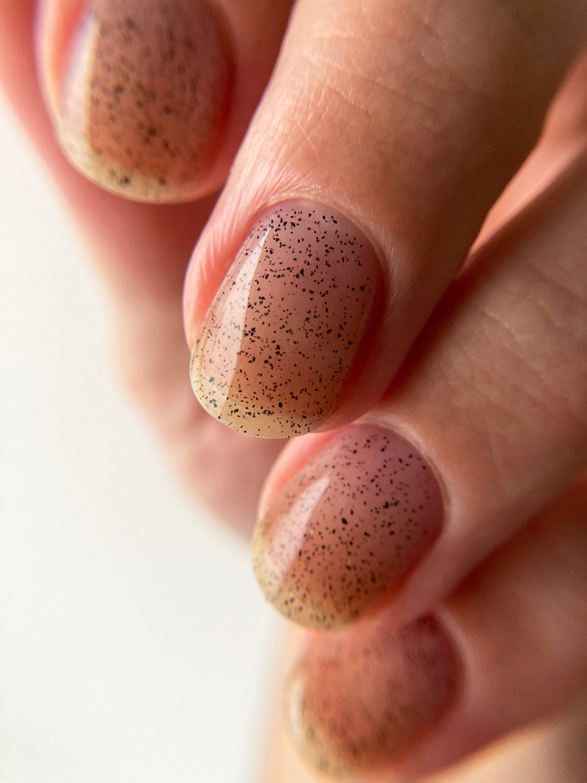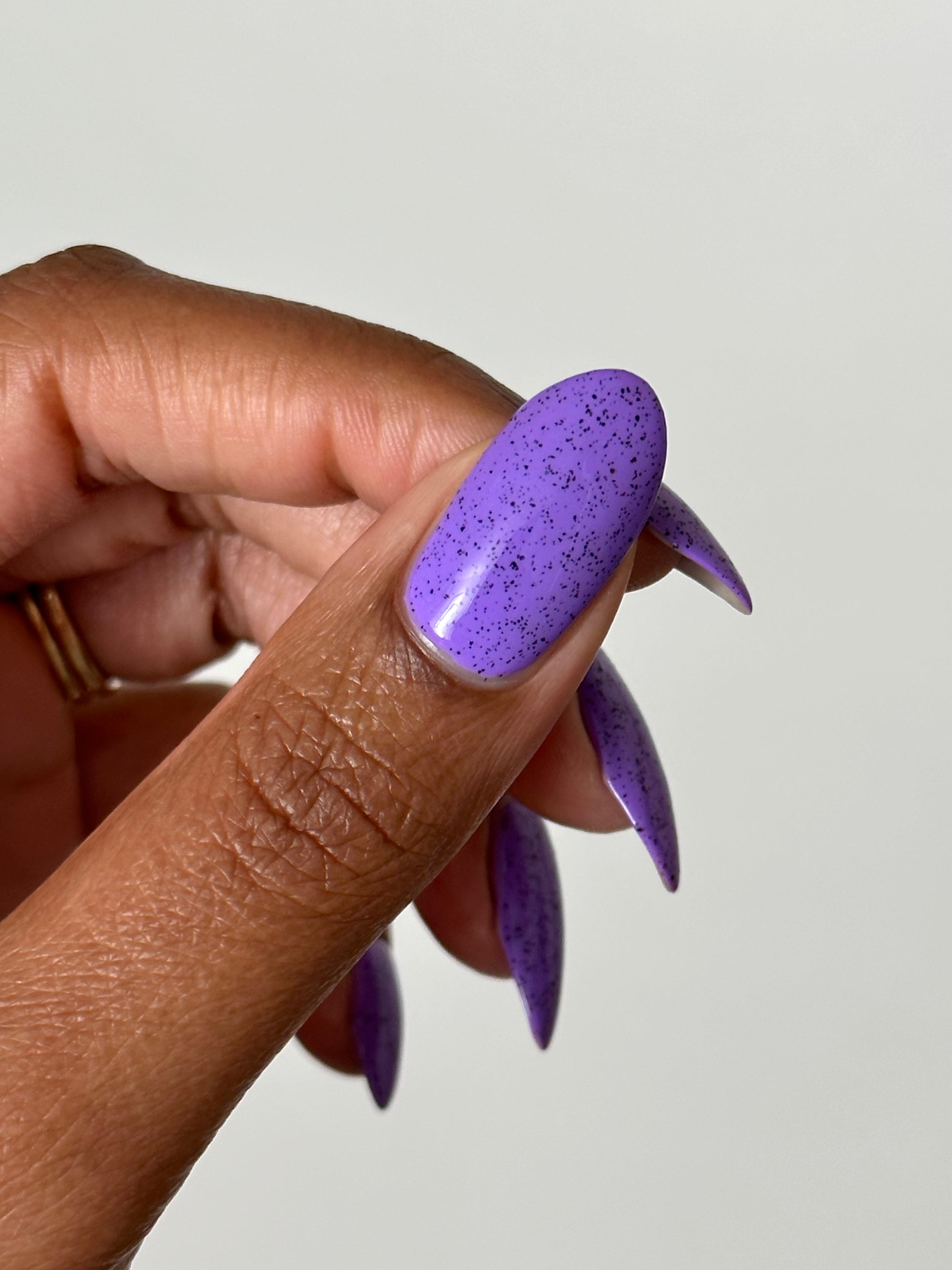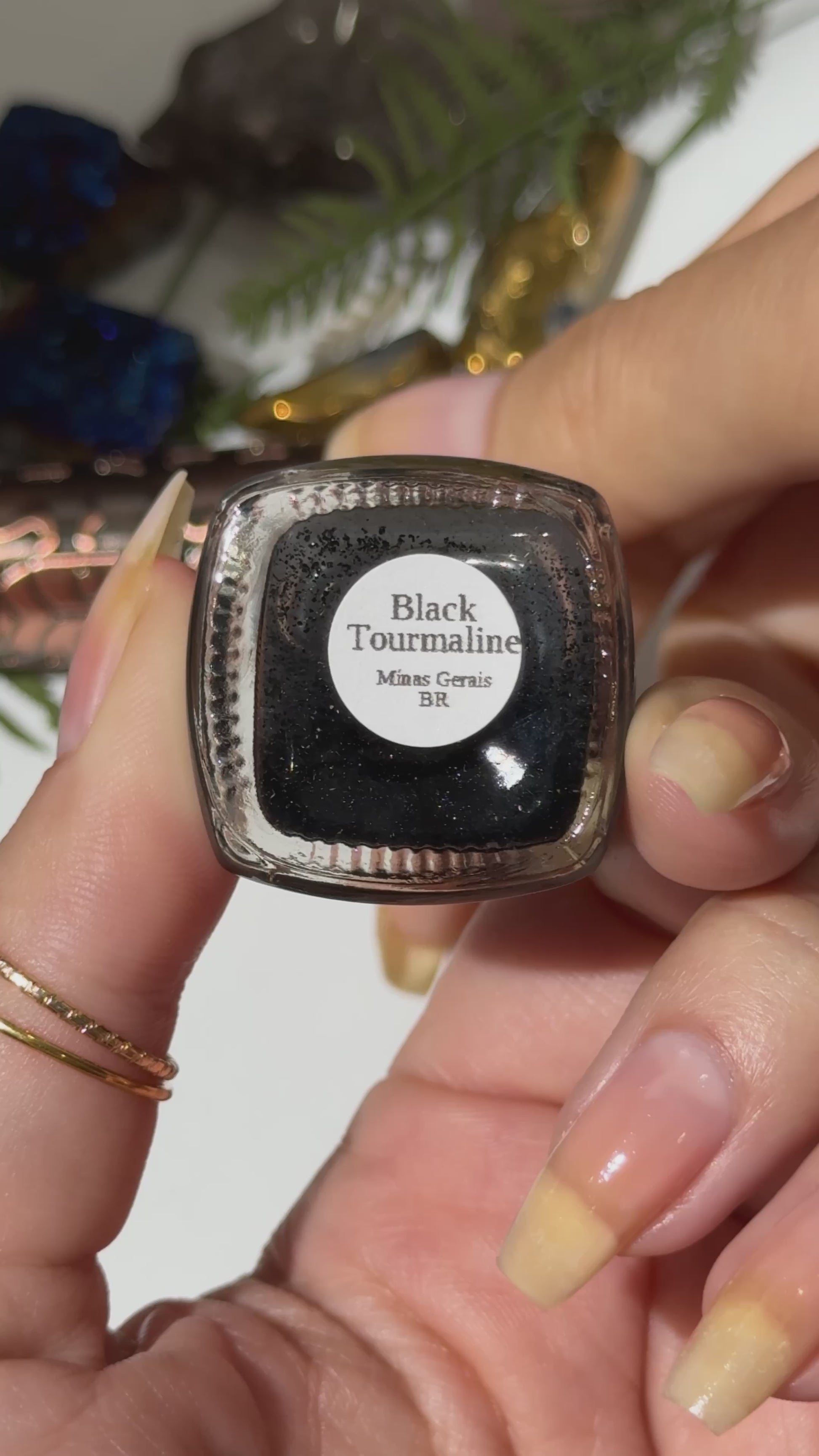 This polish is sheer with pieces of black tourmaline. It will have texture as well as larger pieces of pigment present in the polish finish. Each batch will have slight color variations as we use different parts of the source material.