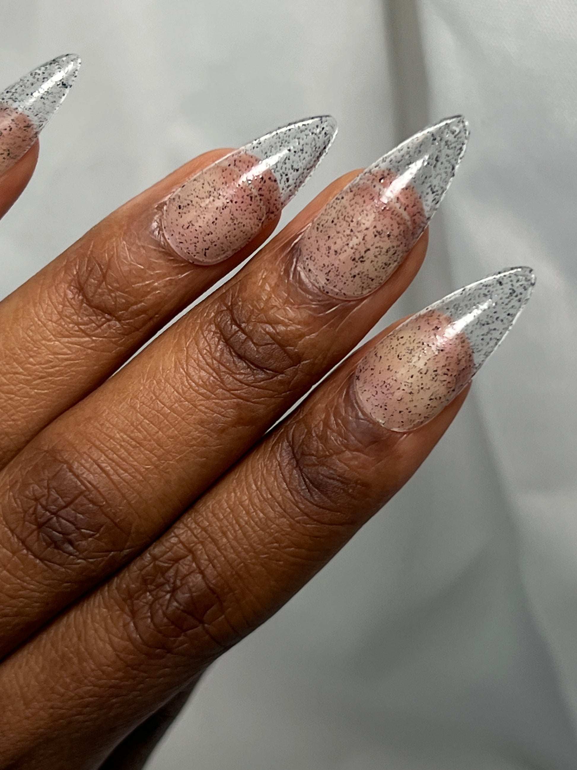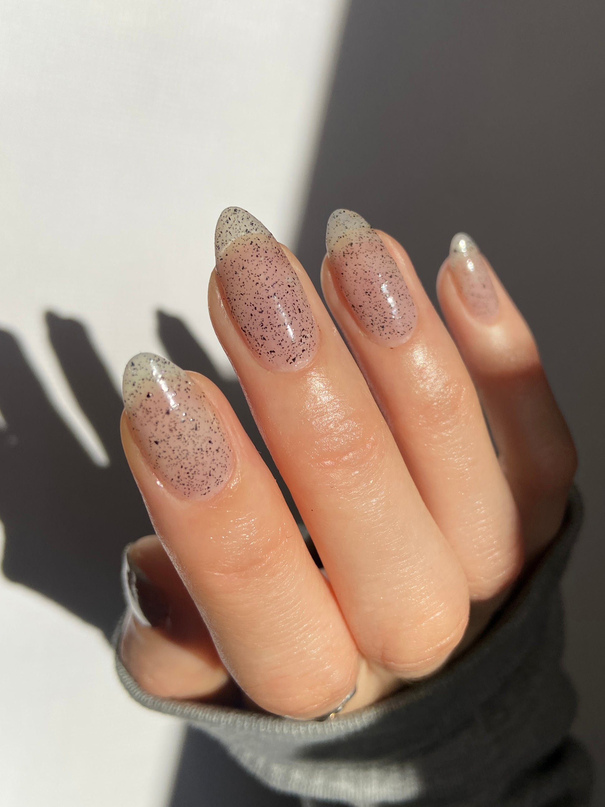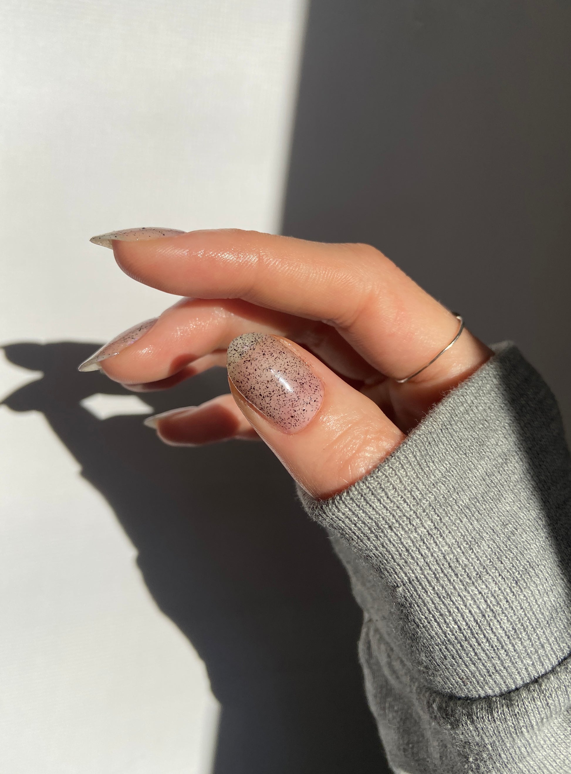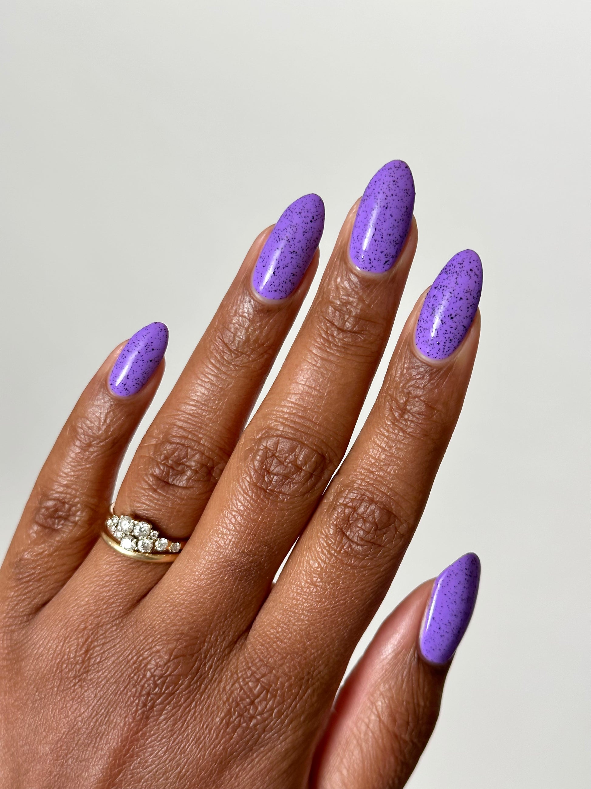 This polish is sheer with pieces of black tourmaline. It will have texture as well as larger pieces of pigment present in the polish finish. Each batch will have slight color variations as we use different parts of the source material.