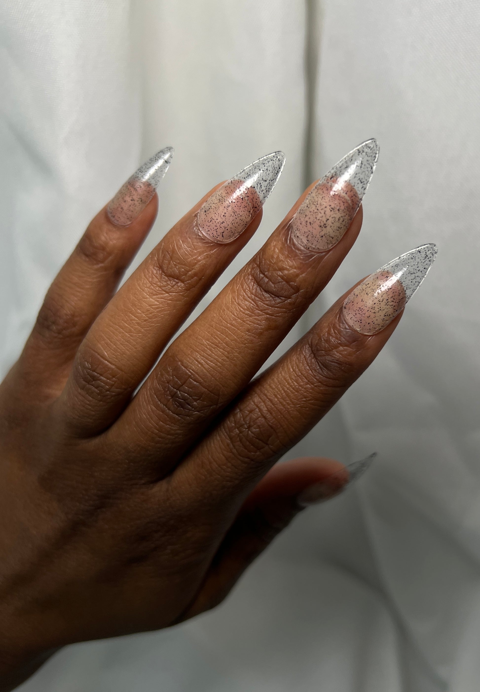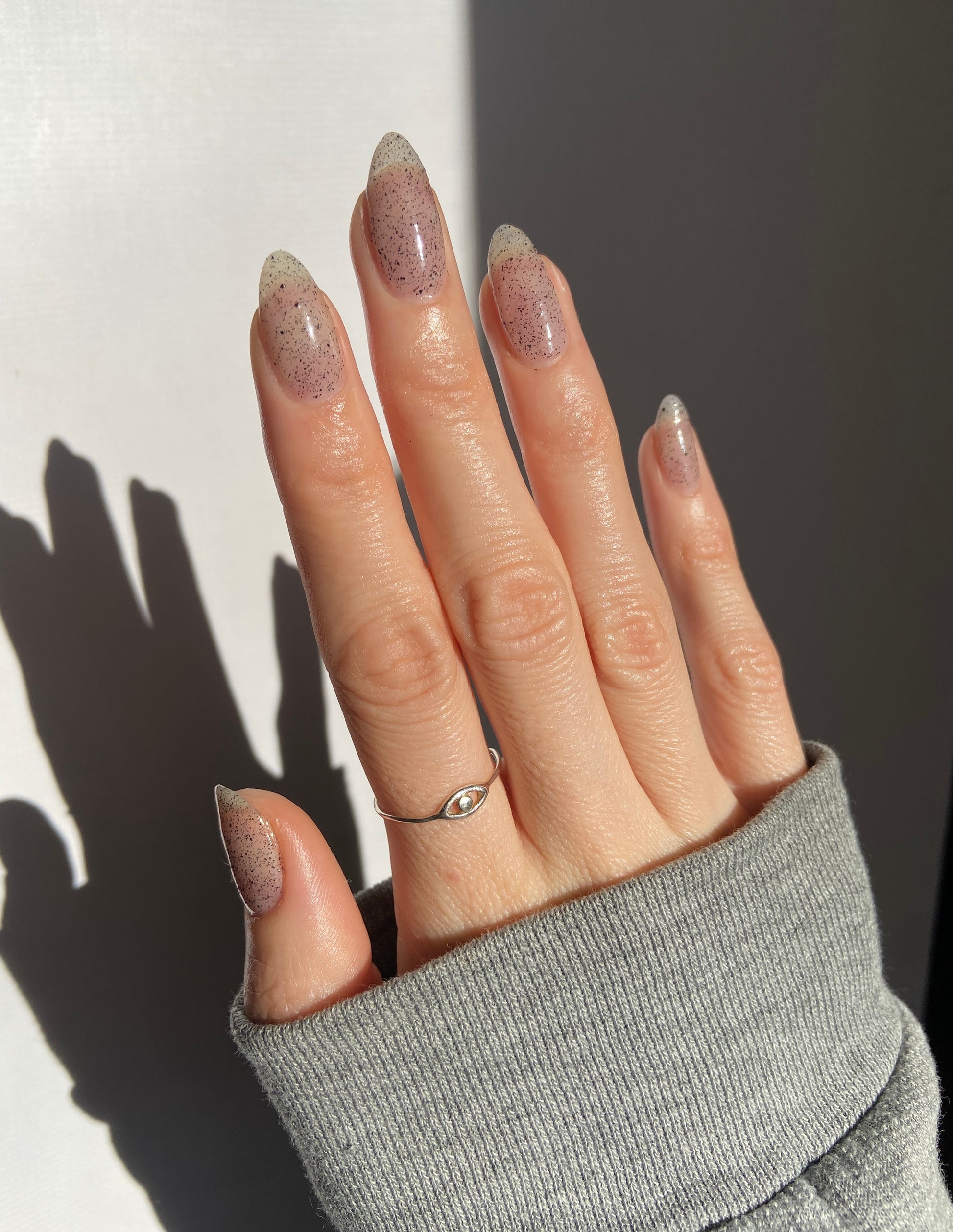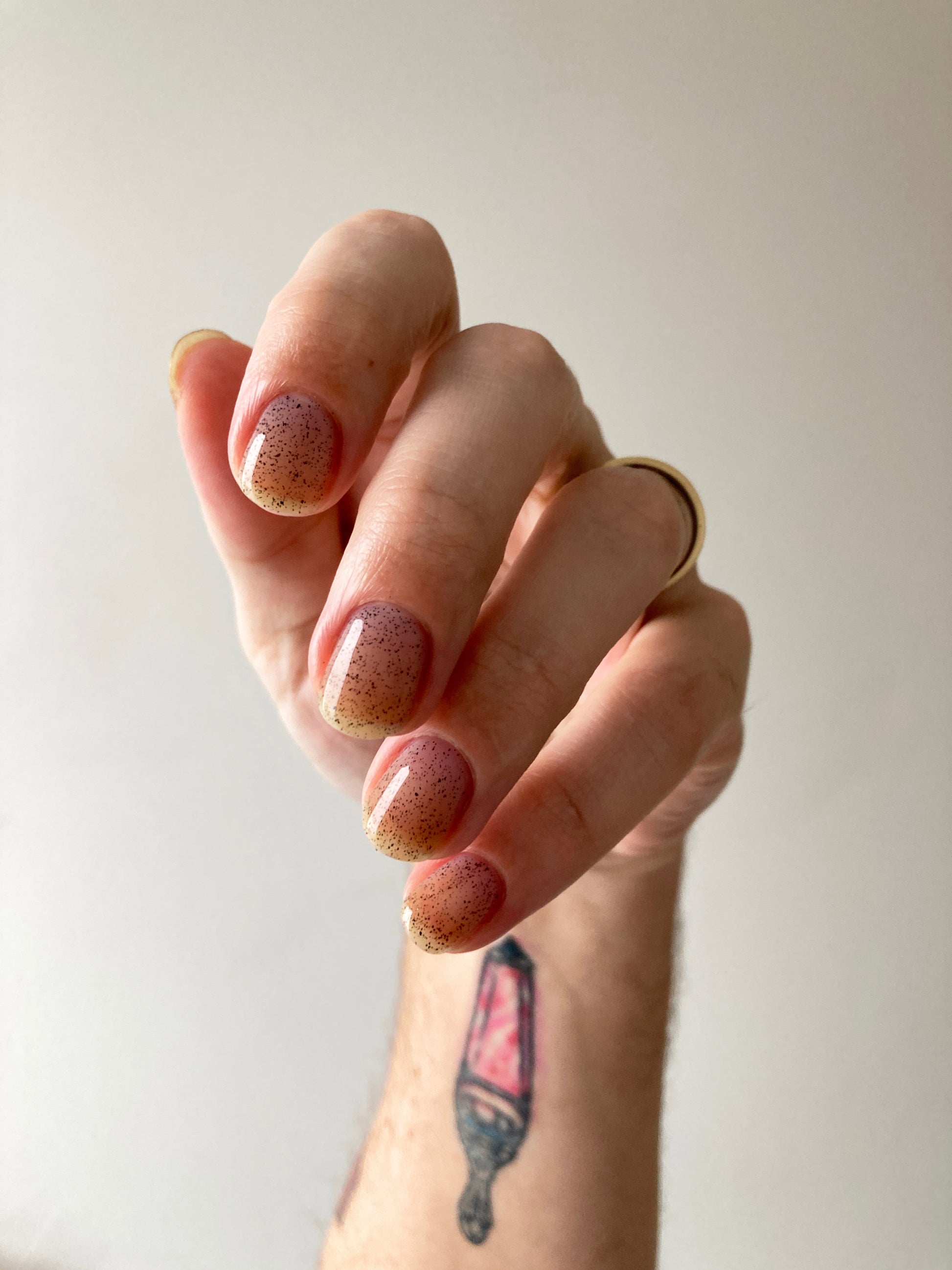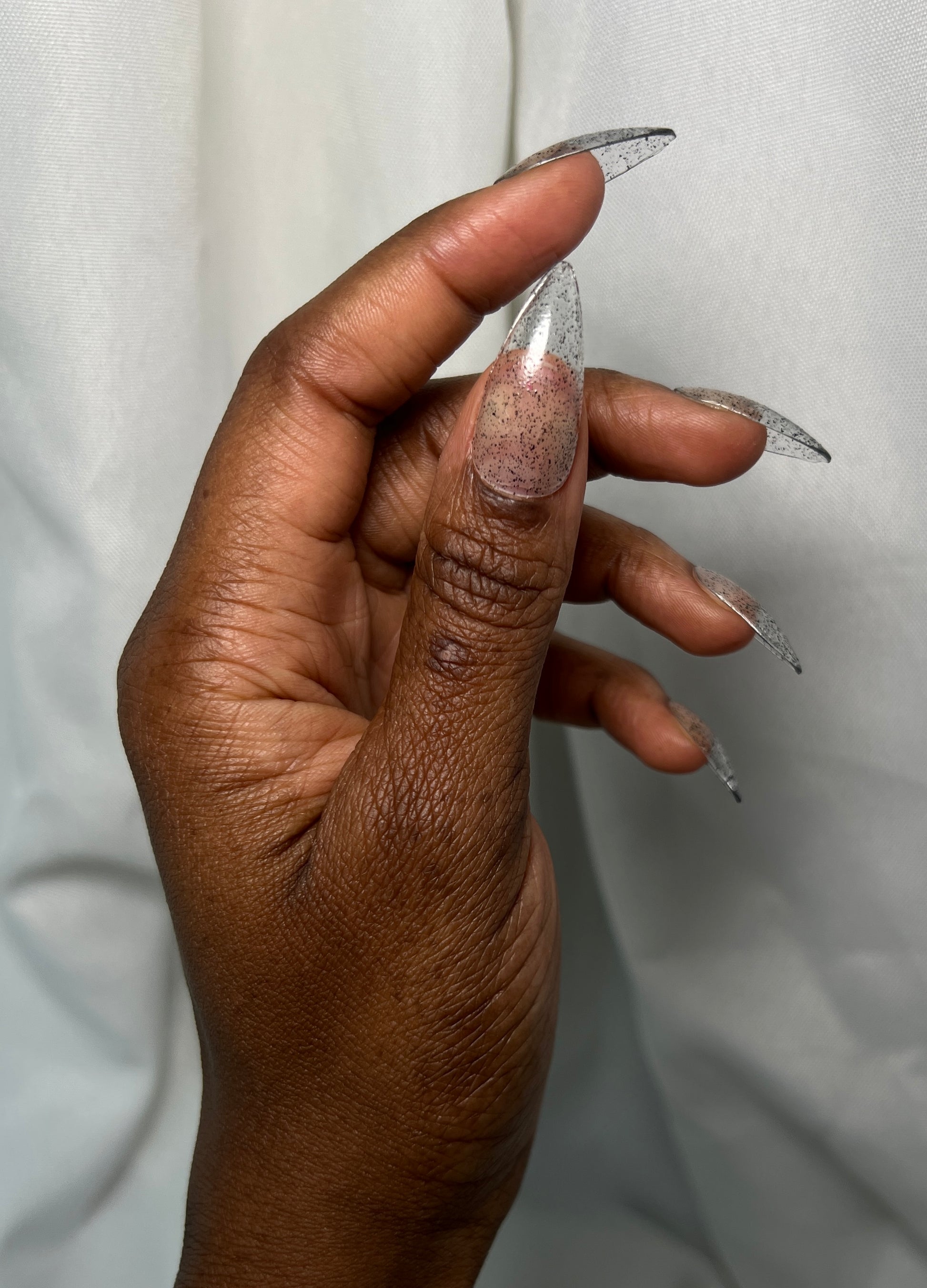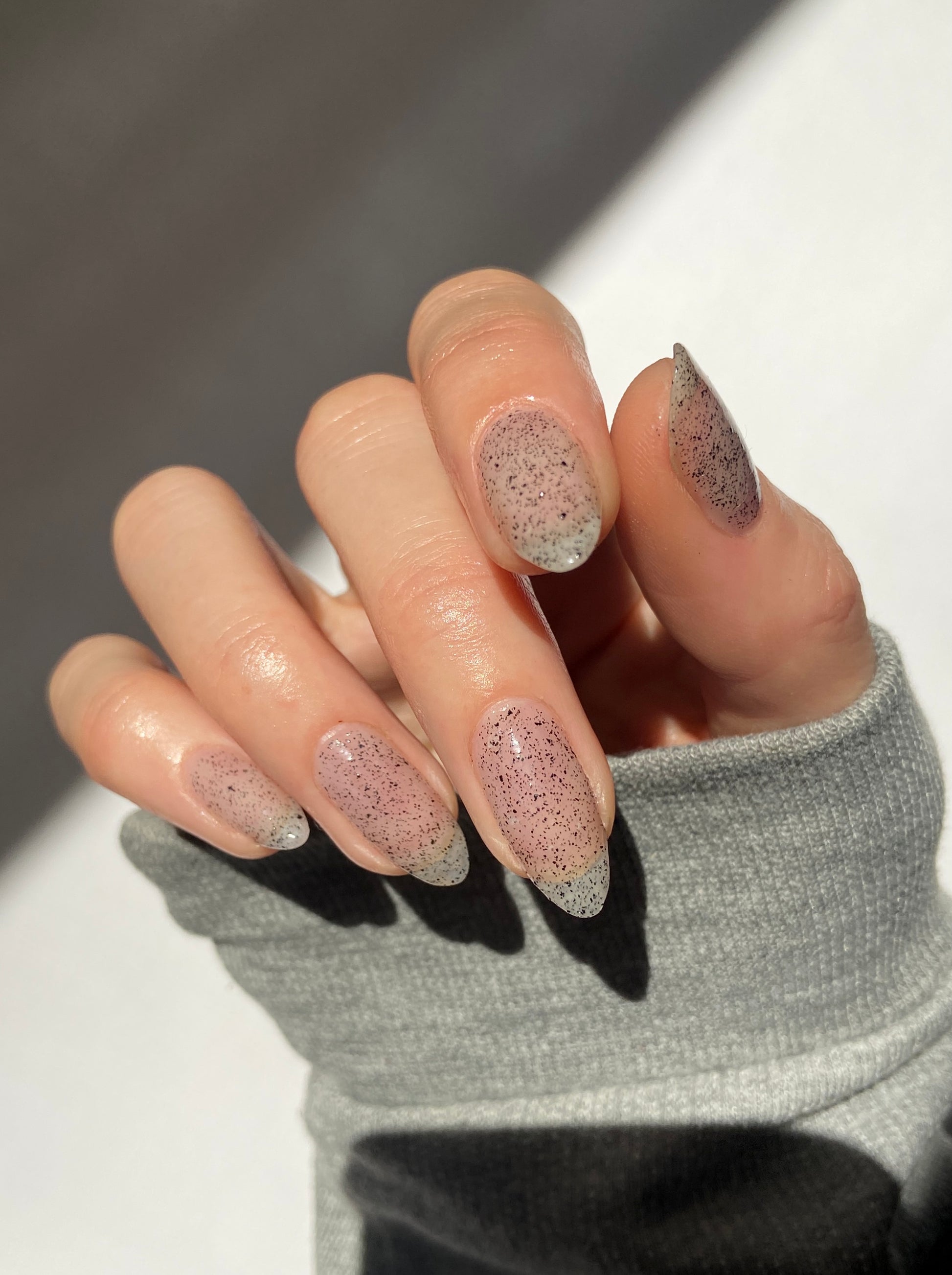 This polish is sheer with pieces of black tourmaline. It will have texture as well as larger pieces of pigment present in the polish finish. Each batch will have slight color variations as we use different parts of the source material.