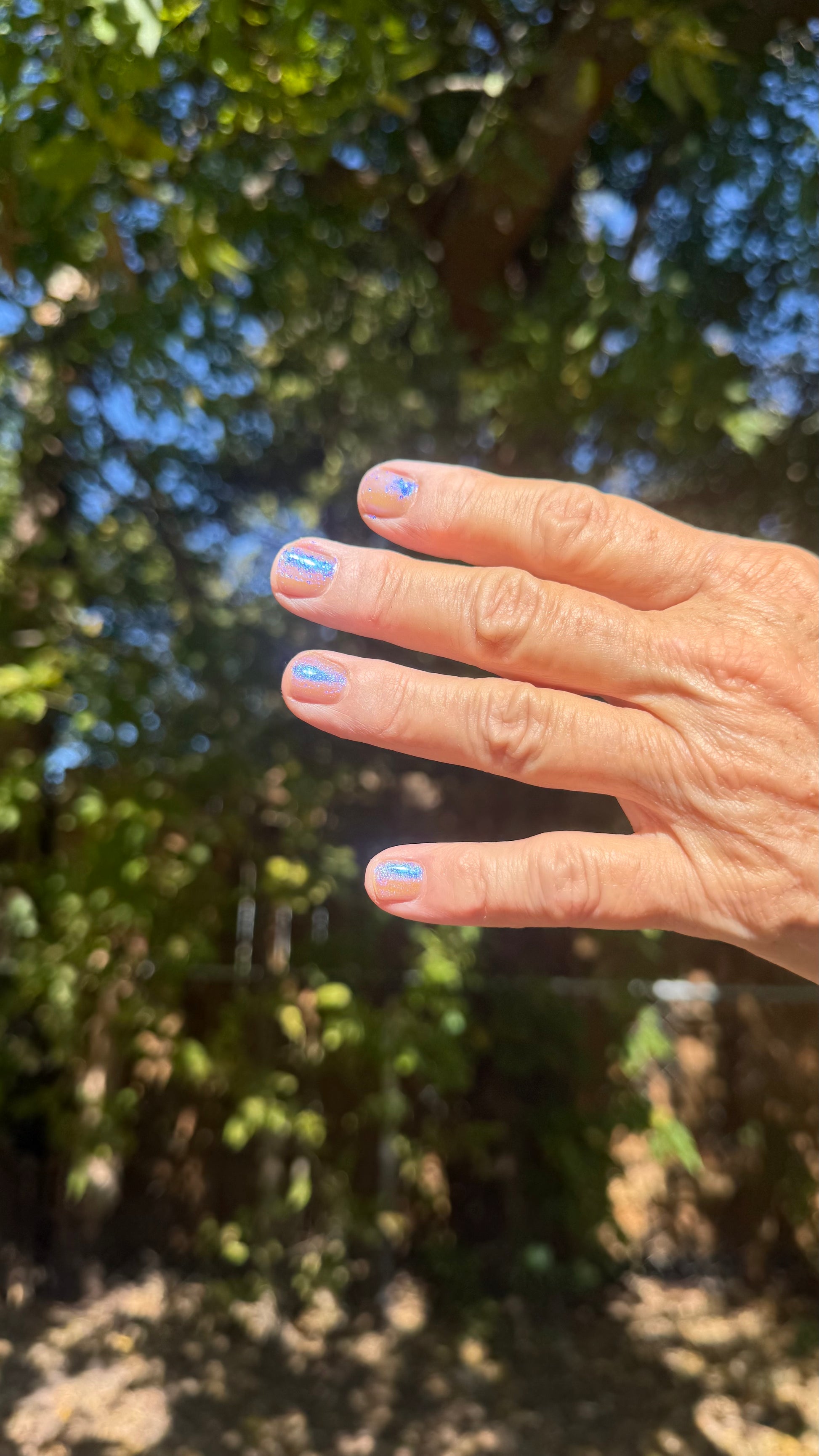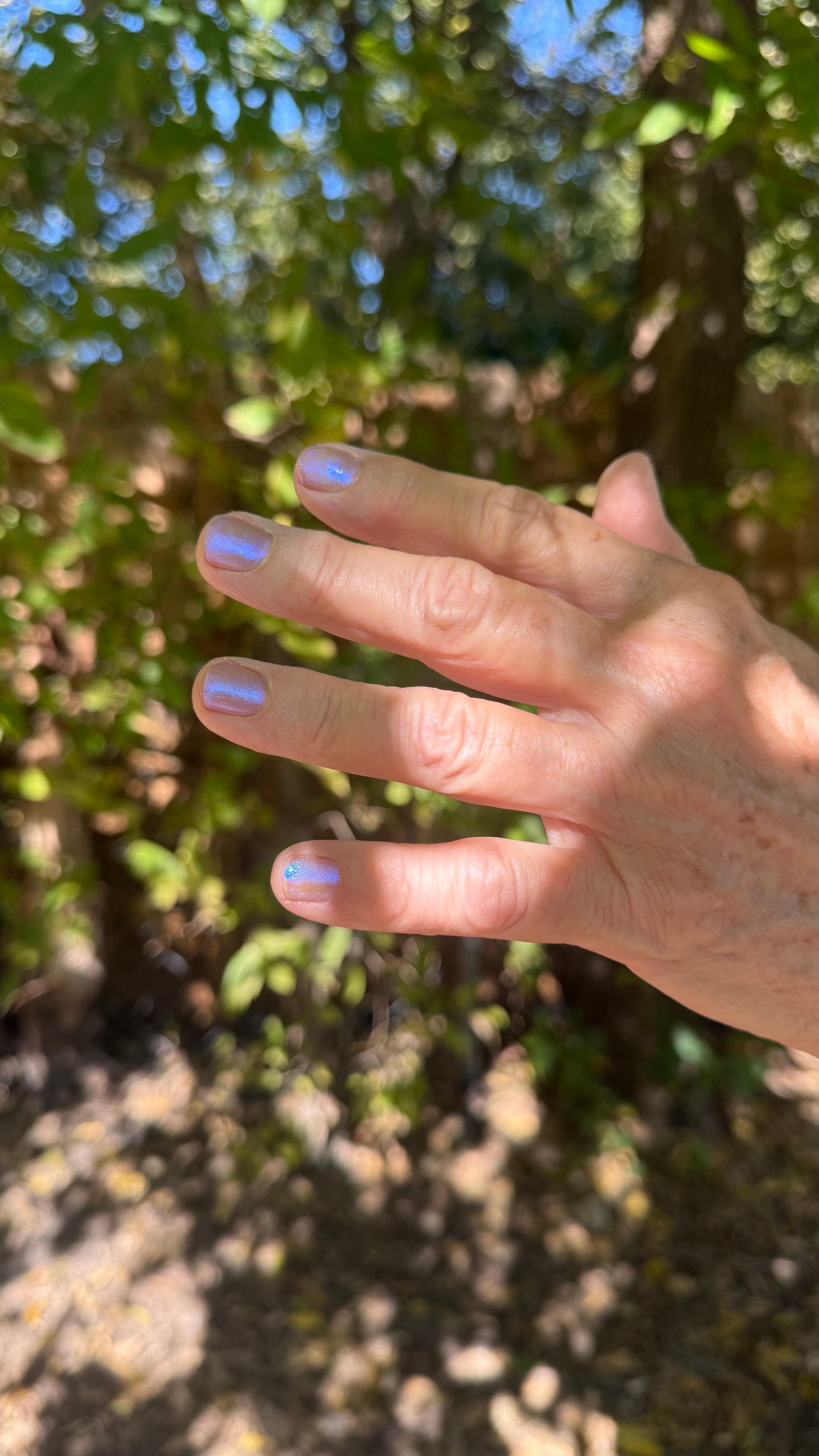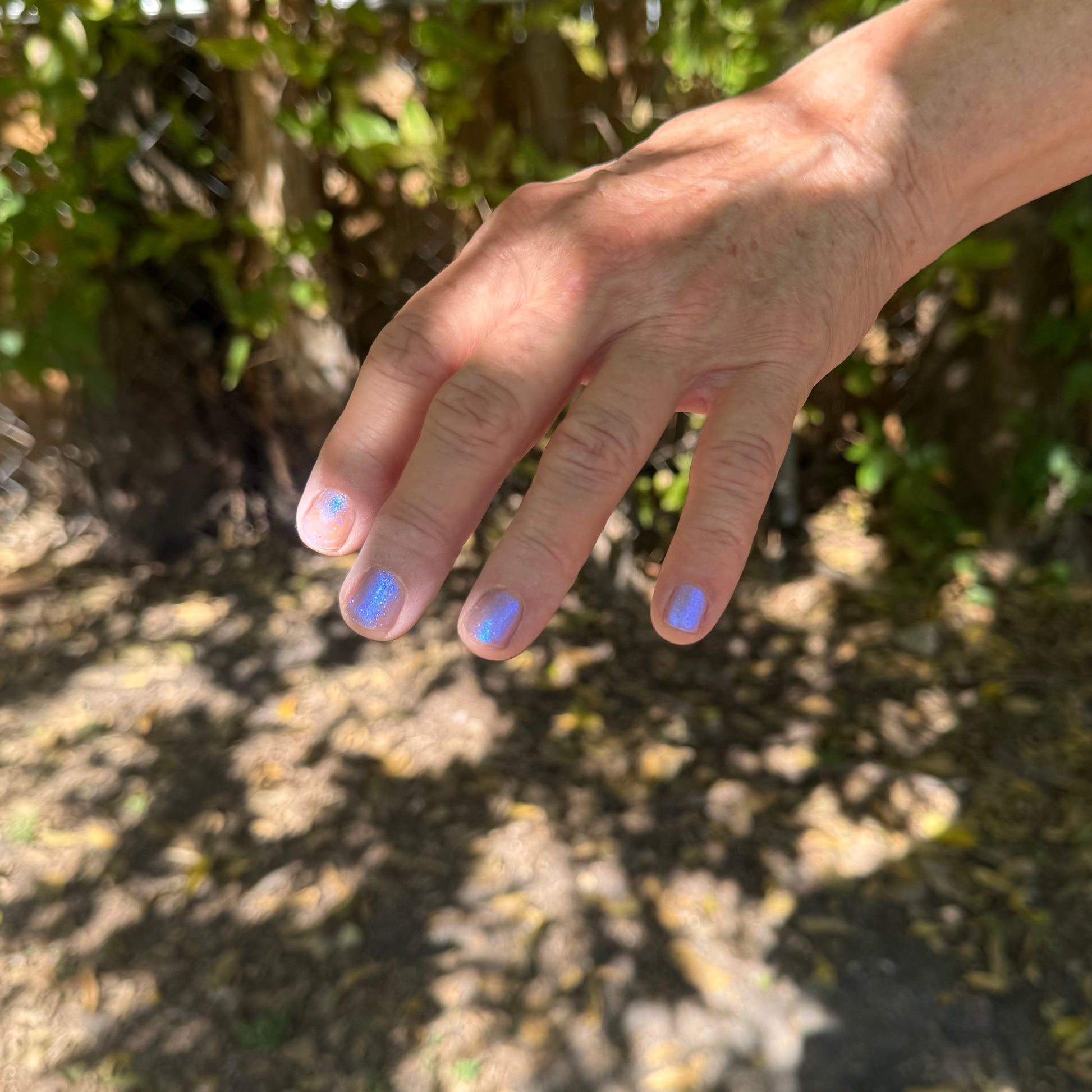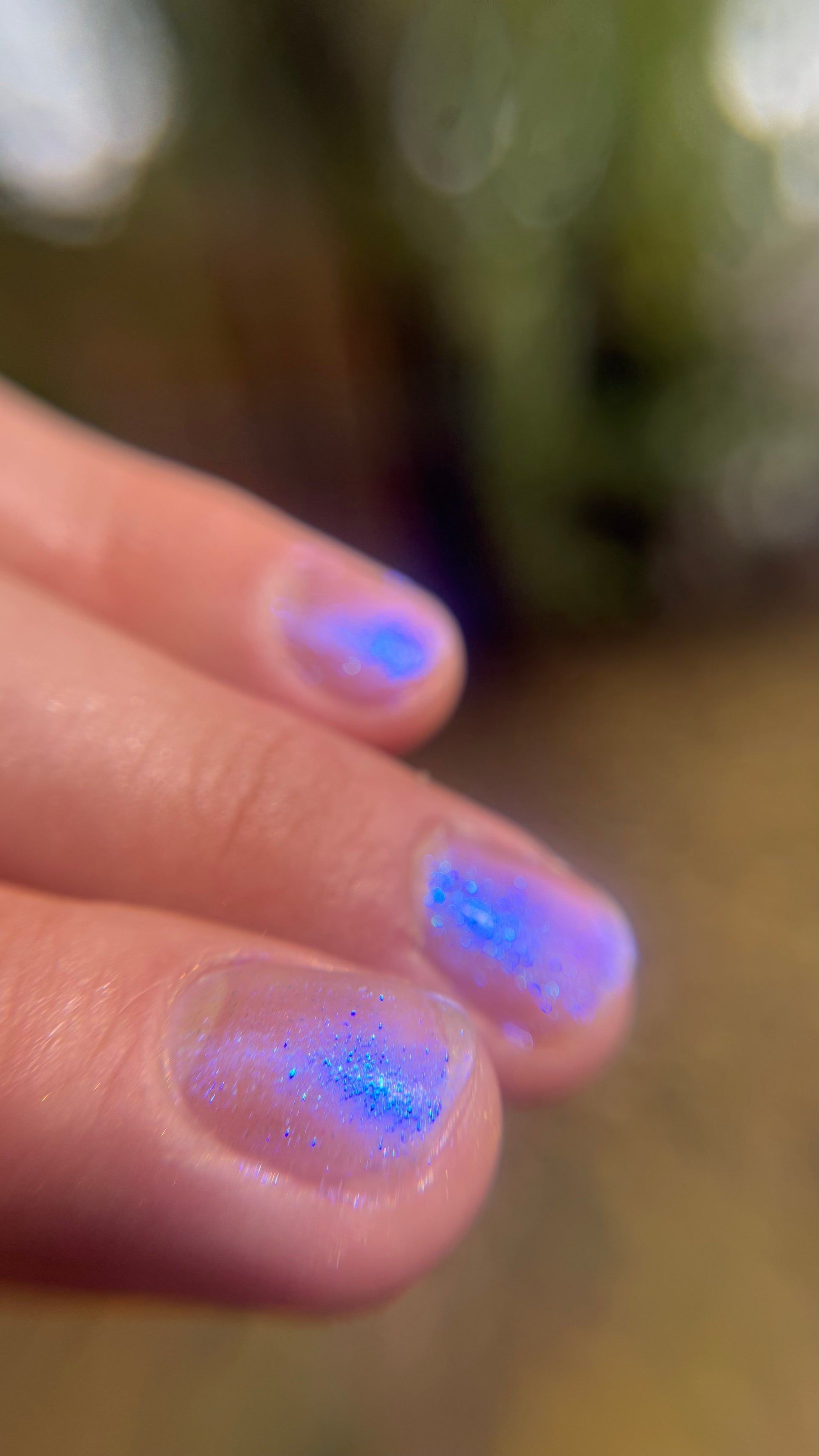 A transparent base loaded with ultra bright electric blue shimmer. Unique at every angle. Blue flame, bioluminescent, jellyfish coded.