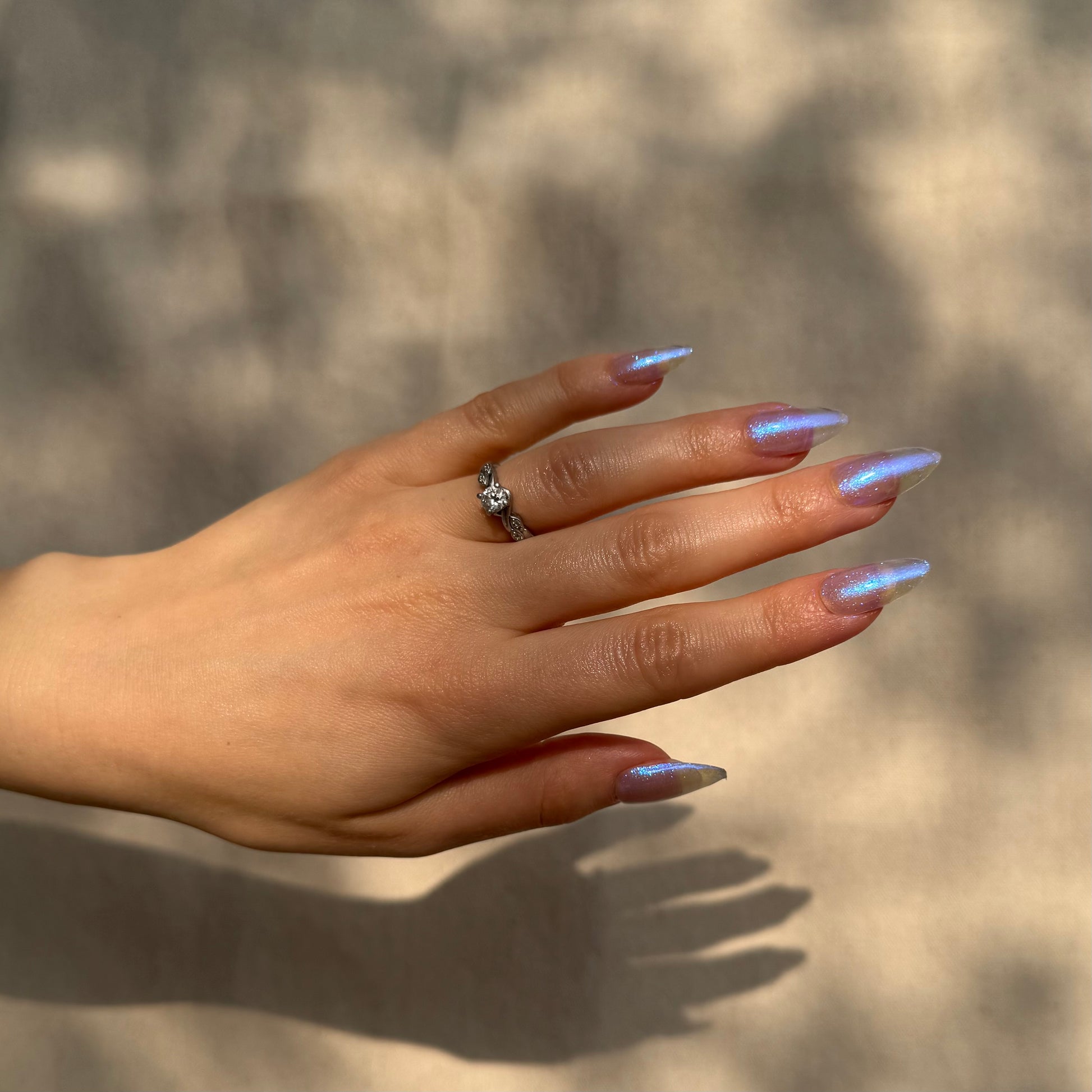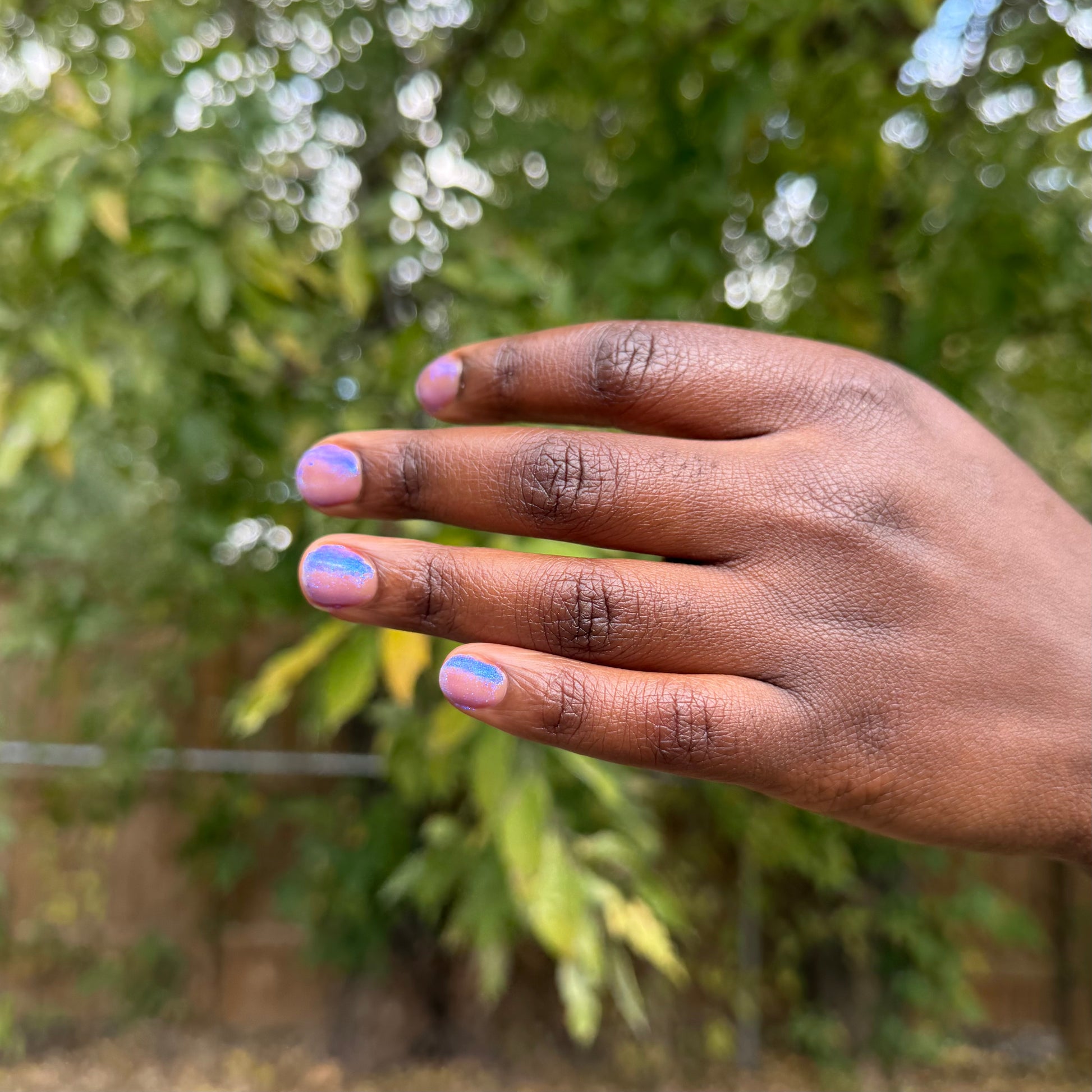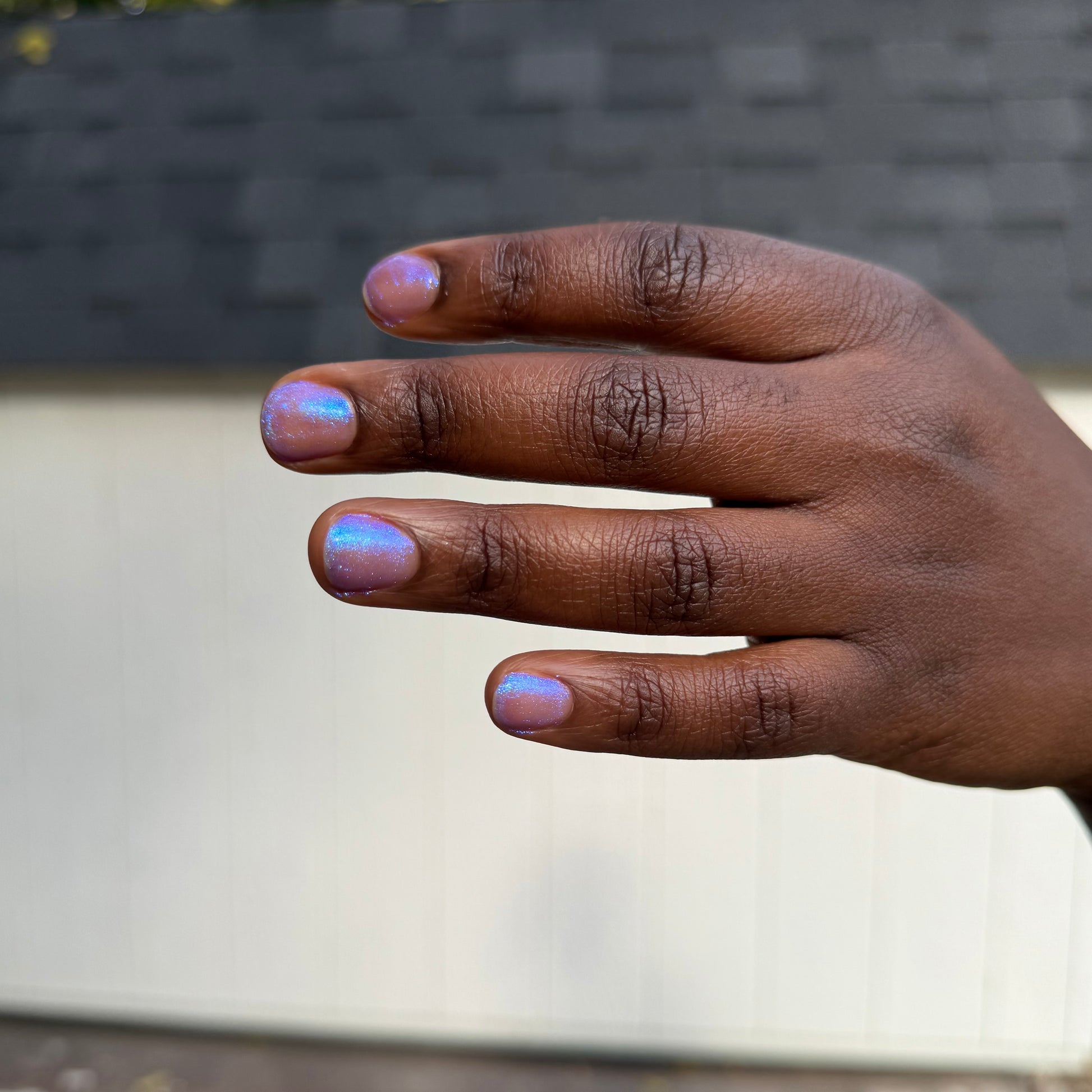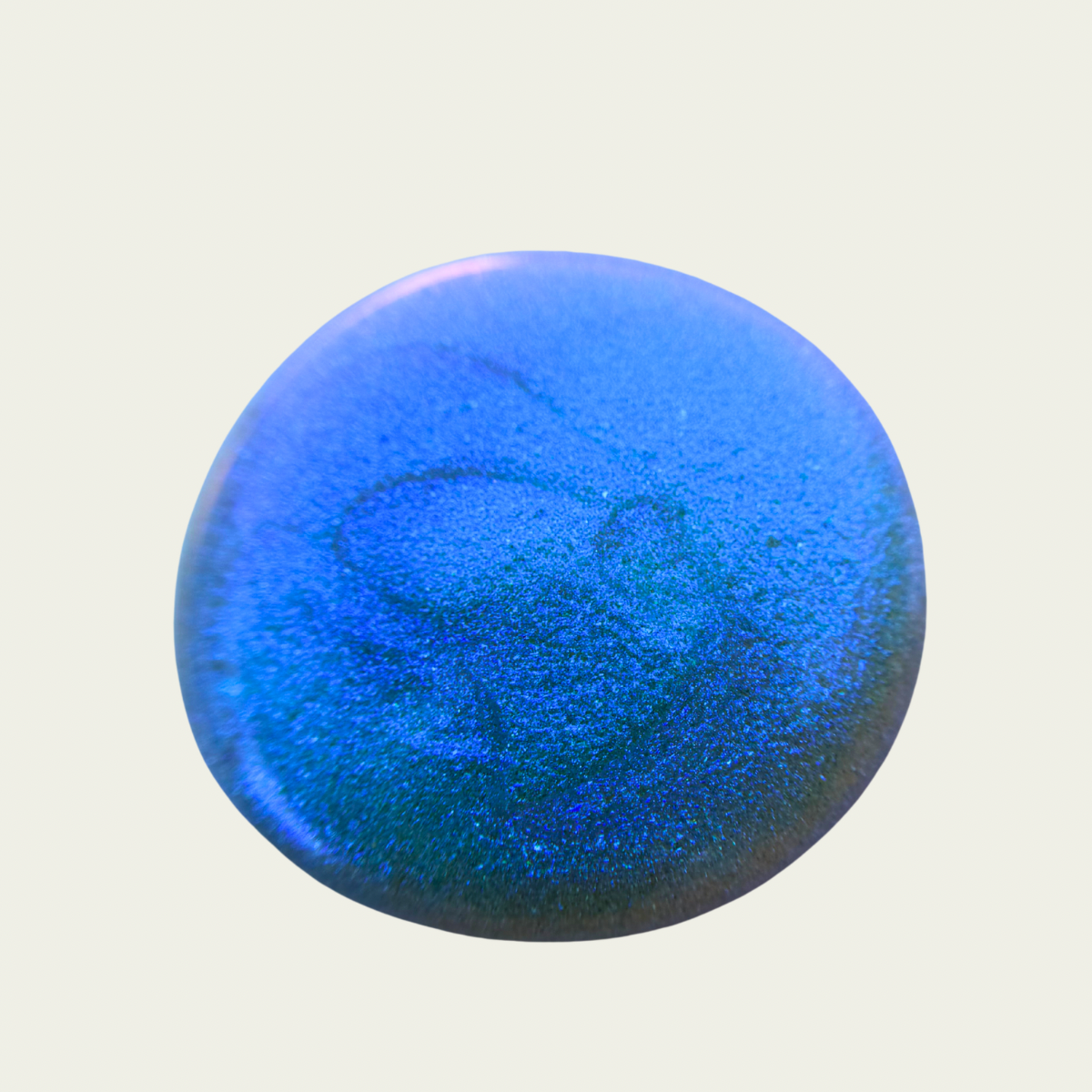 A transparent base loaded with ultra bright electric blue shimmer. Unique at every angle. Blue flame, bioluminescent, jellyfish coded.