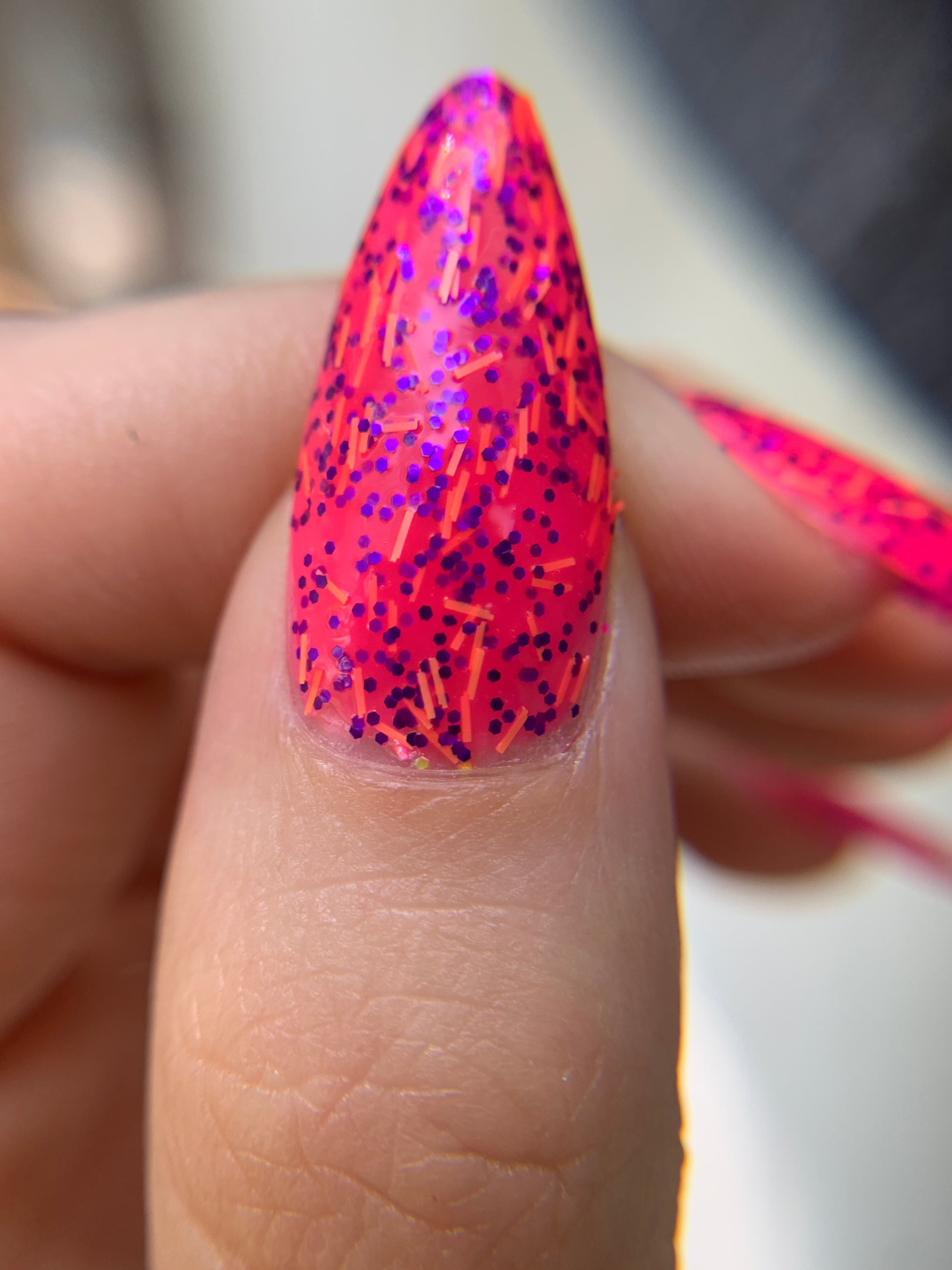 Bright pink jelly with creamsicle orange matte bars and vibrant purple glitter. High energy, swaying to the music, tiger print accent chair.