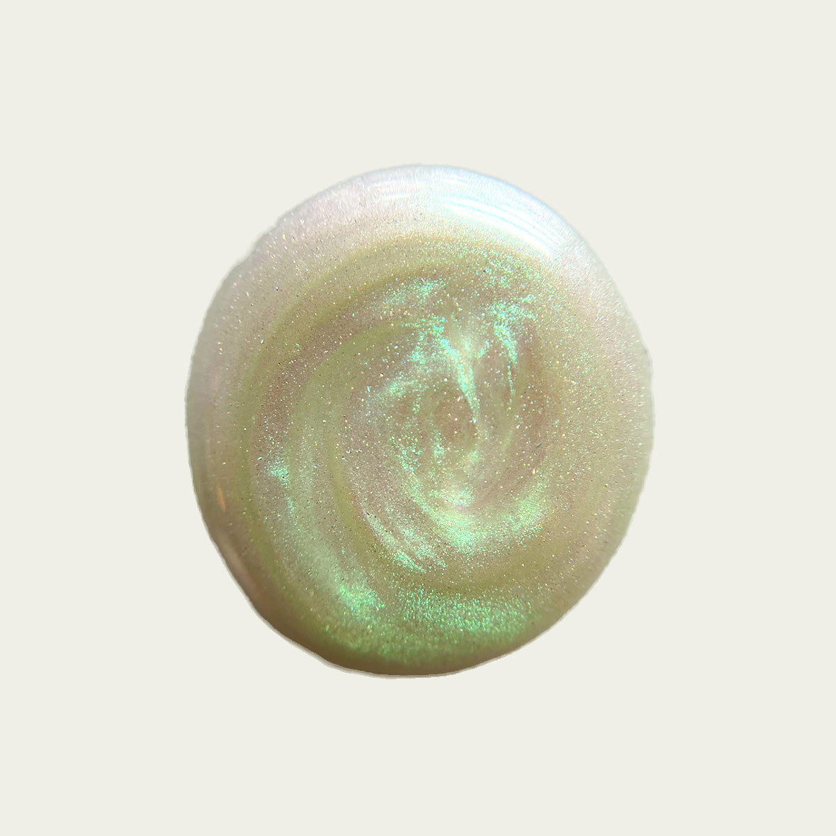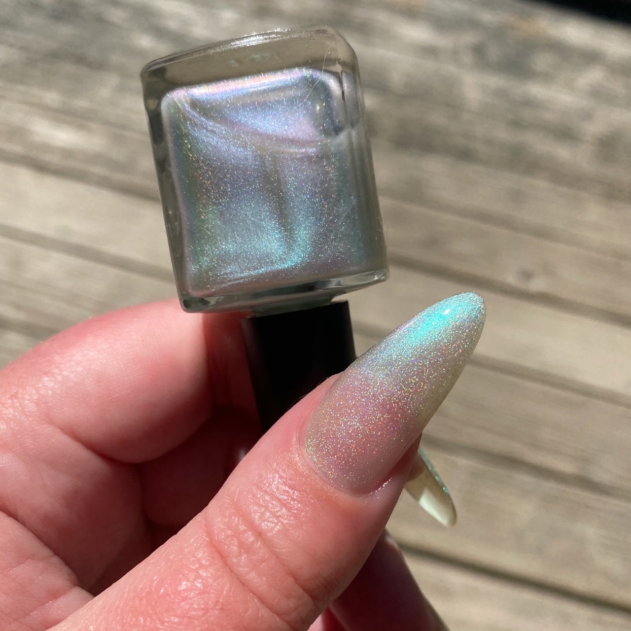 Sheer duochrome that shifts green/pink with subtle holo finish