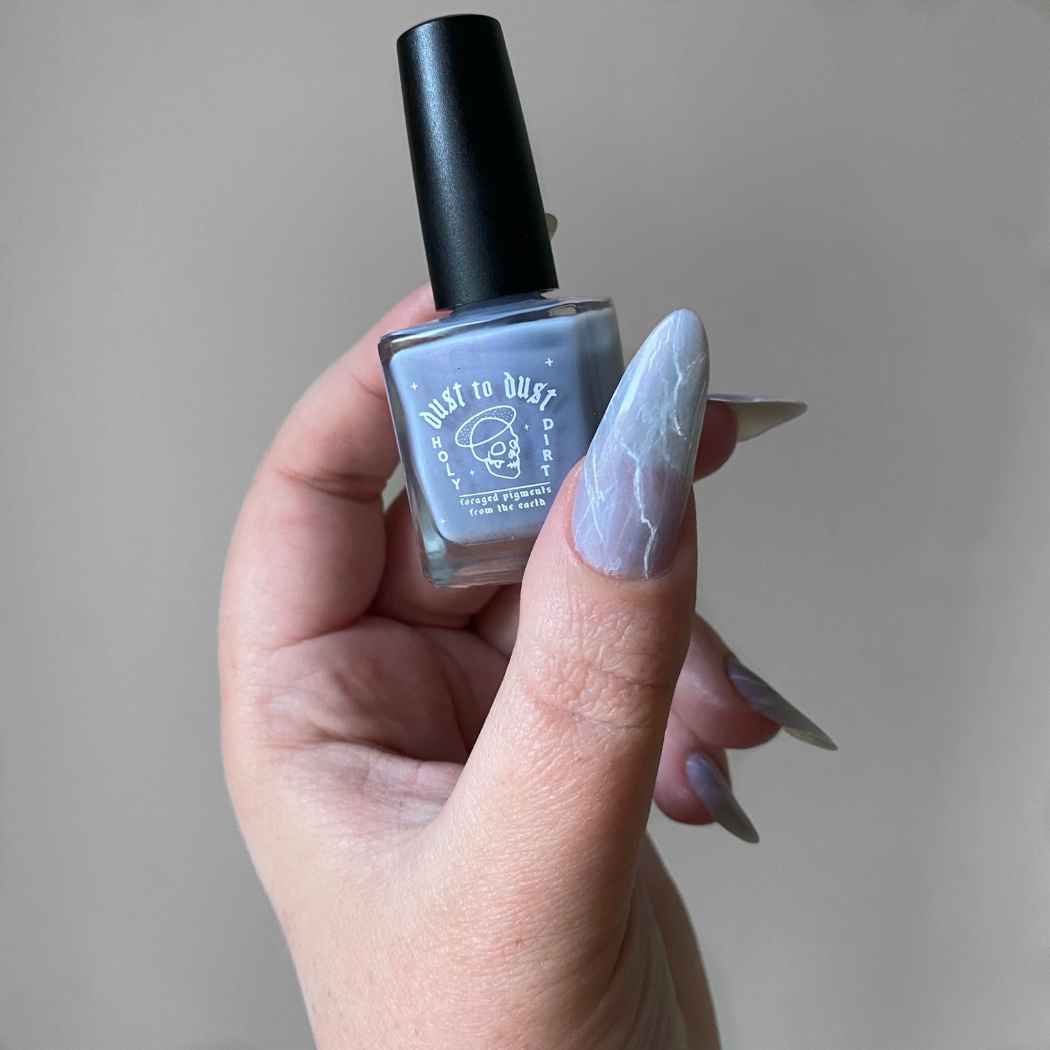 We break down this stone with a mortar and pestle. This polish is sheer but builds up beautifully. It will have texture as well as larger pieces of pigment present in the polish finish. Each batch will have slight color variations as we use different parts of the source material. This polish contains a small amount of earth mica to enhance the natural color. This polish contains a small amount of earth mica to enhance the natural color. The white veining in our swatch photo is the result of nail art and does not occur naturally from this polish.