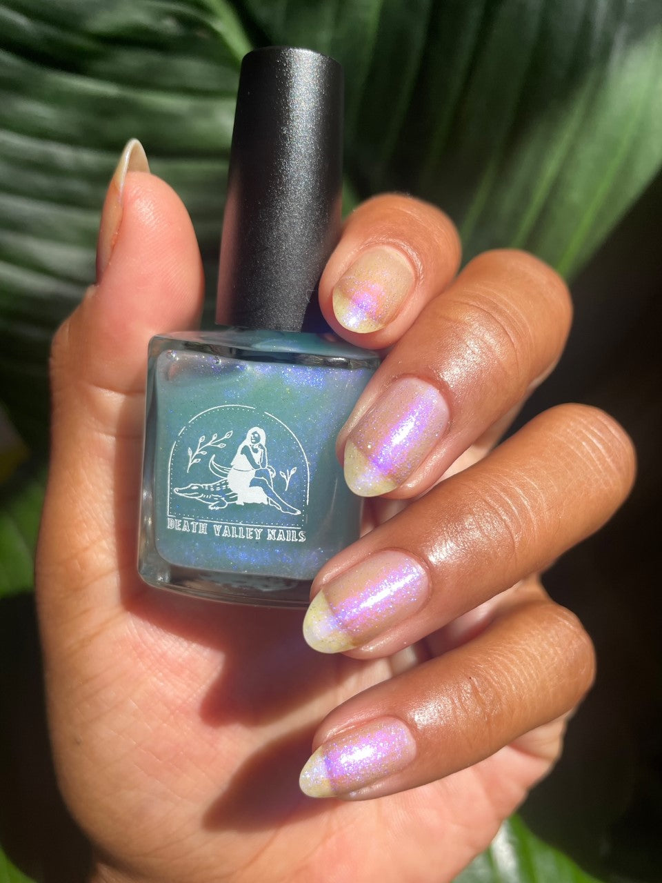 We break down this pigment with a mortar and pestle. This polish is sheer but builds up beautifully. It will have texture as well as larger pieces of pigment present in the polish finish. Each batch will have slight color variations as we use different parts of the source material. This polish contains a small amount of earth mica to enhance the natural color.