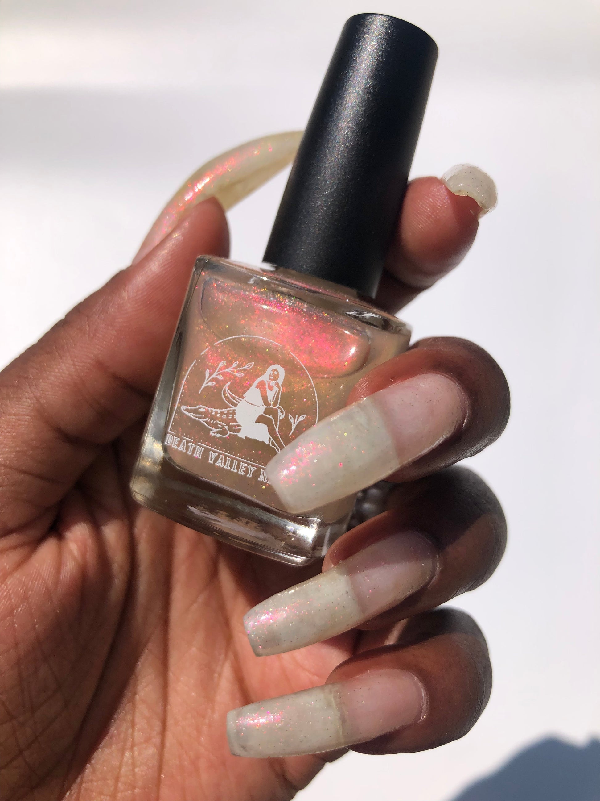 We break down this pigment by hand with a mortar and pestle. This polish is sheer but builds up beautifully. It will have texture as well as larger pieces of pigment present in the polish finish. Each batch will have slight color variations as we use different parts of the source material. This polish contains a small amount of earth mica to enhance the natural color.