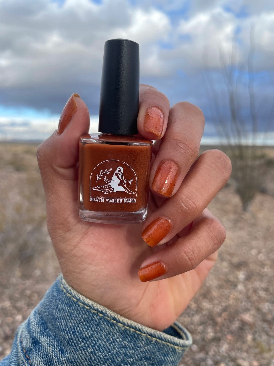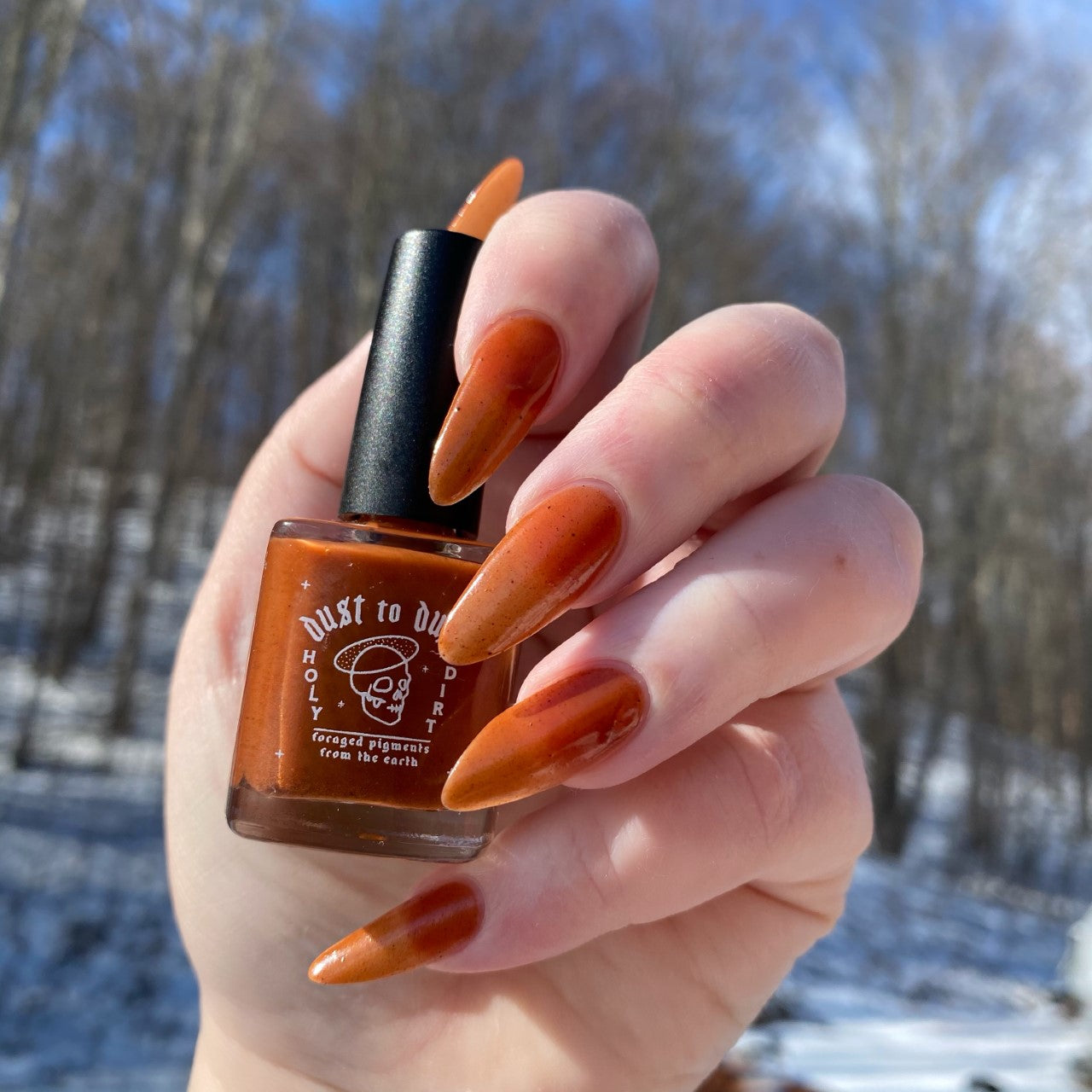 This polish is naturally colored from the pigment that is broken down and will have texture as well as larger pieces of pigment present in the polish finish. Each batch will have slight color variations. Naturally, larger particles will stick to the bottom and sides of the bottle and not suspend in the polish base. This polish in particular will have most of the pigment gathered to the bottom of the bottle because of the pigment weight, we recommend turning the bottle upside down to loosen the pigment or using a tool to retrieve the Fossils from the bottom of the bottle. This polish creates an effect as a topper and is not opaque.
