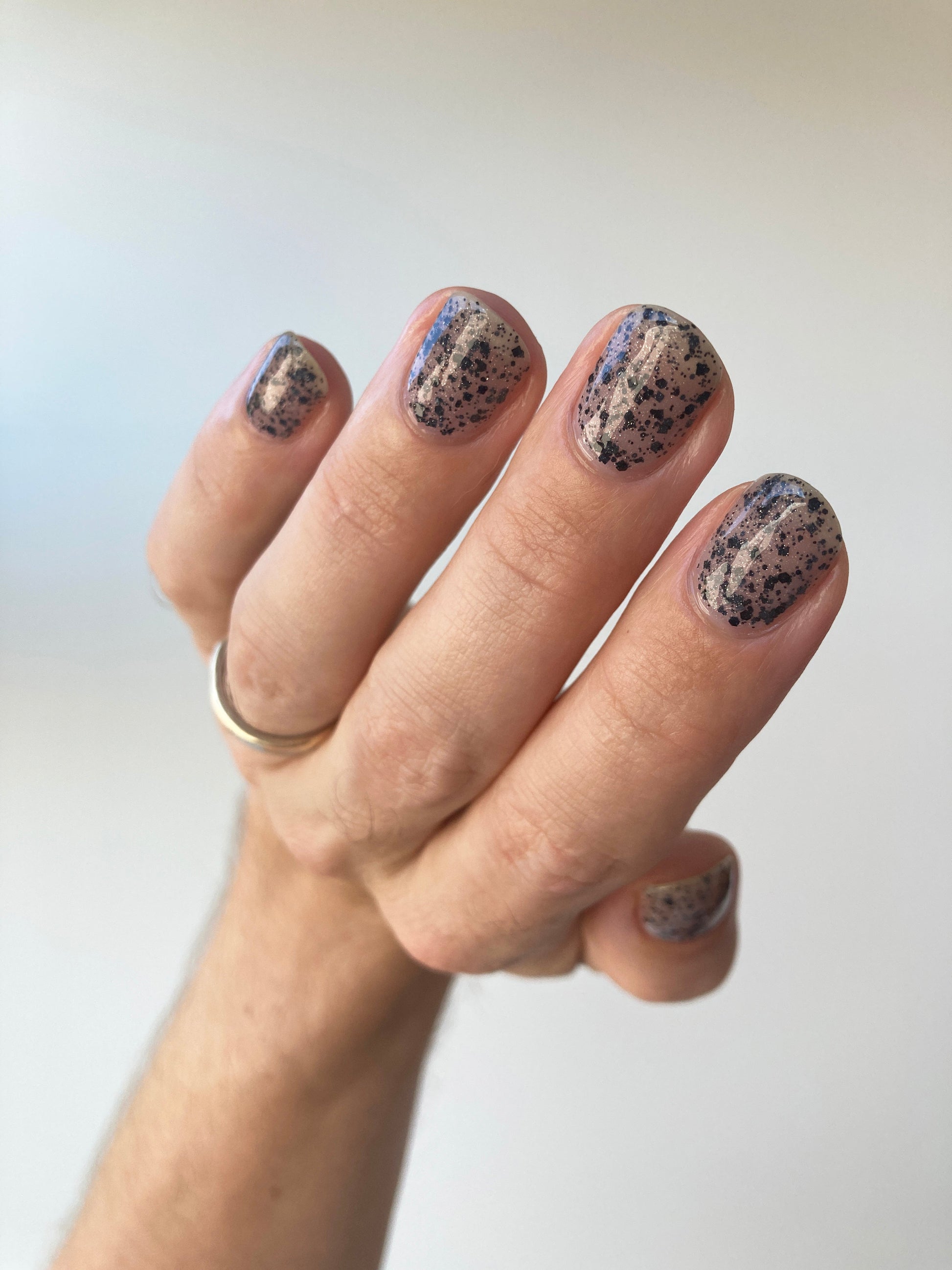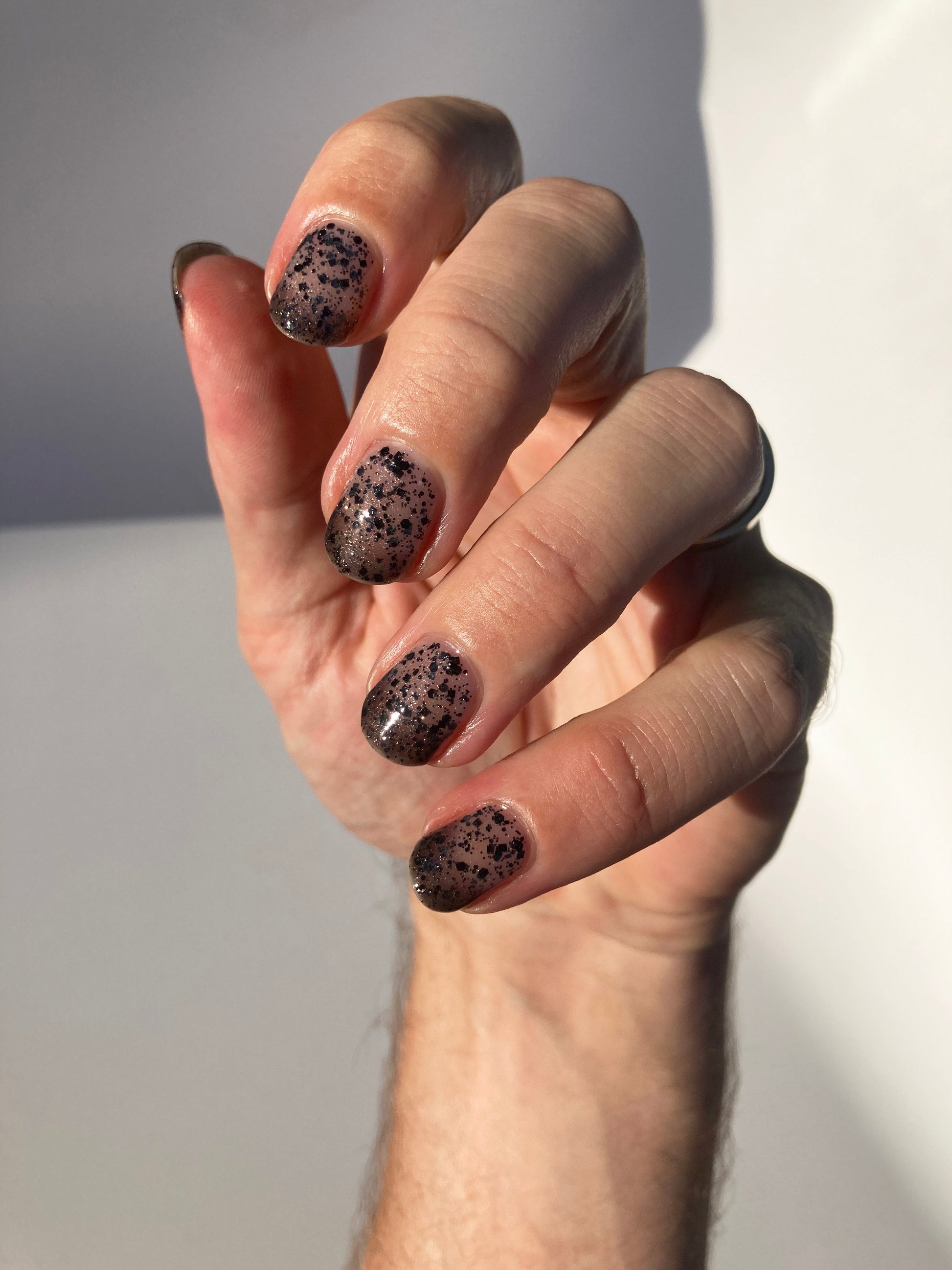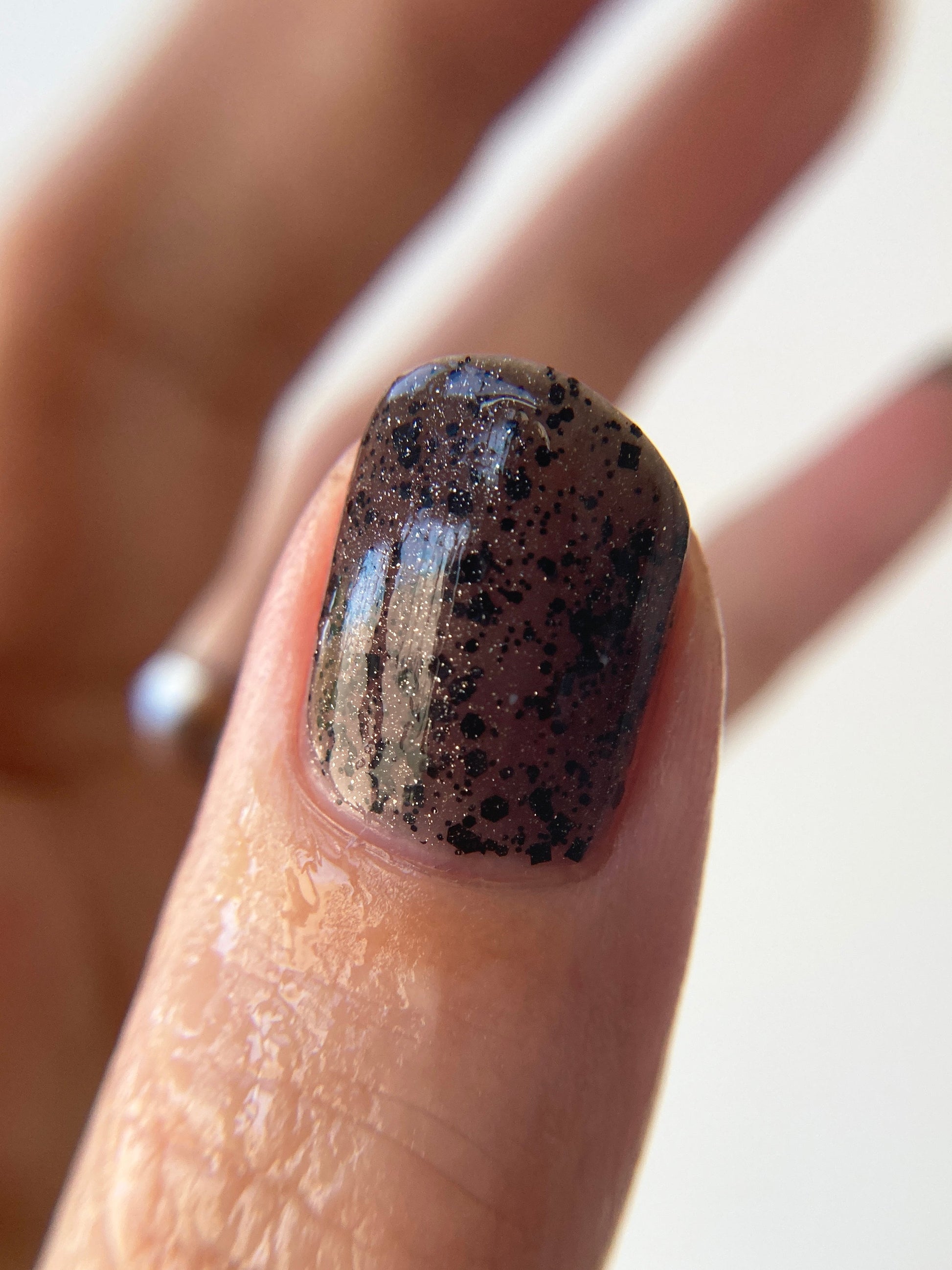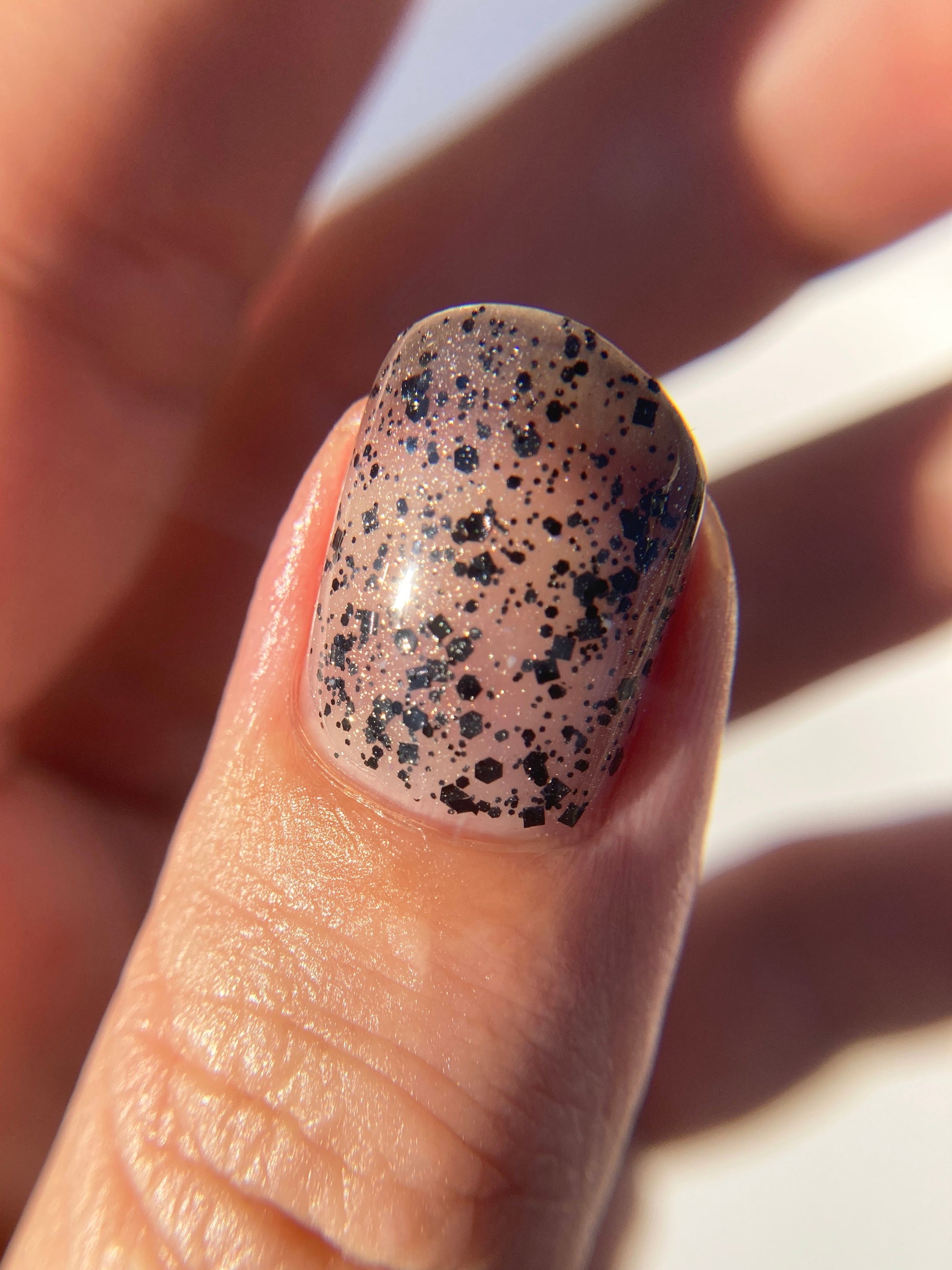 This thermal polish changes at 88° F and has multiple shapes of black glitter and a light chrome shimmer.