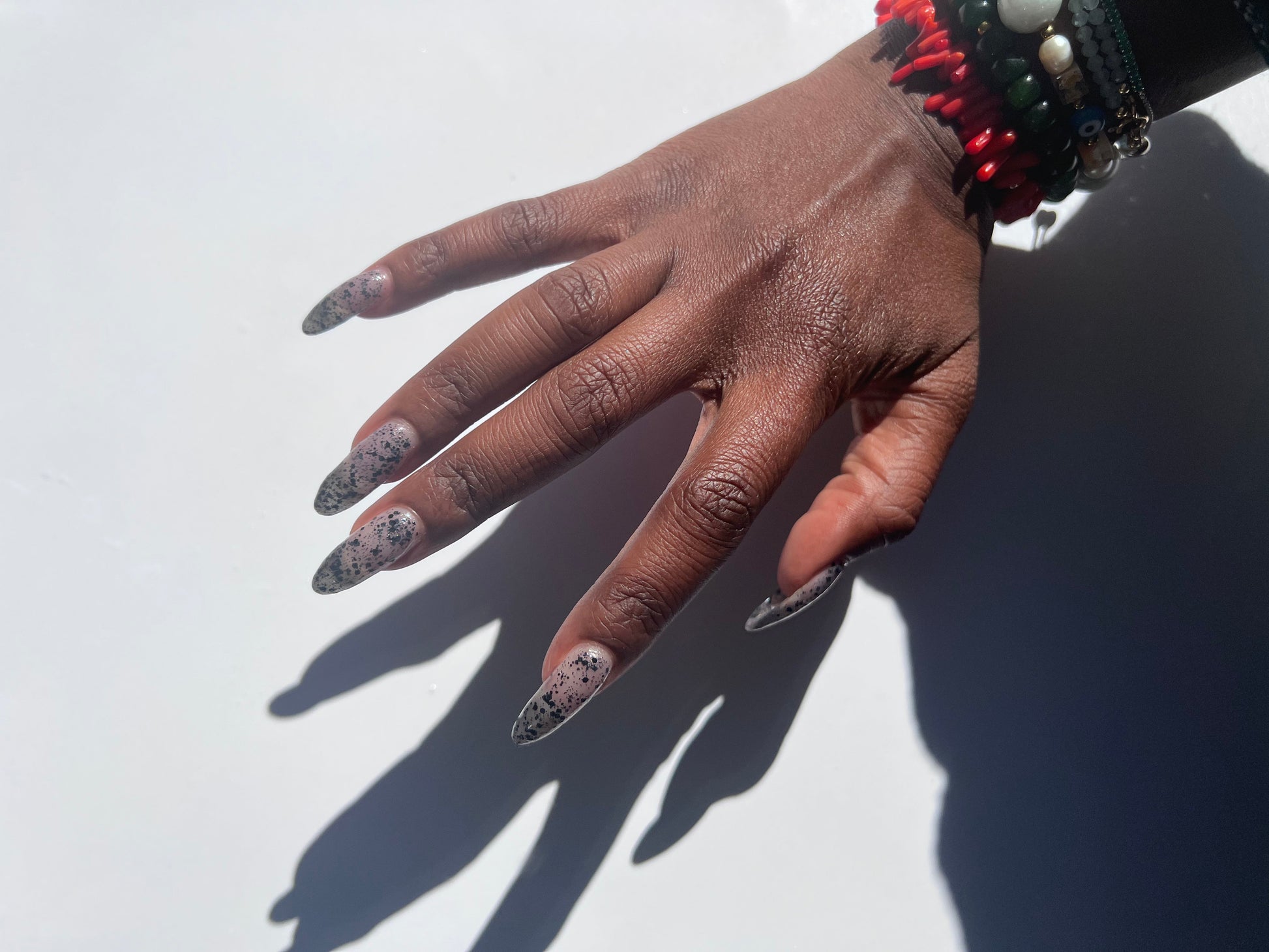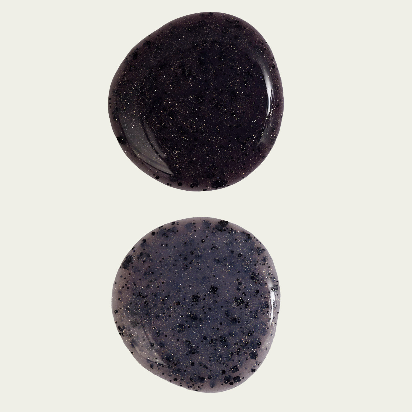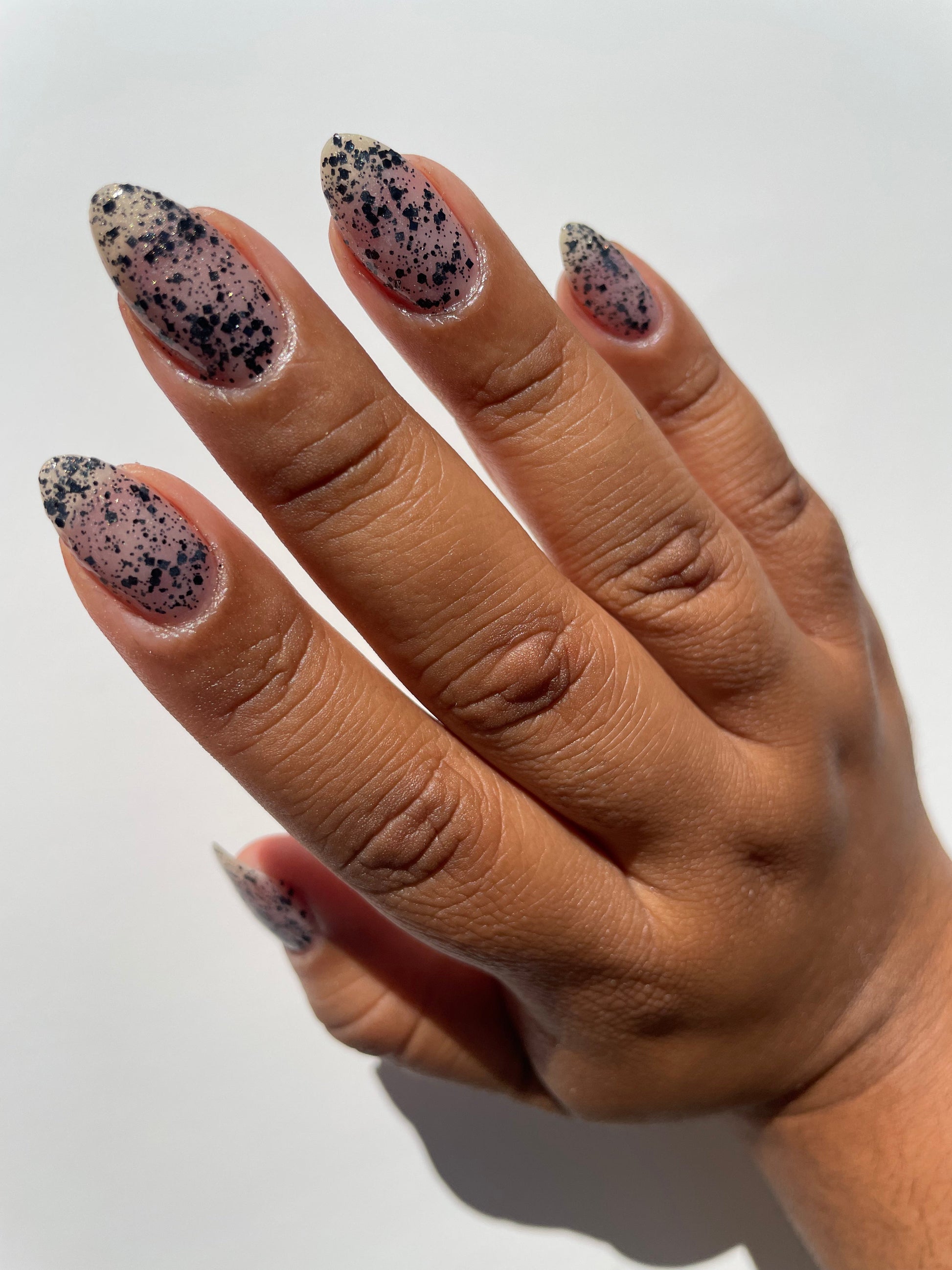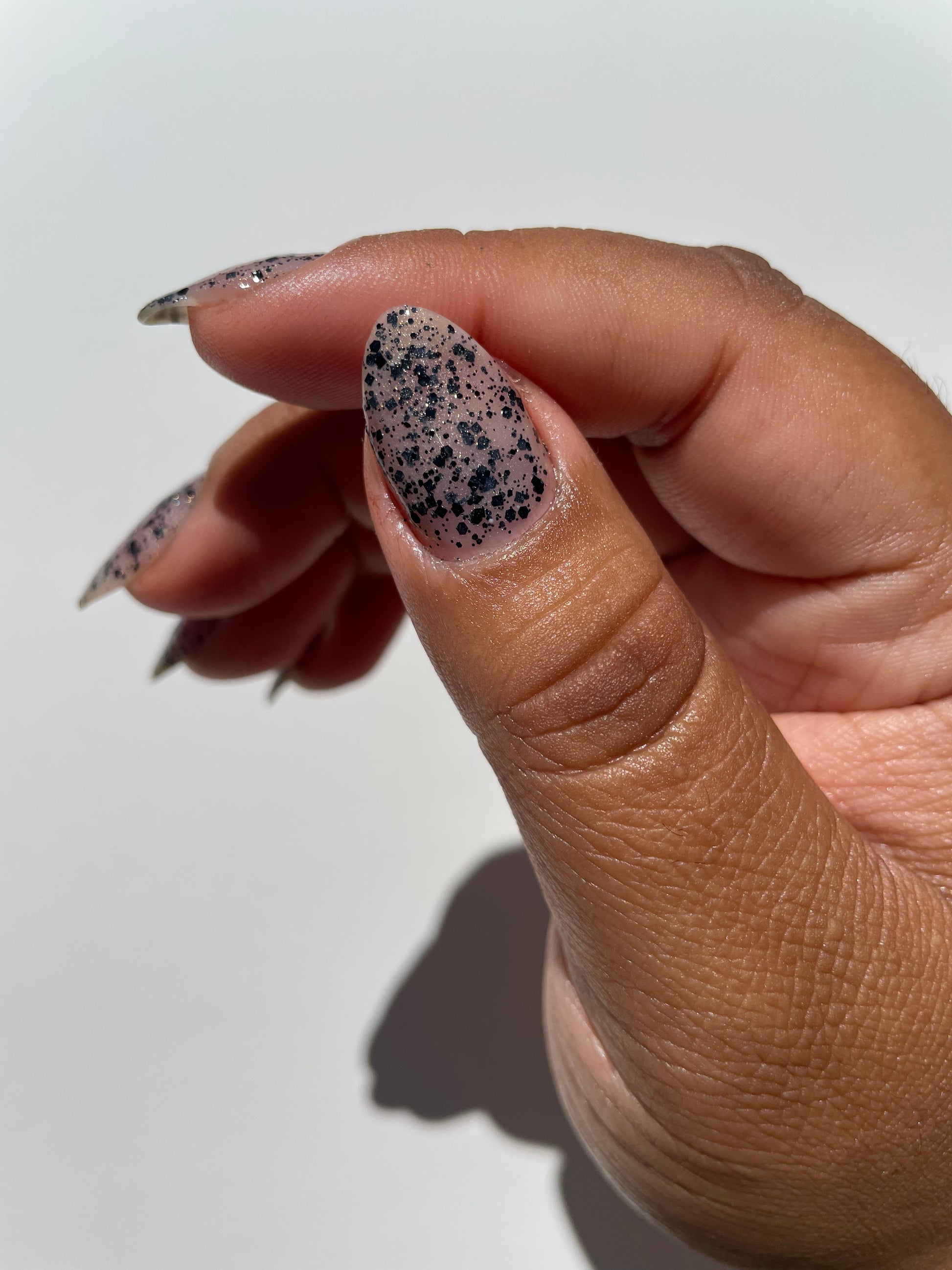 This thermal polish changes at 88° F and has multiple shapes of black glitter and a light chrome shimmer.