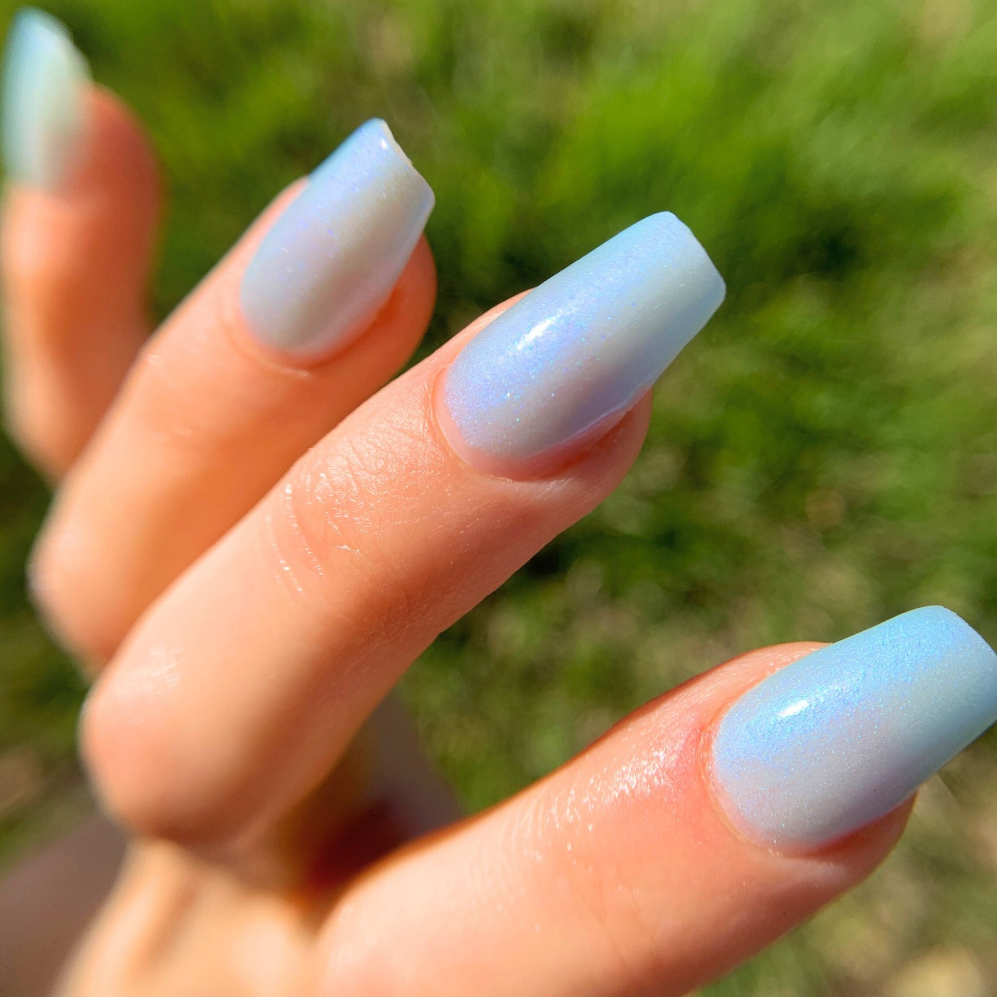 Ethereal blue with shimmer / glows greenish blue
