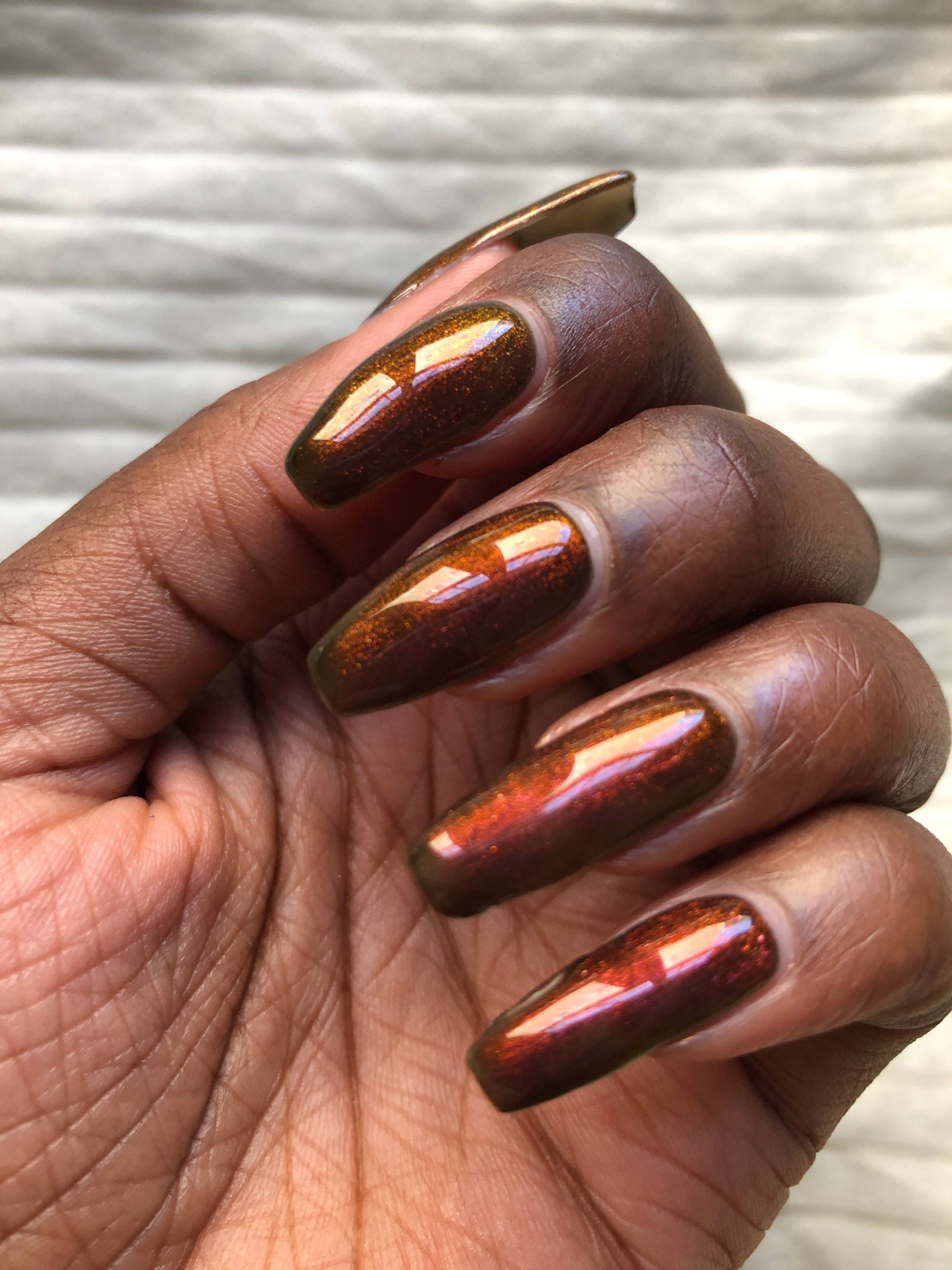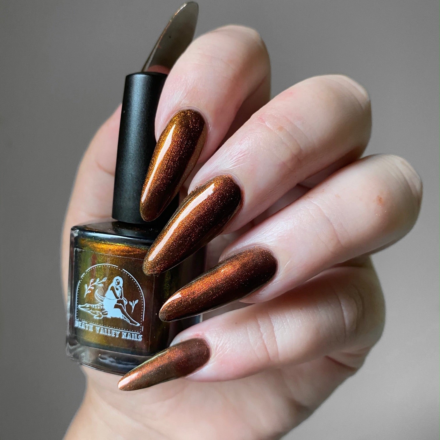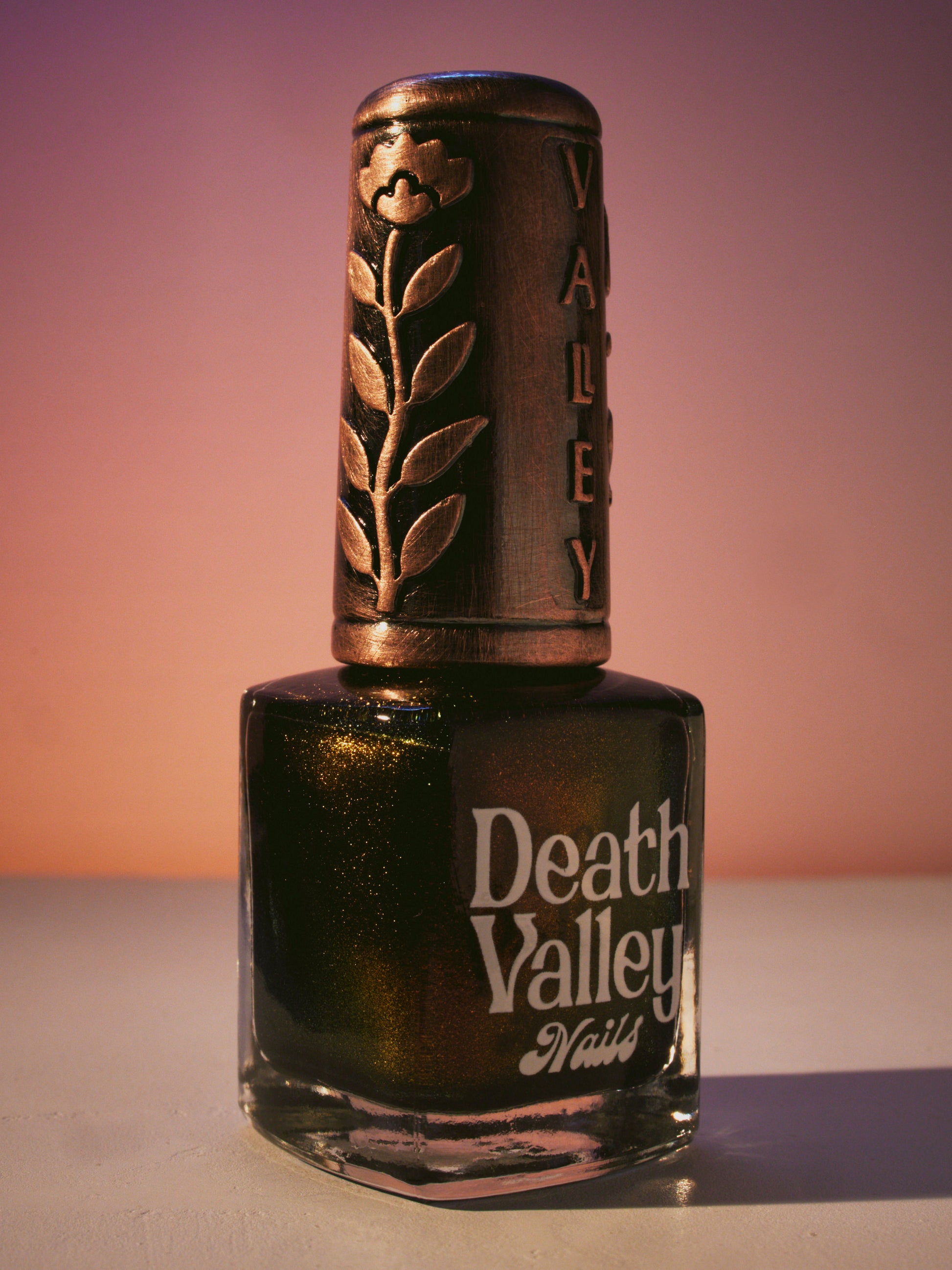 This polish comes with a removable handmade decorative bronze cap atop our standard black matte nail polish cap - merging artistry with function. To forego bronze caps on your order click here.