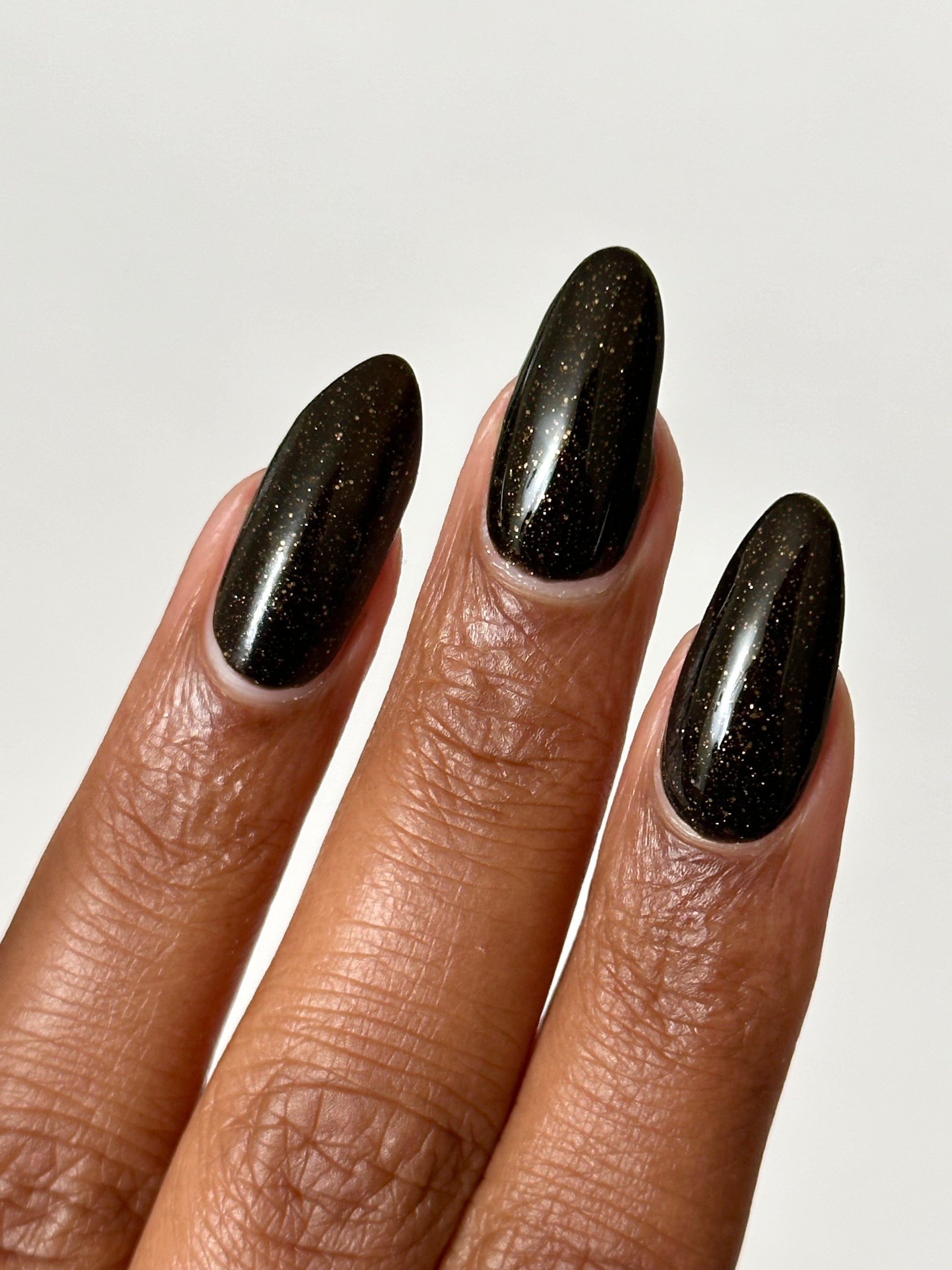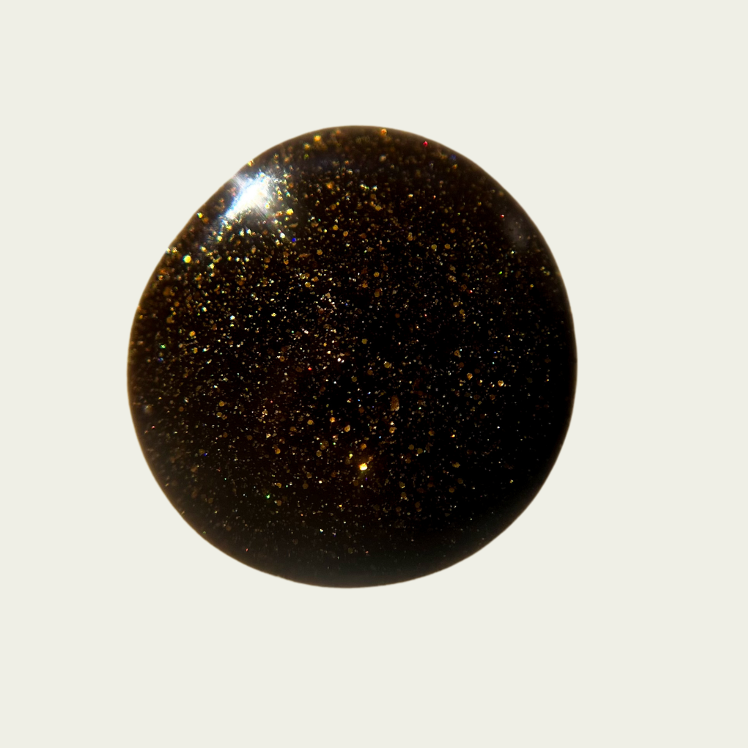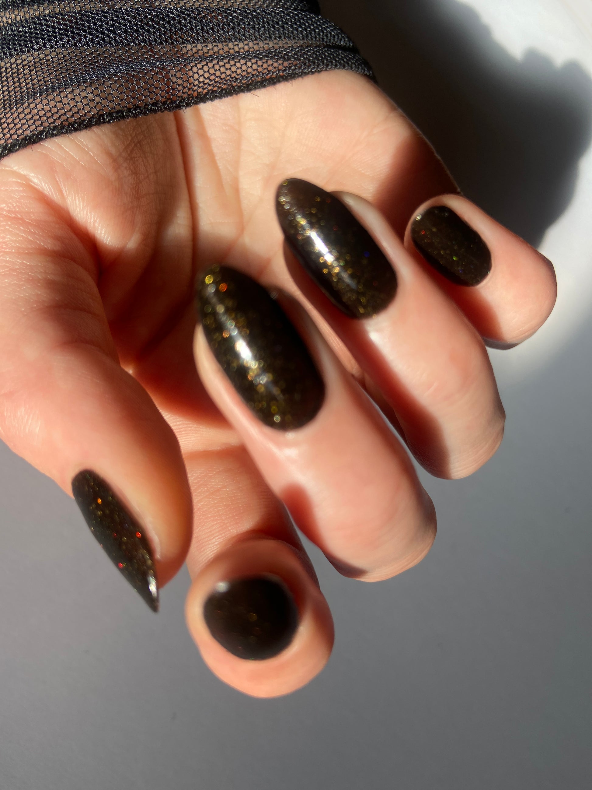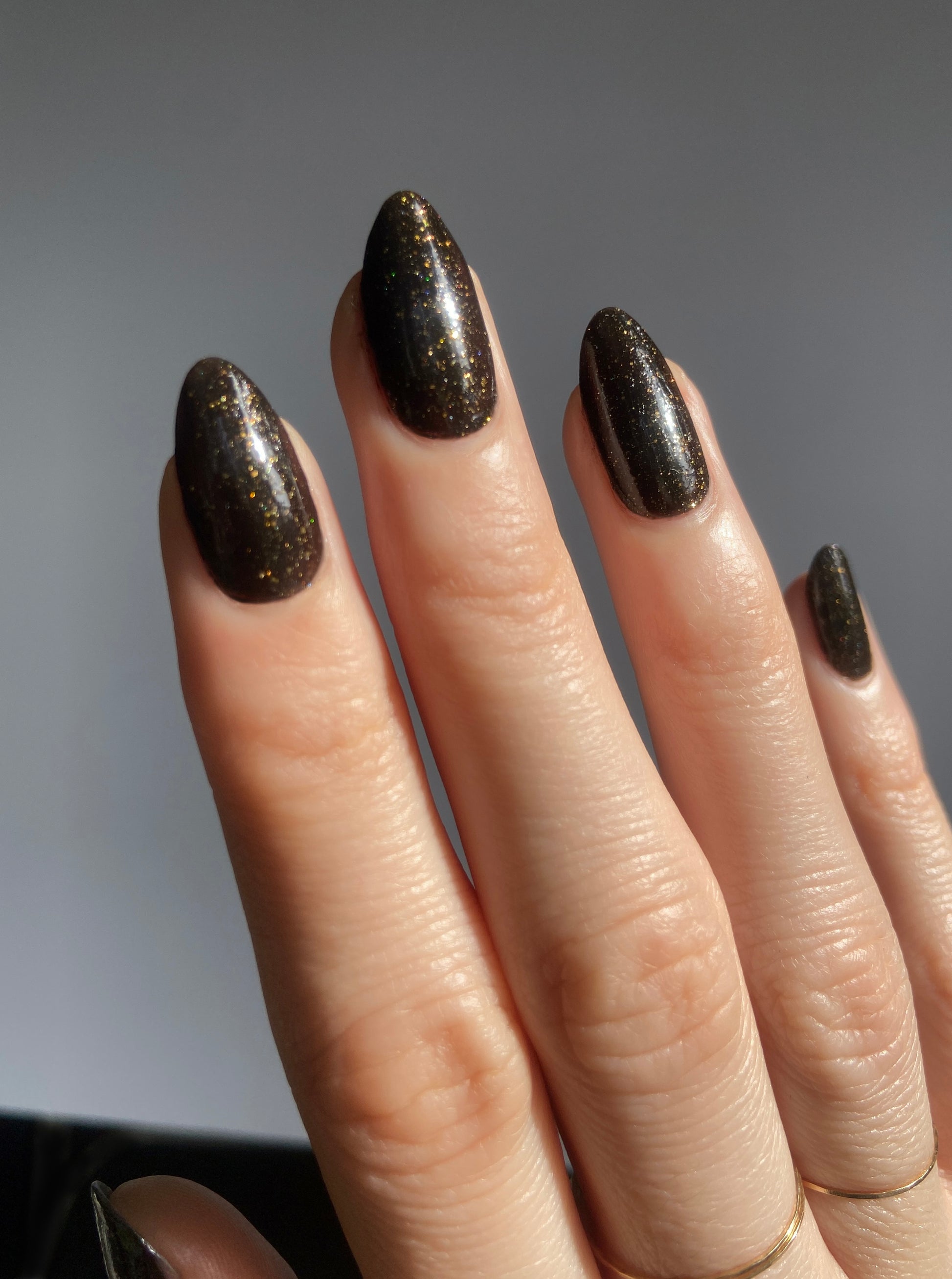 Dark umber filled with gold glitter, micro gold glitter, holo gold glitter, and micro gold shreds