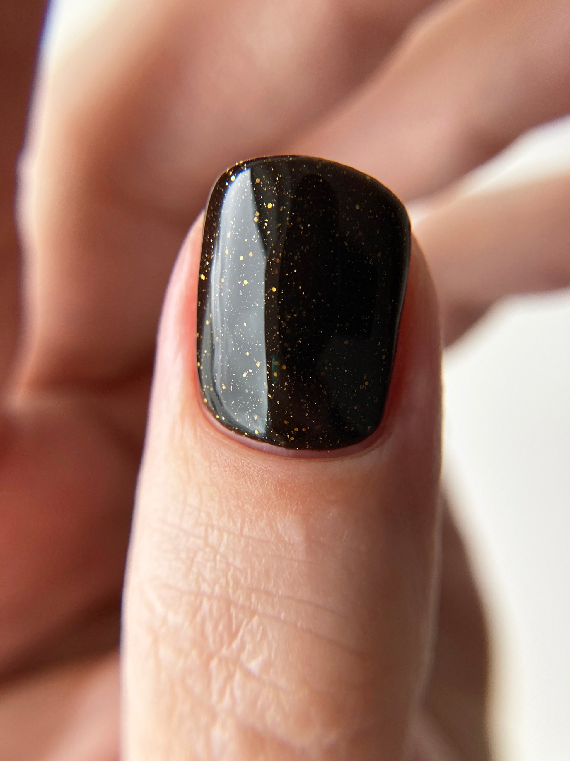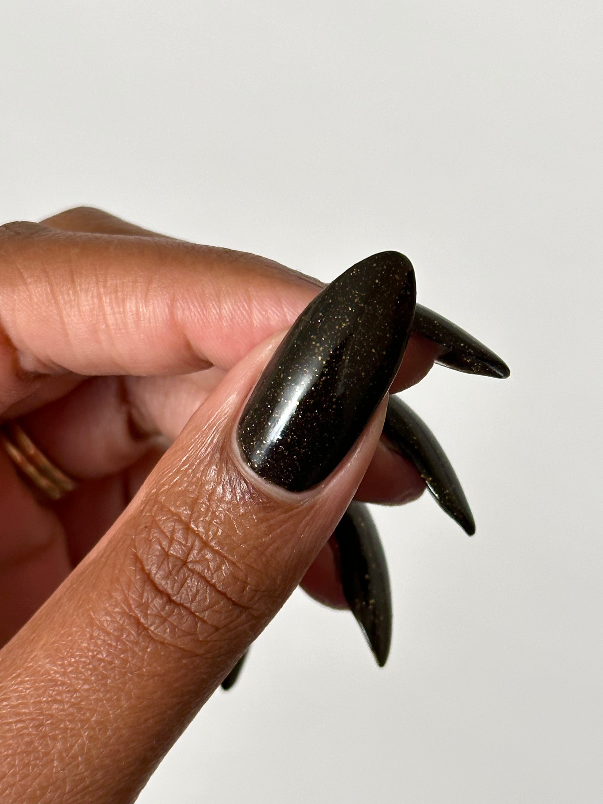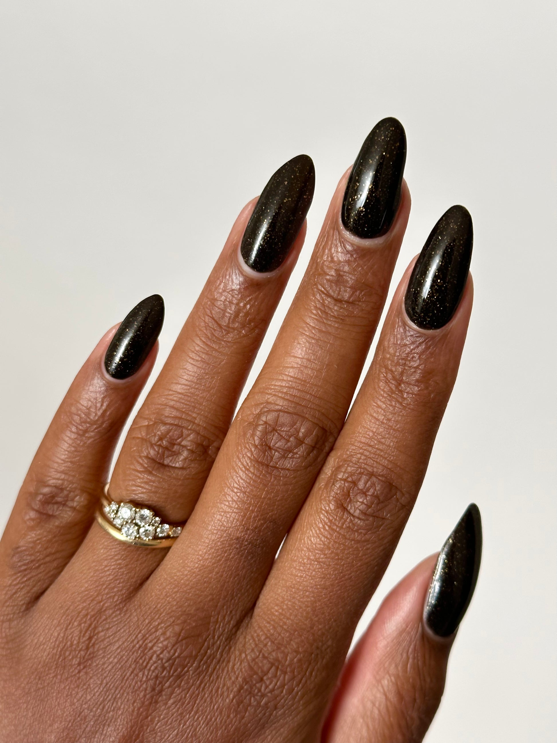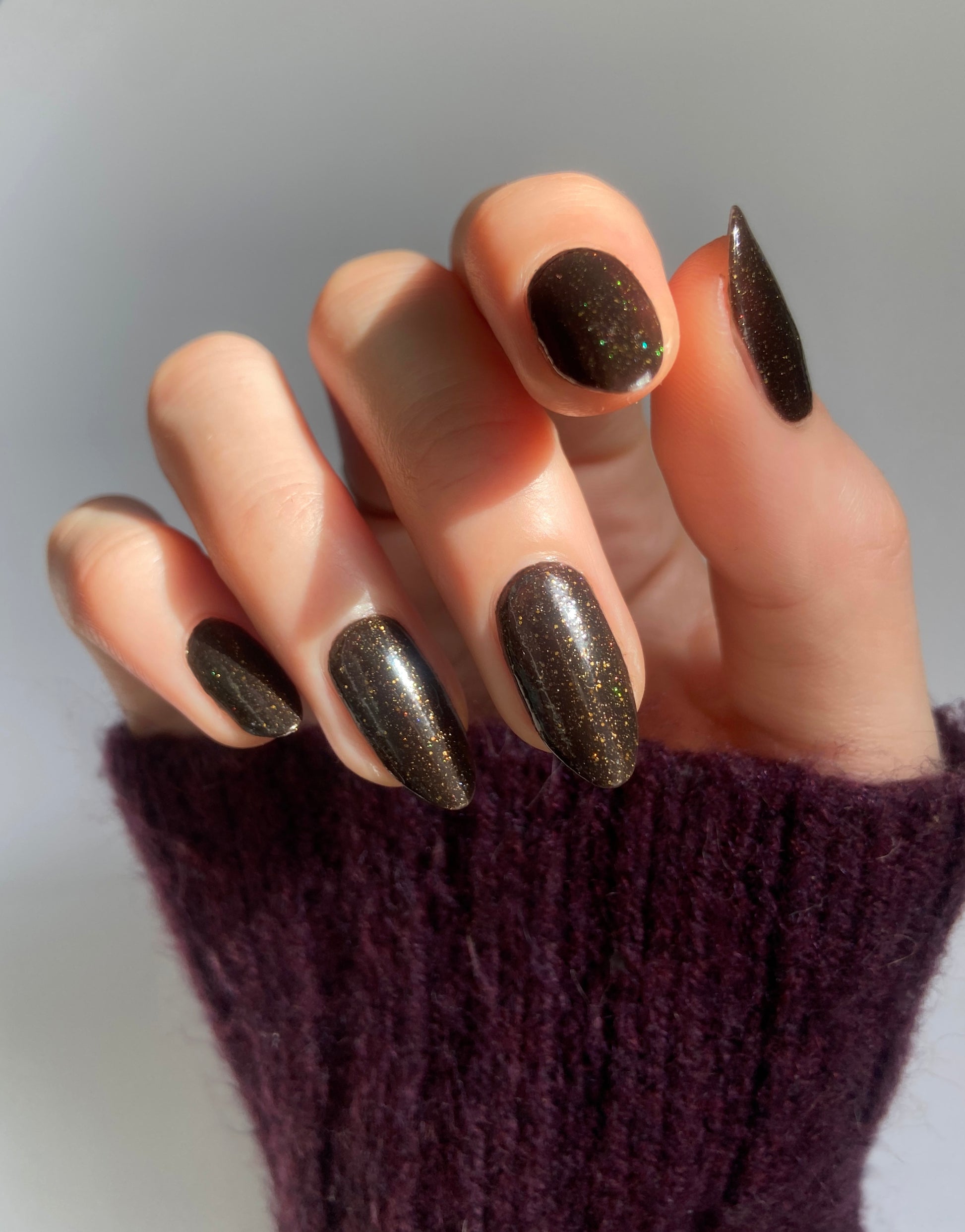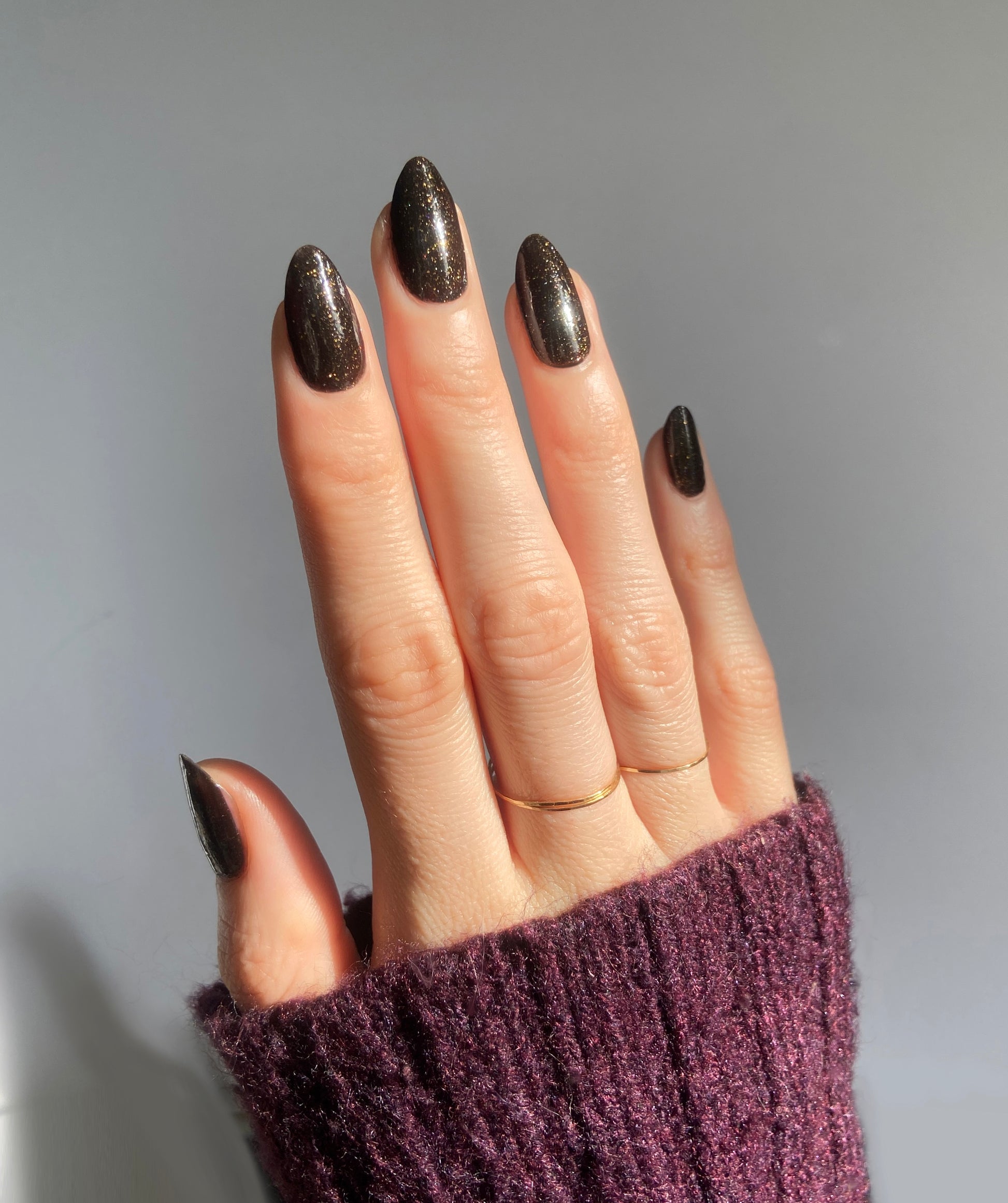 Dark umber filled with gold glitter, micro gold glitter, holo gold glitter, and micro gold shreds