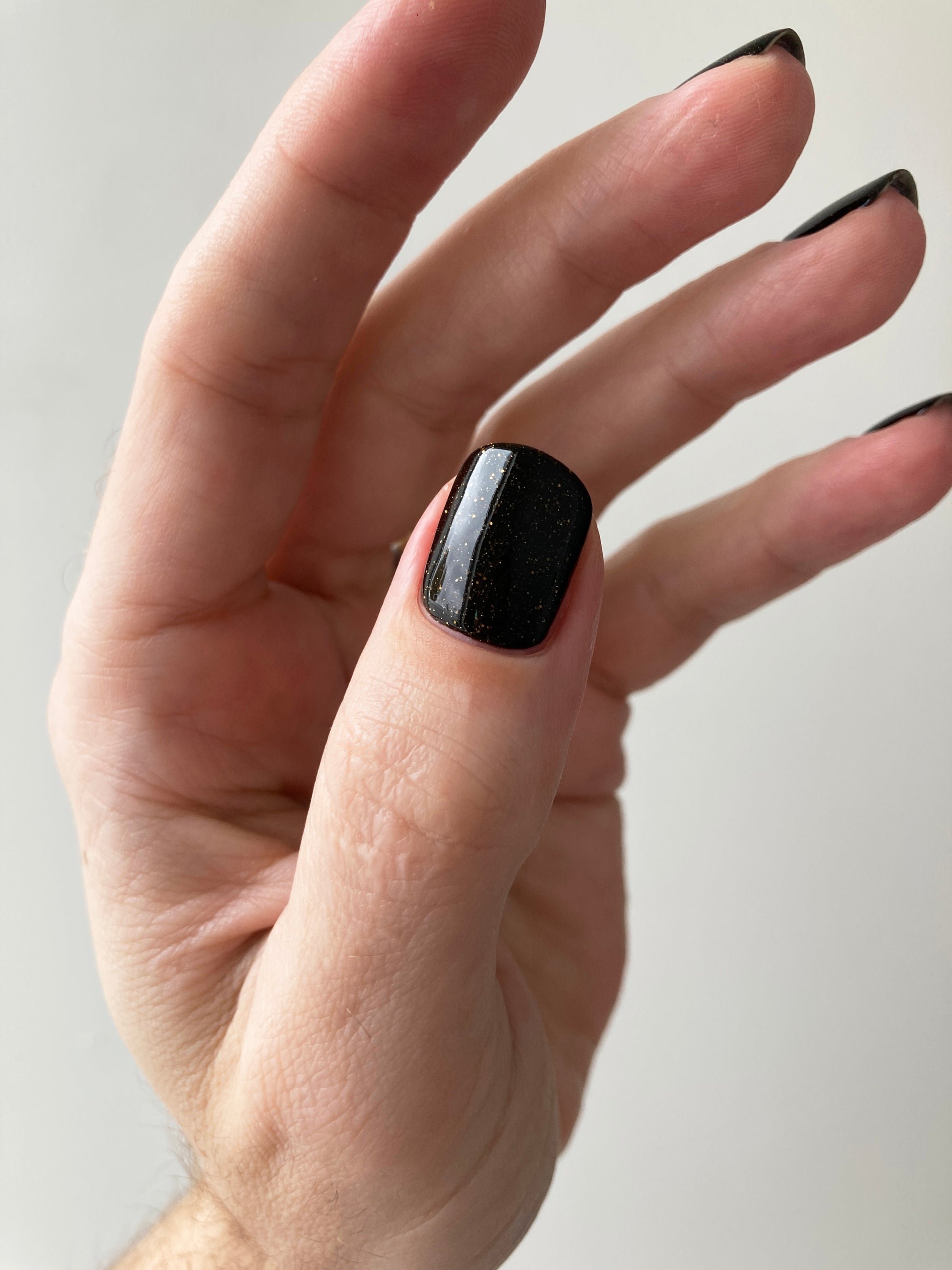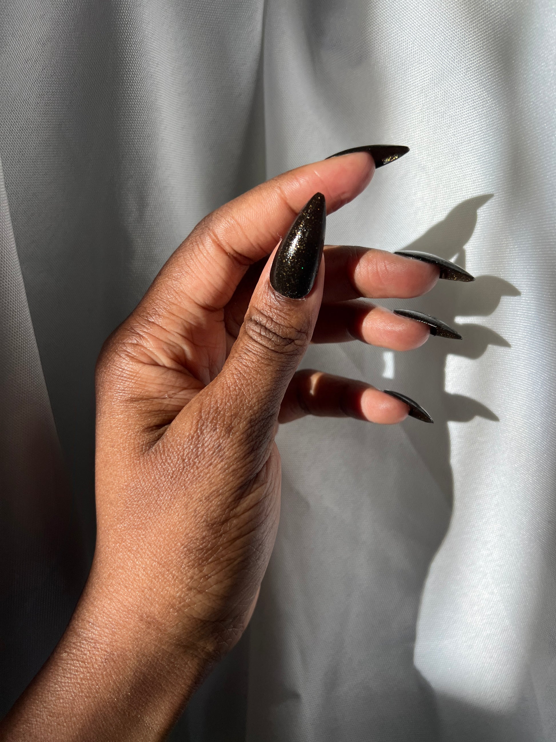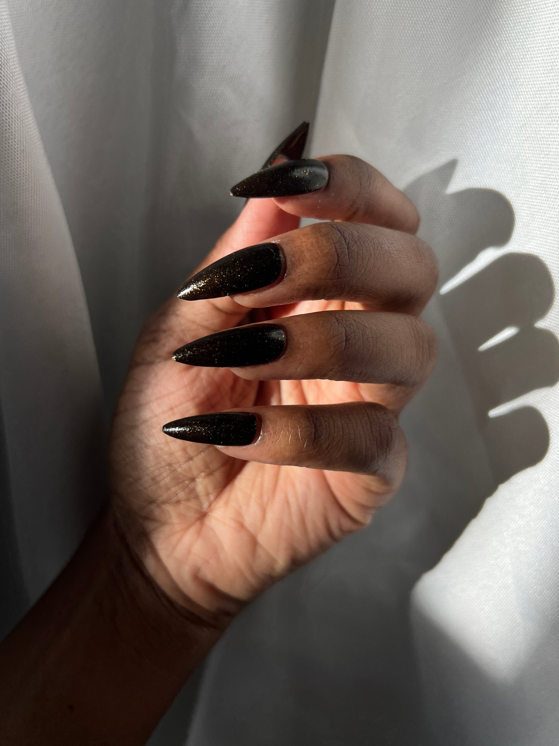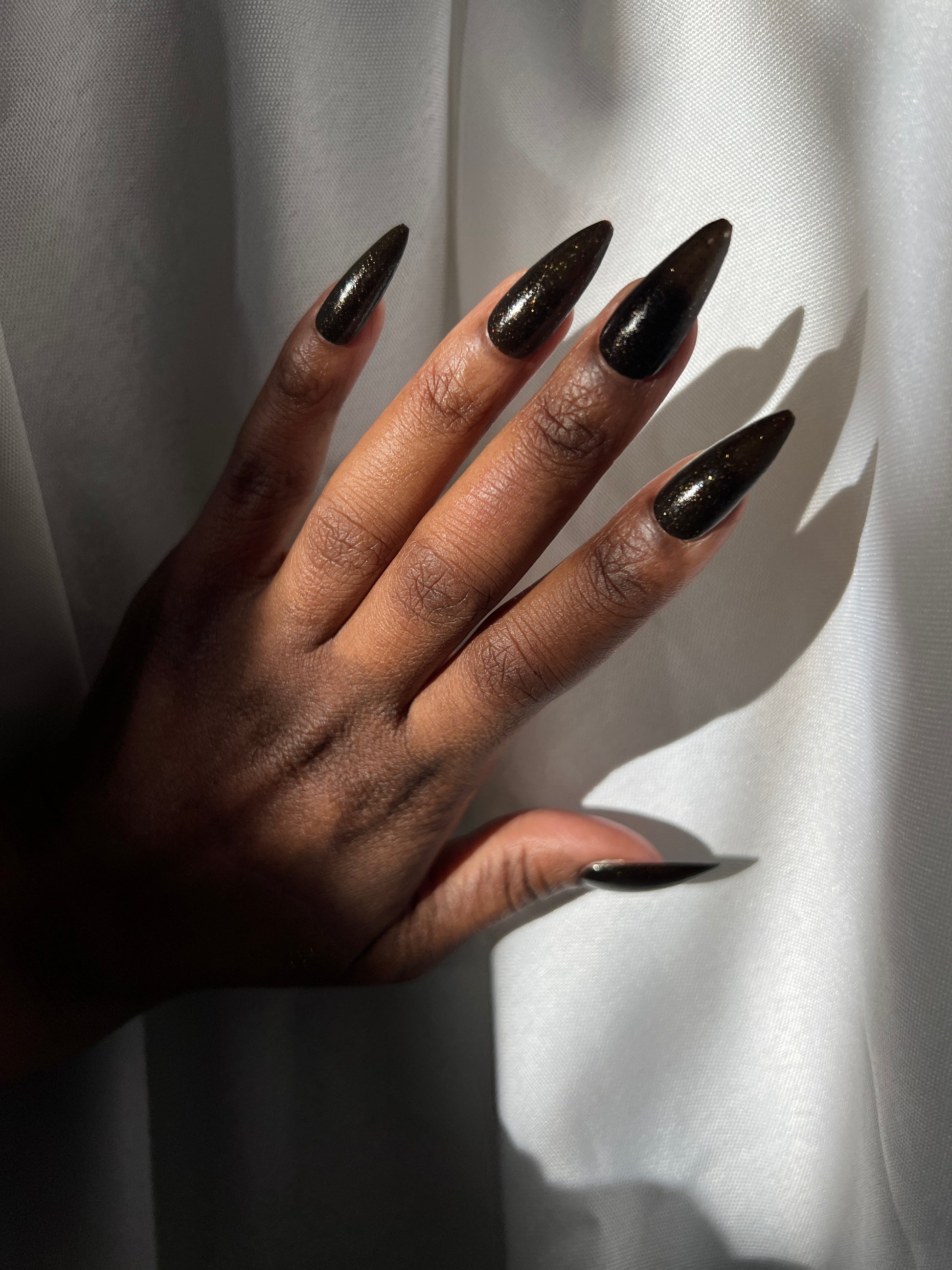 Dark umber filled with gold glitter, micro gold glitter, holo gold glitter, and micro gold shreds