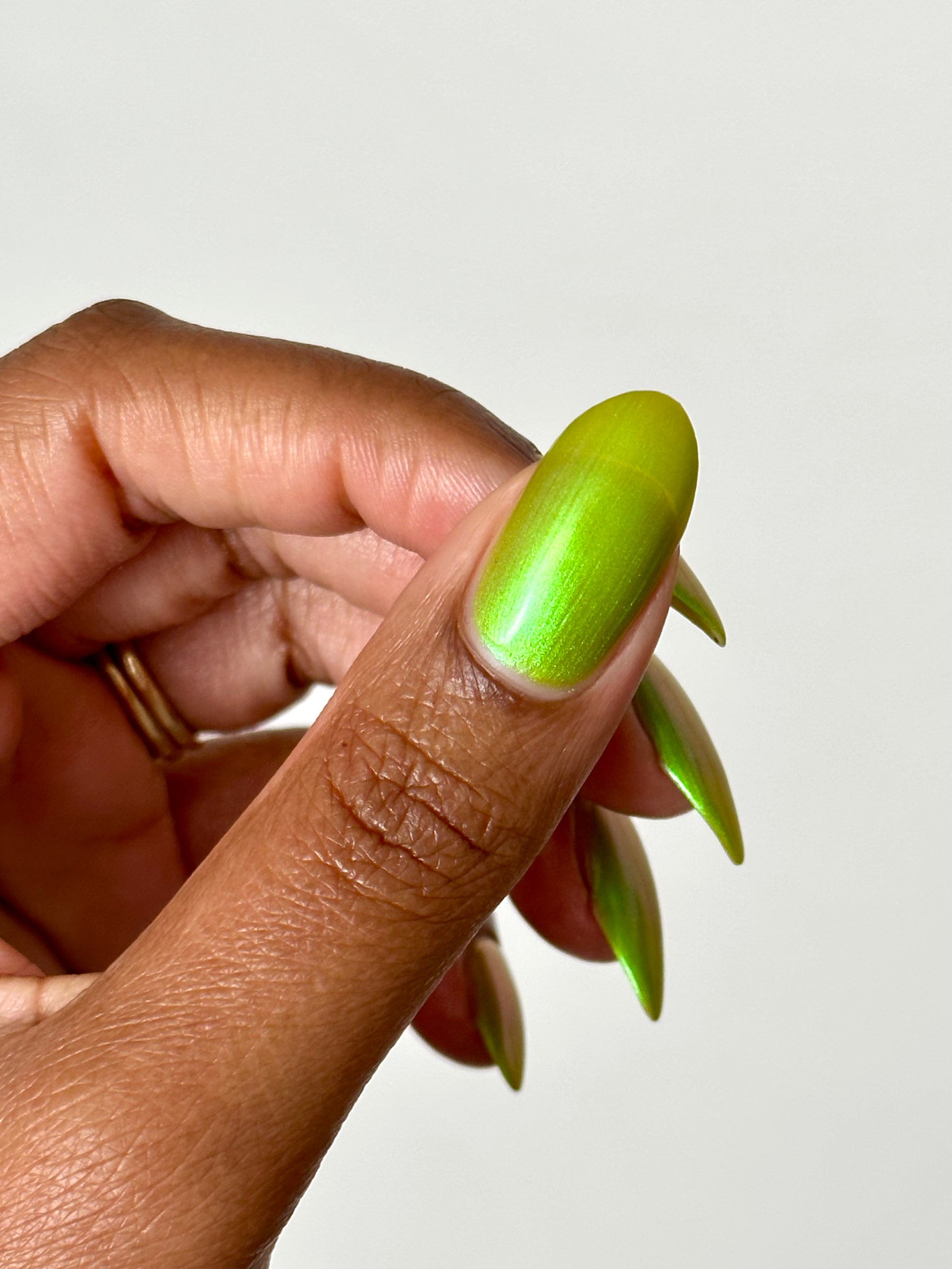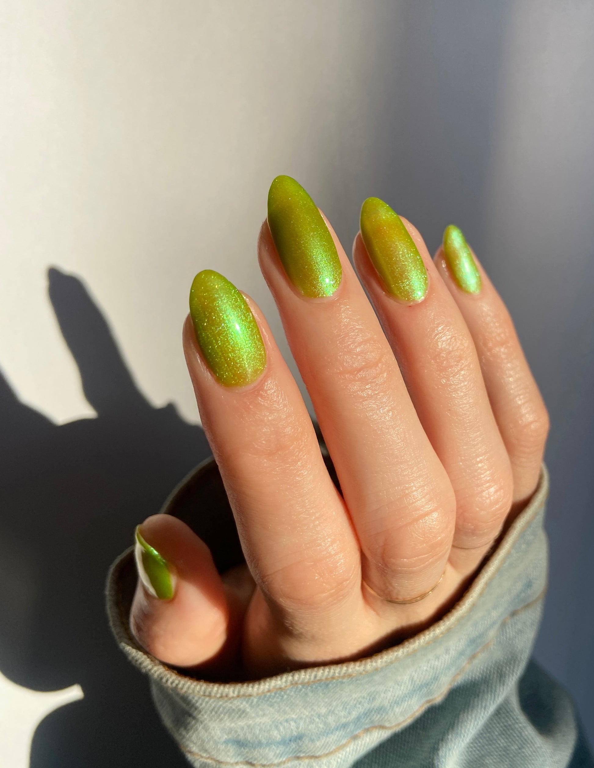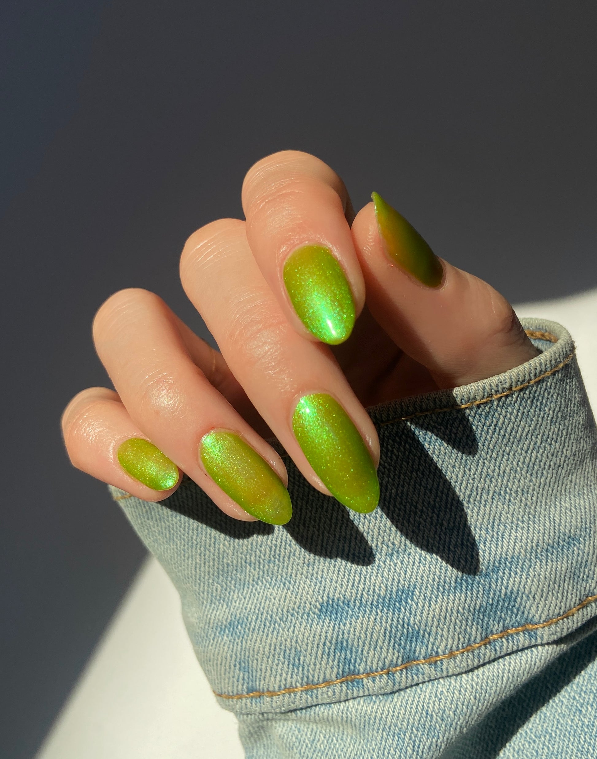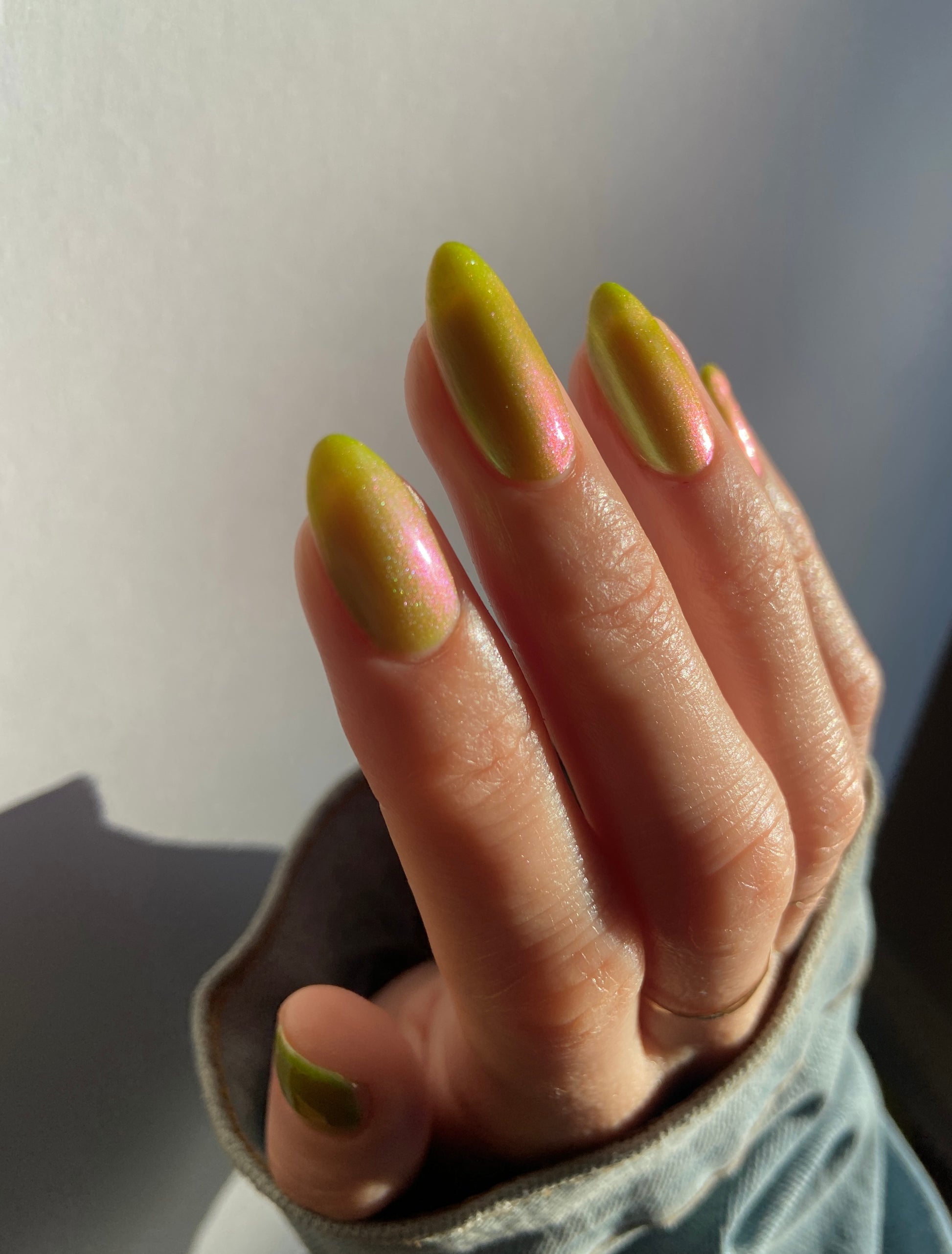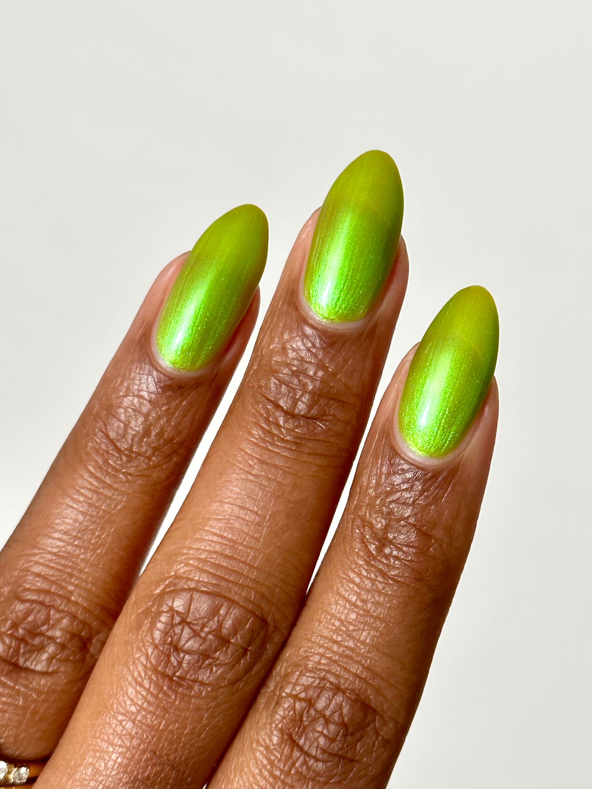 Vibrant yellow-green base with emerald/pink duochrome shimmer
