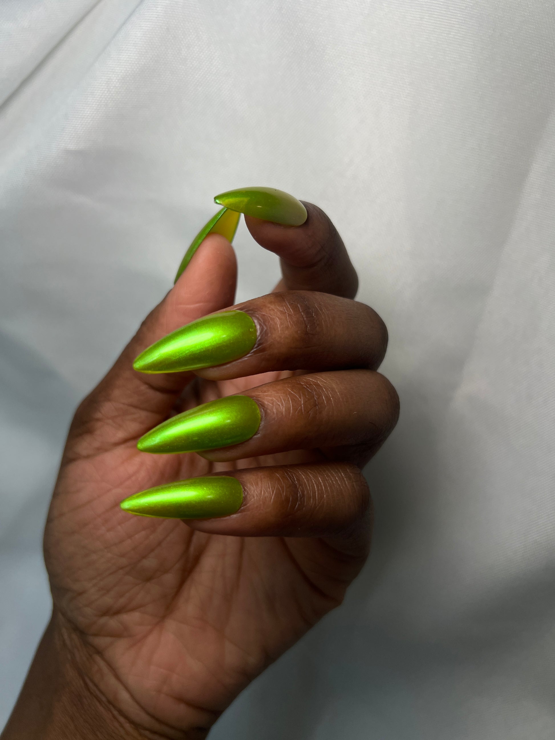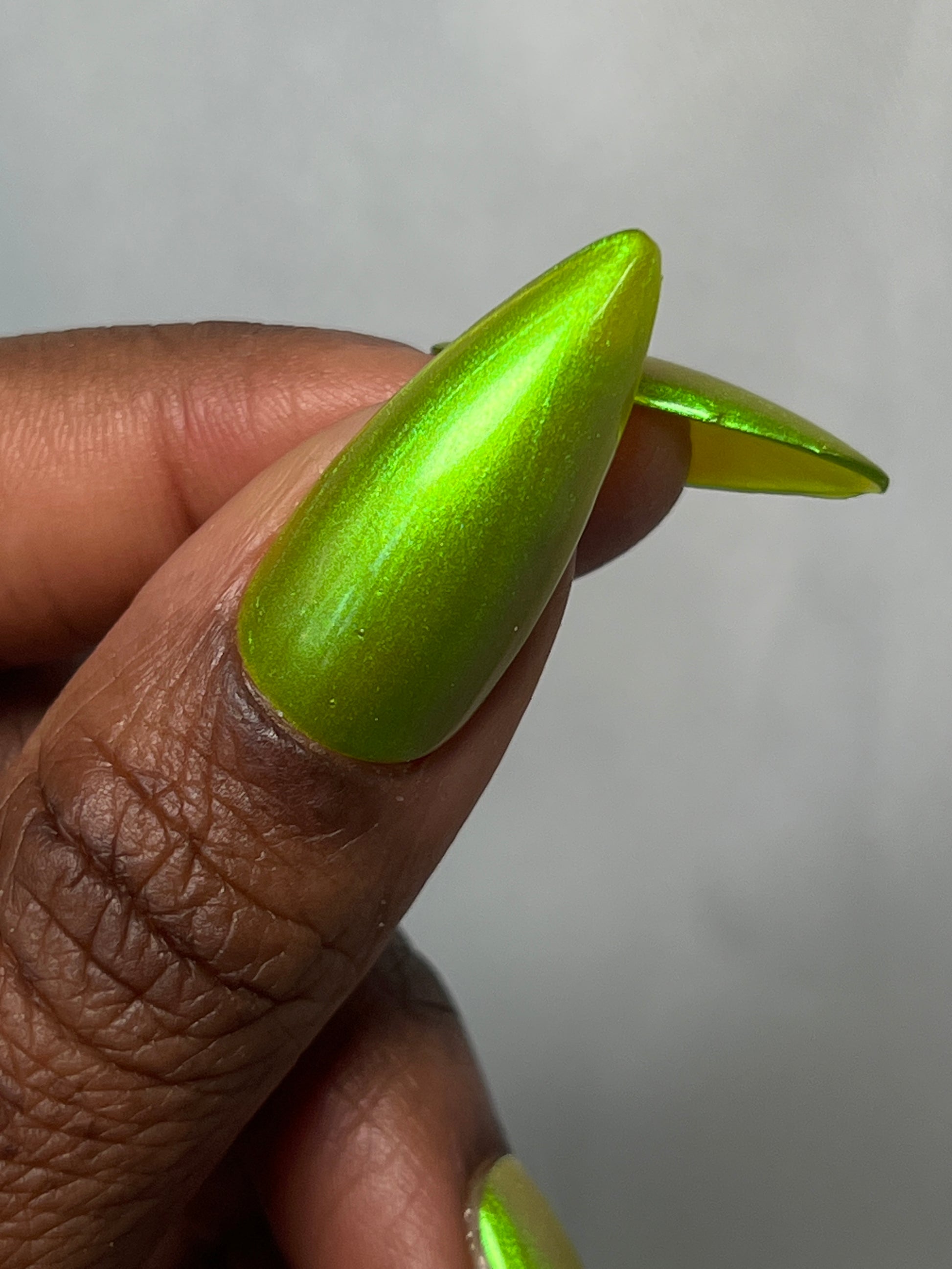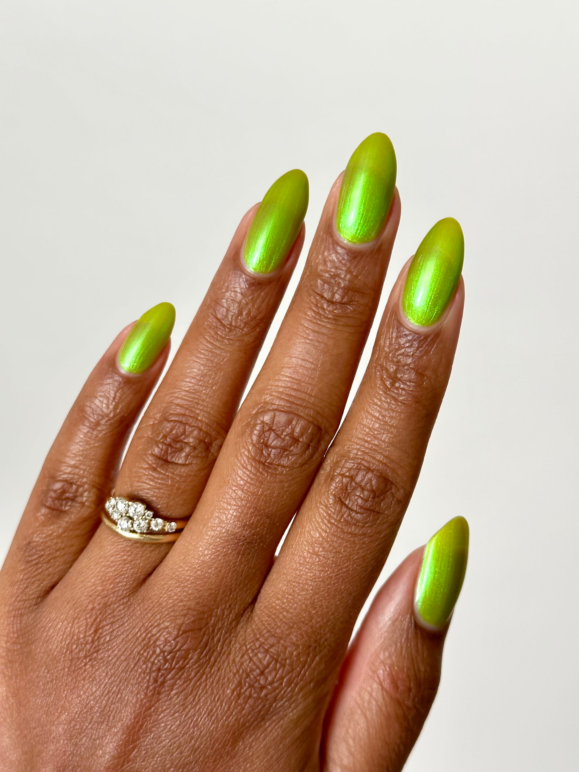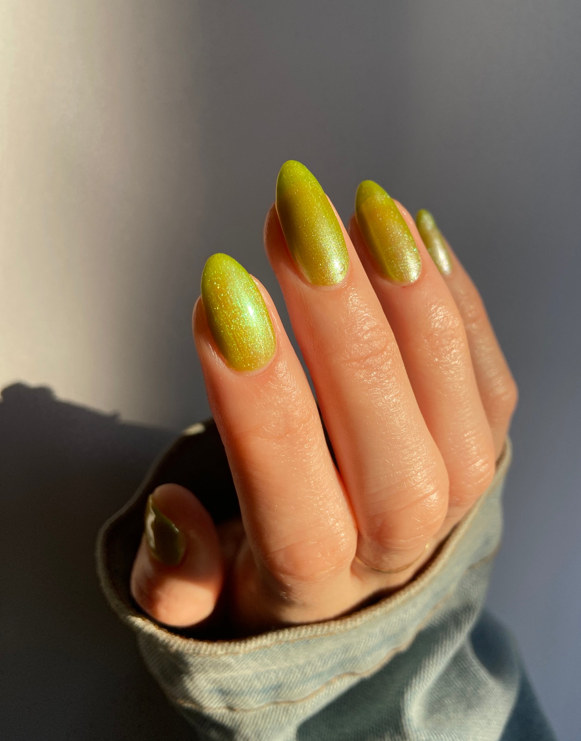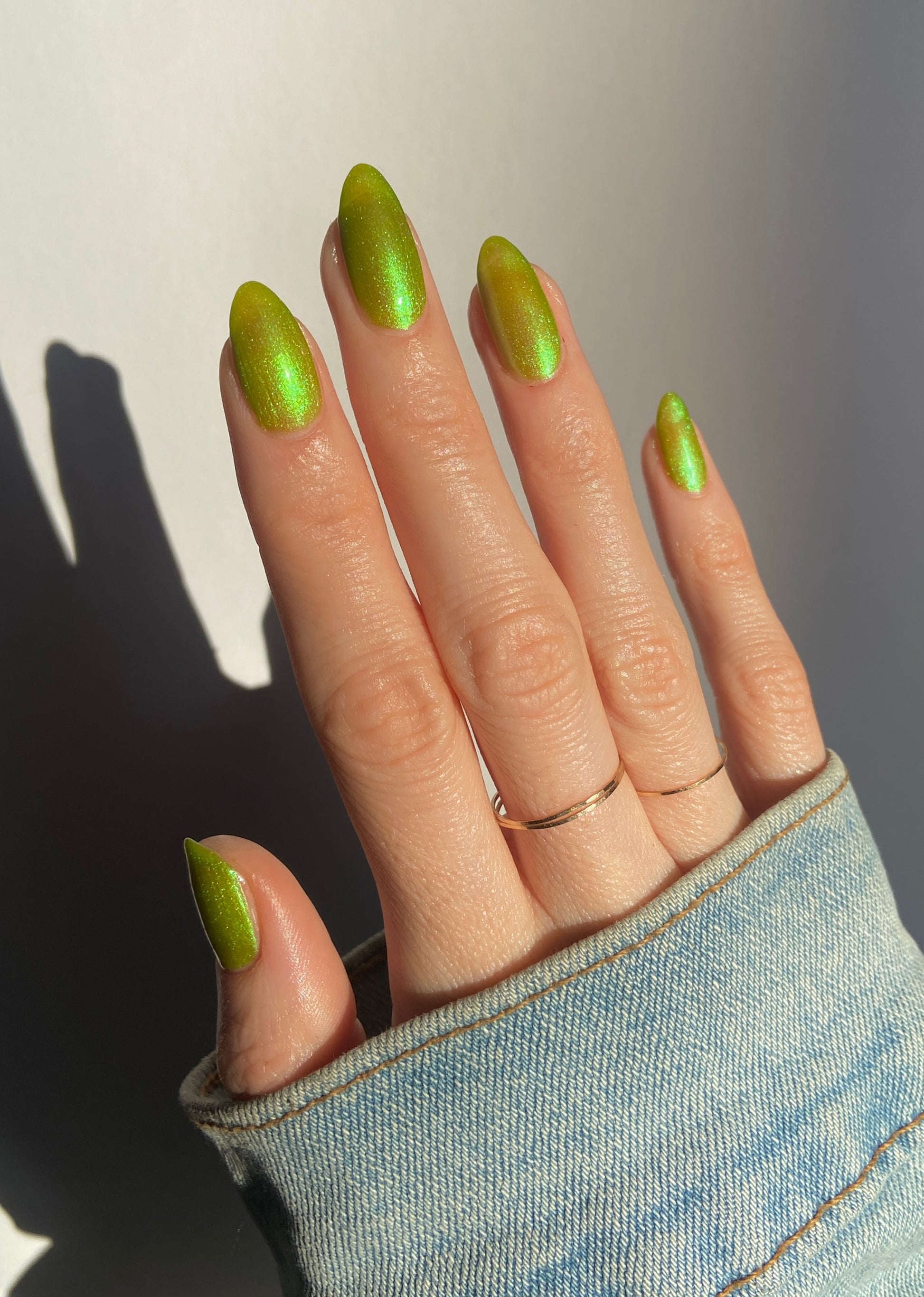 Vibrant yellow-green base with emerald/pink duochrome shimmer