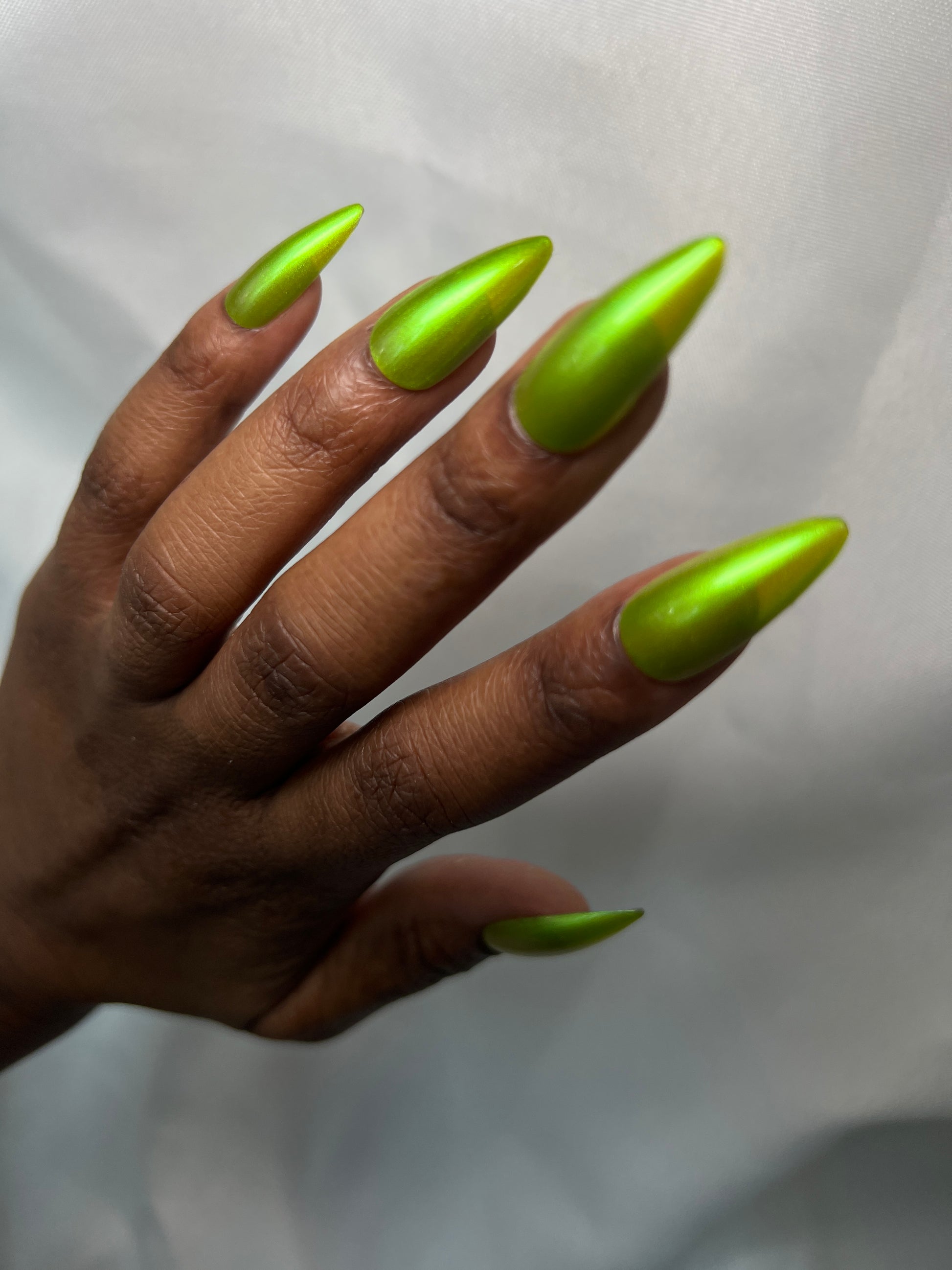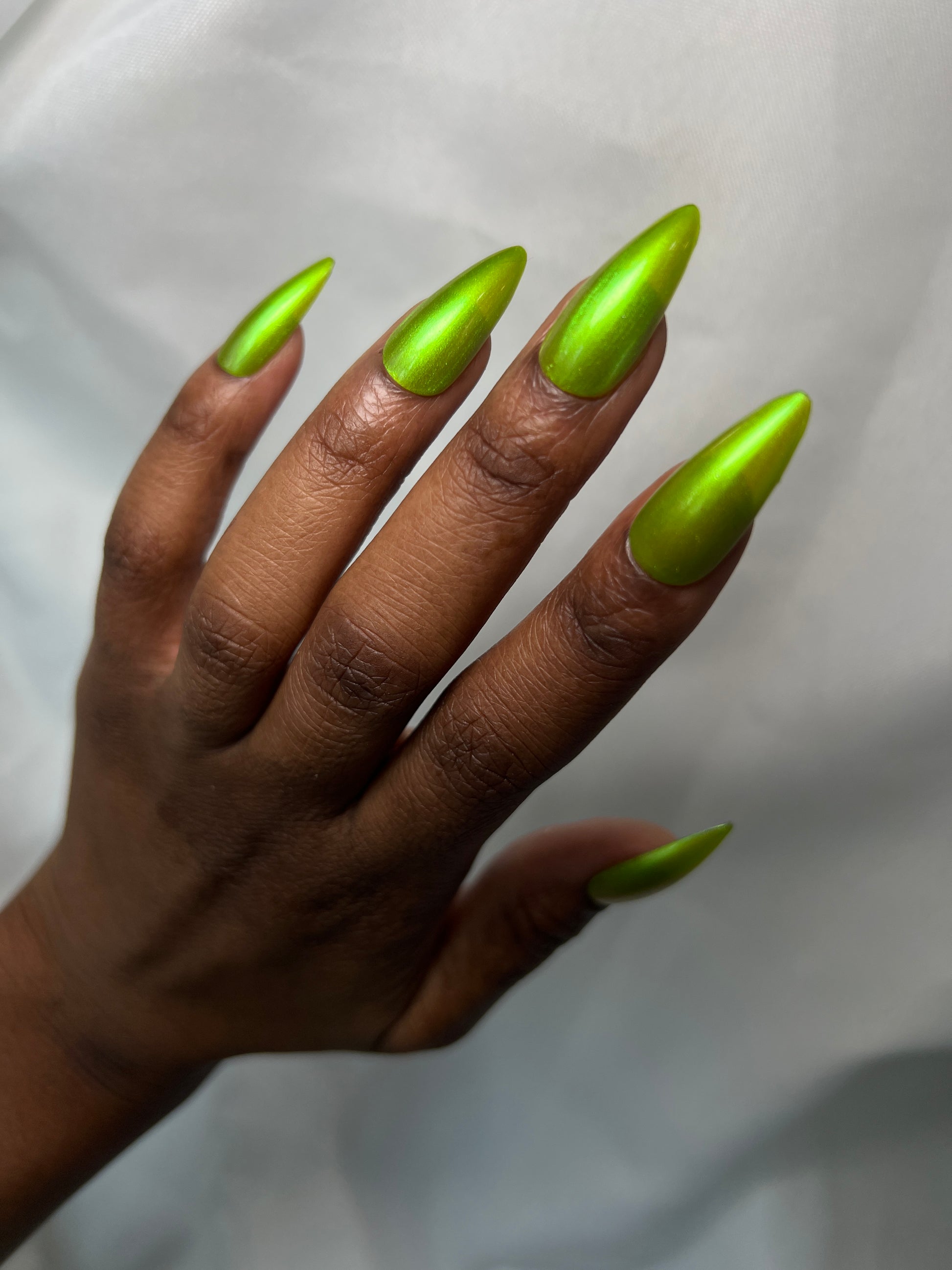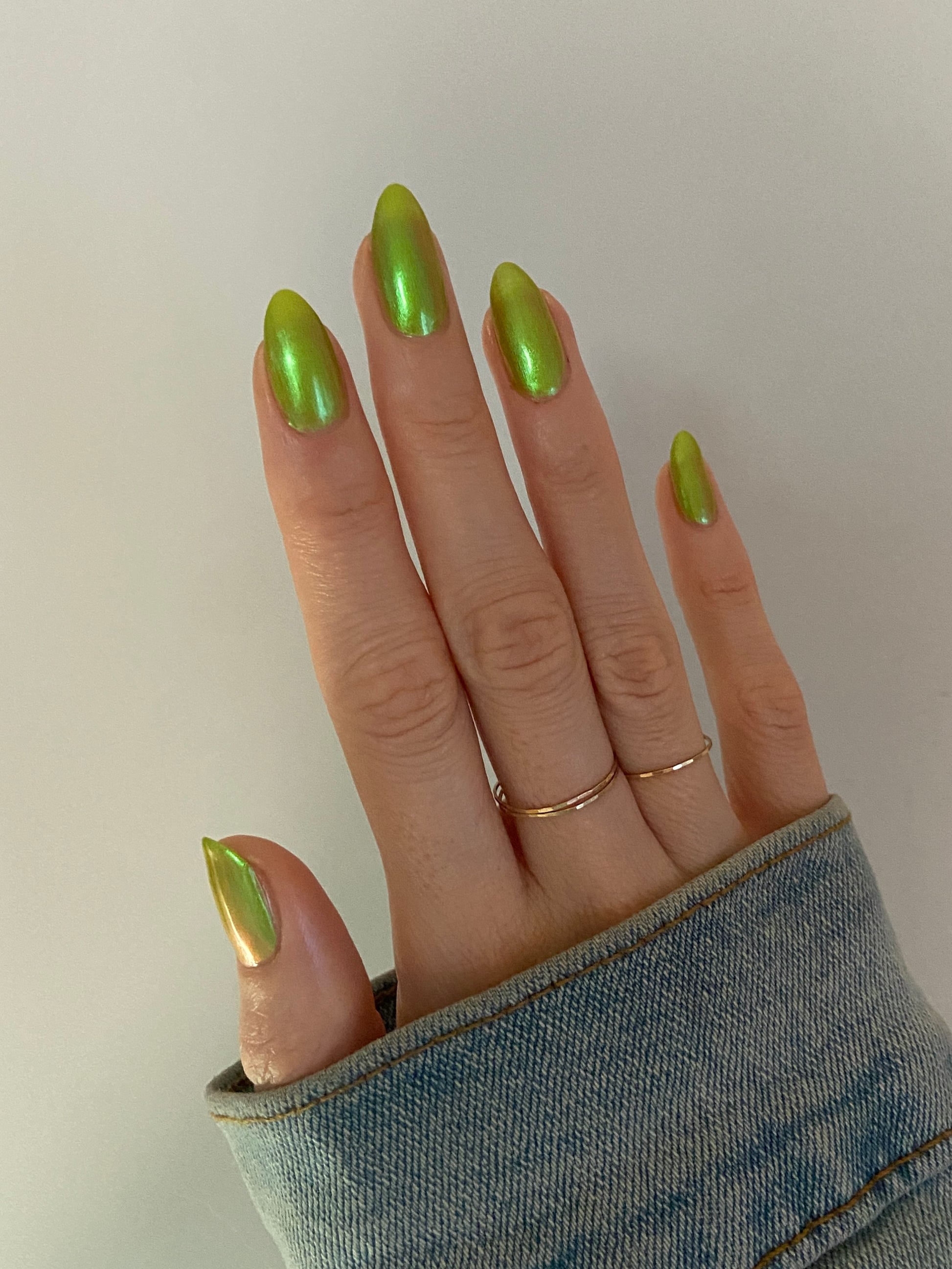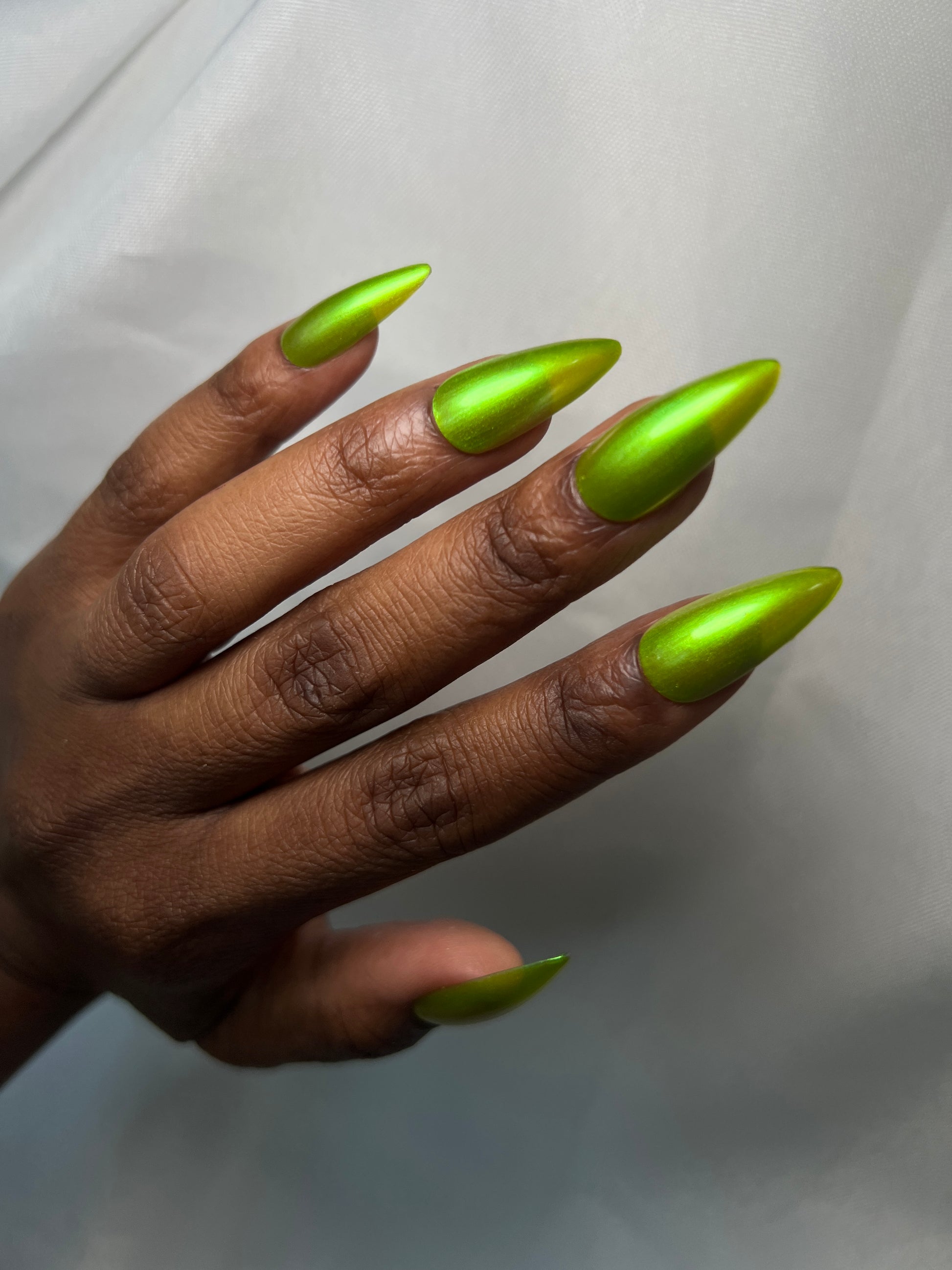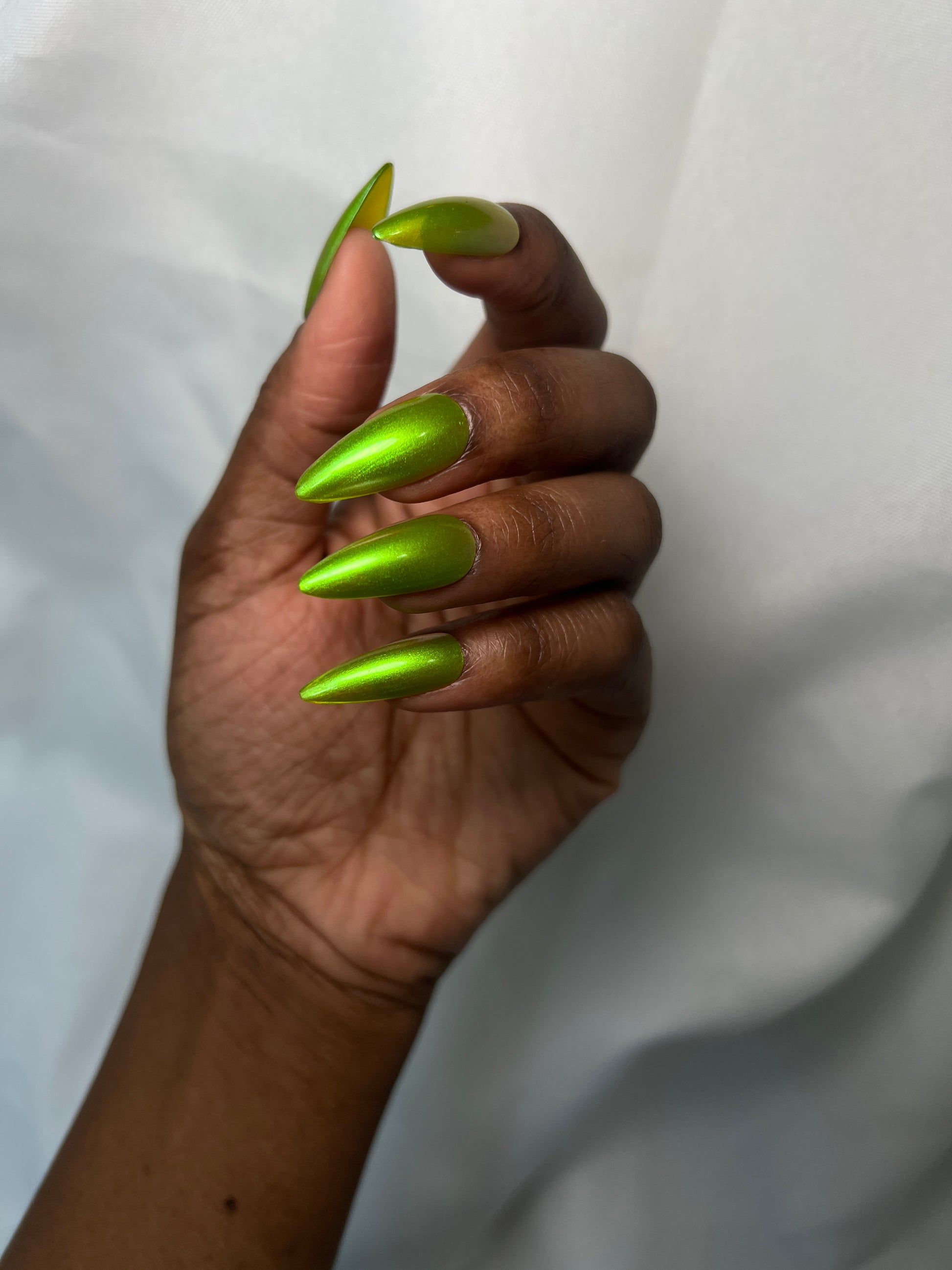 Vibrant yellow-green base with emerald/pink duochrome shimmer