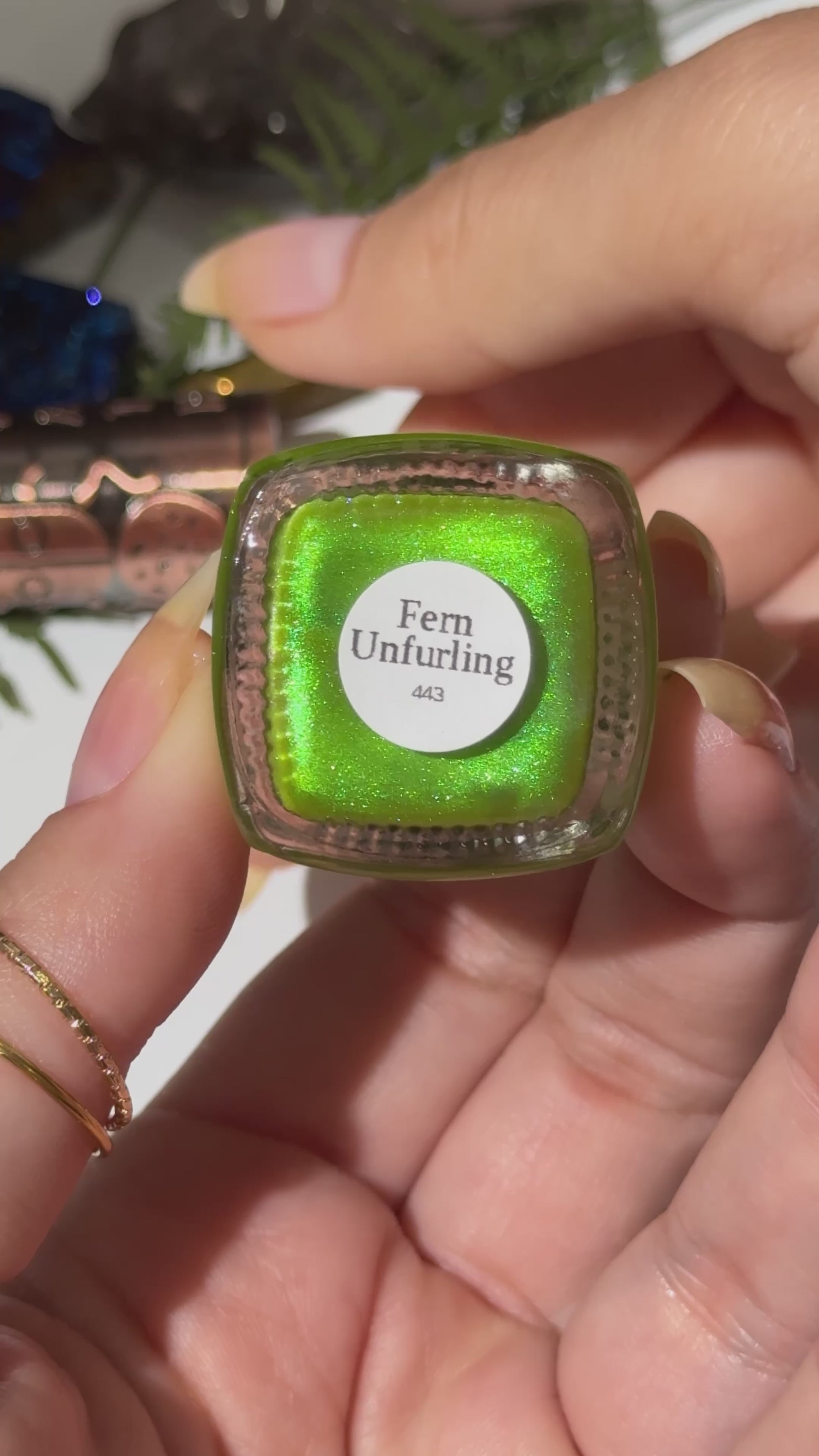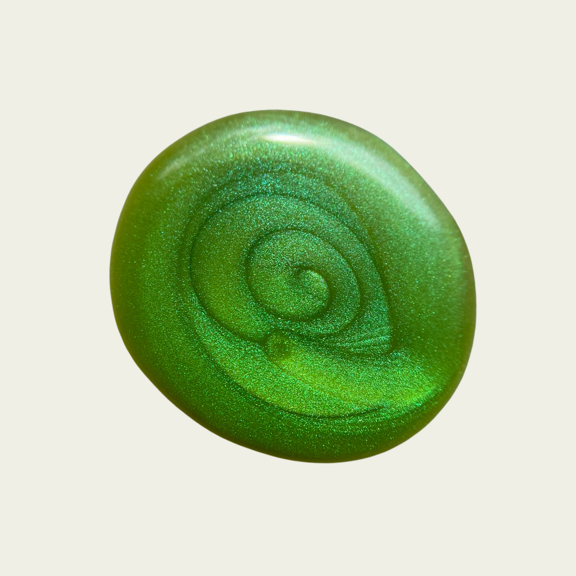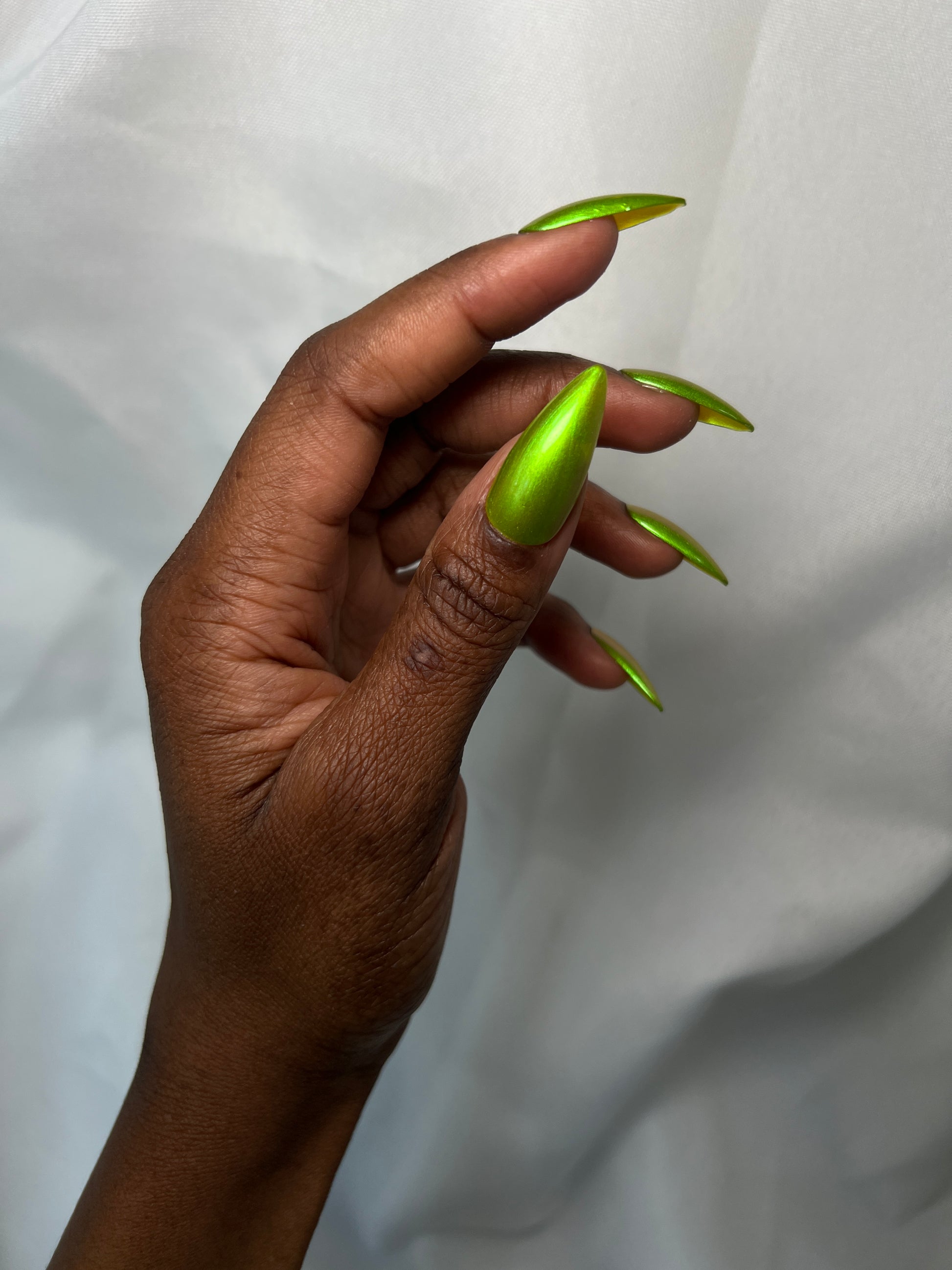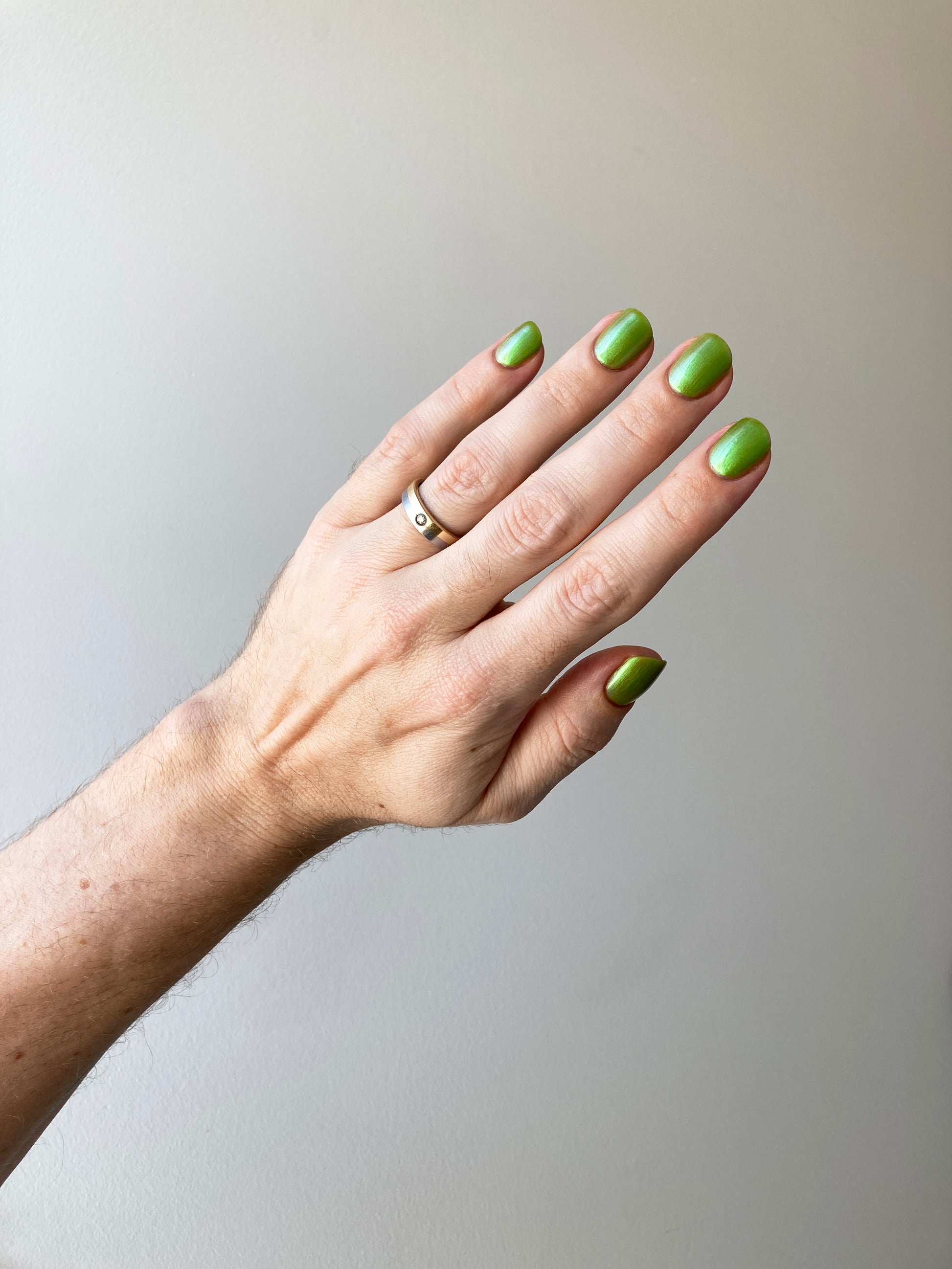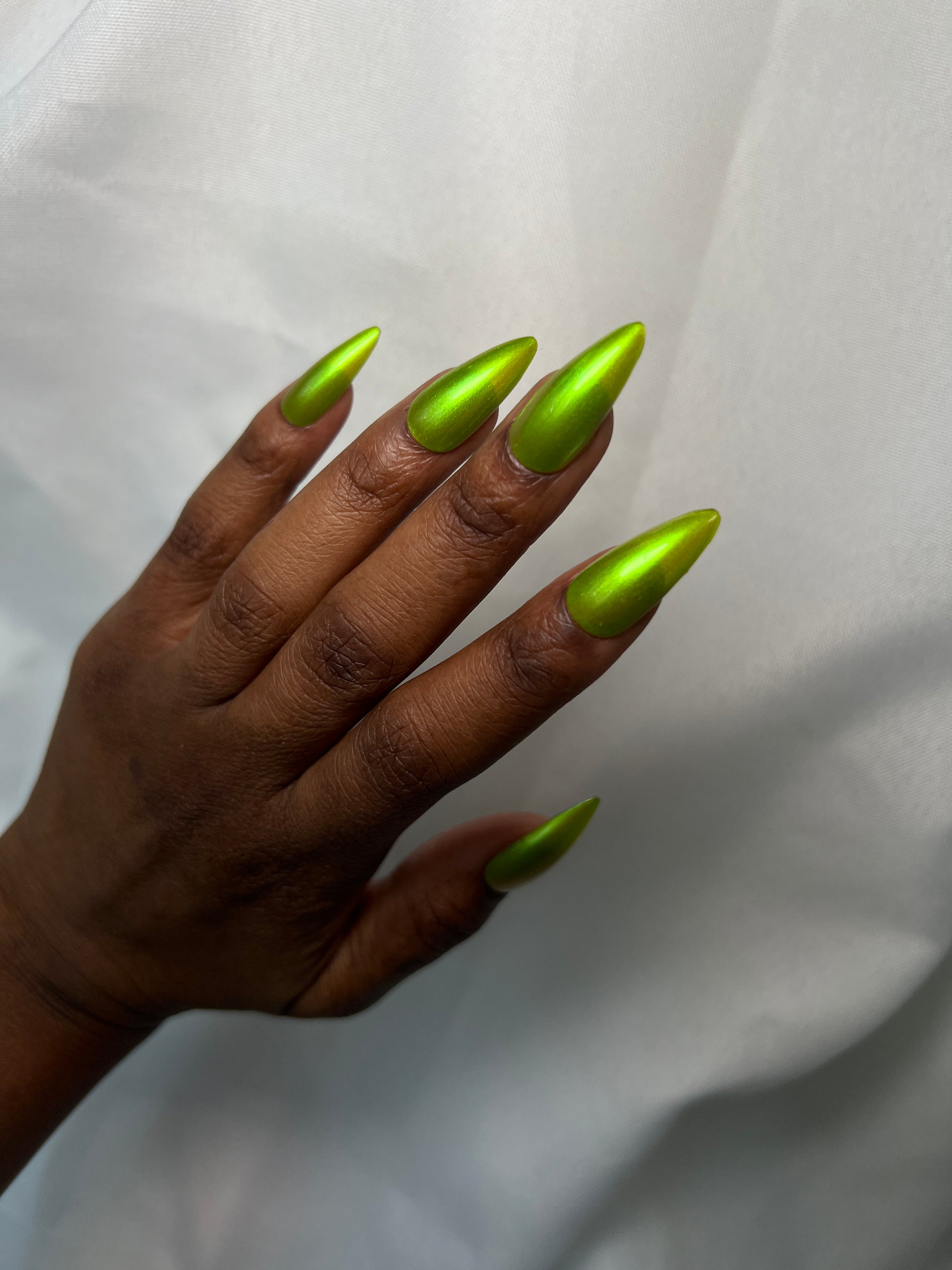 Vibrant yellow-green base with emerald/pink duochrome shimmer