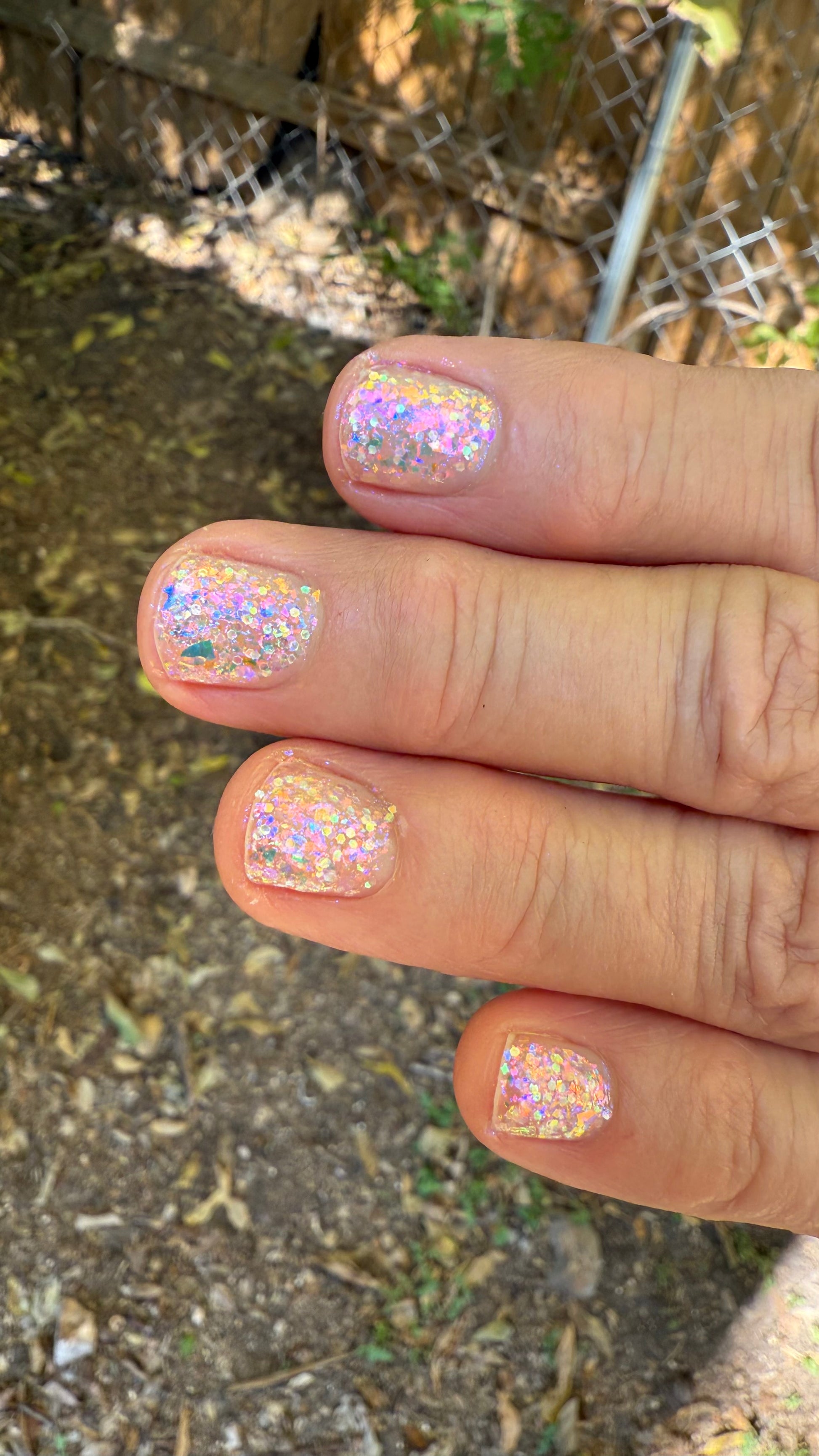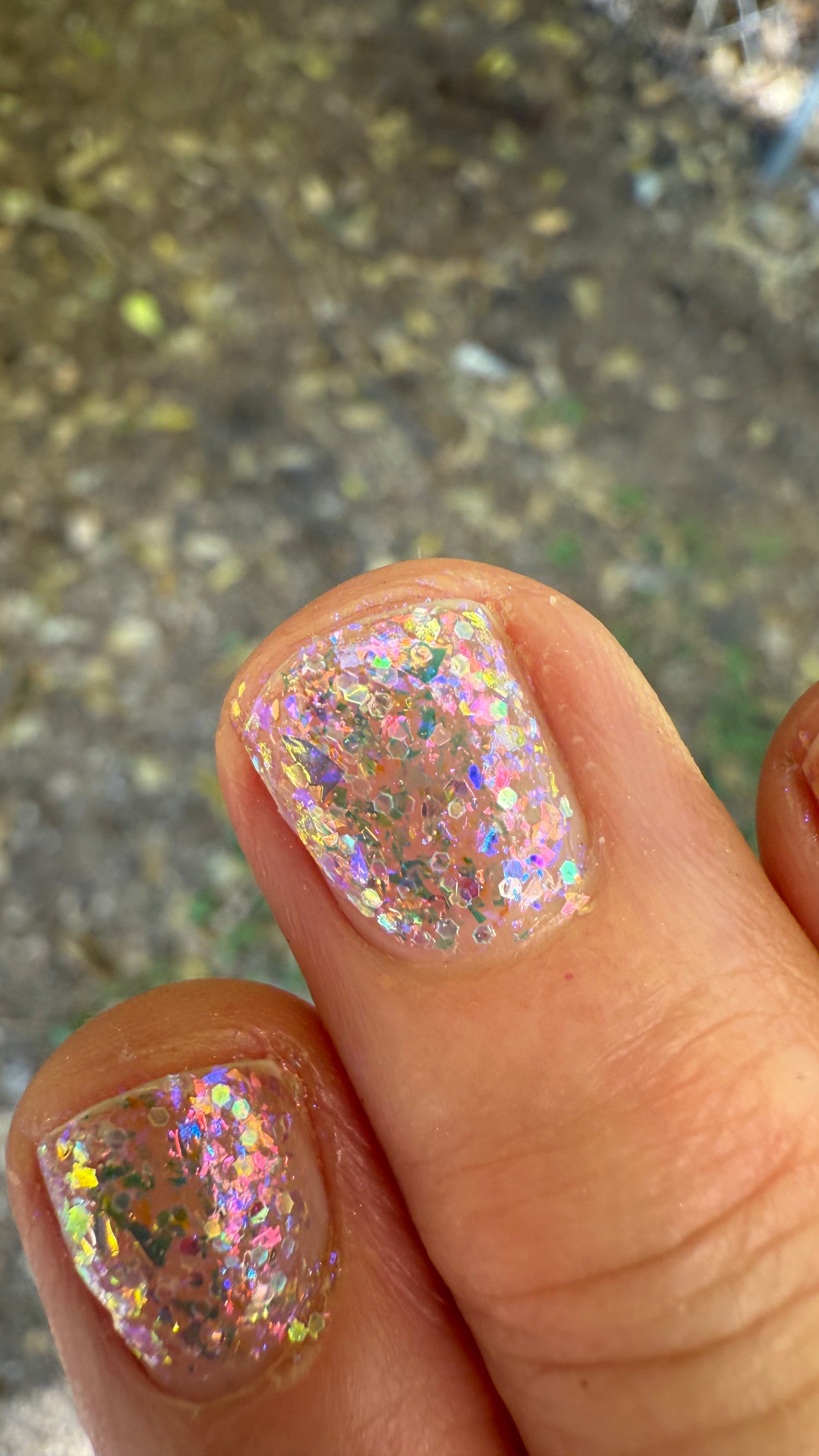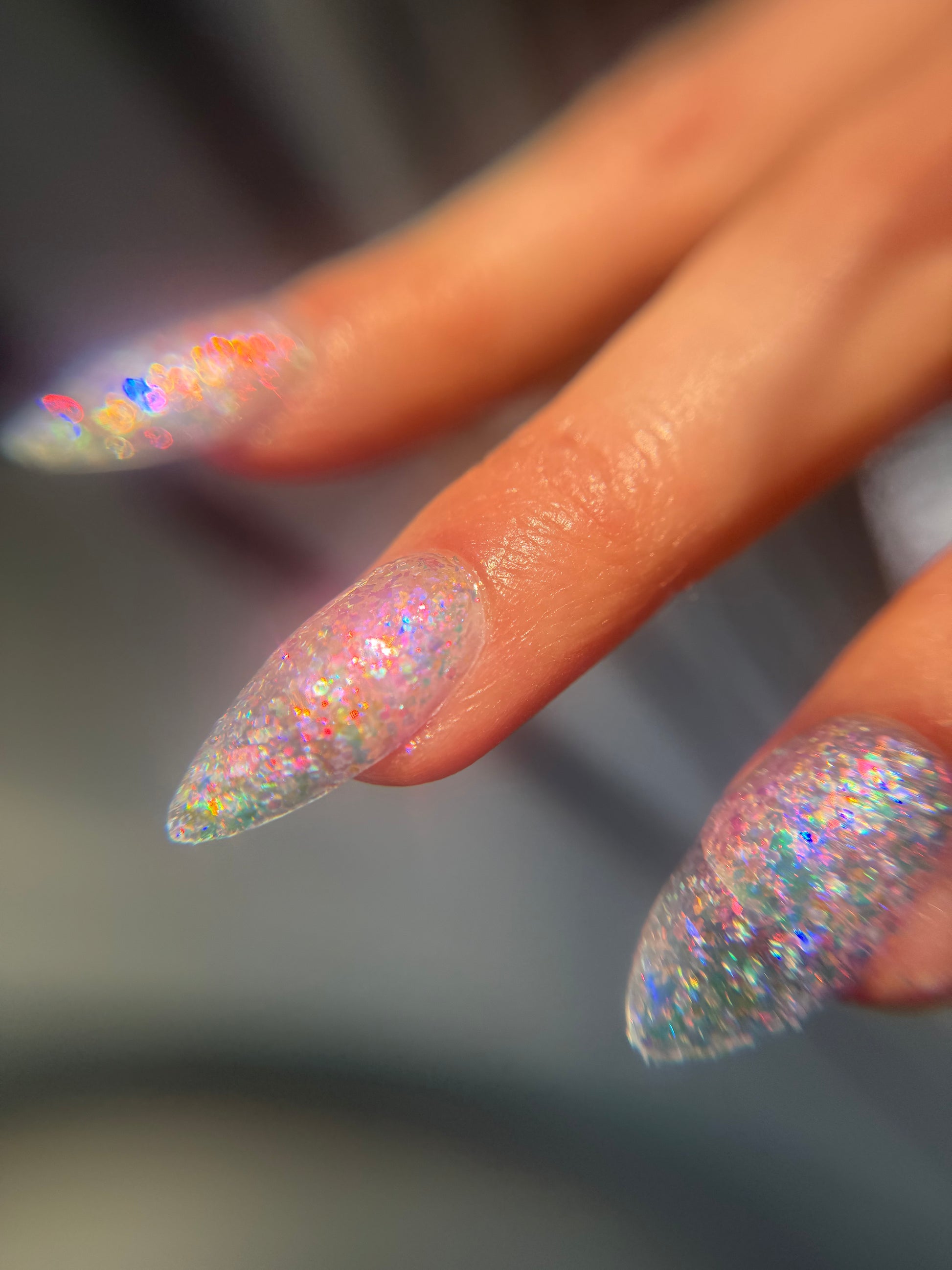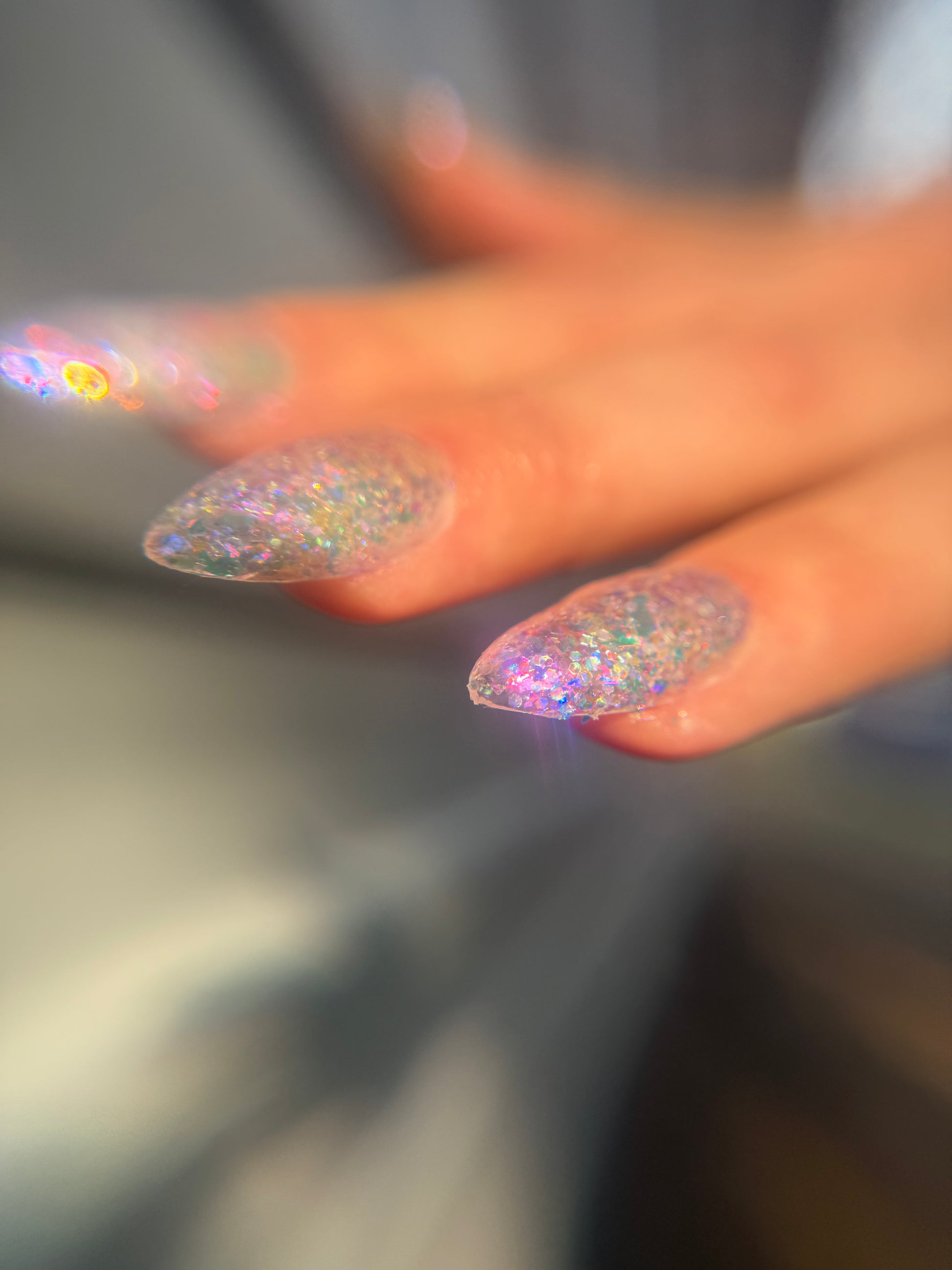 Chunky opal glitter against a background of three varieties of multichrome flakies. A rainbow of colors displayed at varying angles: hot pink, tangerine, lime, aqua, lavender, gold, peach, blue, and more. Looks most vibrant and reflective in indoor lightning or dim light. Thick application with a variety of pigment sizes, but fun color payoff. Ethereal and dramatic.
