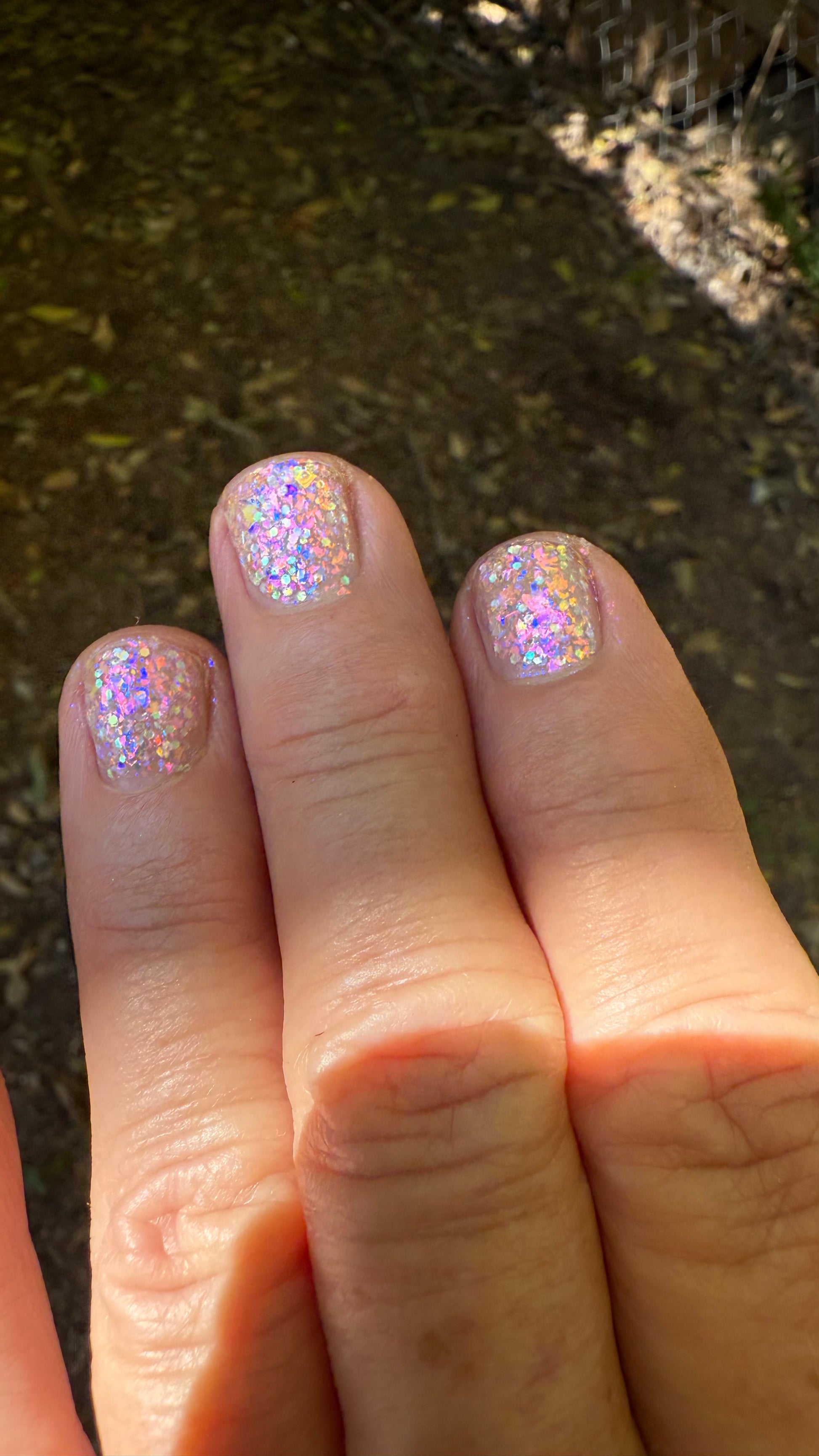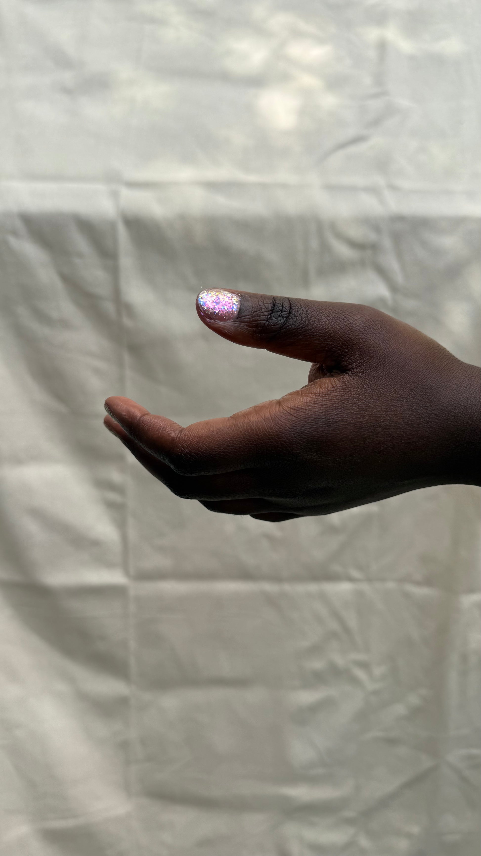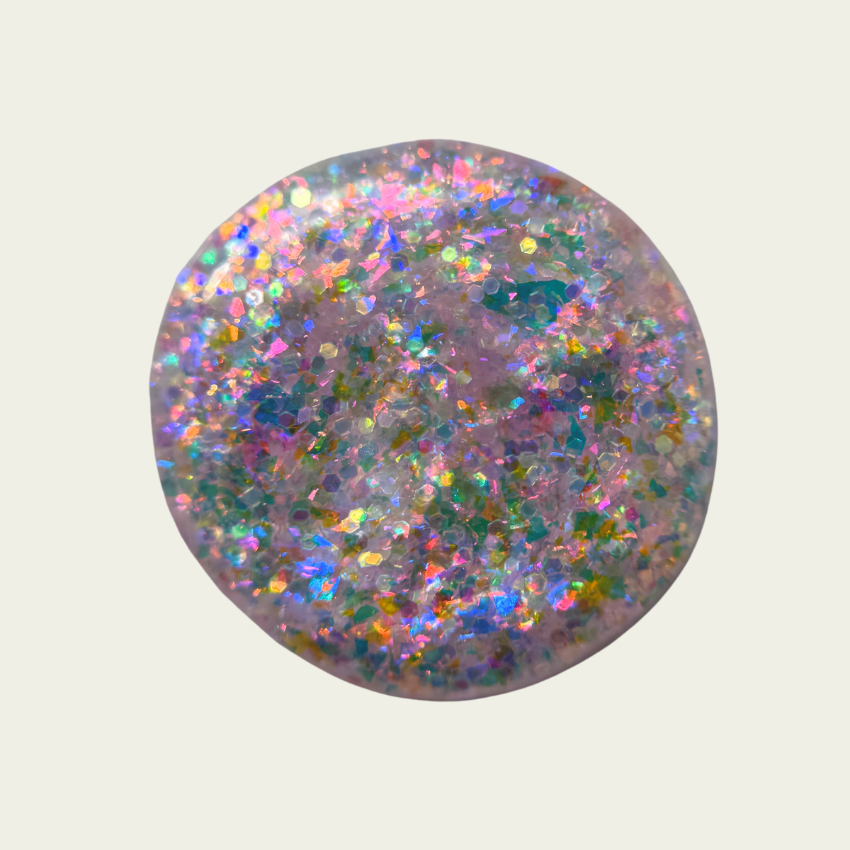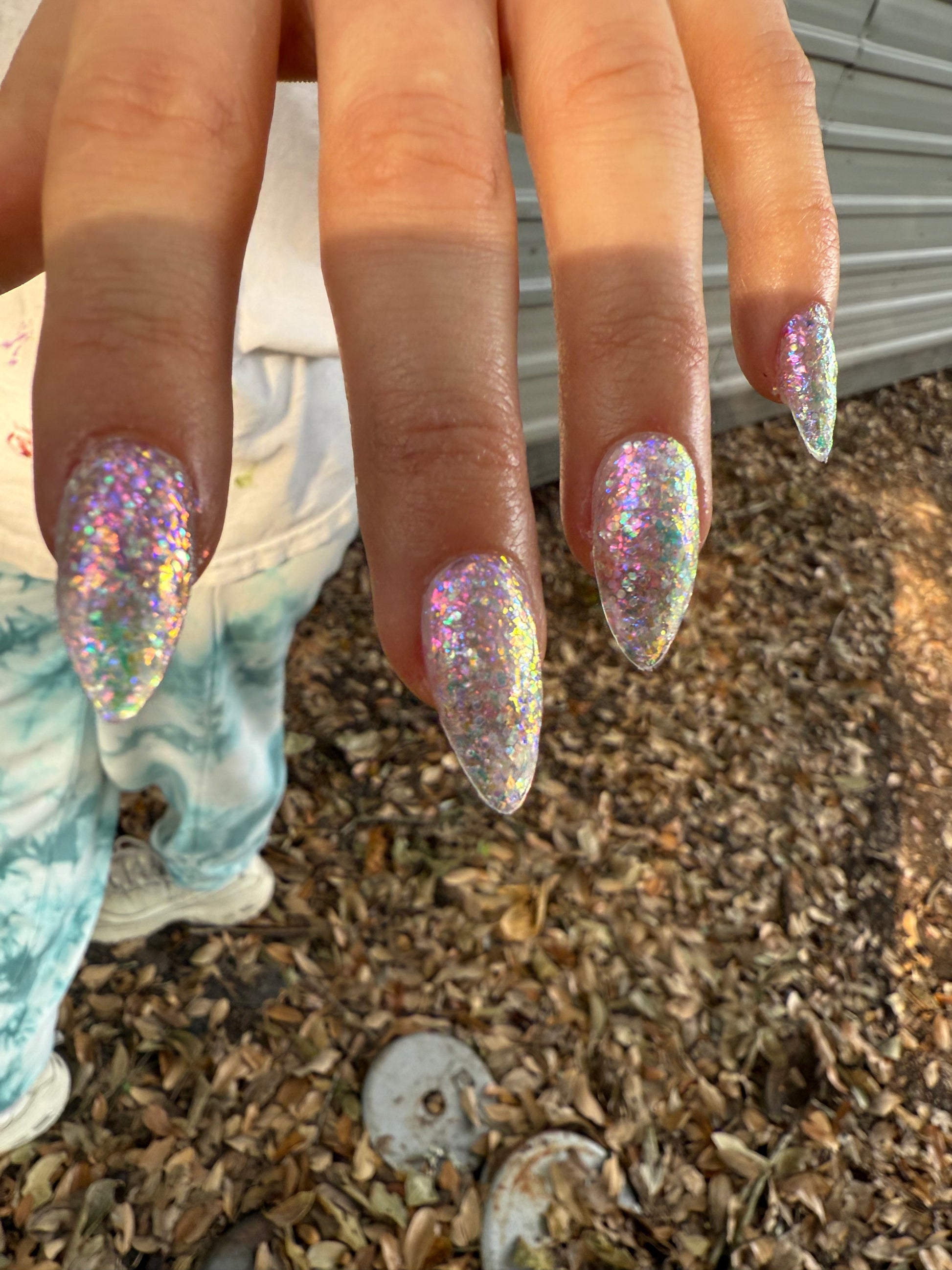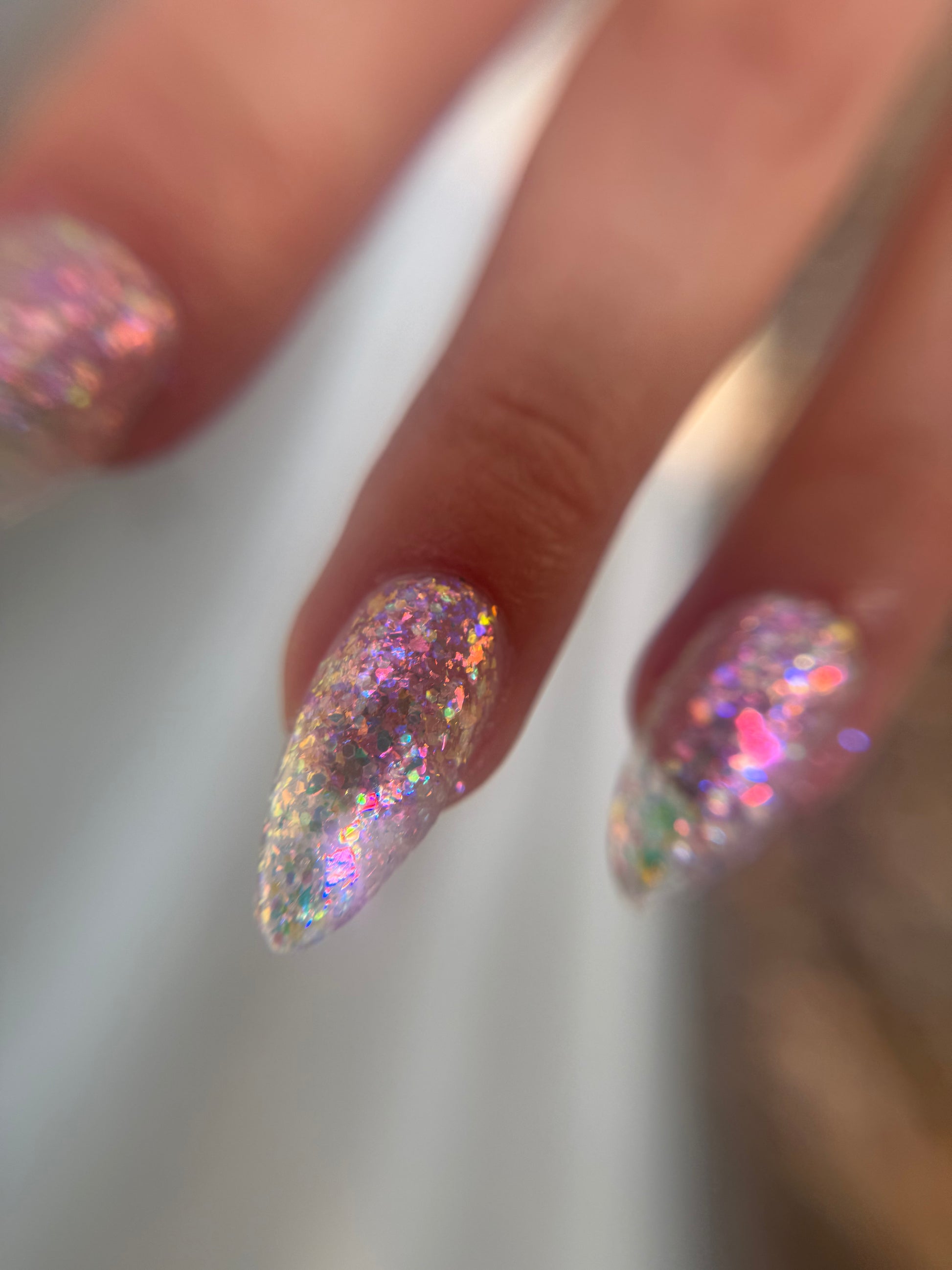 Chunky opal glitter against a background of three varieties of multichrome flakies. A rainbow of colors displayed at varying angles: hot pink, tangerine, lime, aqua, lavender, gold, peach, blue, and more. Looks most vibrant and reflective in indoor lightning or dim light. Thick application with a variety of pigment sizes, but fun color payoff. Ethereal and dramatic.