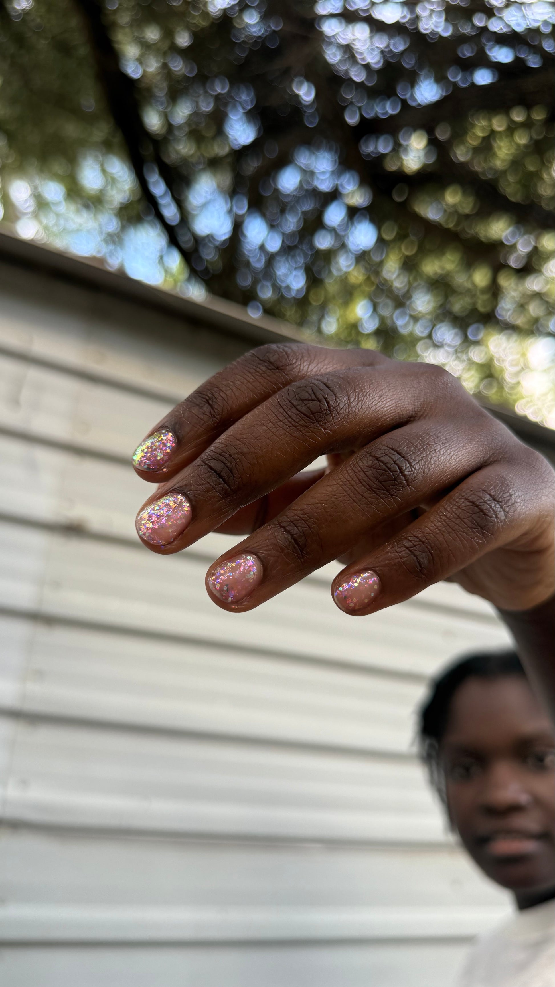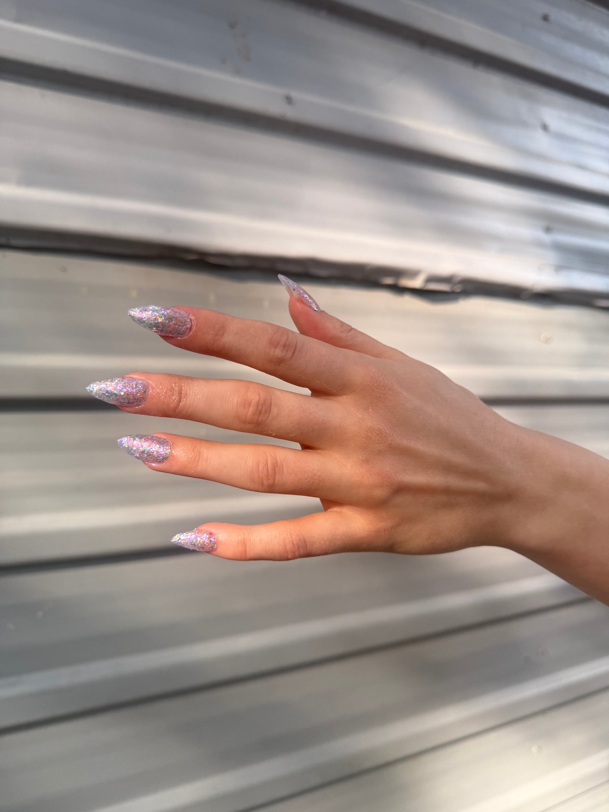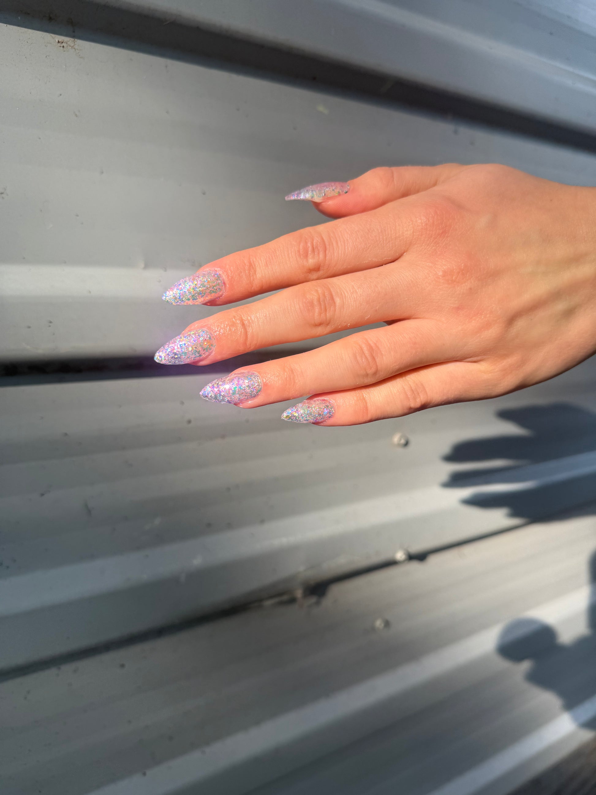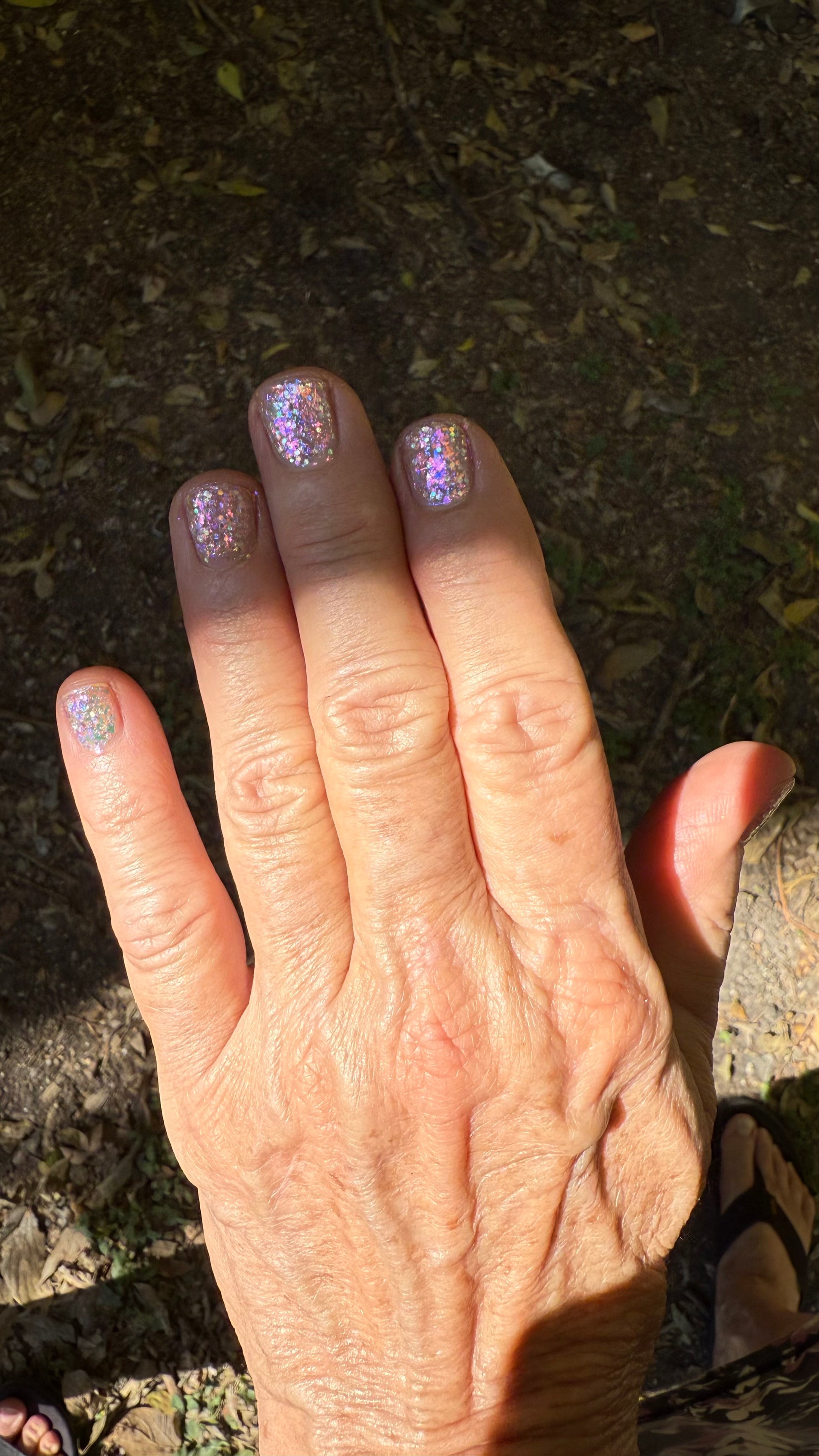 Chunky opal glitter against a background of three varieties of multichrome flakies. A rainbow of colors displayed at varying angles: hot pink, tangerine, lime, aqua, lavender, gold, peach, blue, and more. Looks most vibrant and reflective in indoor lightning or dim light. Thick application with a variety of pigment sizes, but fun color payoff. Ethereal and dramatic.
