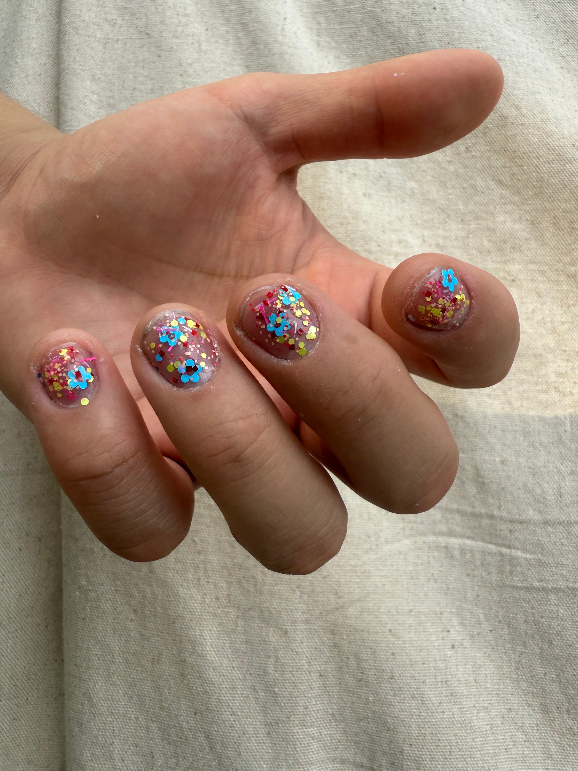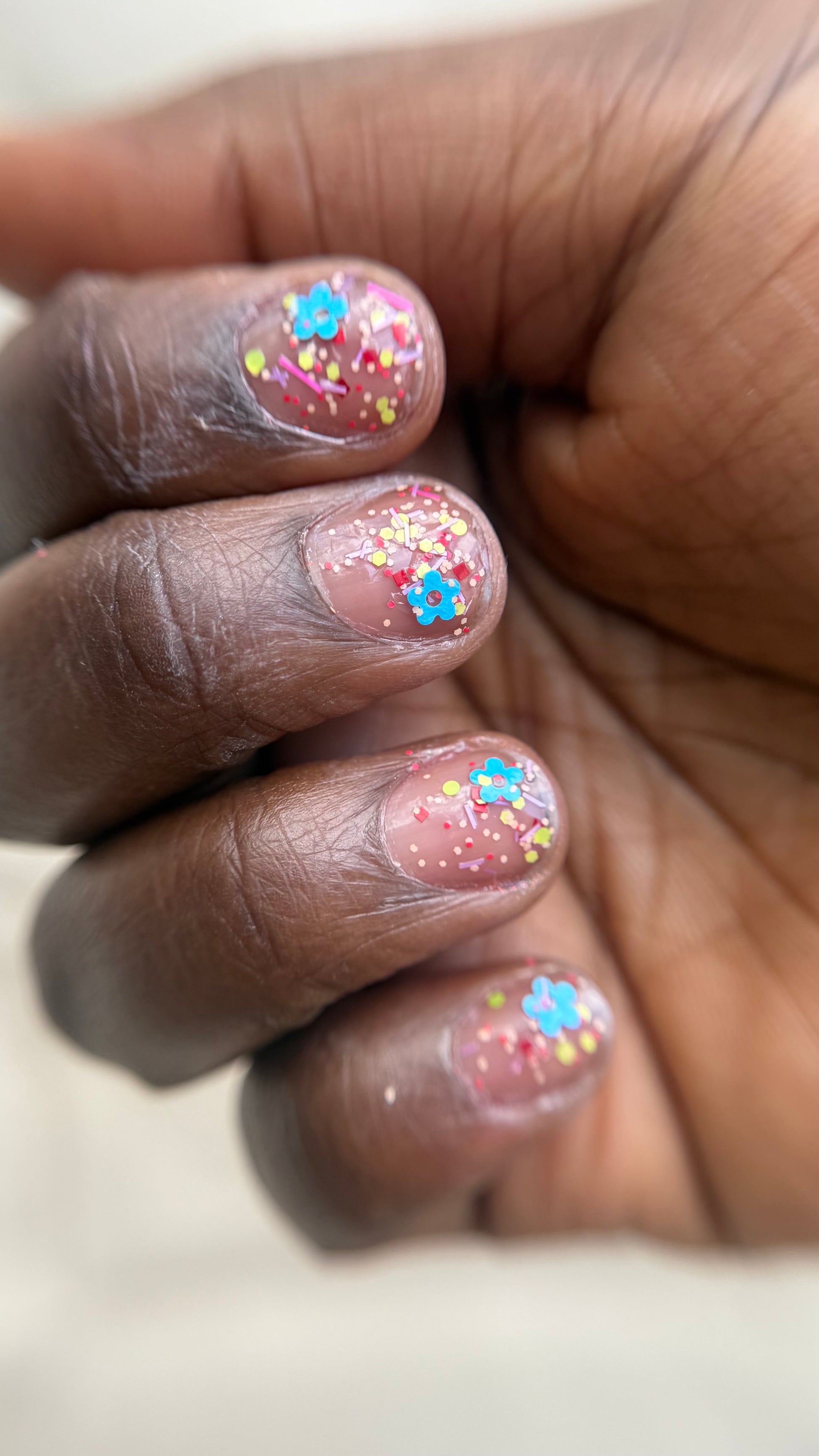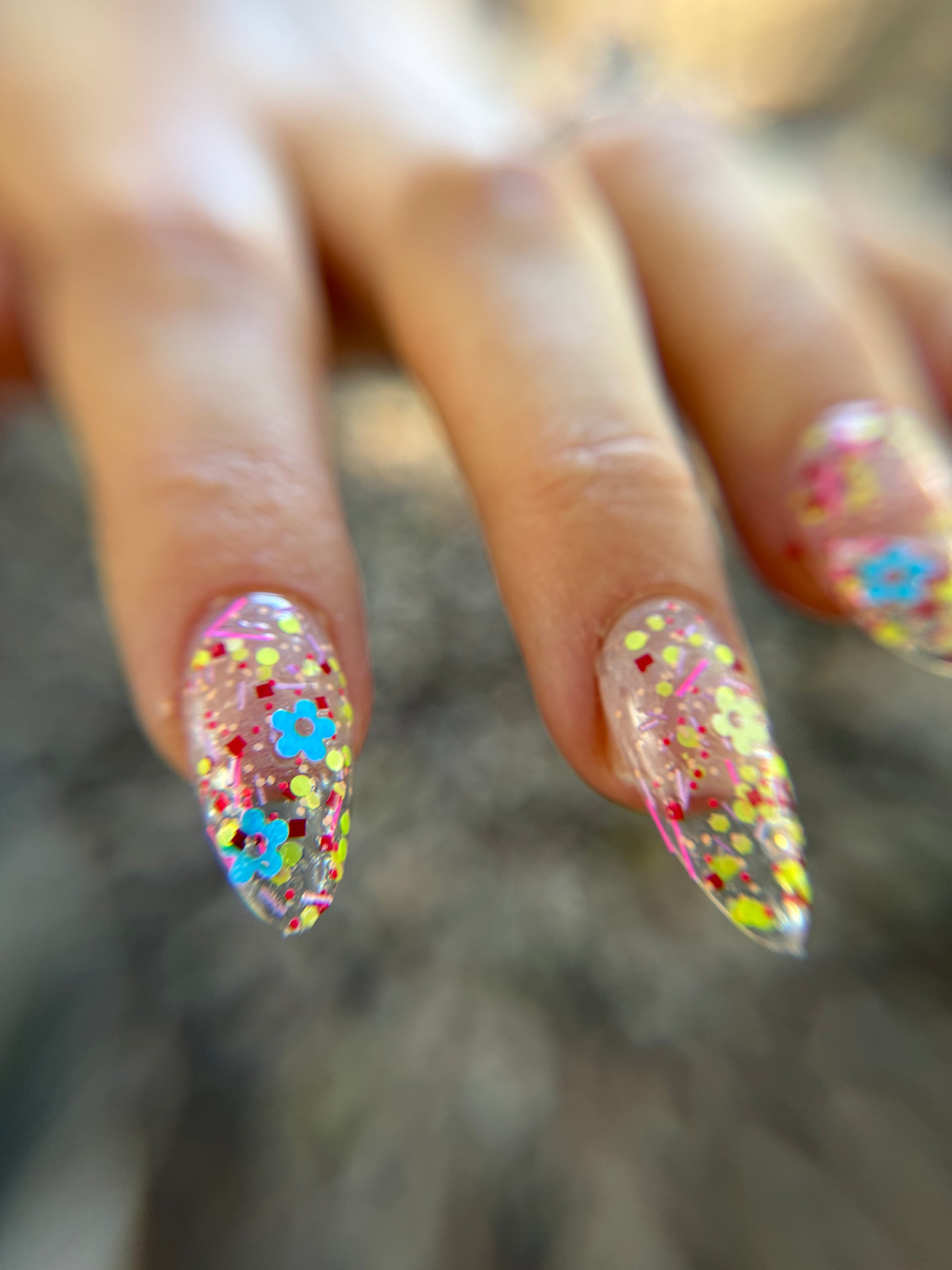 Clear base packed with a variety of neon and pastel matte glitters. If you are a maximalist with a penchant for 70's clothing, Lisa Frank, and jelly sandals then this is the polish for you. The opposite of clean girl aesthetic. Chunky, chonky, chewy.