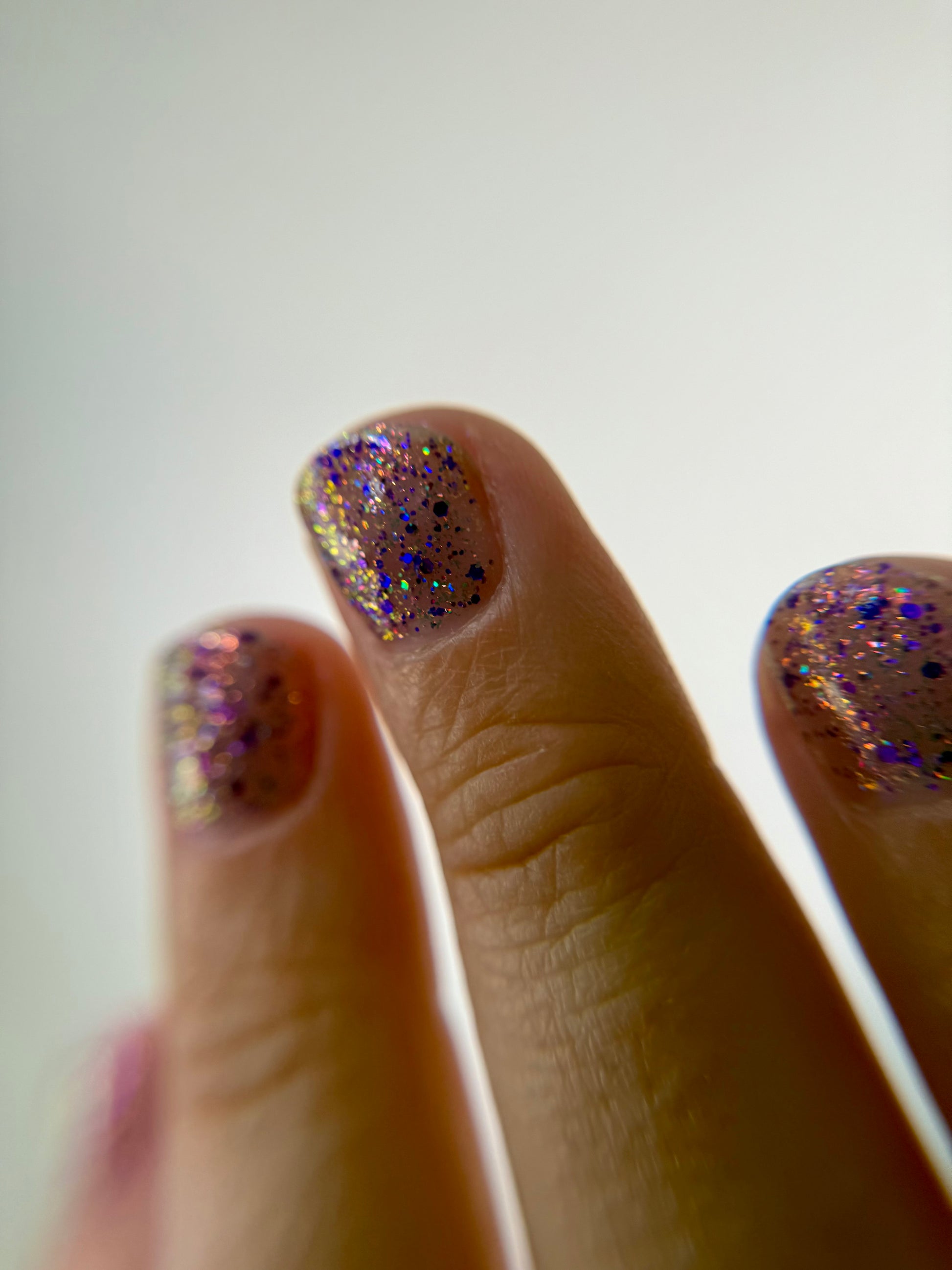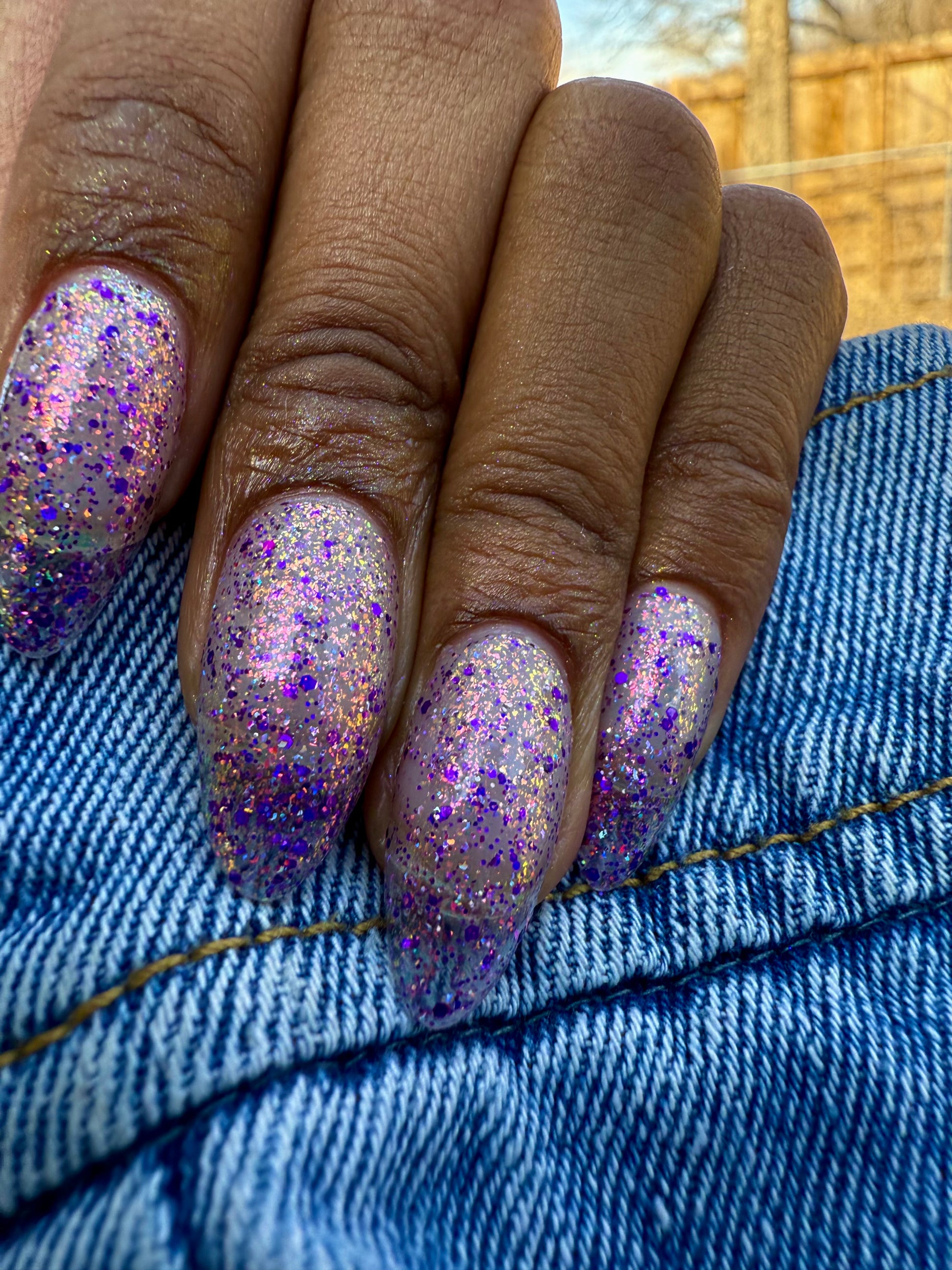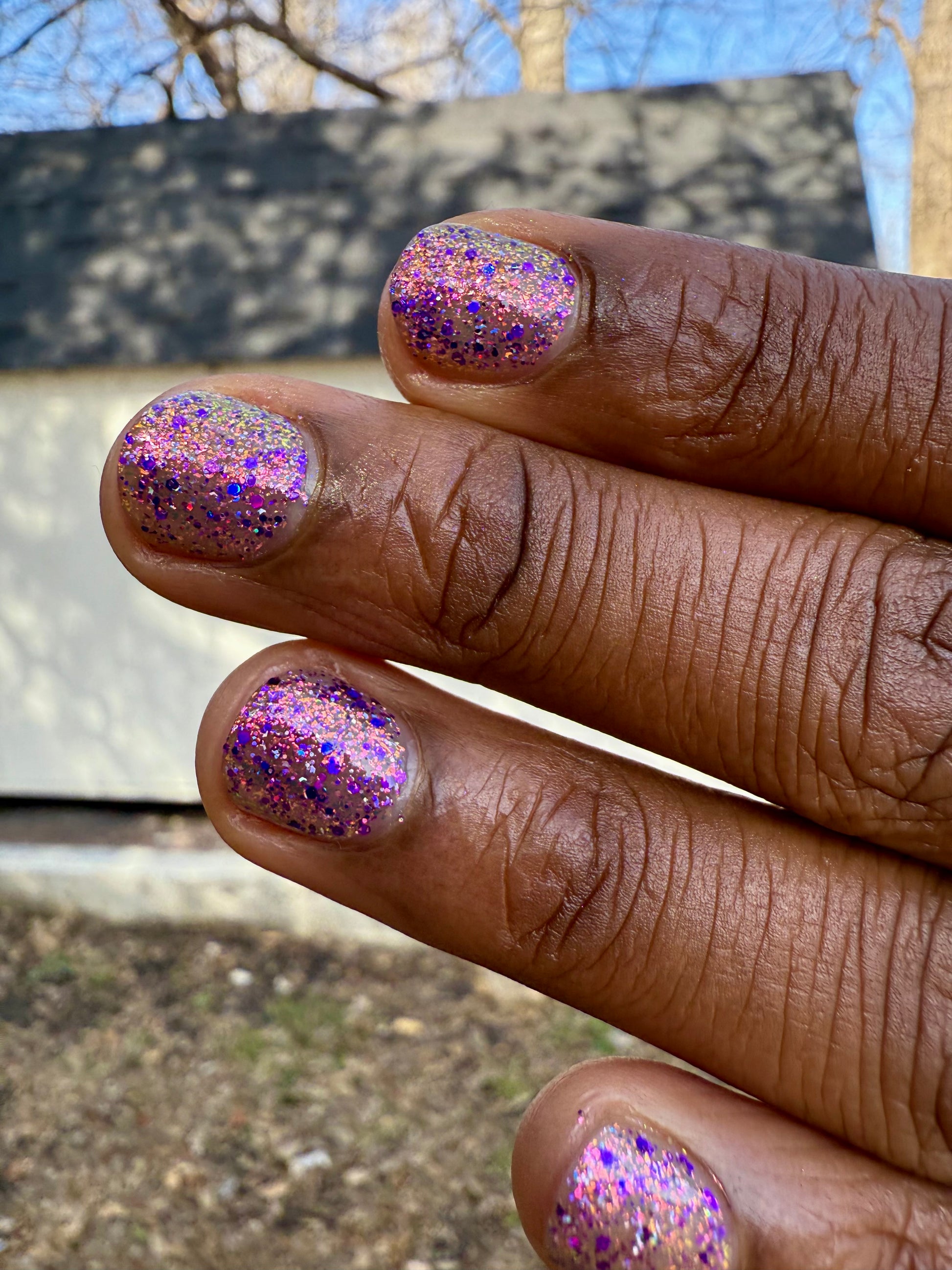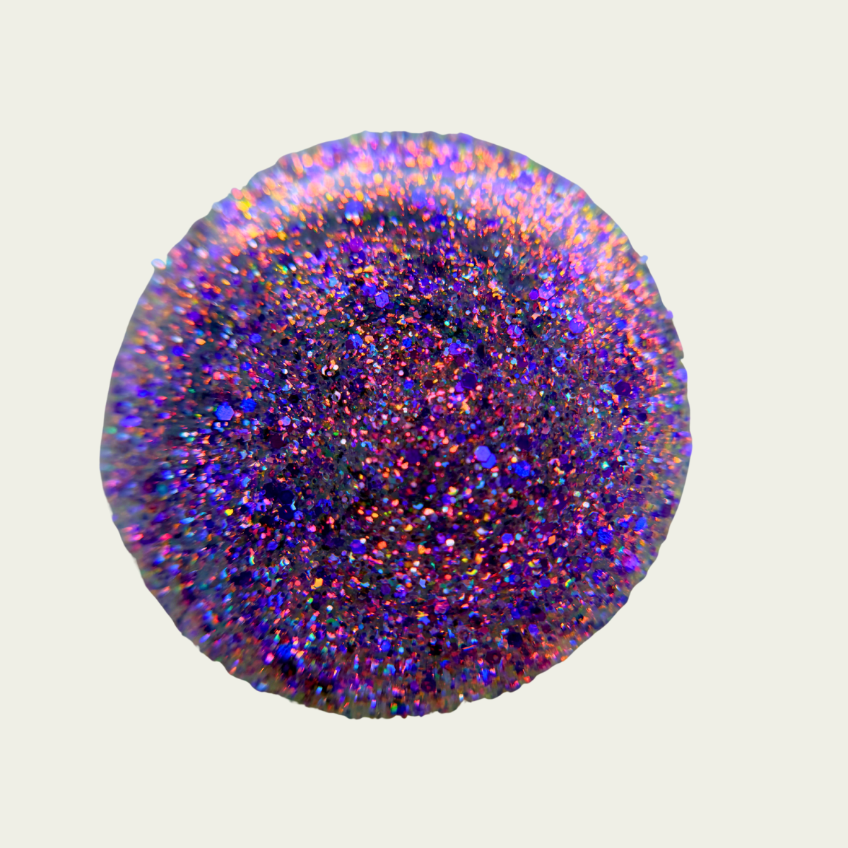 Multichrome metallic flake base with a variety of purple glitters in different sizes and shades. Weird, fun, and sparkly!