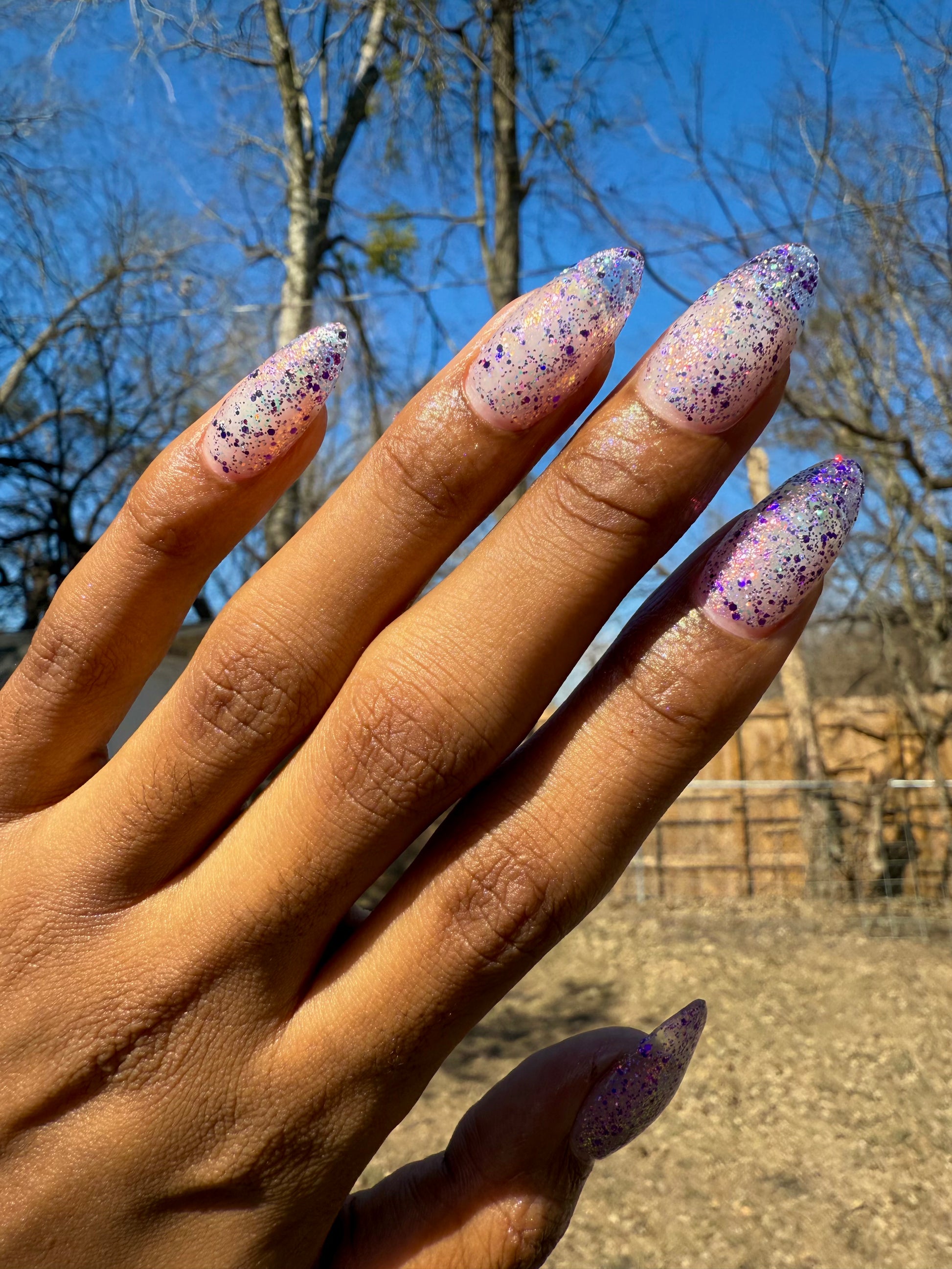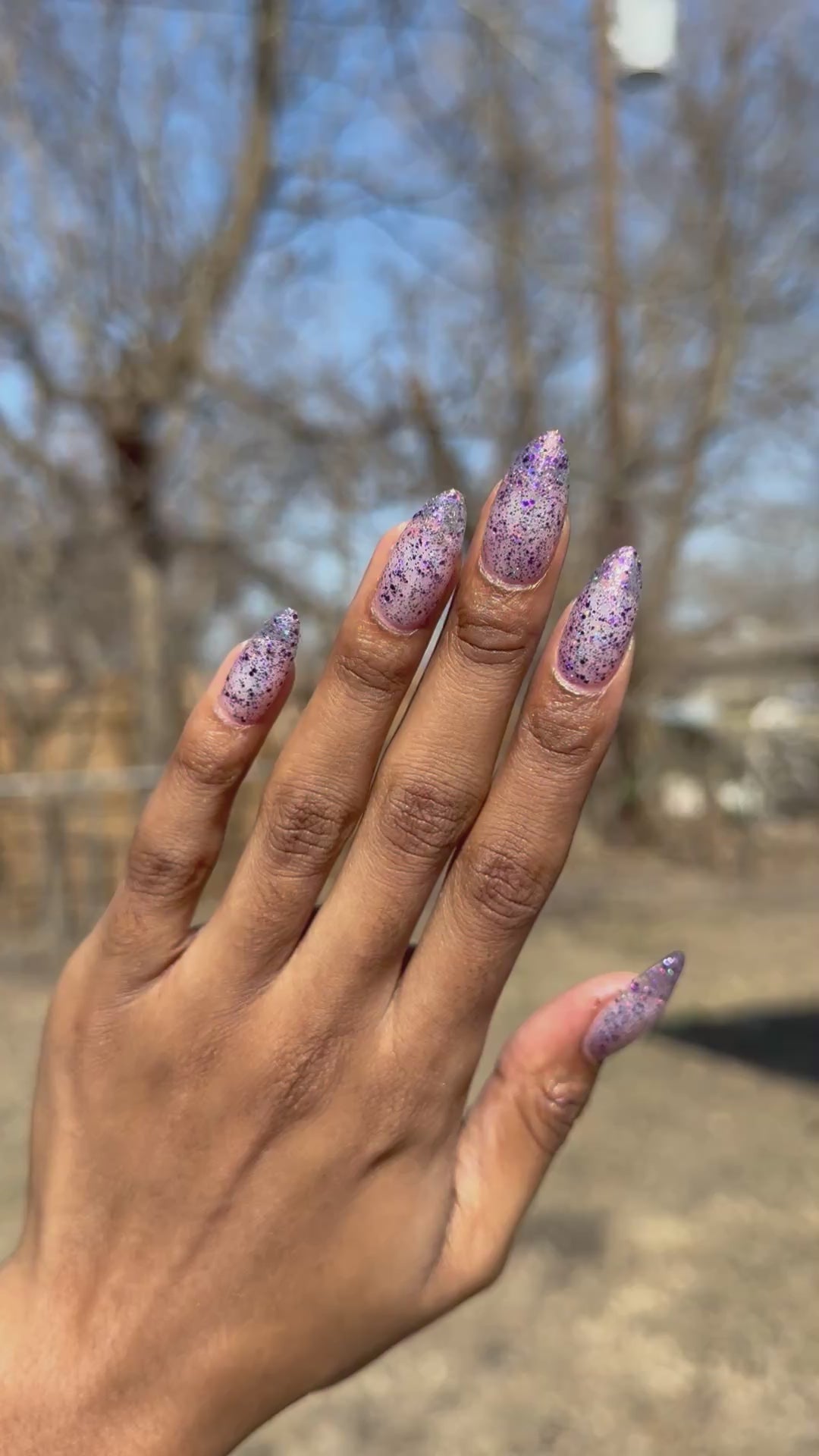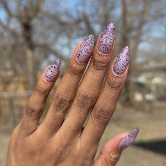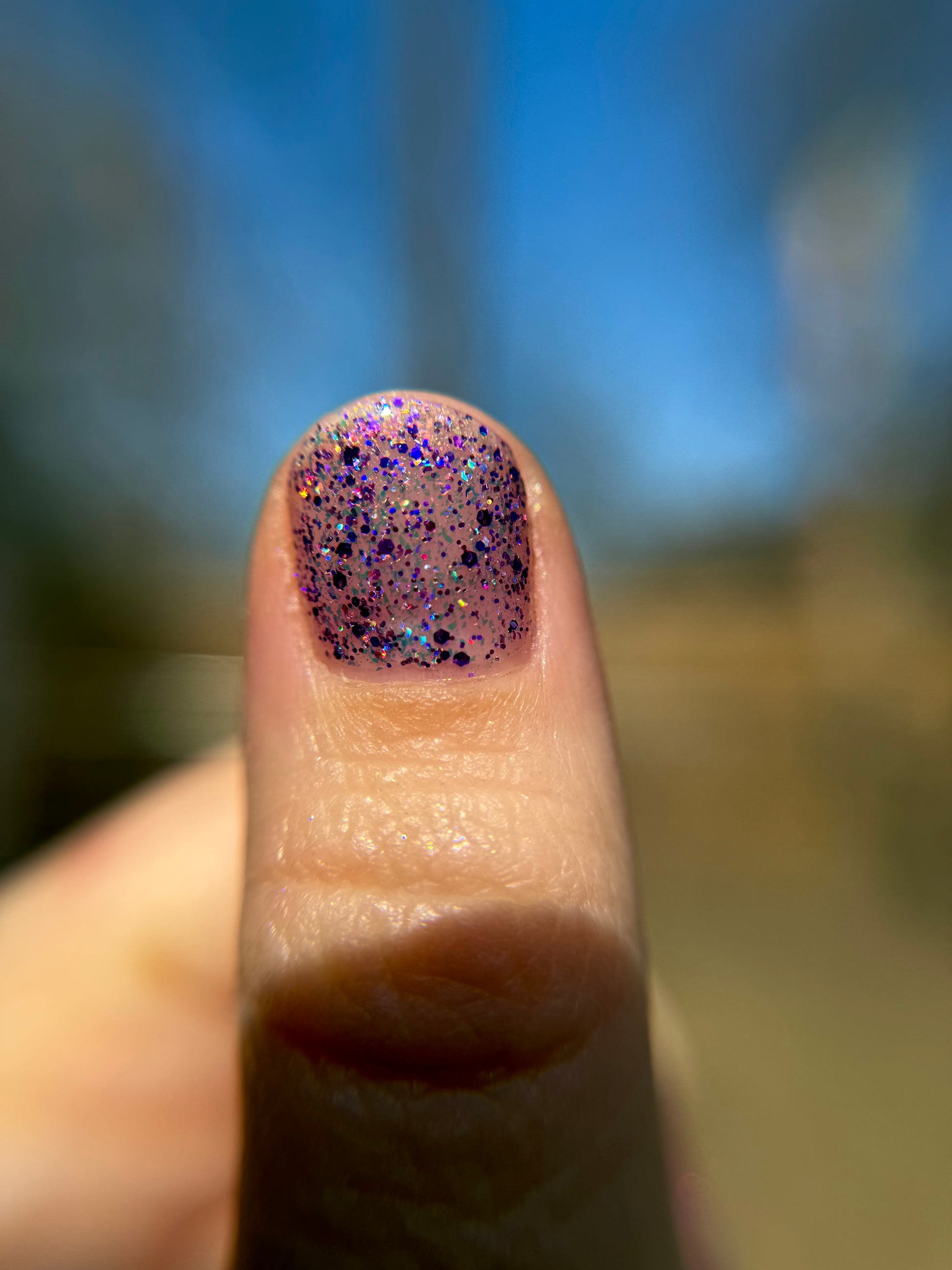 Multichrome metallic flake base with a variety of purple glitters in different sizes and shades. Weird, fun, and sparkly!
