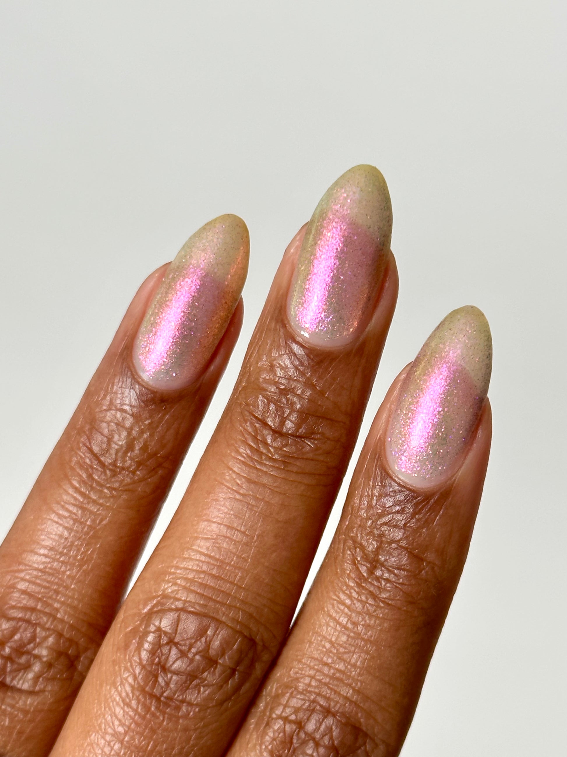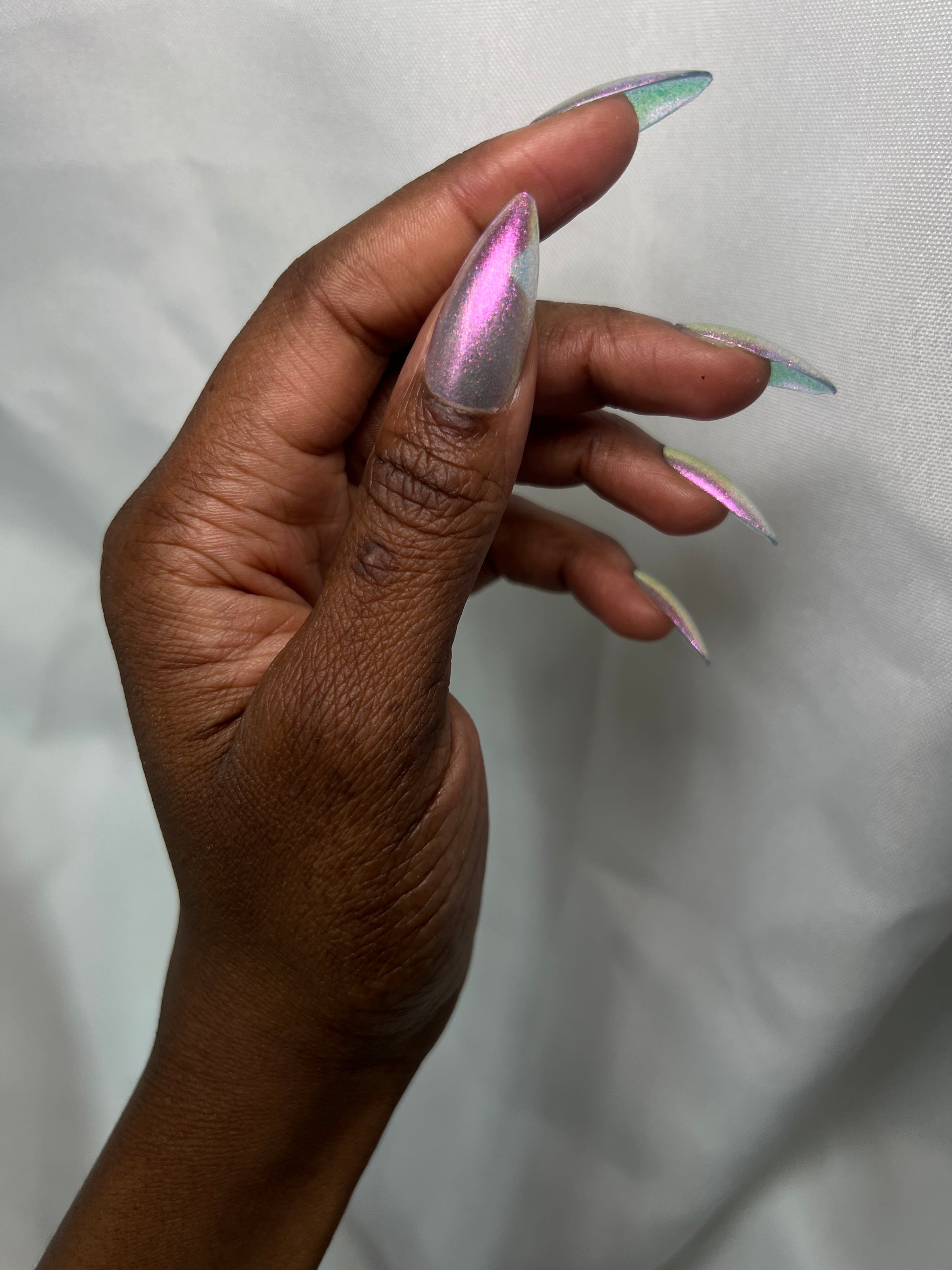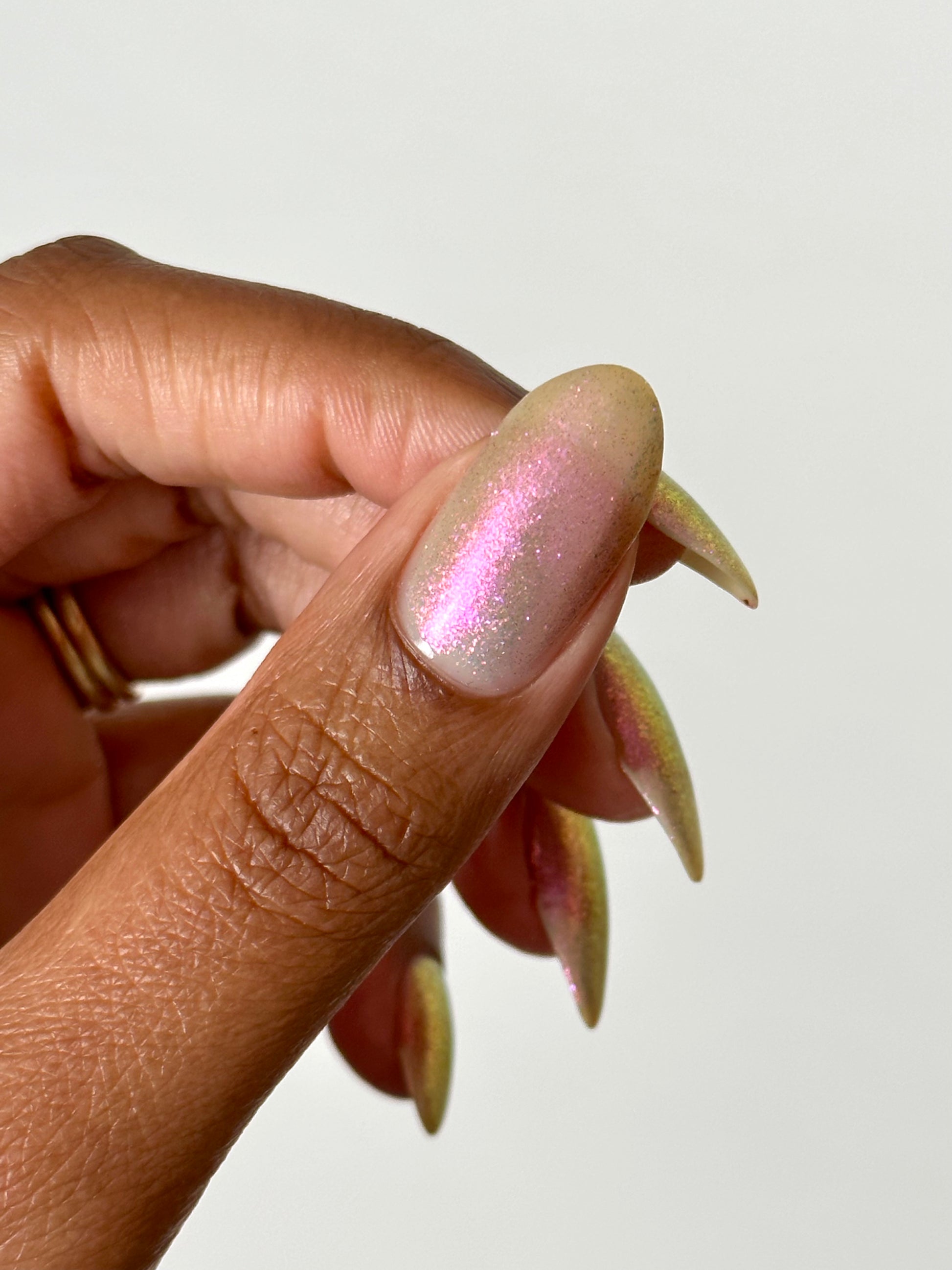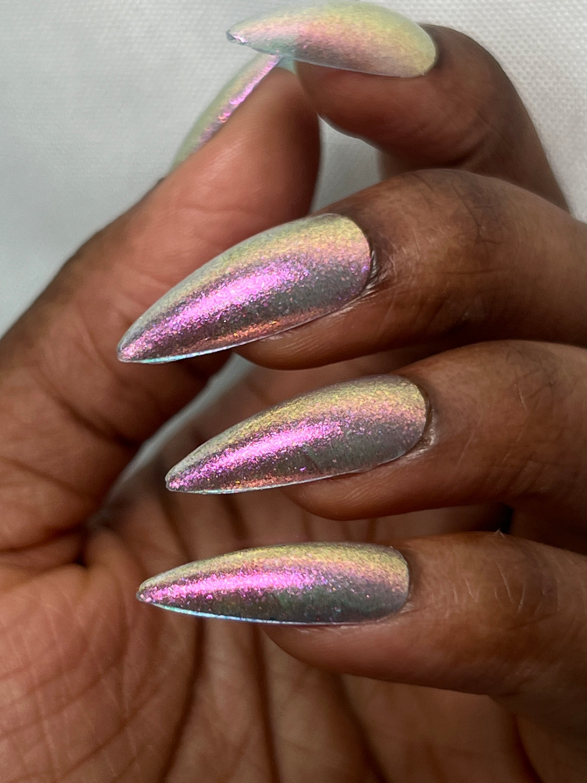 Two sizes of super shifty pink/orange/gold/green aurora chrome micro flakes