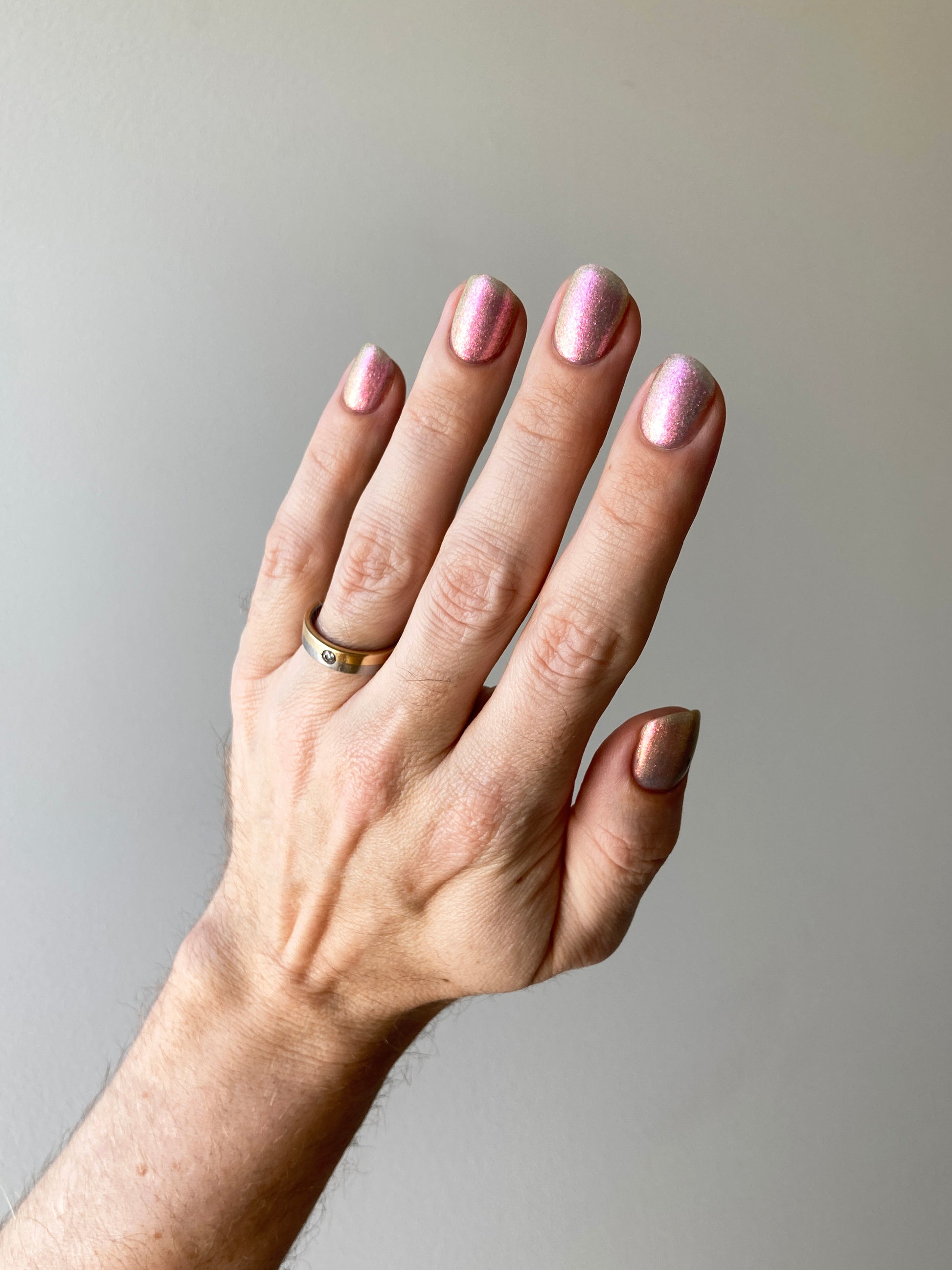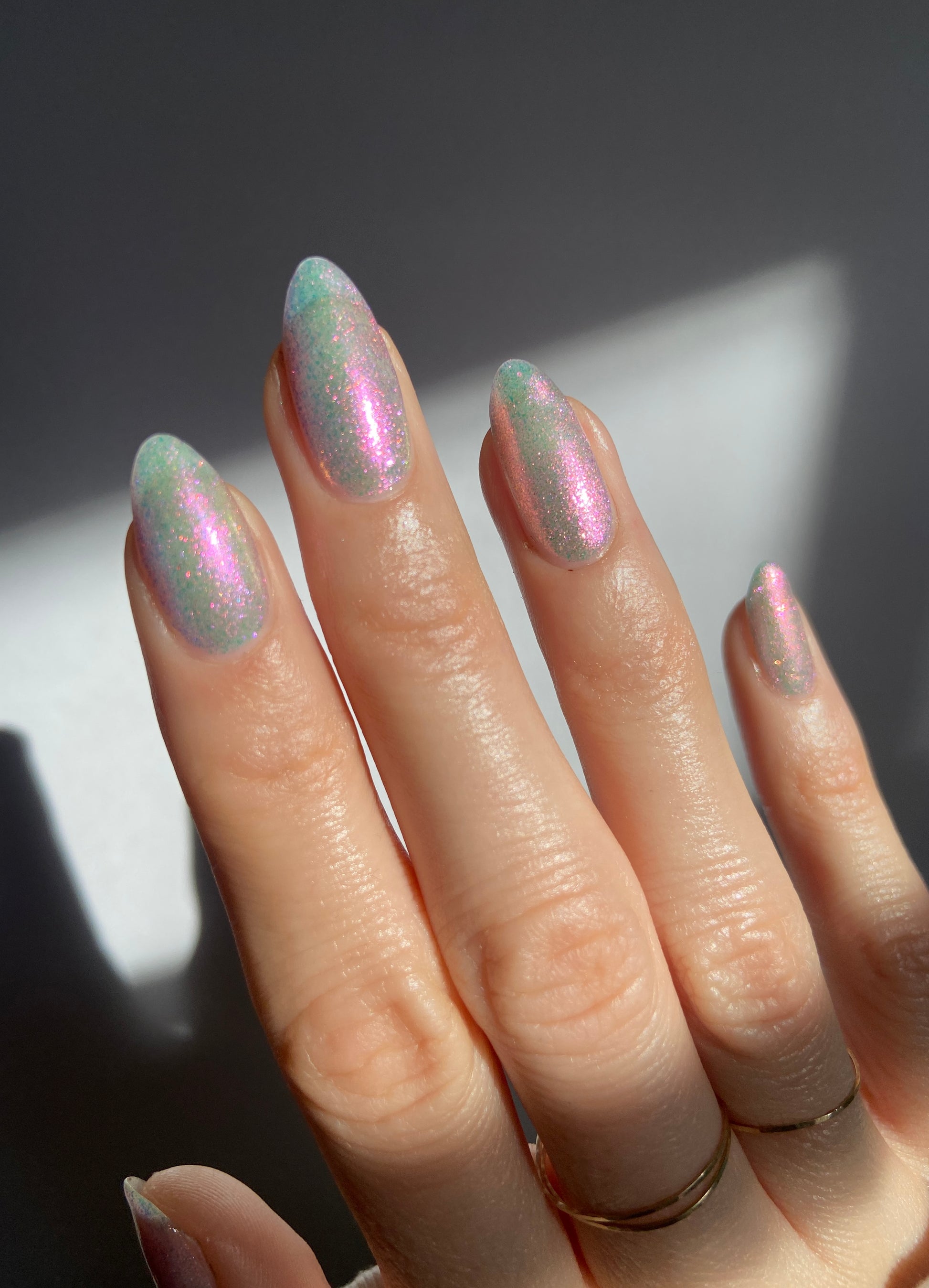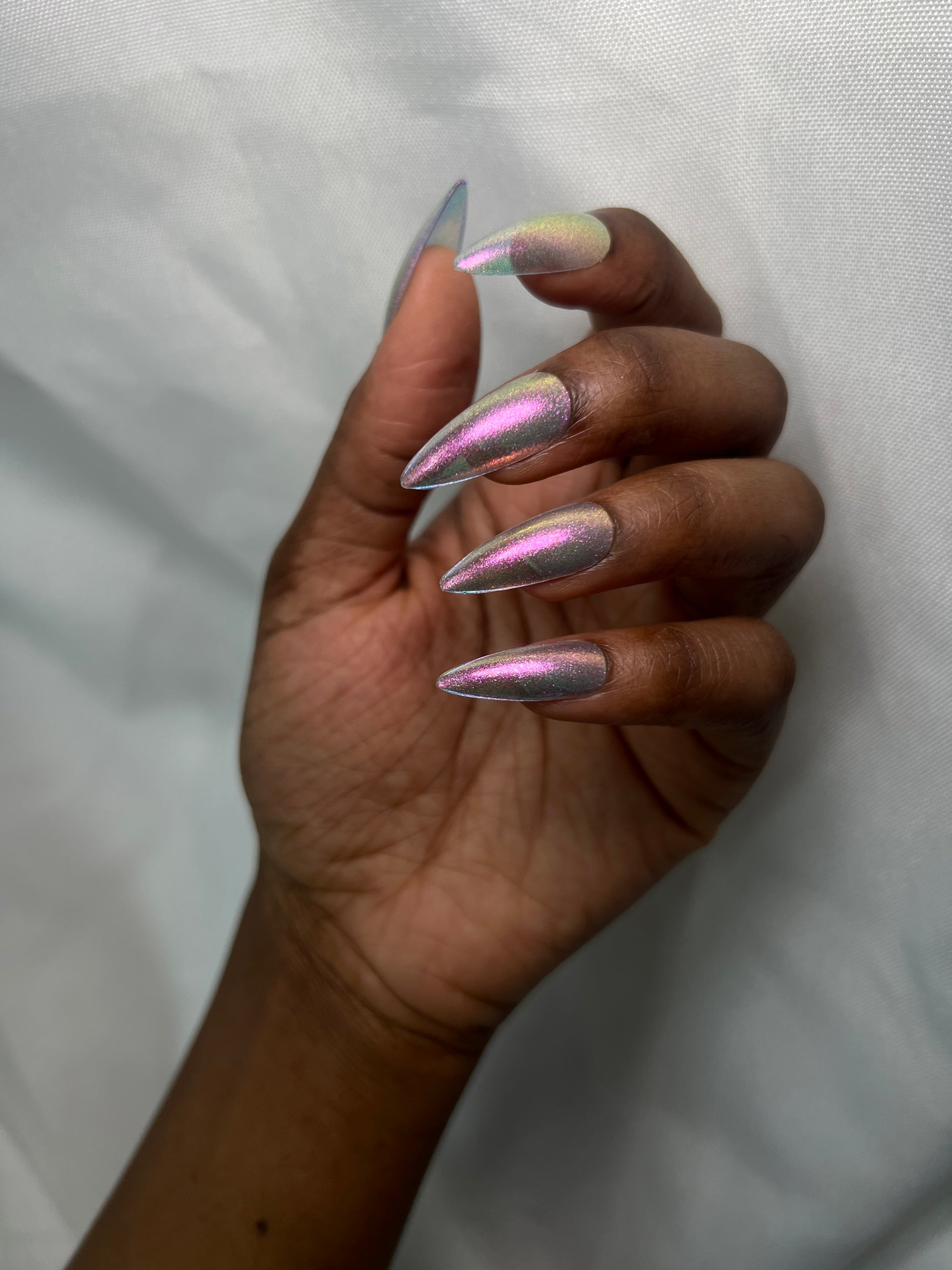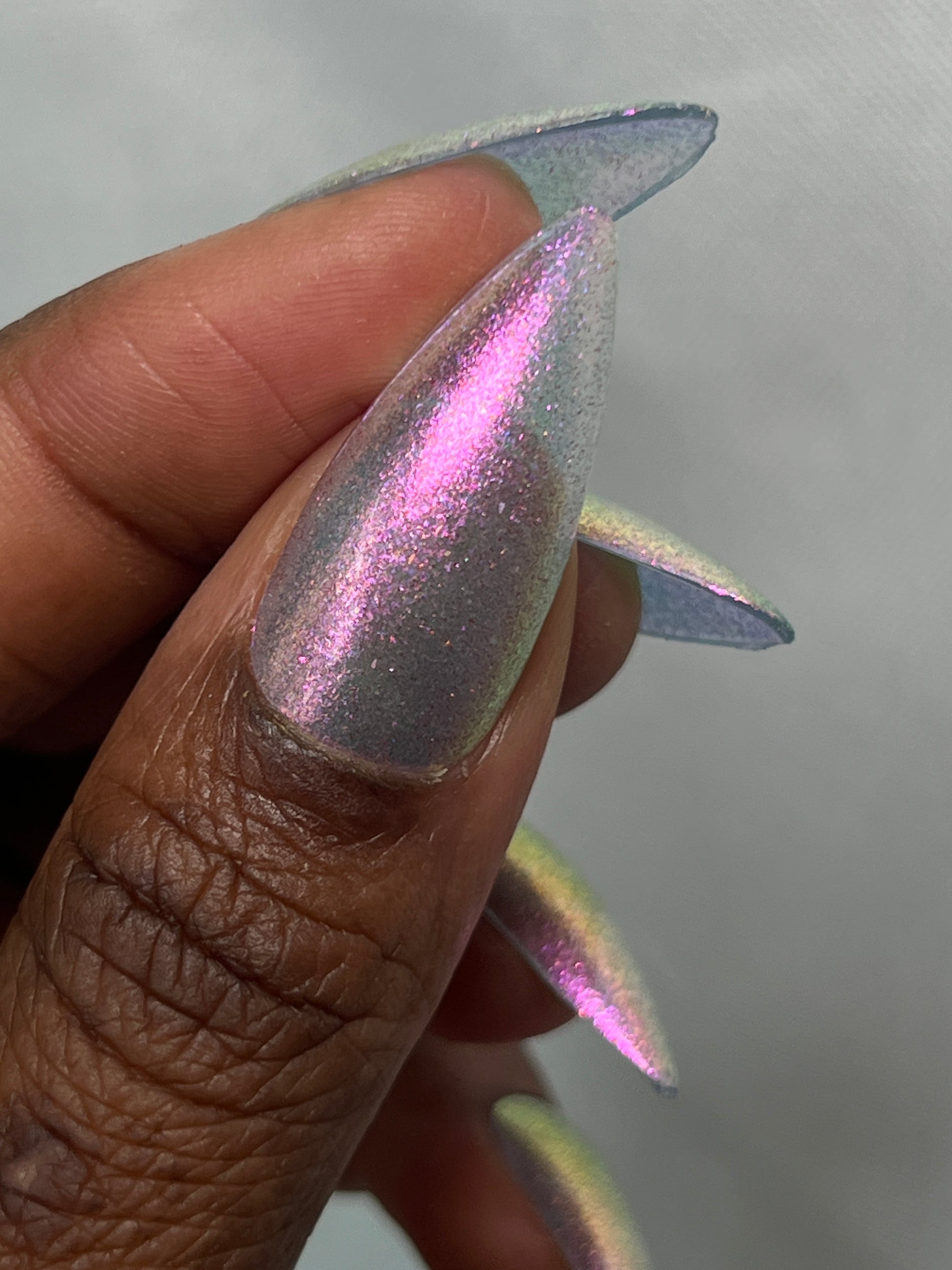 Two sizes of super shifty pink/orange/gold/green aurora chrome micro flakes