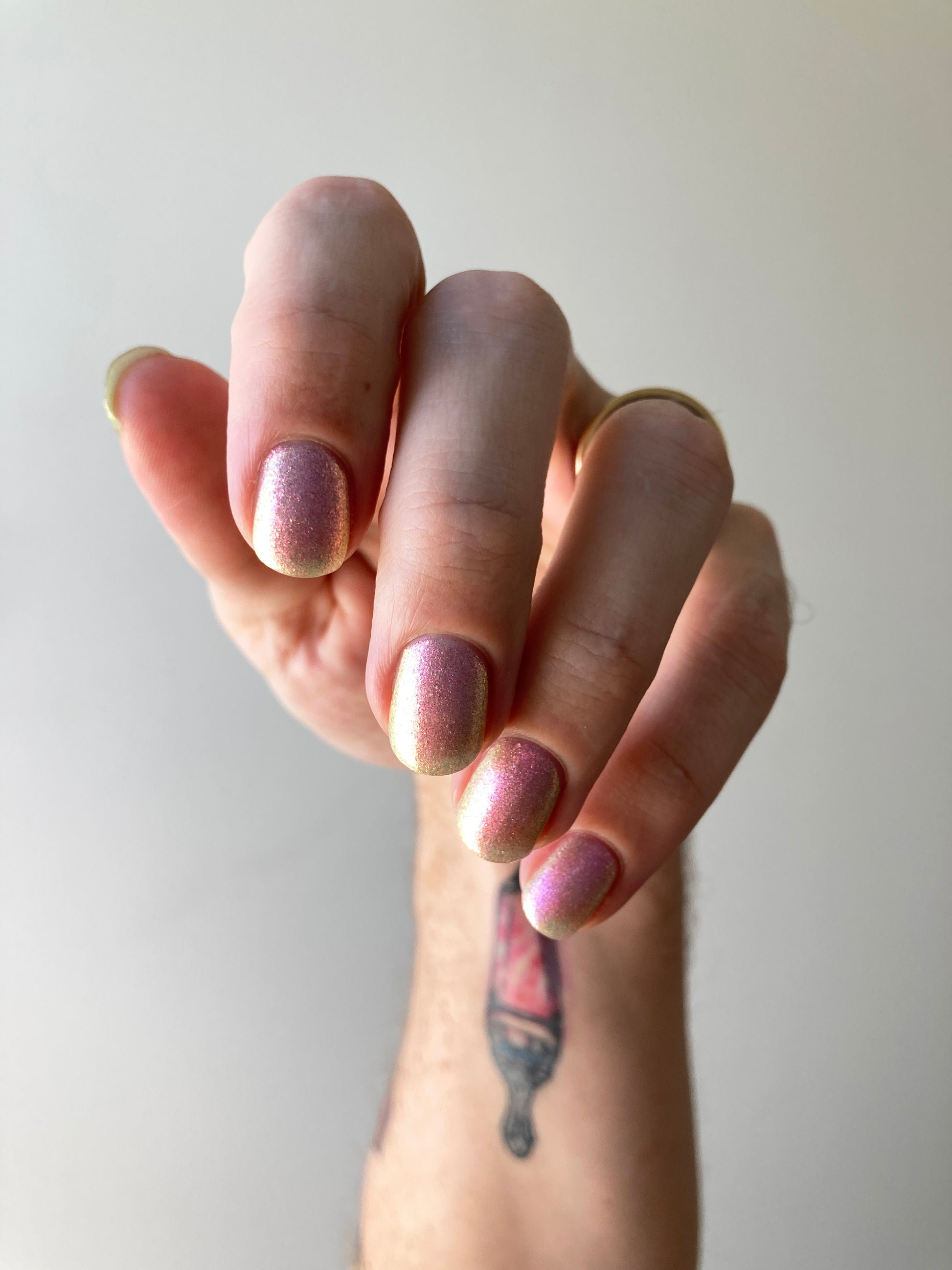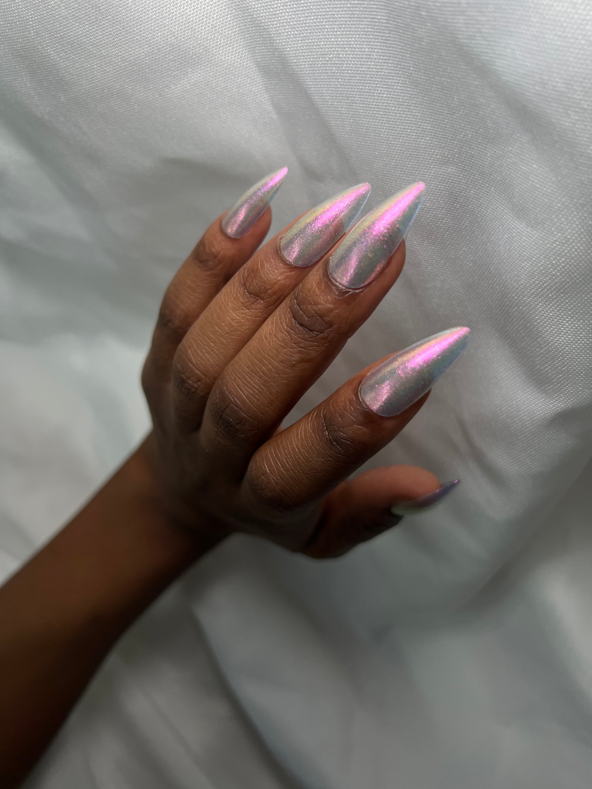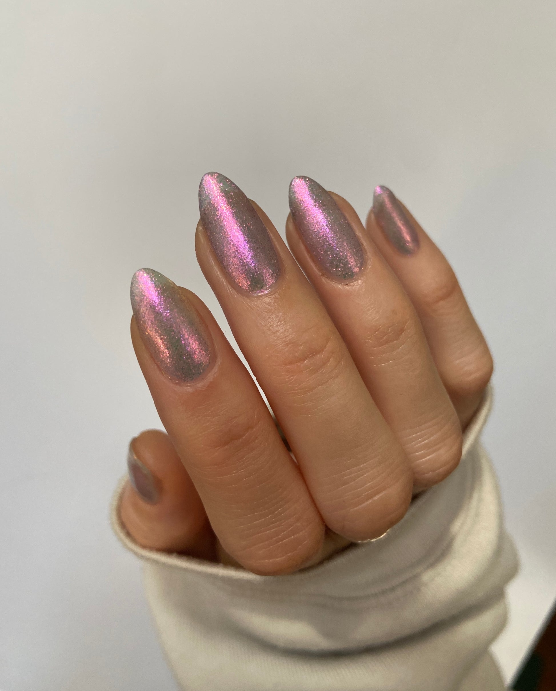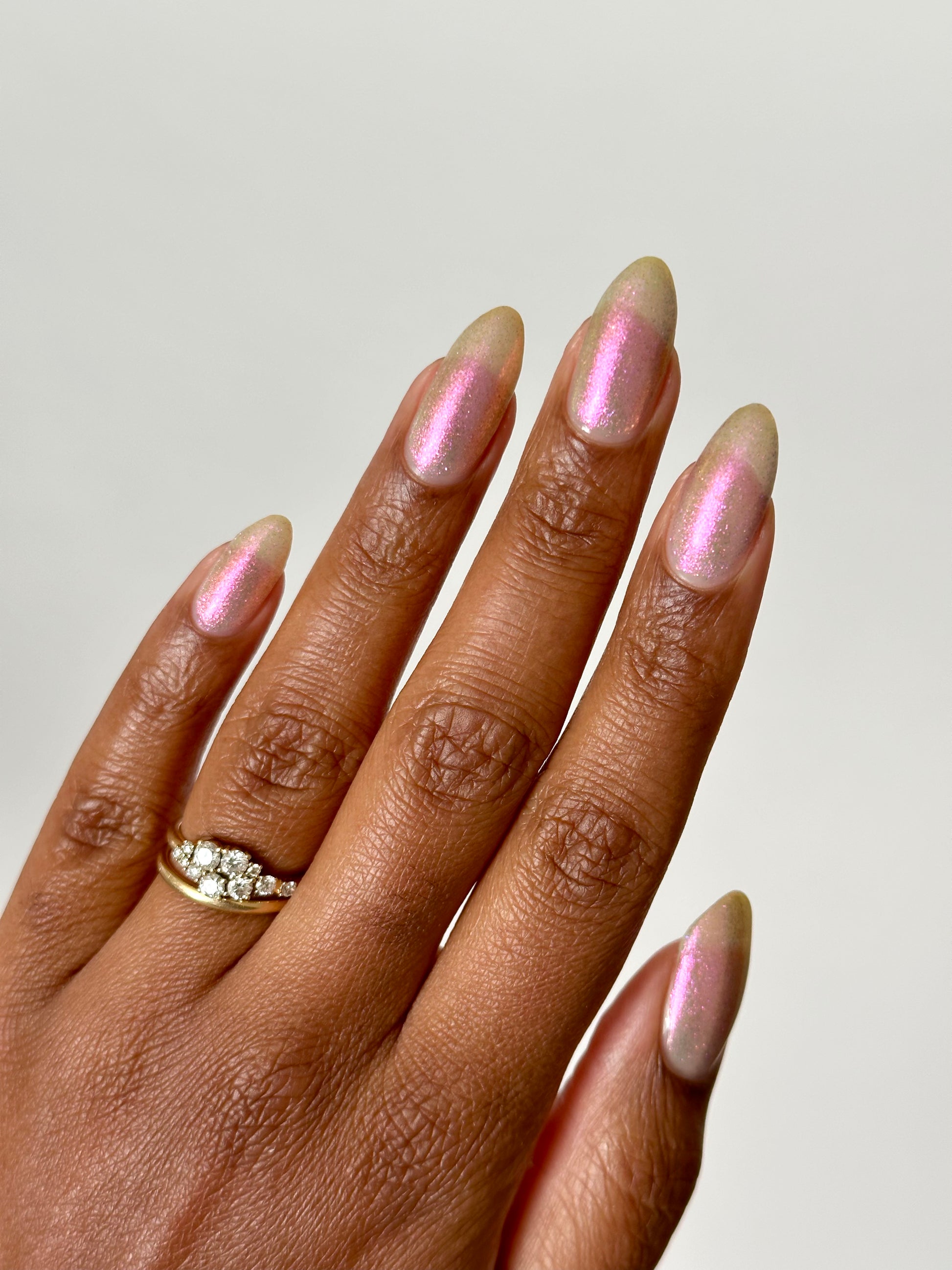 Two sizes of super shifty pink/orange/gold/green aurora chrome micro flakes