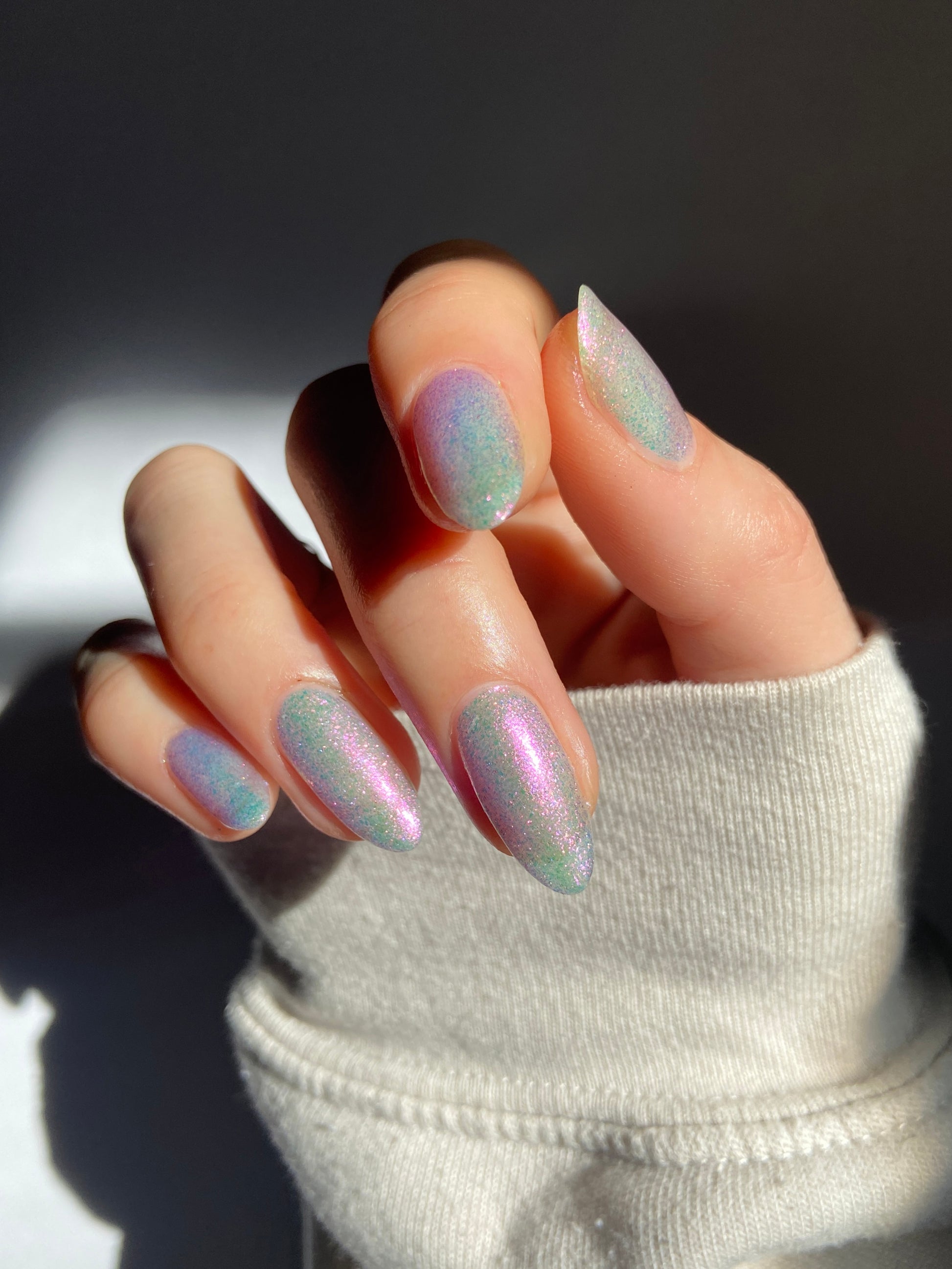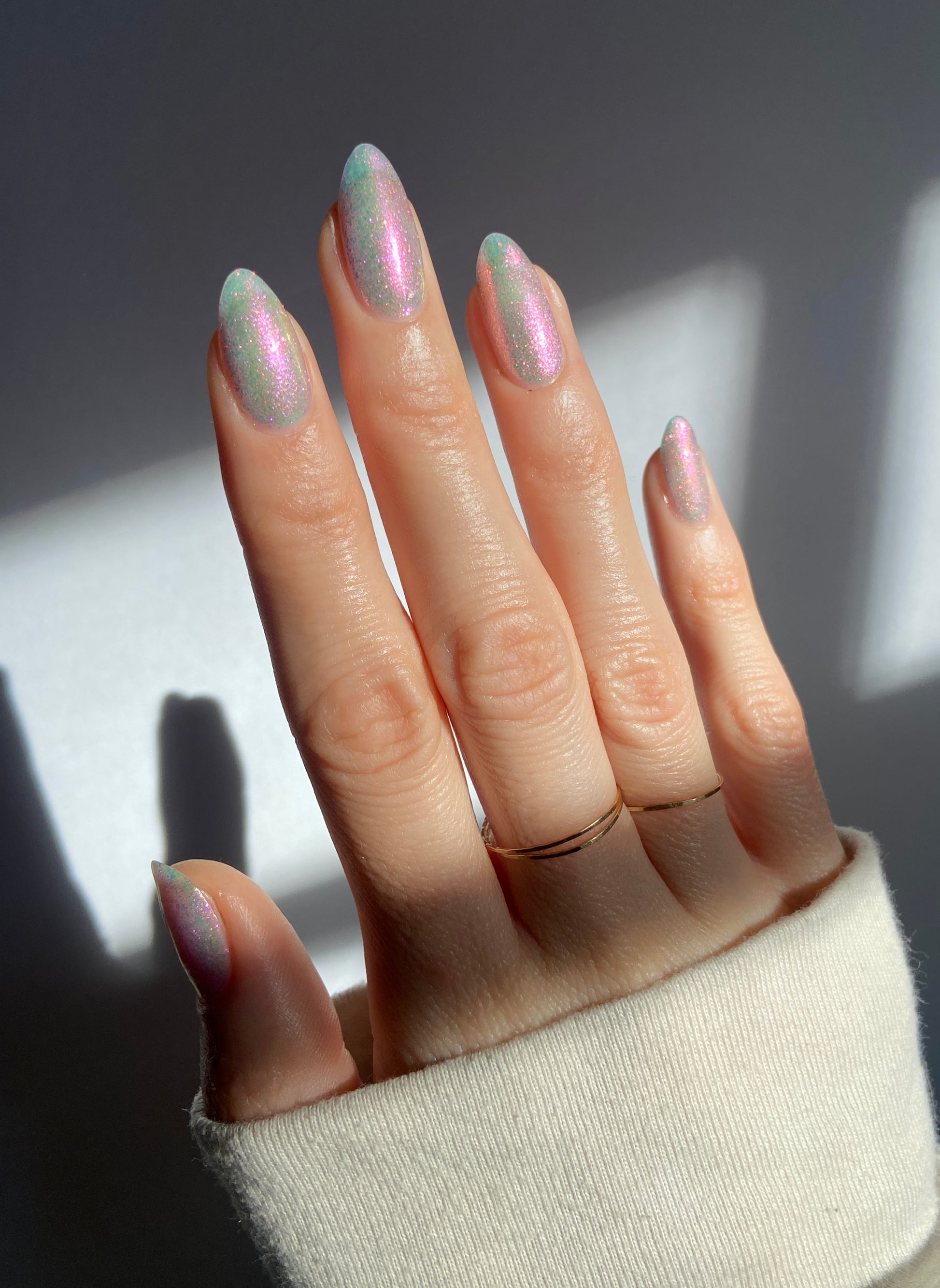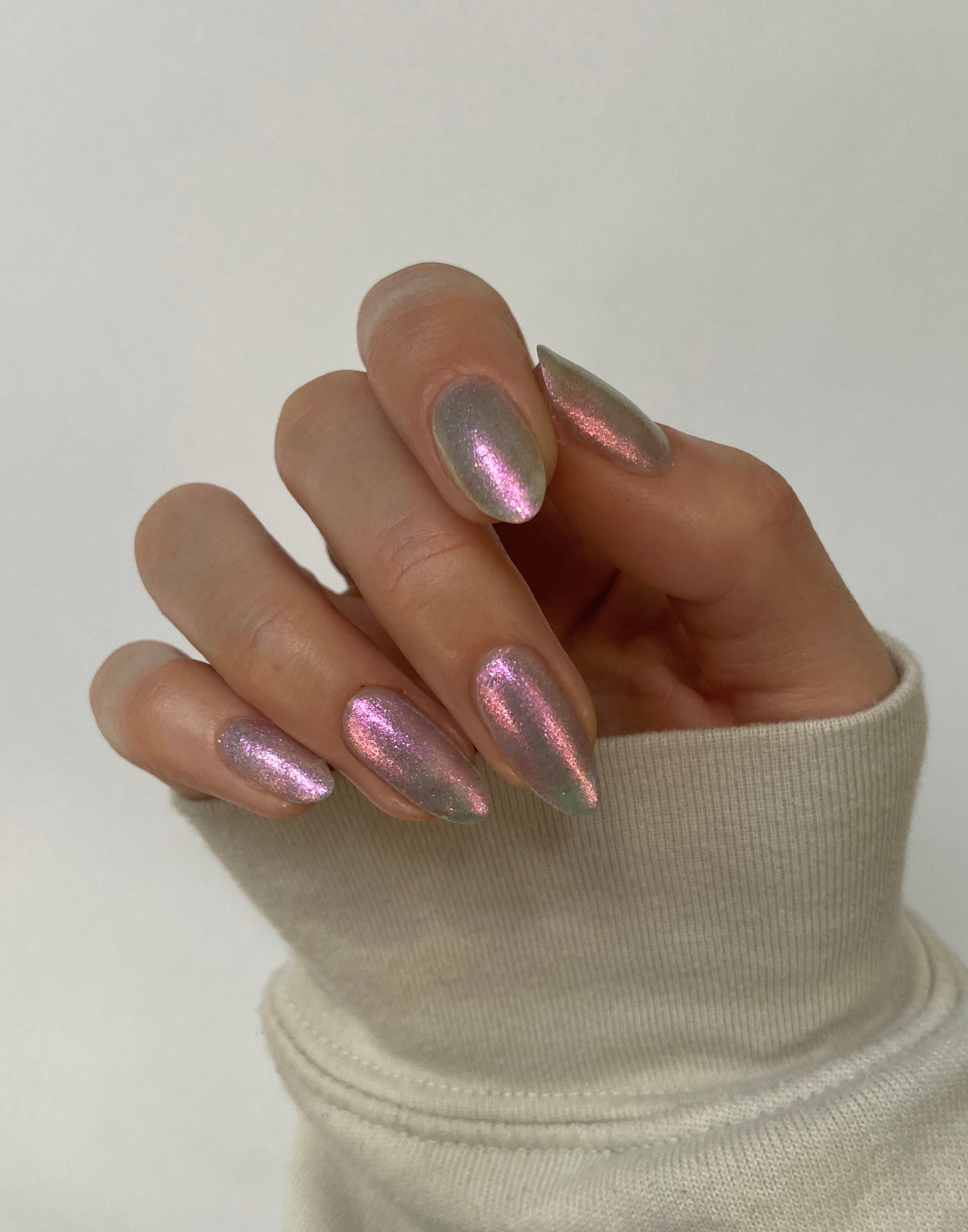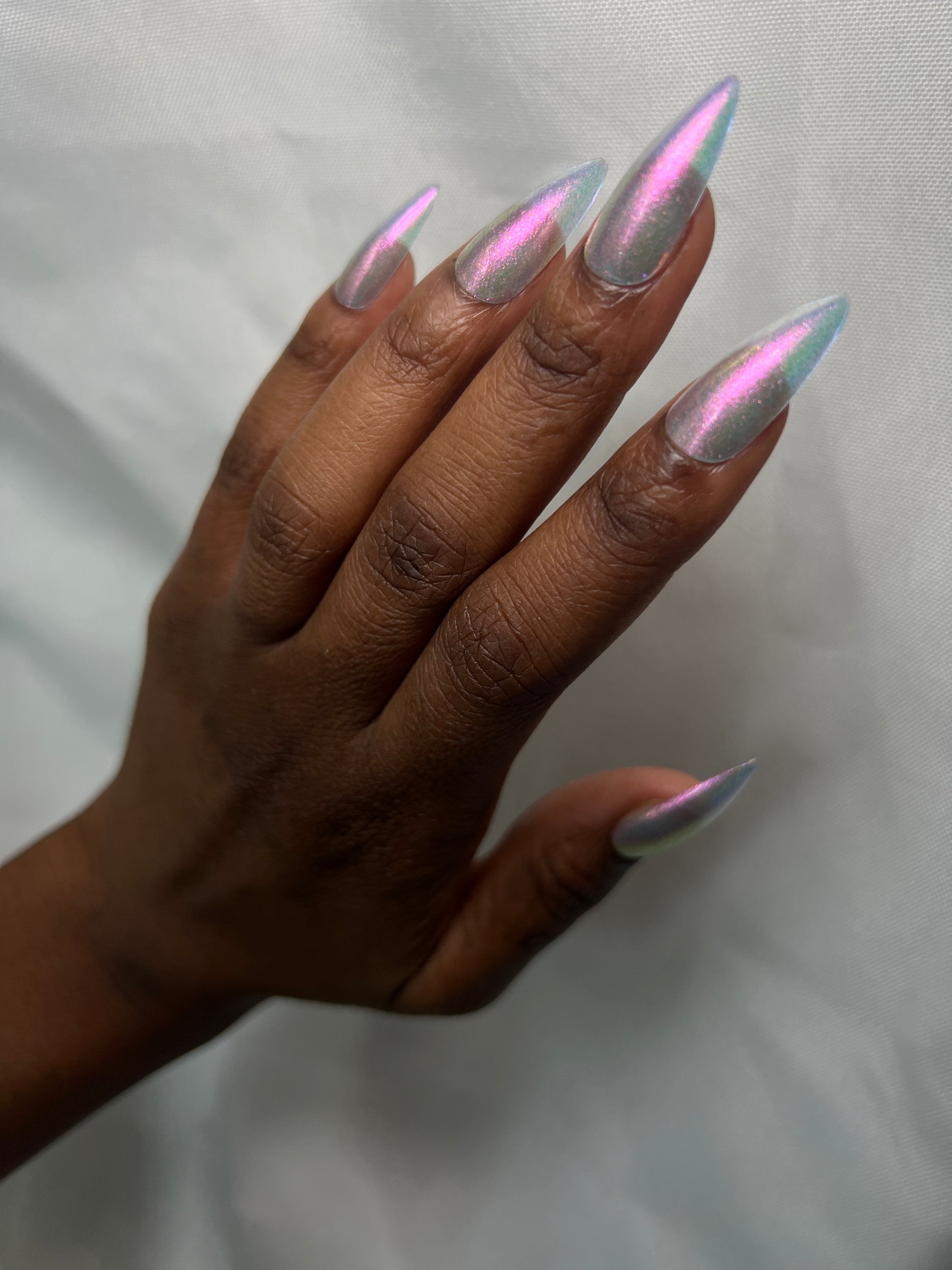 Two sizes of super shifty pink/orange/gold/green aurora chrome micro flakes