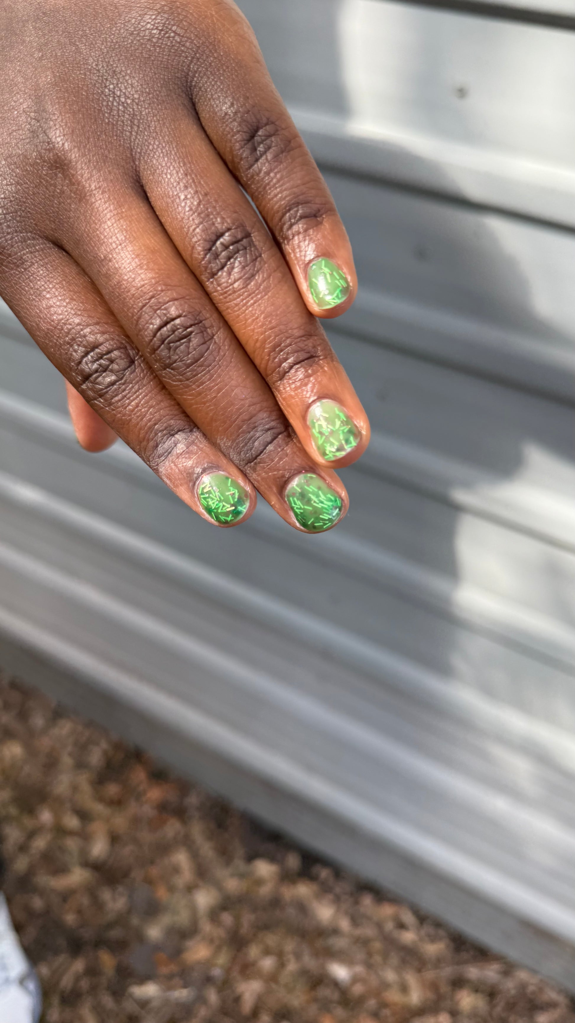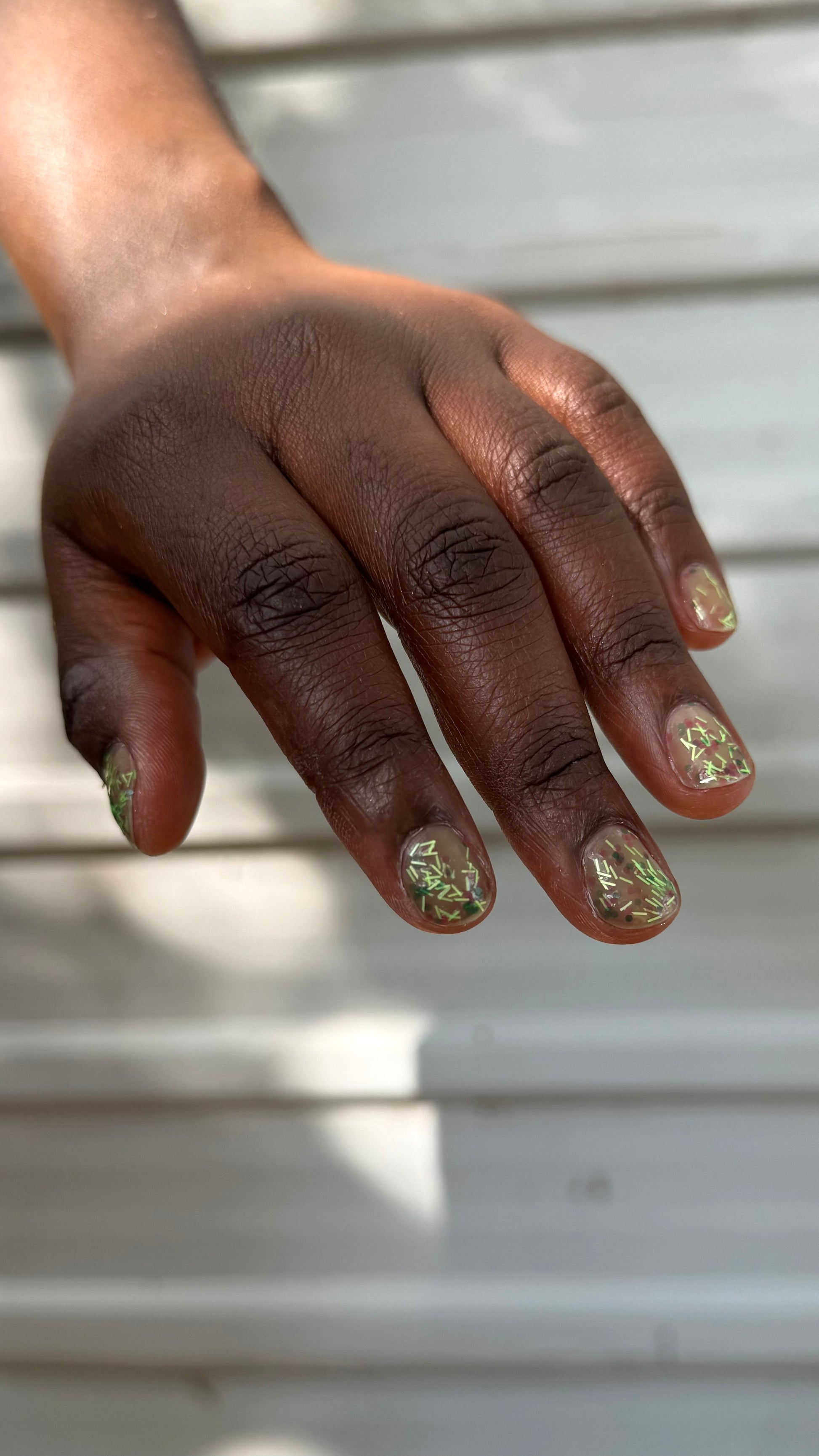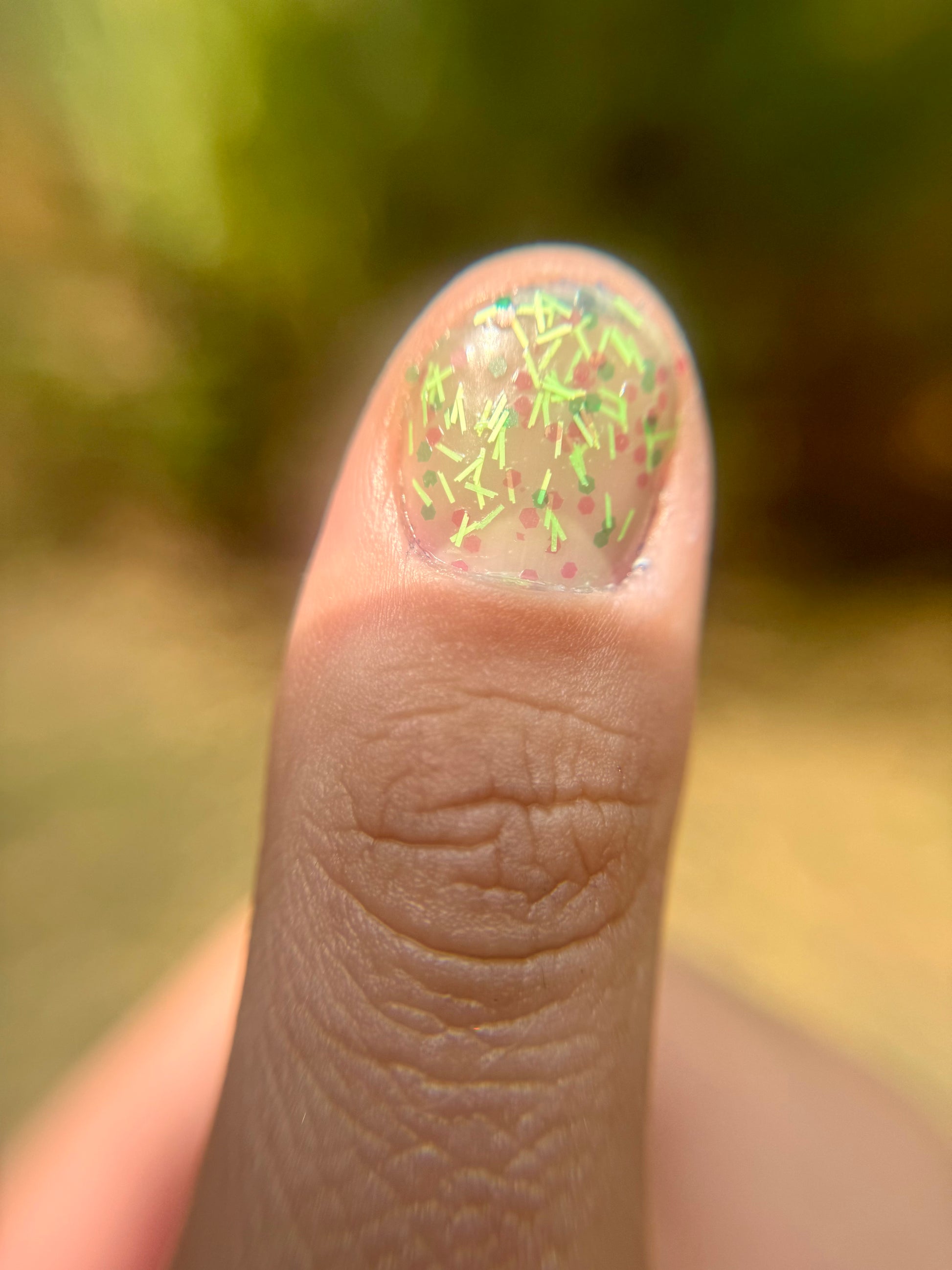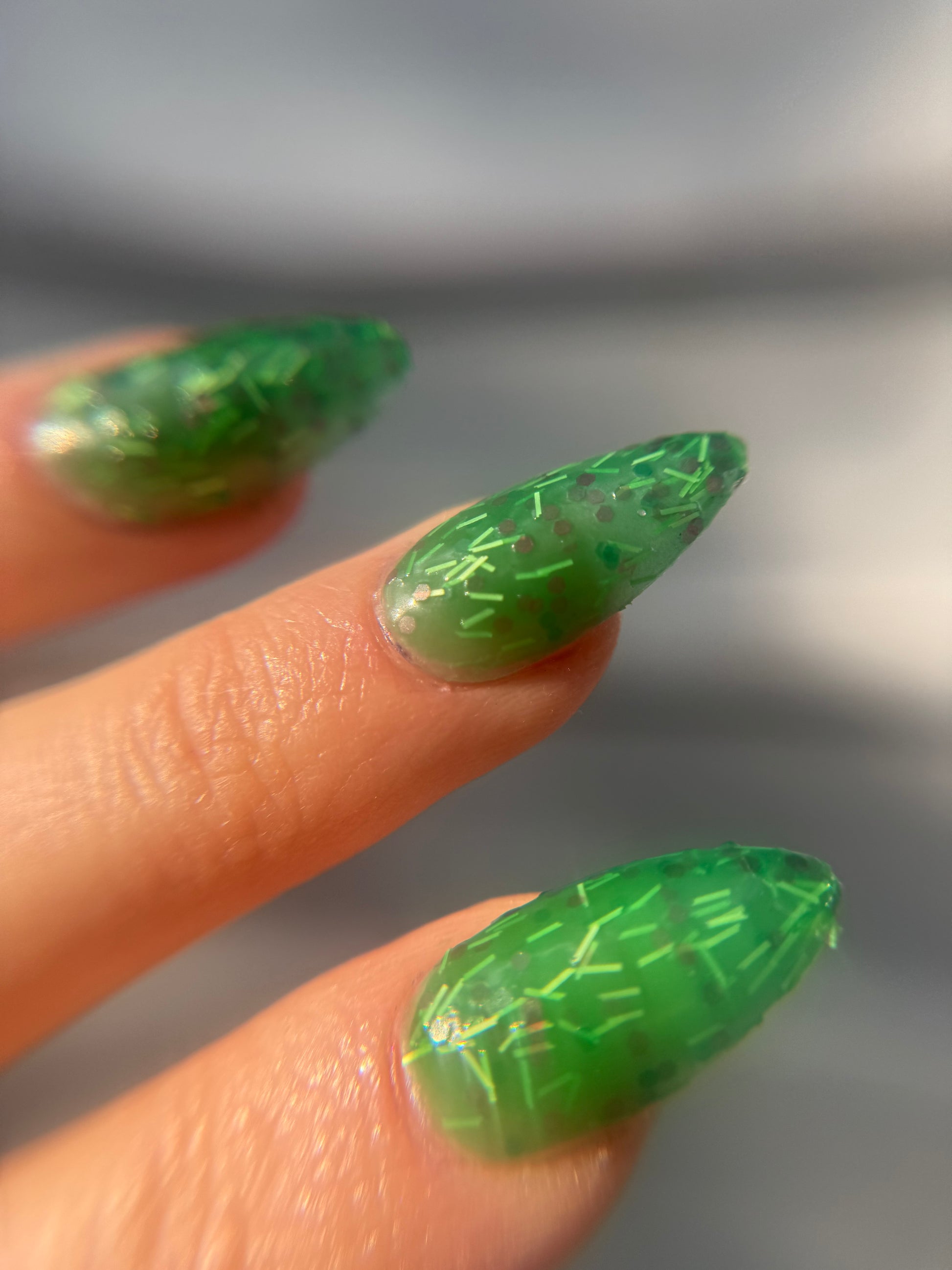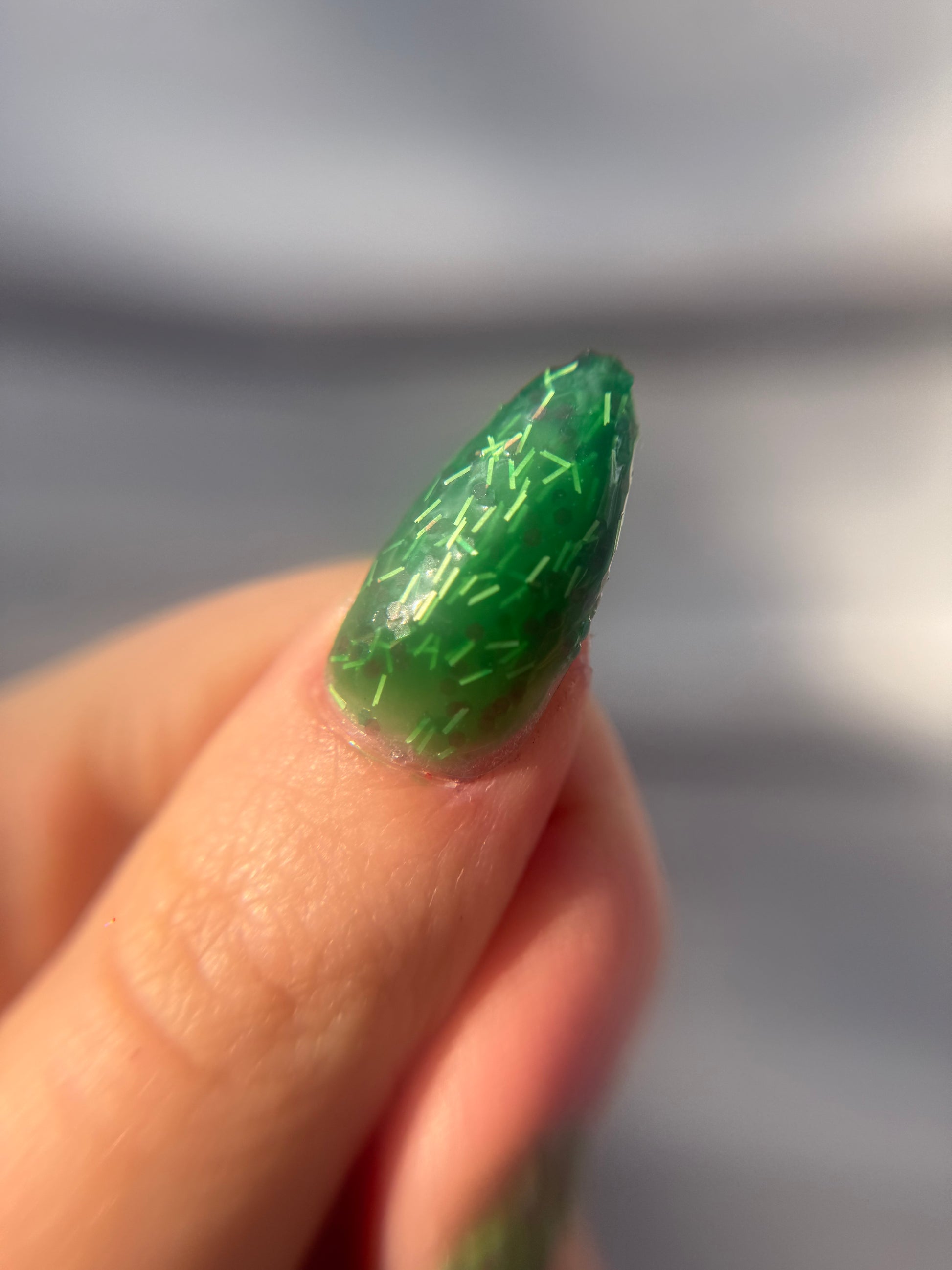 Emerald jelly thermal that goes sheer when hot. In its cold state the green base contrasts with light green matte bars that look like grass clippings or pine needles. When heated, flat matte green and red glitters are revealed and the light green bars display more neon-lime green. Sherbert wash. Confetti suspended in gelatin. For the most dramatic transition wear this polish in cold weather. In warm weather the base is milky-lime and all three glitters can be seen.