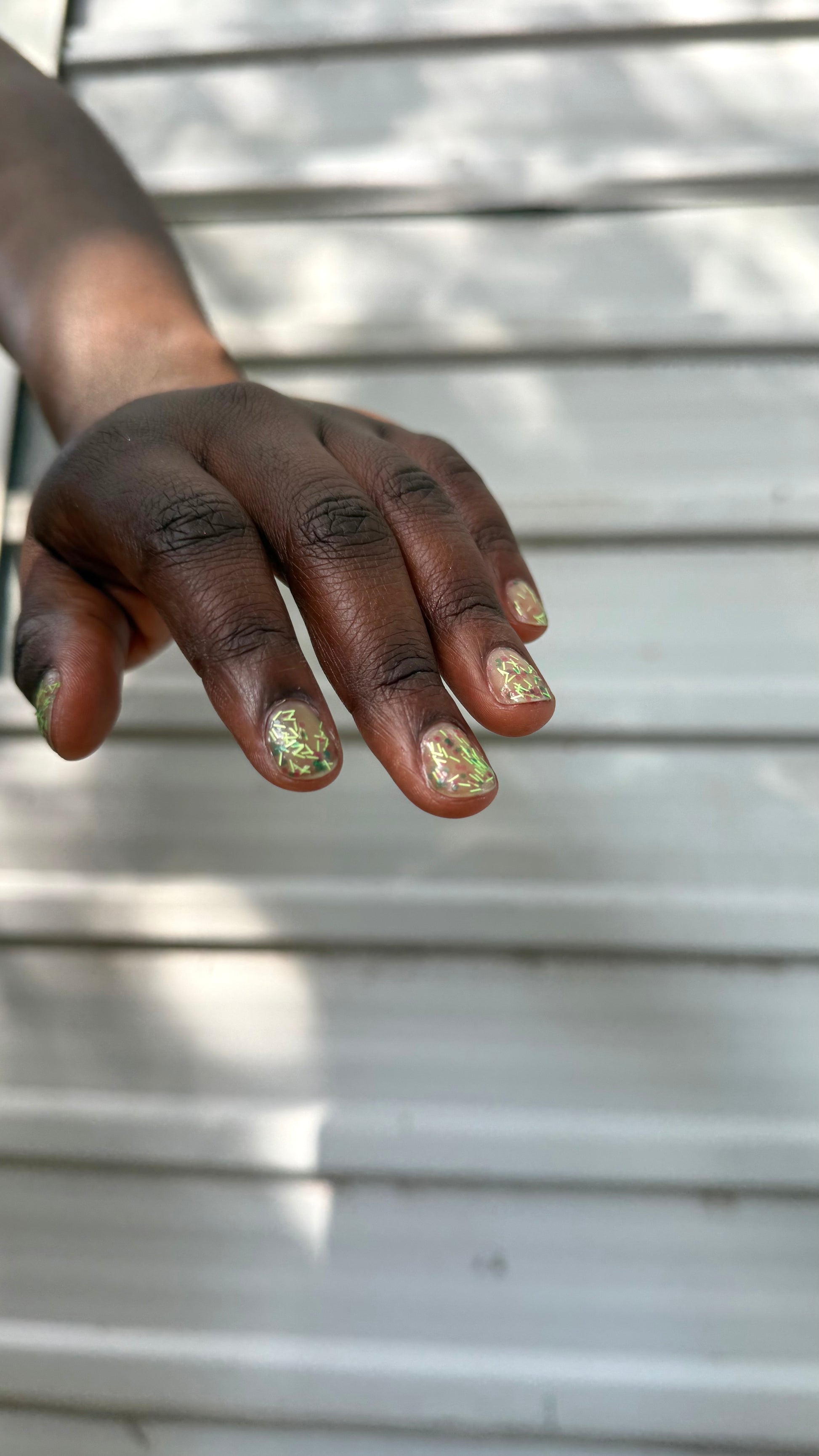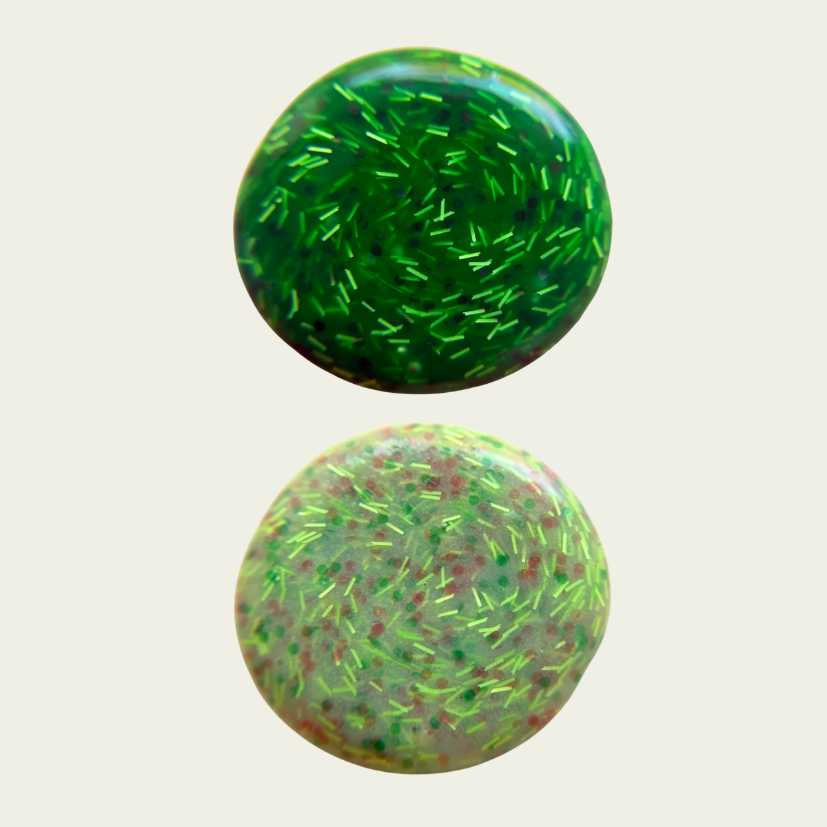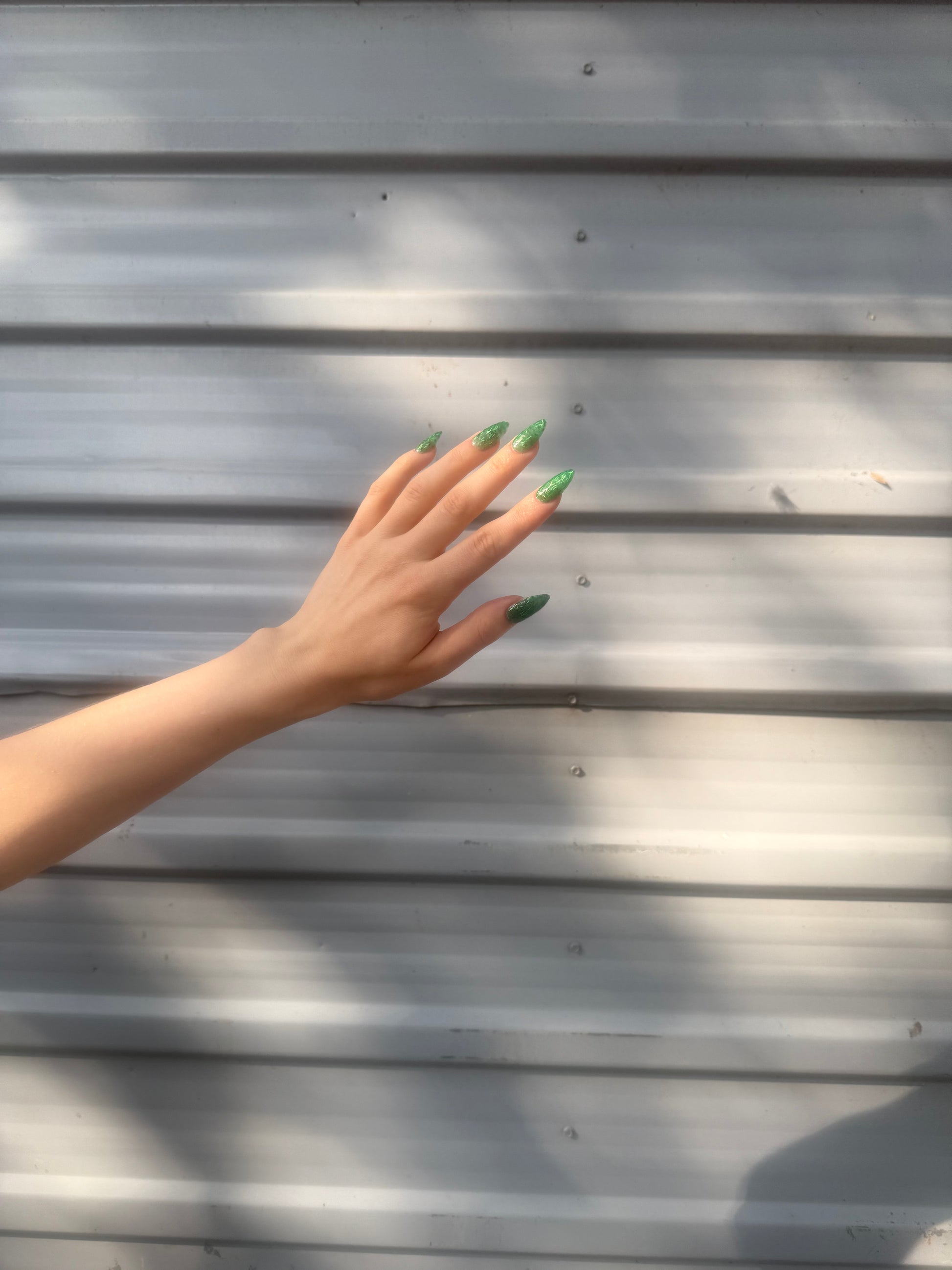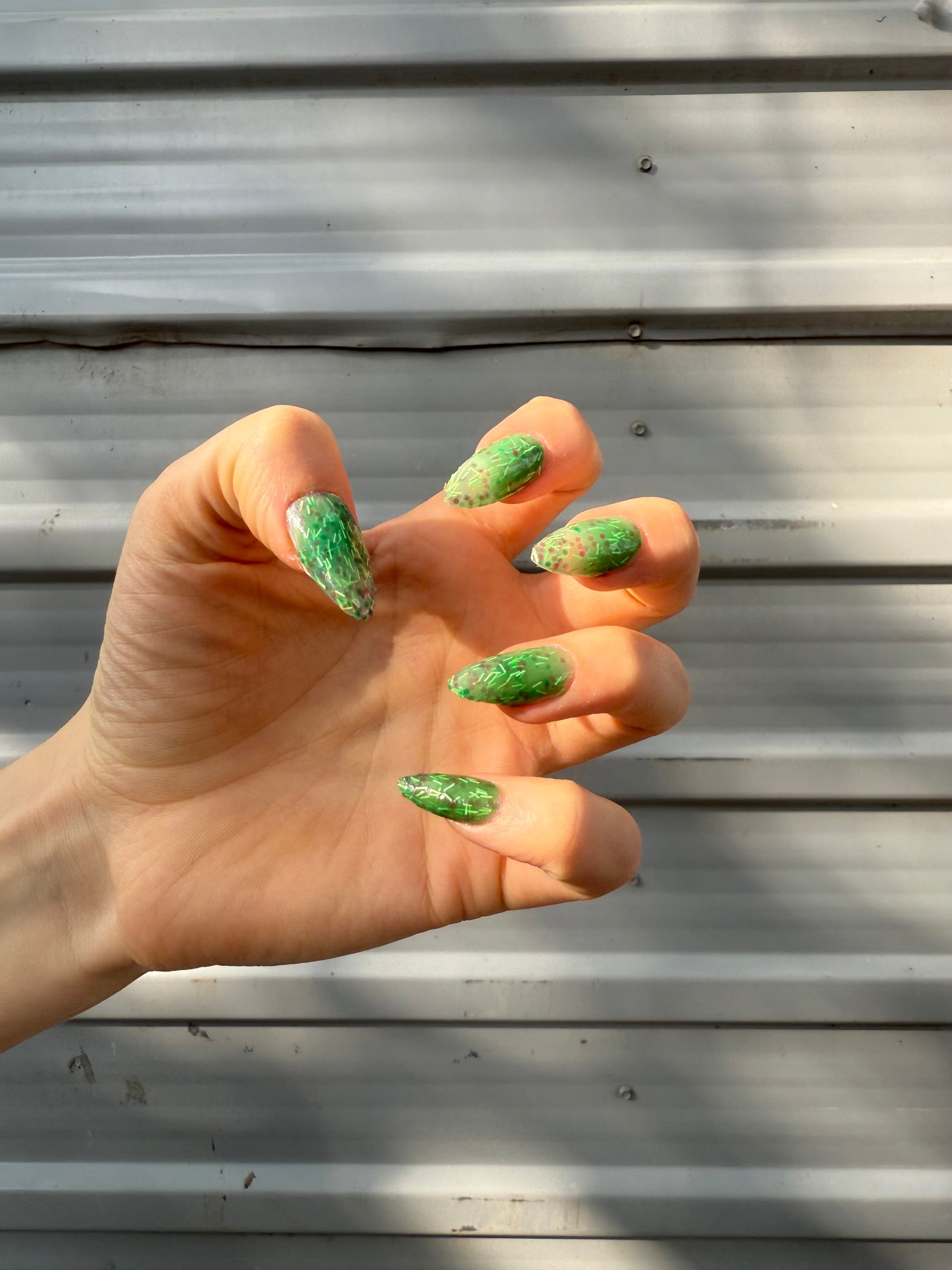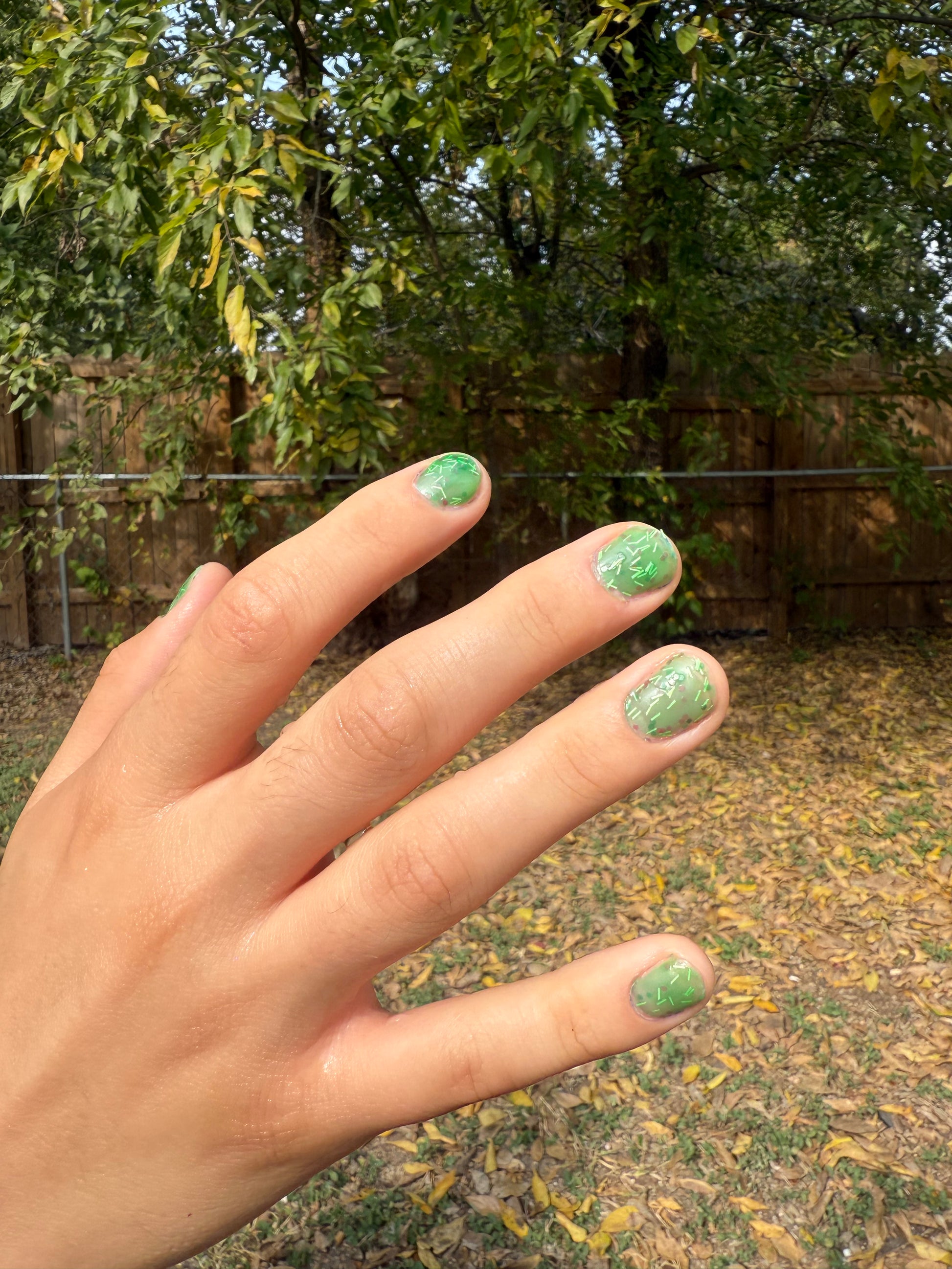 Emerald jelly thermal that goes sheer when hot. In its cold state the green base contrasts with light green matte bars that look like grass clippings or pine needles. When heated, flat matte green and red glitters are revealed and the light green bars display more neon-lime green. Sherbert wash. Confetti suspended in gelatin. For the most dramatic transition wear this polish in cold weather. In warm weather the base is milky-lime and all three glitters can be seen.