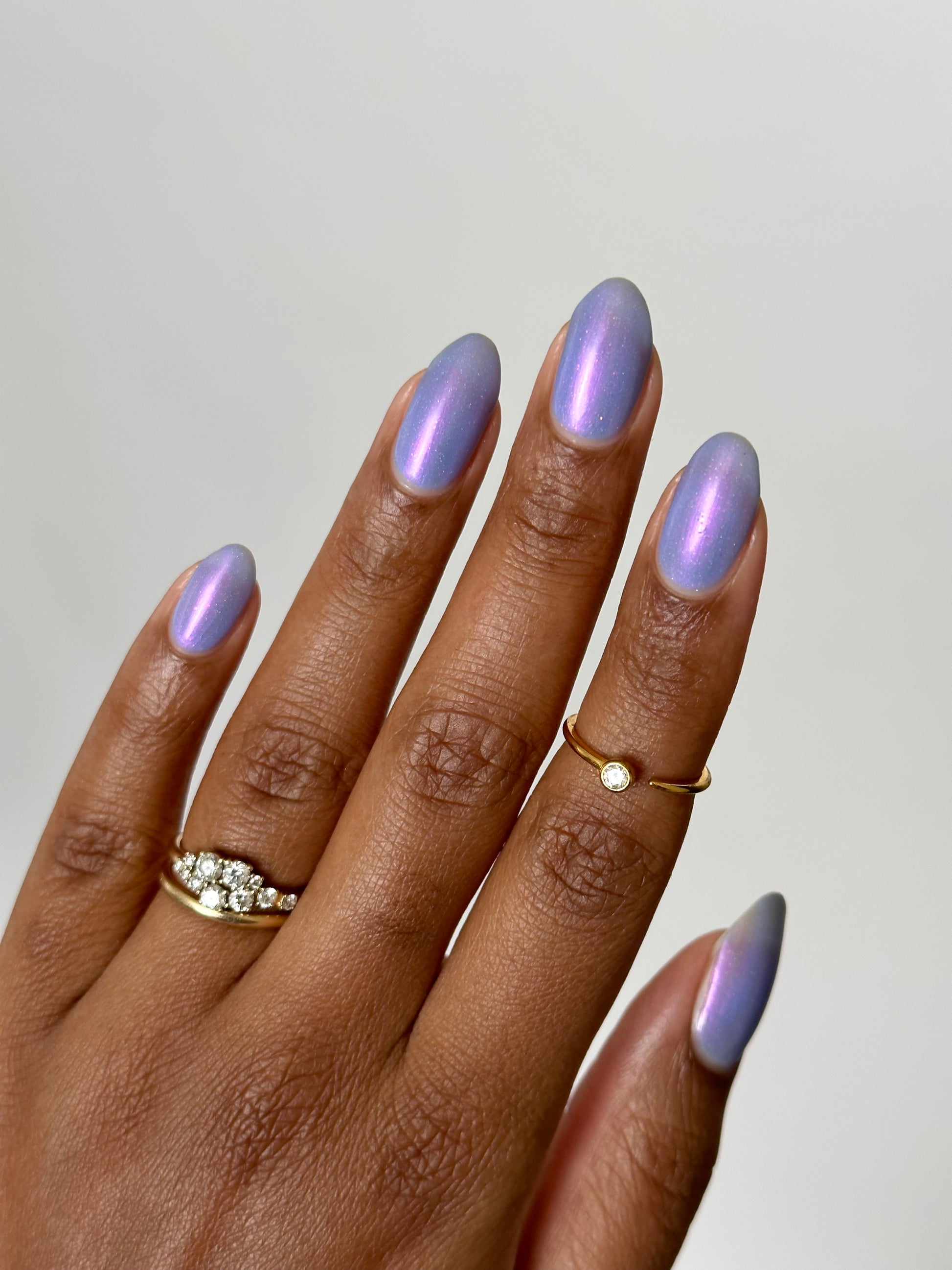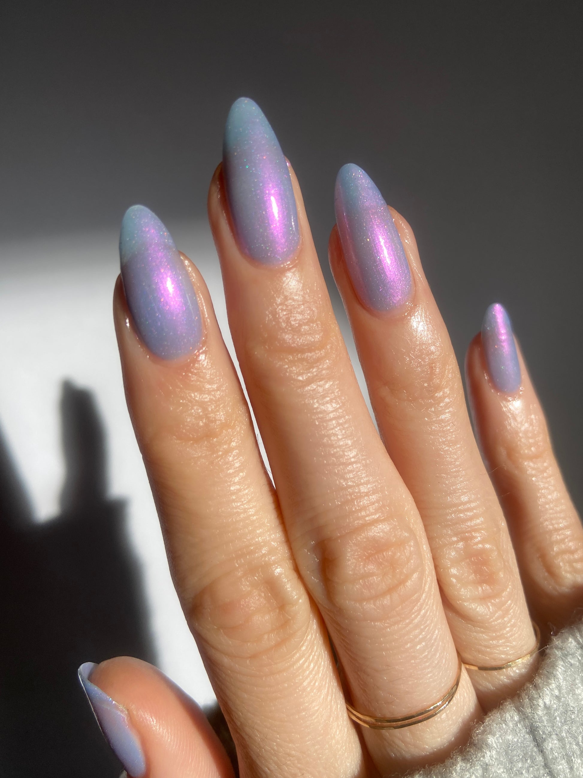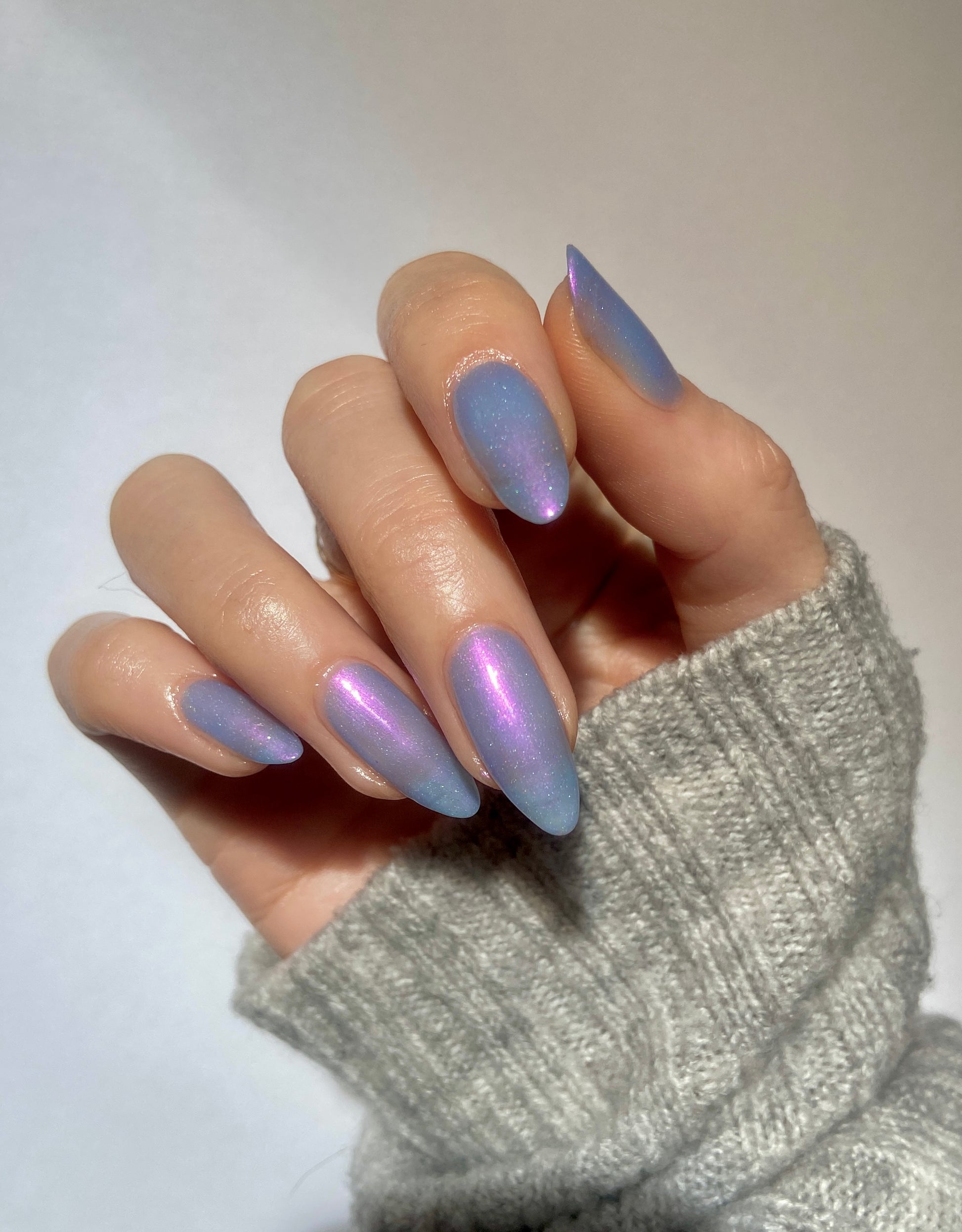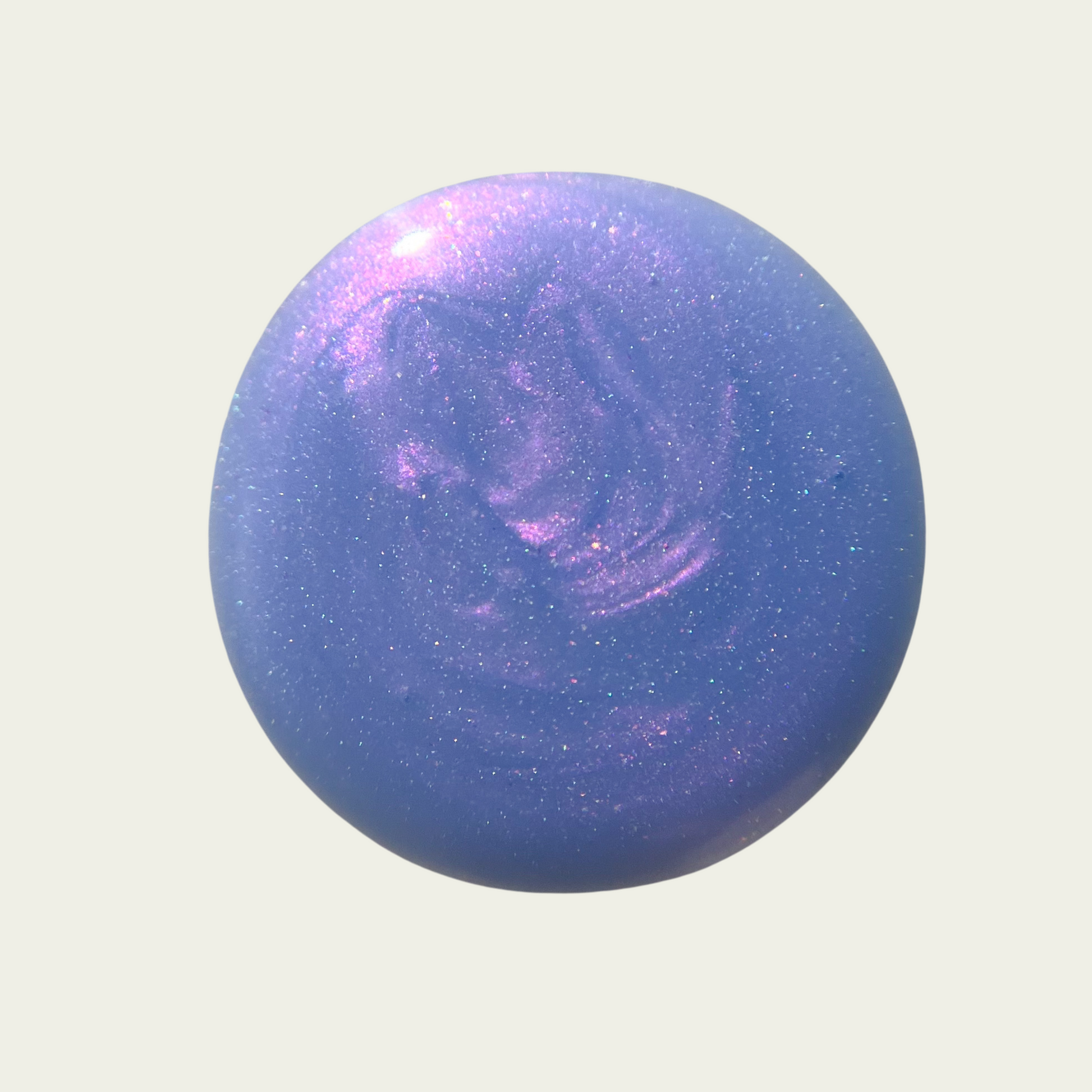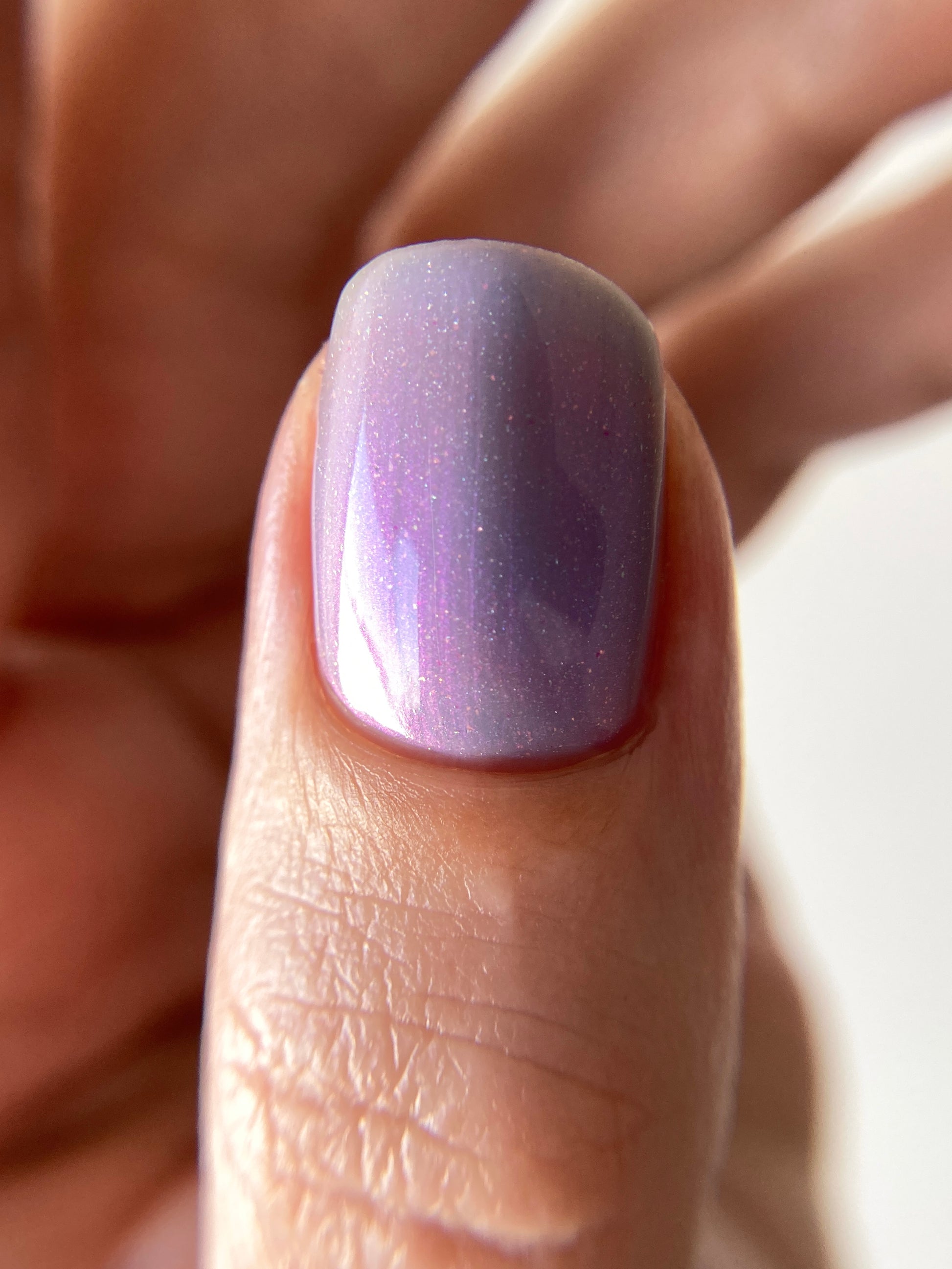 Lilac blue base with magenta shimmer, subtle rose gold glitter and a hint of scattered holo.