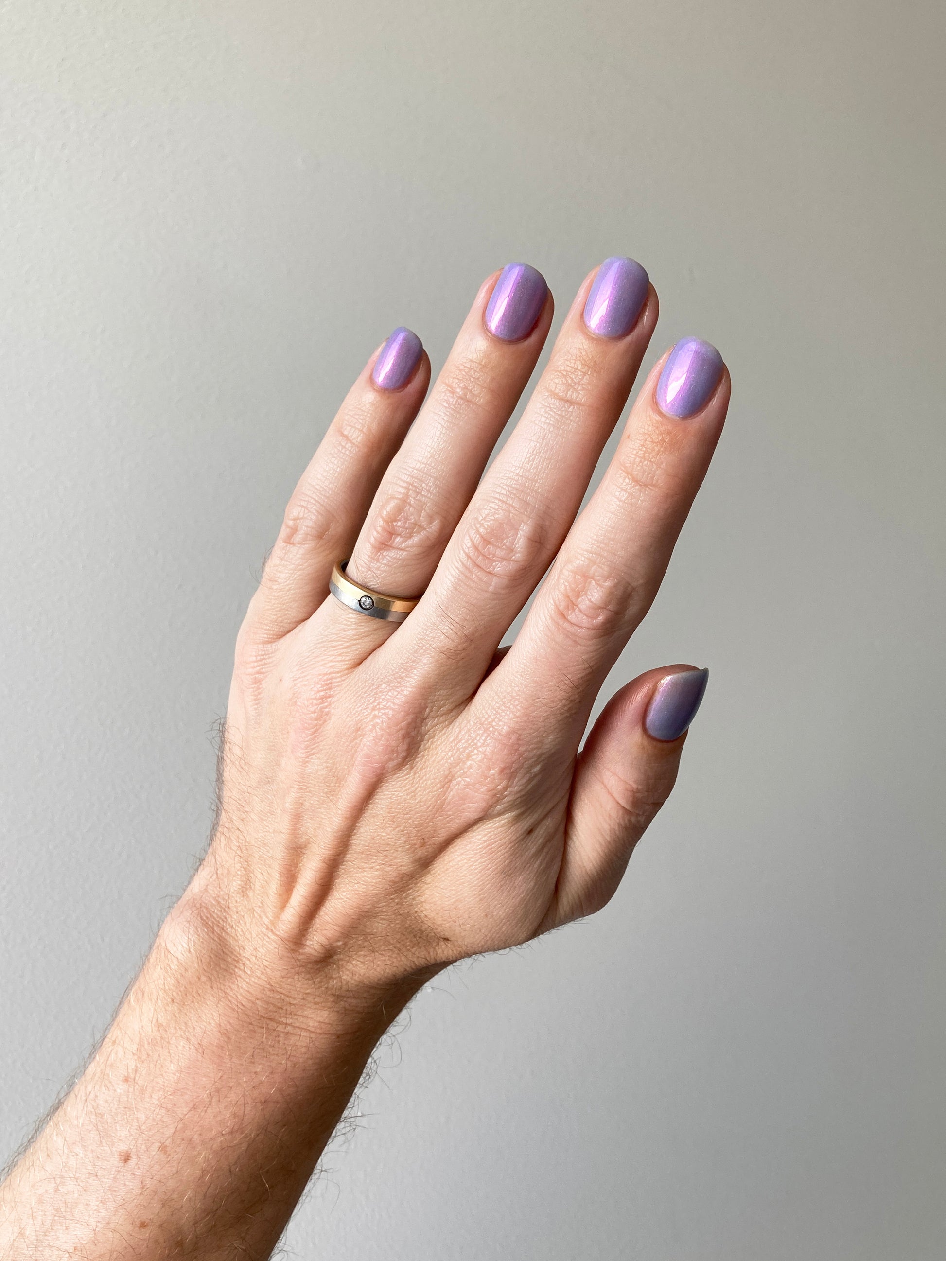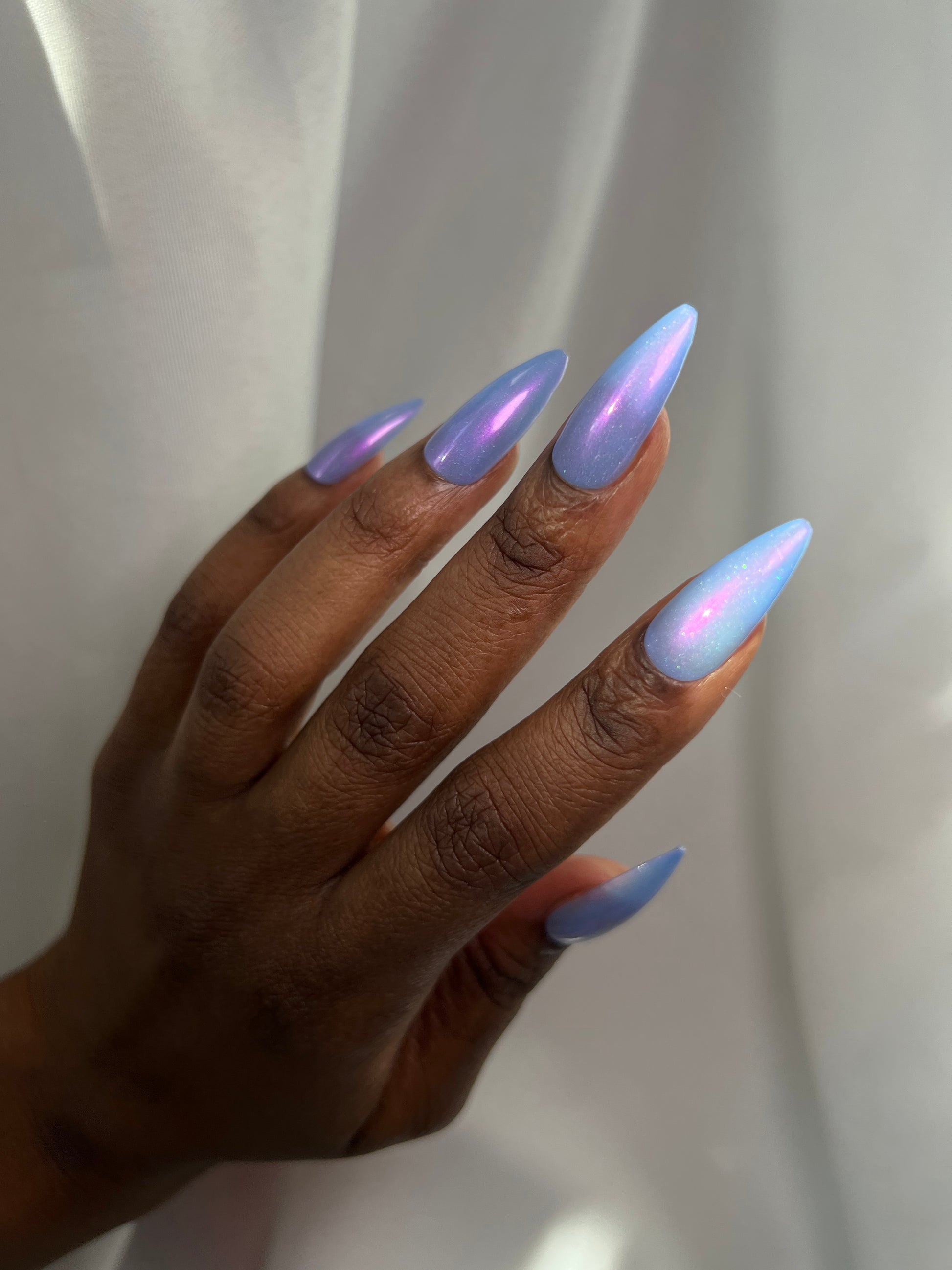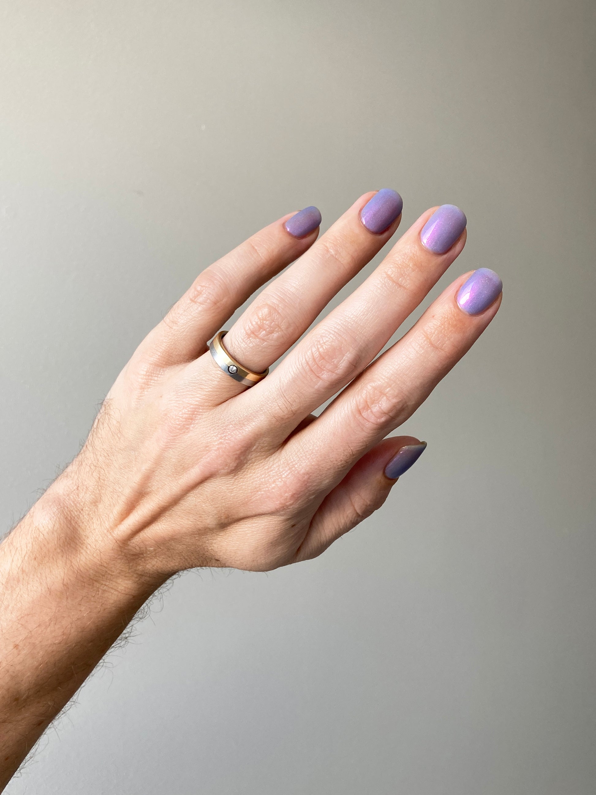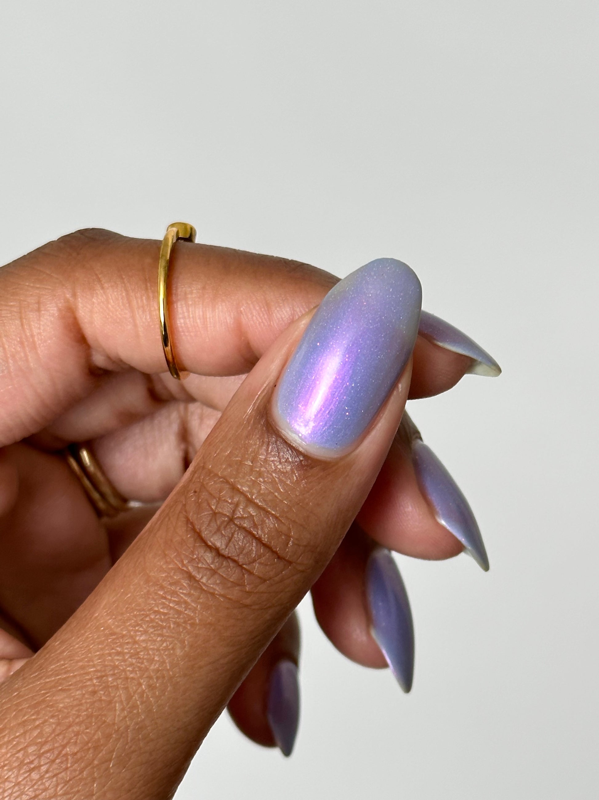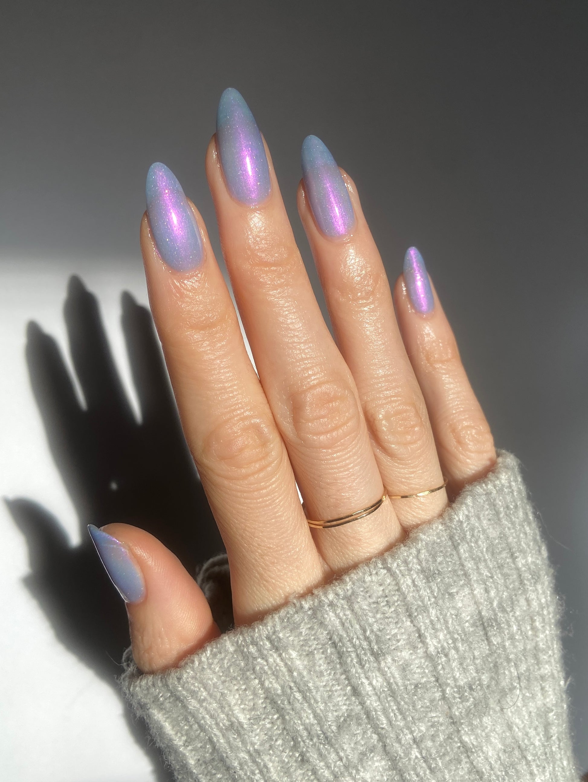 Lilac blue base with magenta shimmer, subtle rose gold glitter and a hint of scattered holo.