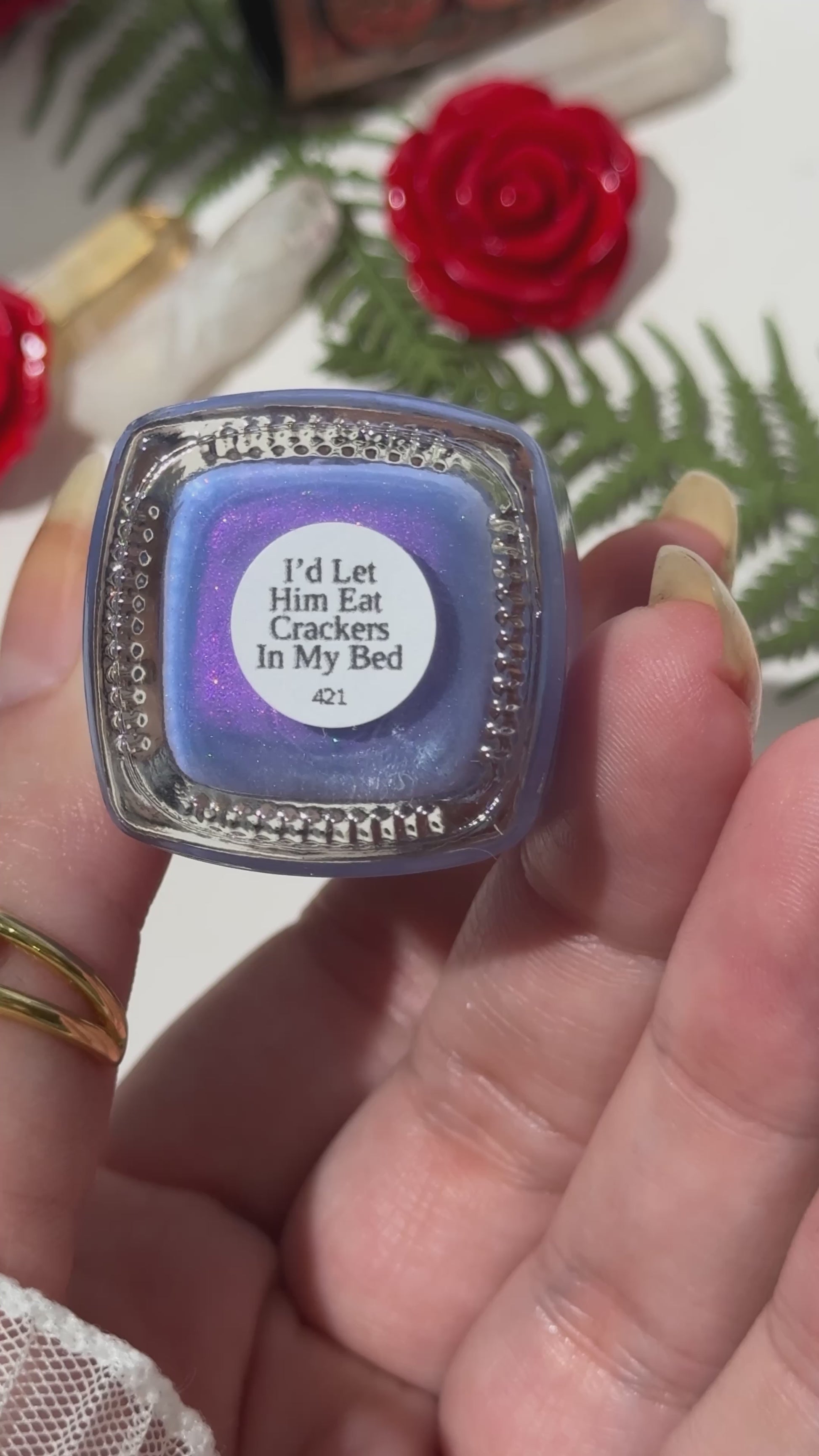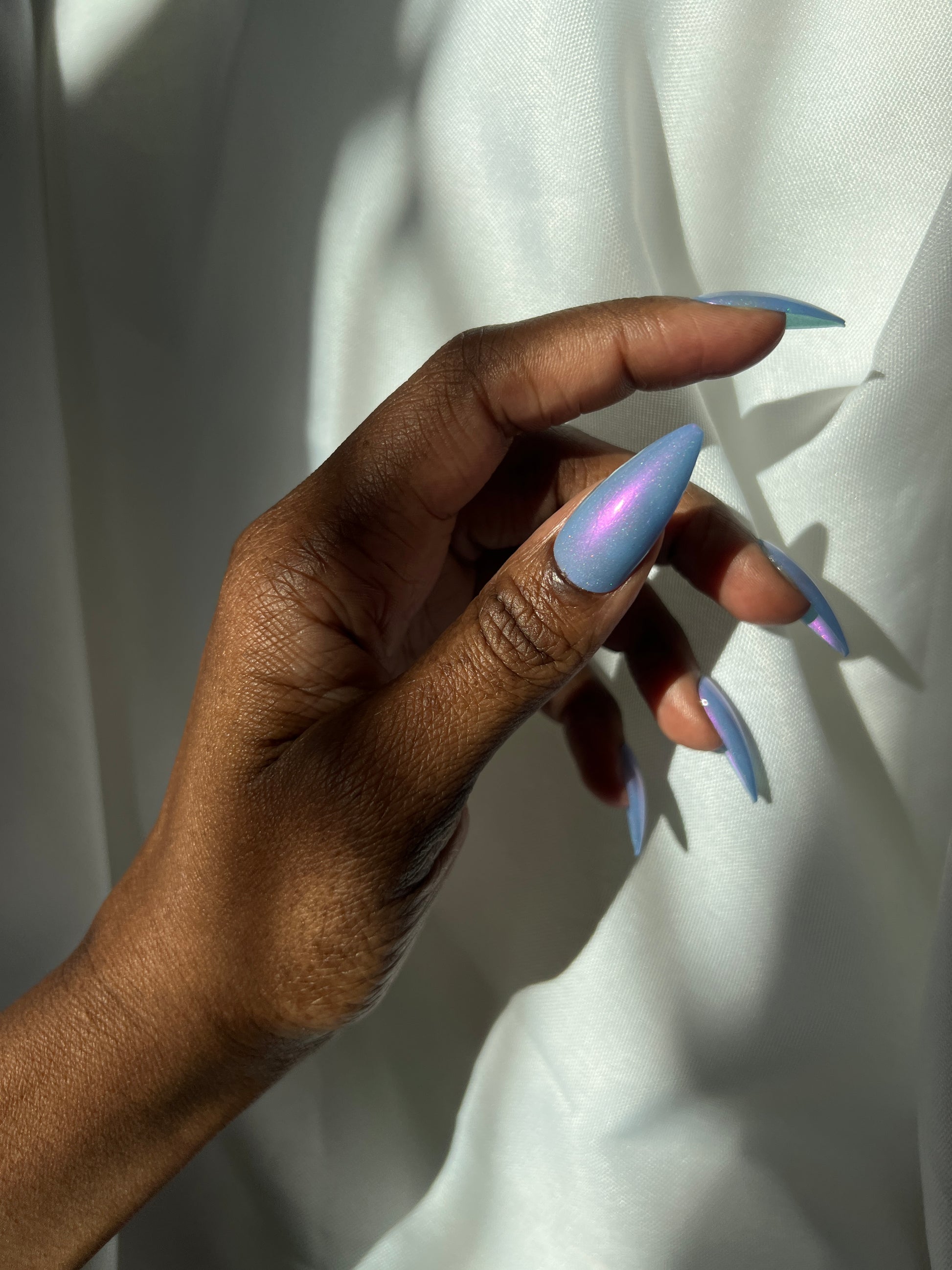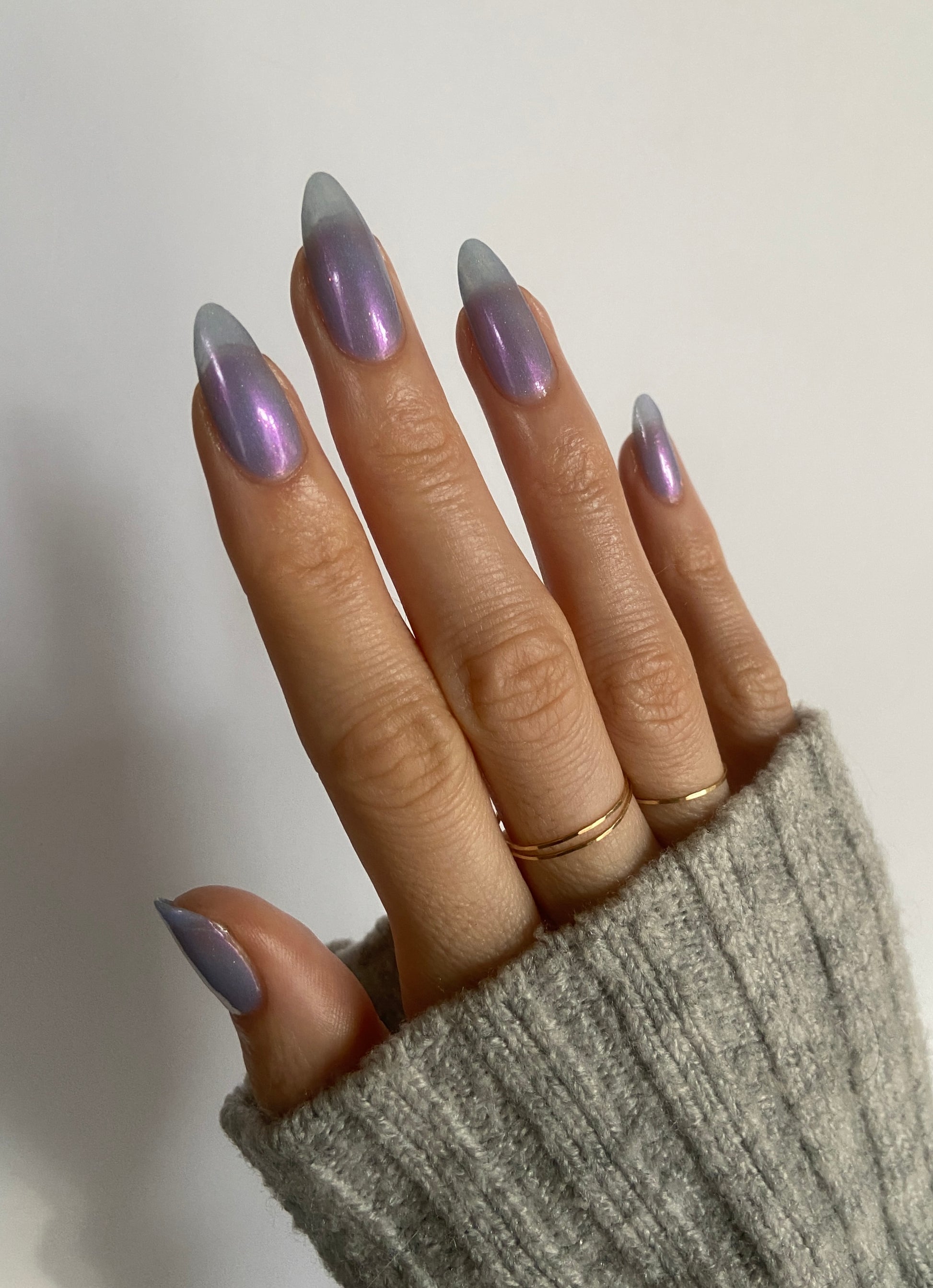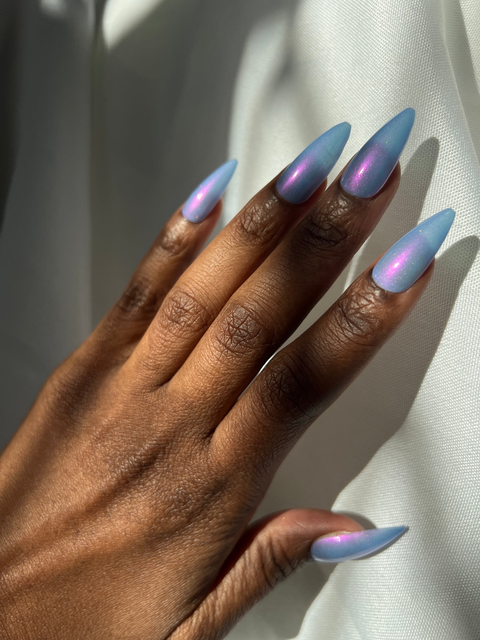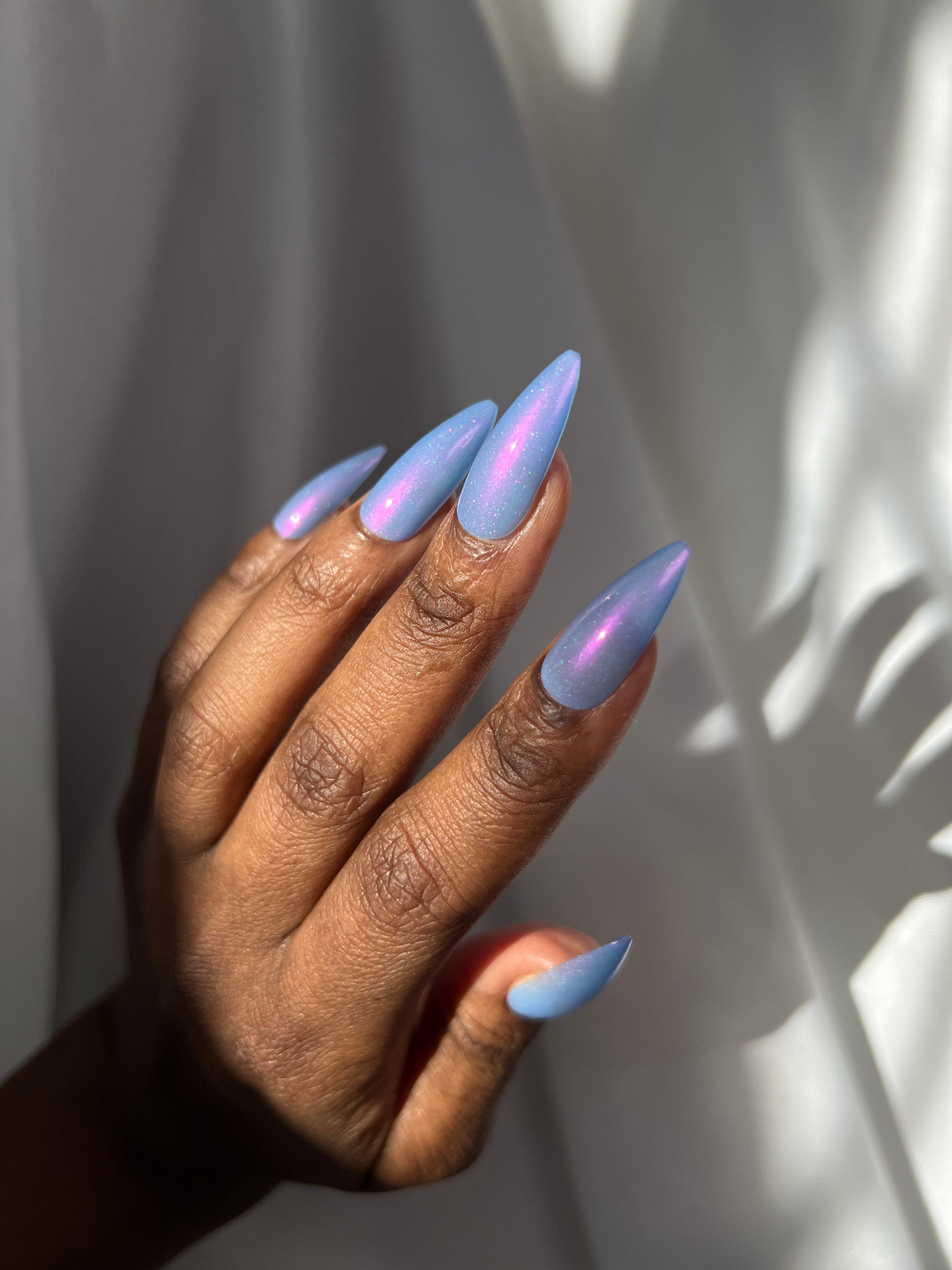 Lilac blue base with magenta shimmer, subtle rose gold glitter and a hint of scattered holo.