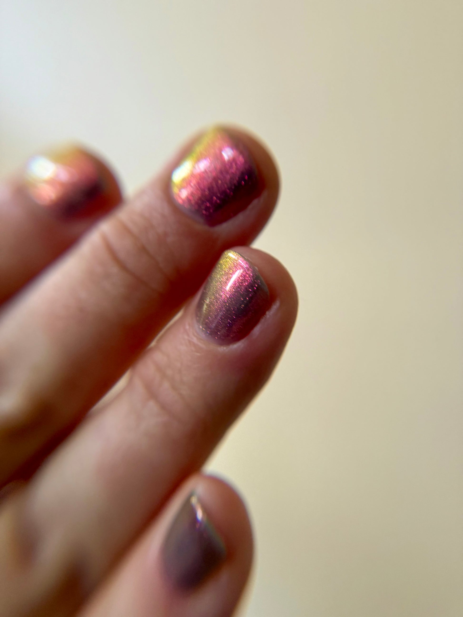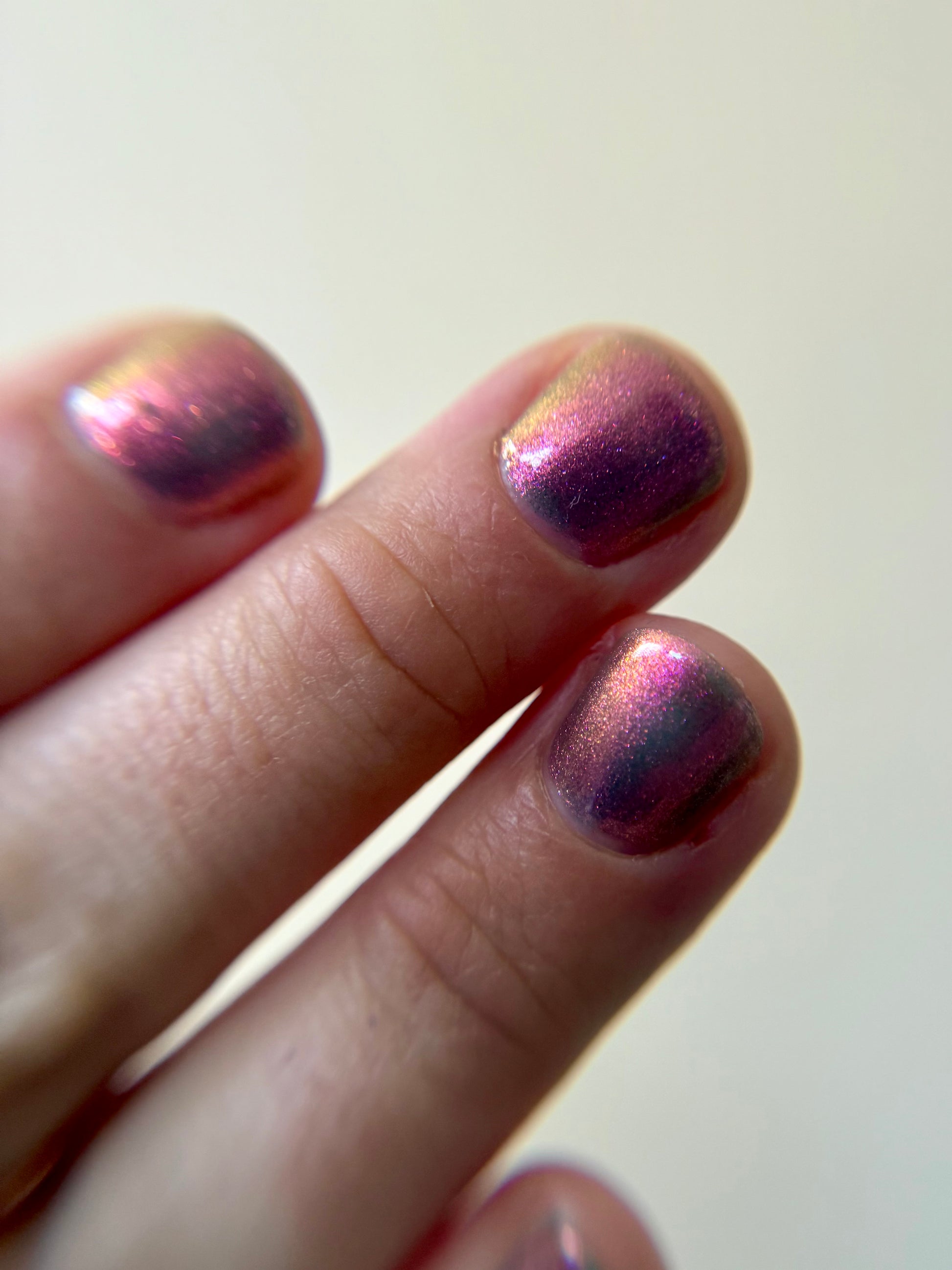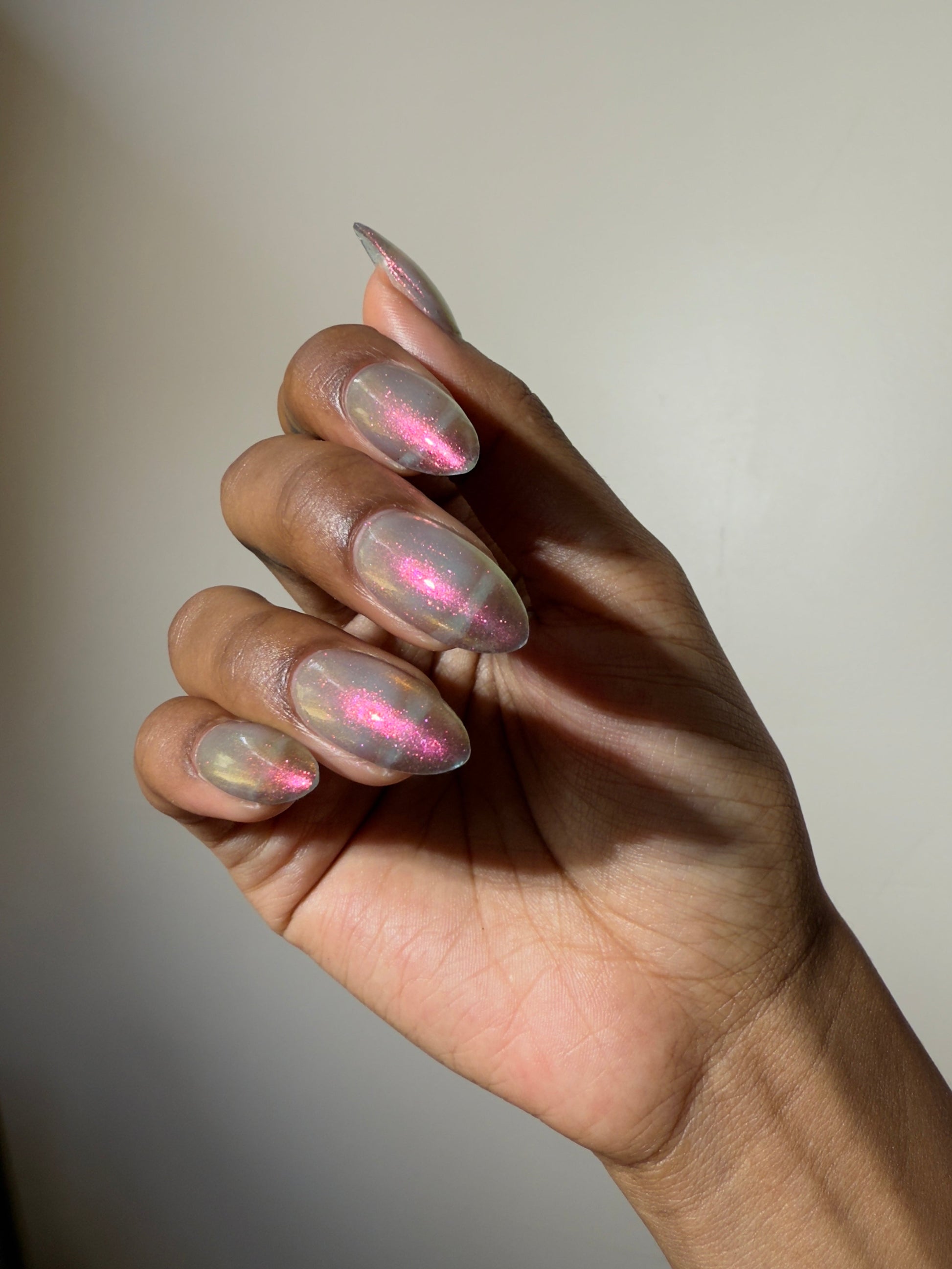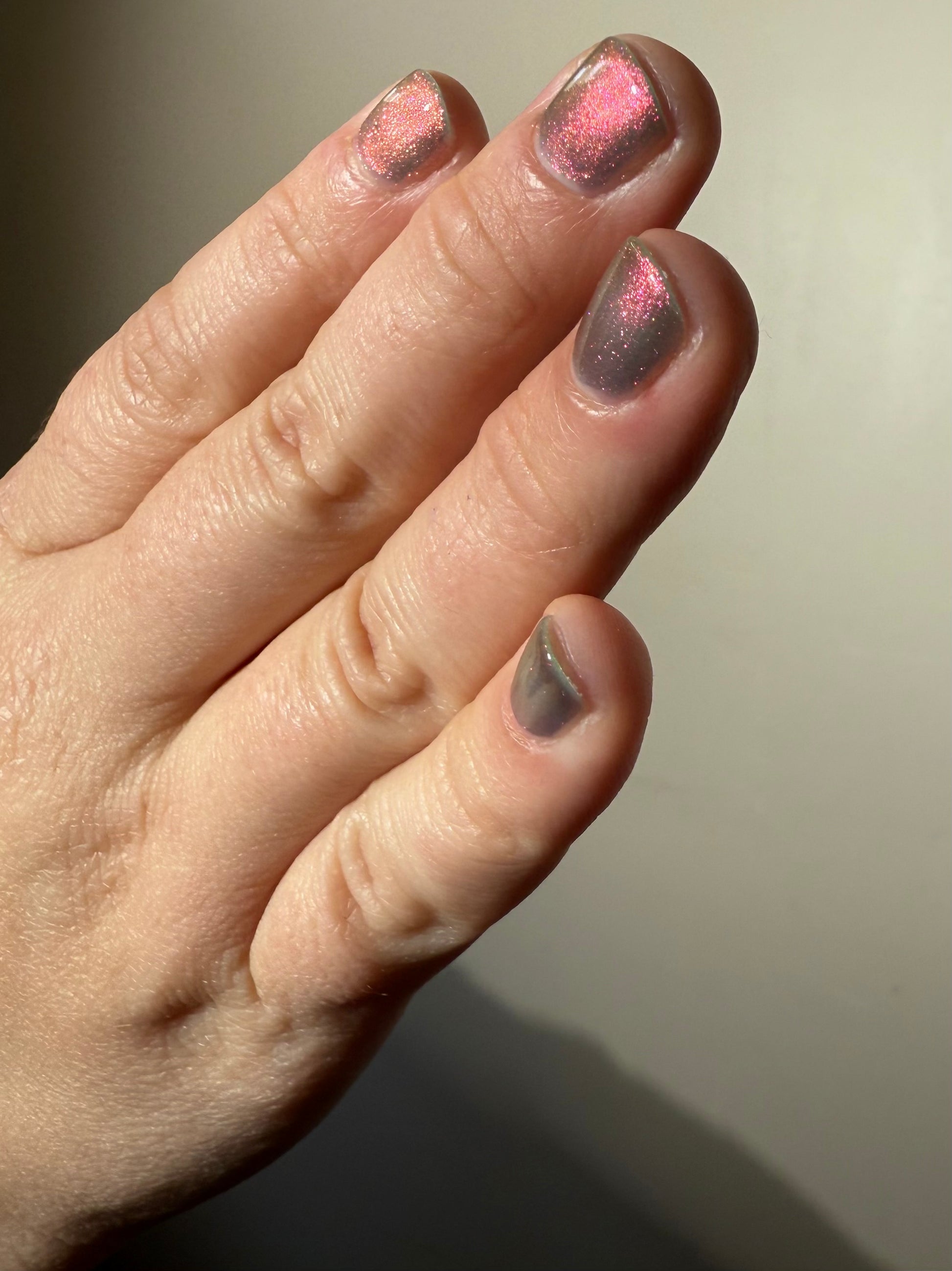 Sheer jelly taupe base with strong multichrome glow changes dramatically under different lighting. Displays bright hot pink in direct light and rose gold, copper, yellow-gold, green, with flashes of teal (at extreme angles) in in-direct light. Metallic silk.Β