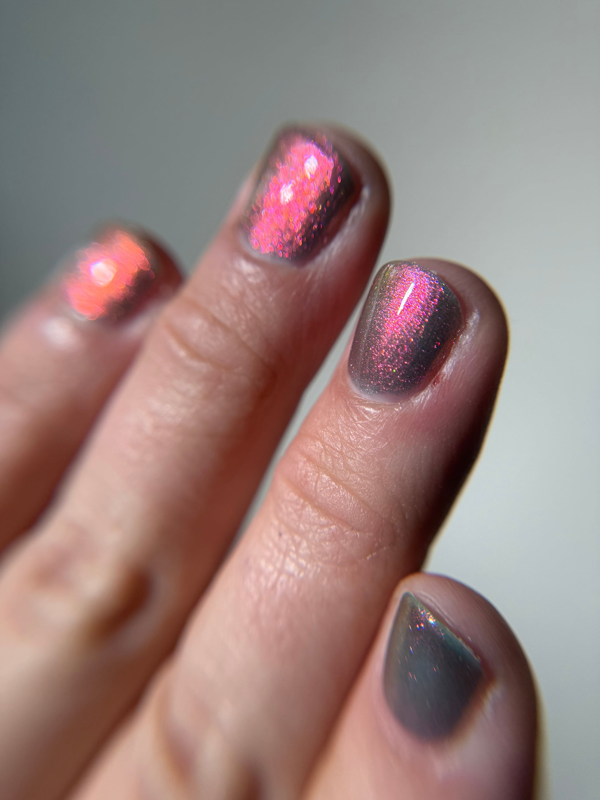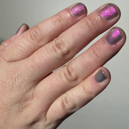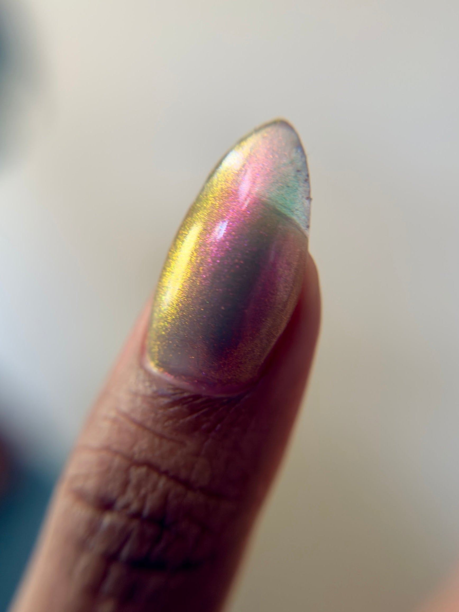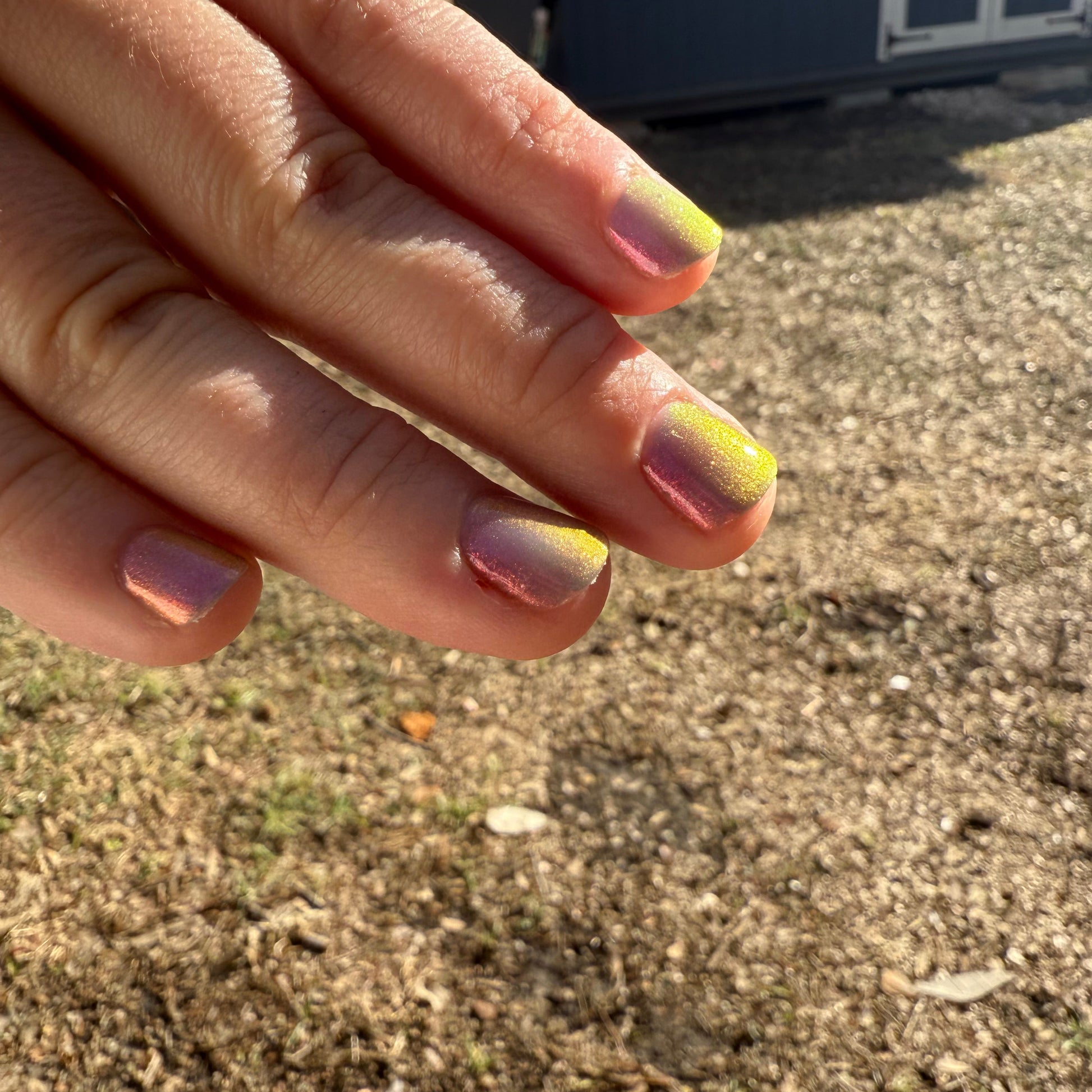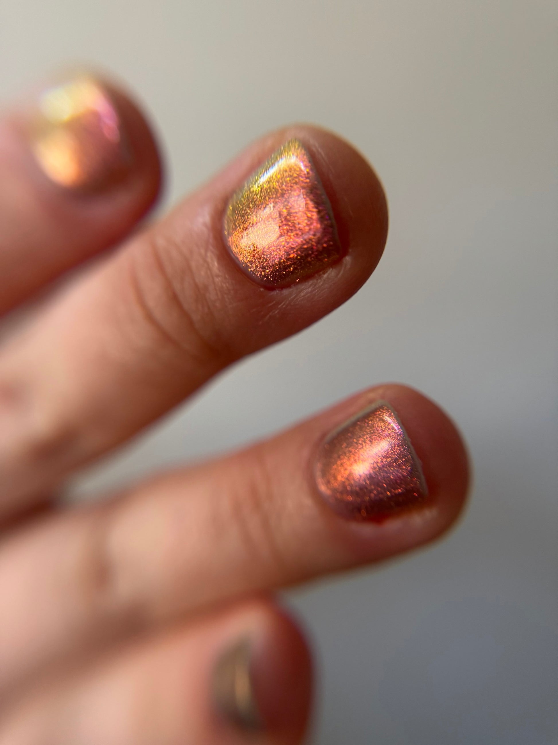 Sheer jelly taupe base with strong multichrome glow changes dramatically under different lighting. Displays bright hot pink in direct light and rose gold, copper, yellow-gold, green, with flashes of teal (at extreme angles) in in-direct light. Metallic silk.Β