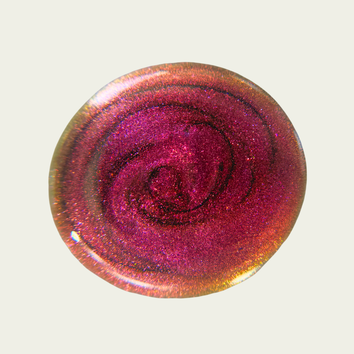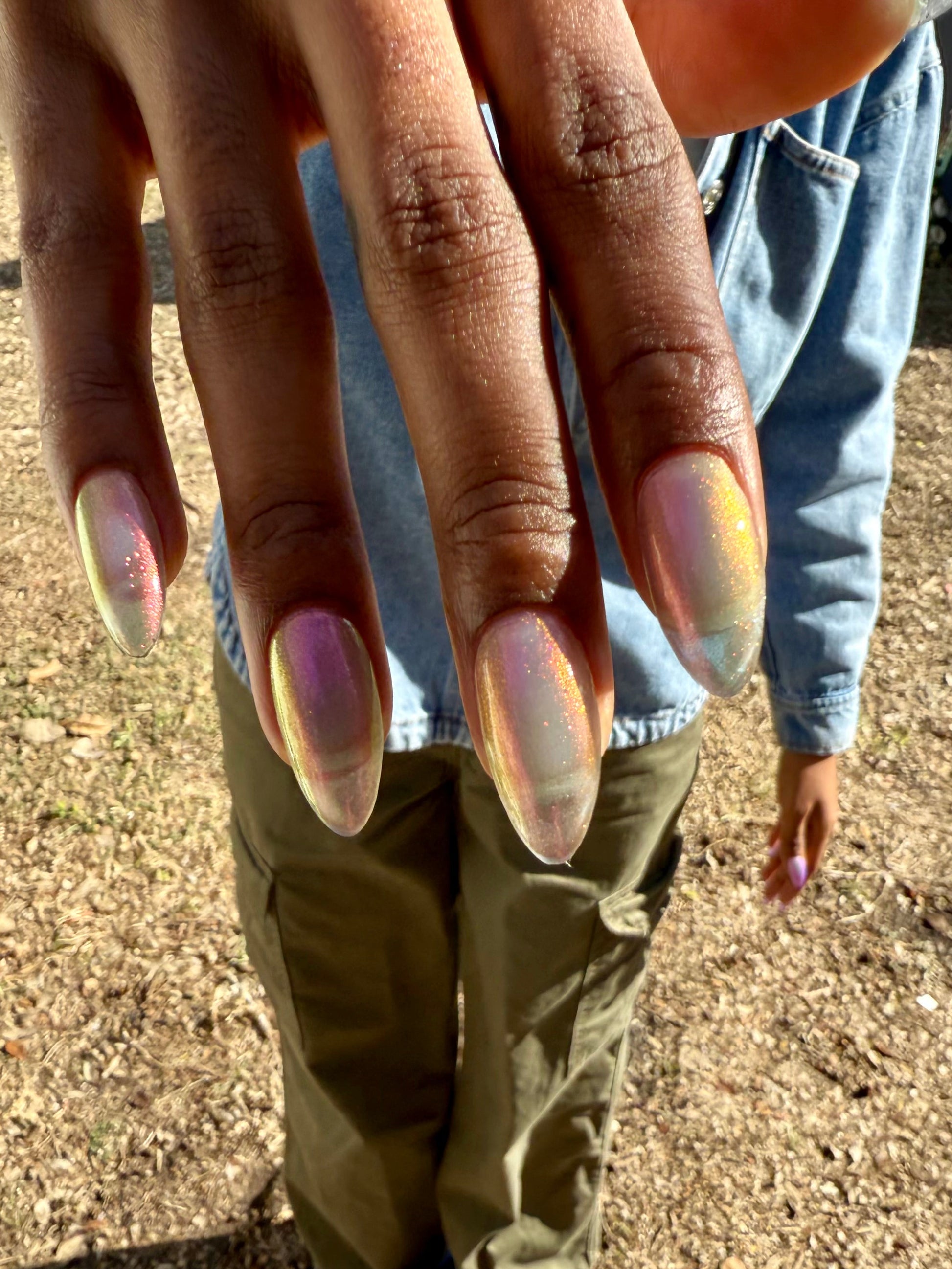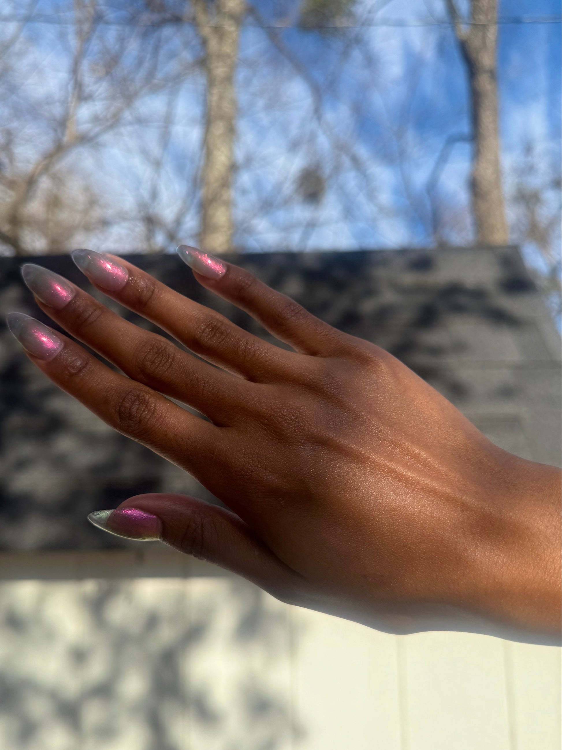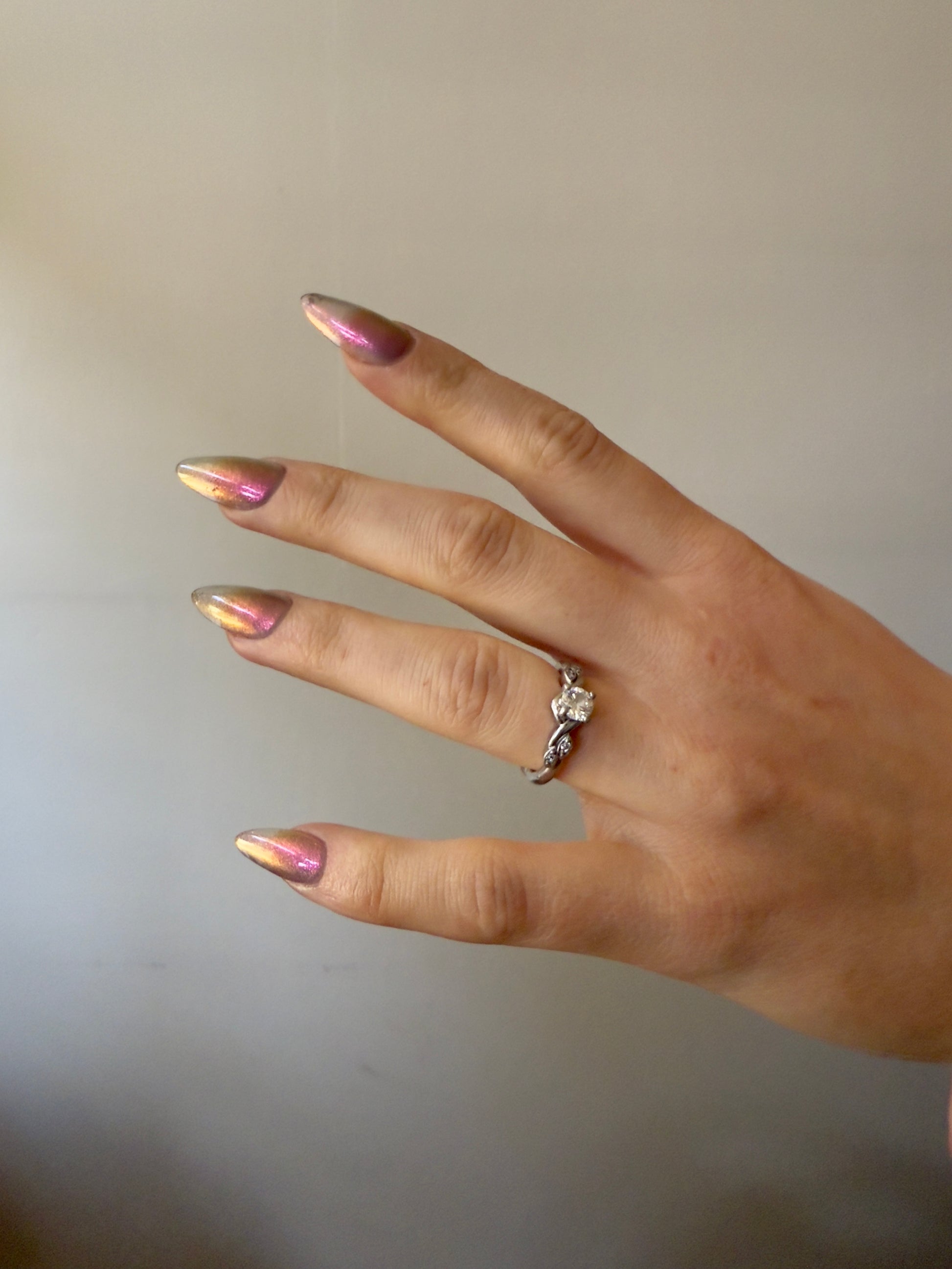 Sheer jelly taupe base with strong multichrome glow changes dramatically under different lighting. Displays bright hot pink in direct light and rose gold, copper, yellow-gold, green, with flashes of teal (at extreme angles) in in-direct light. Metallic silk.Β