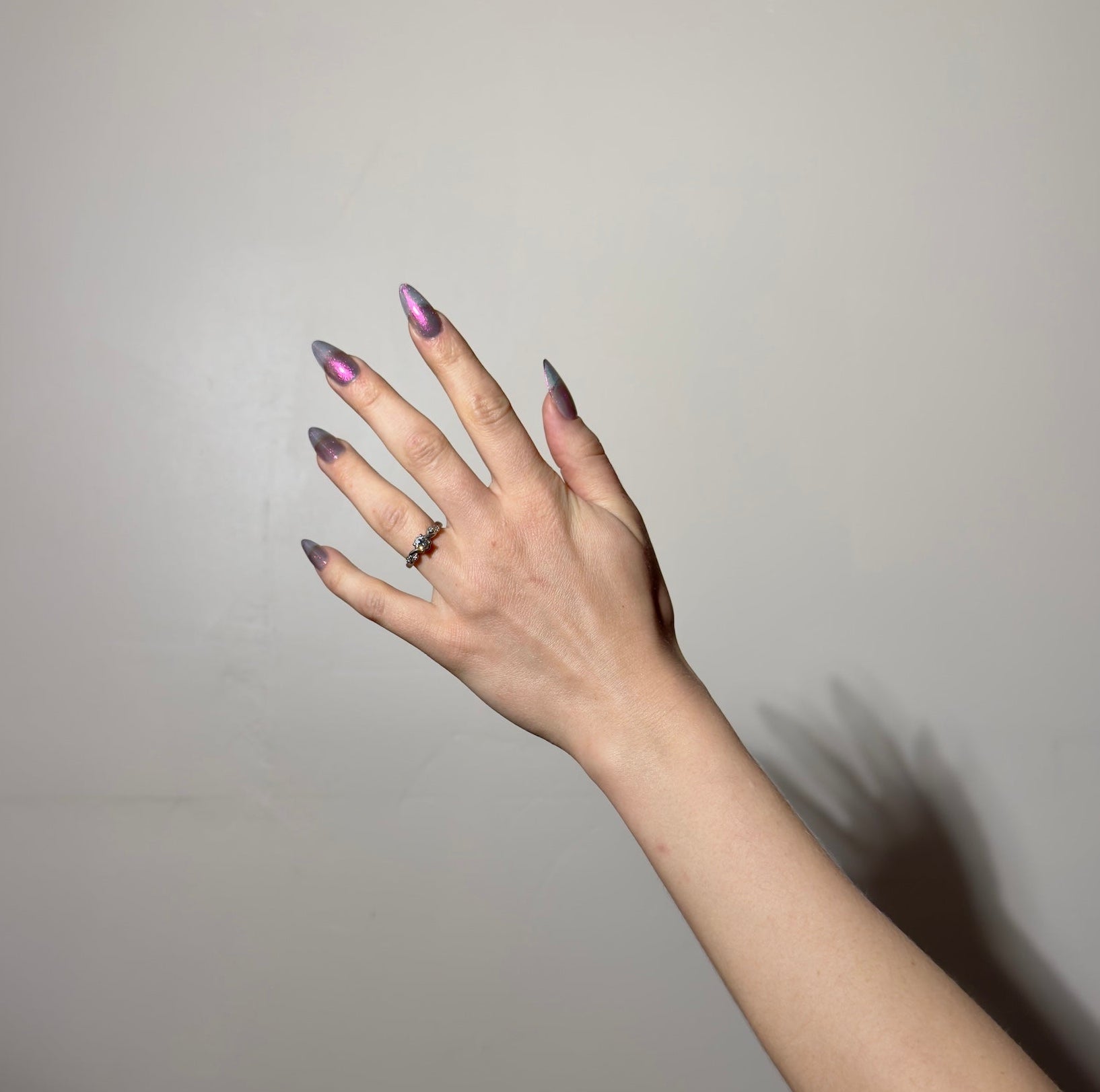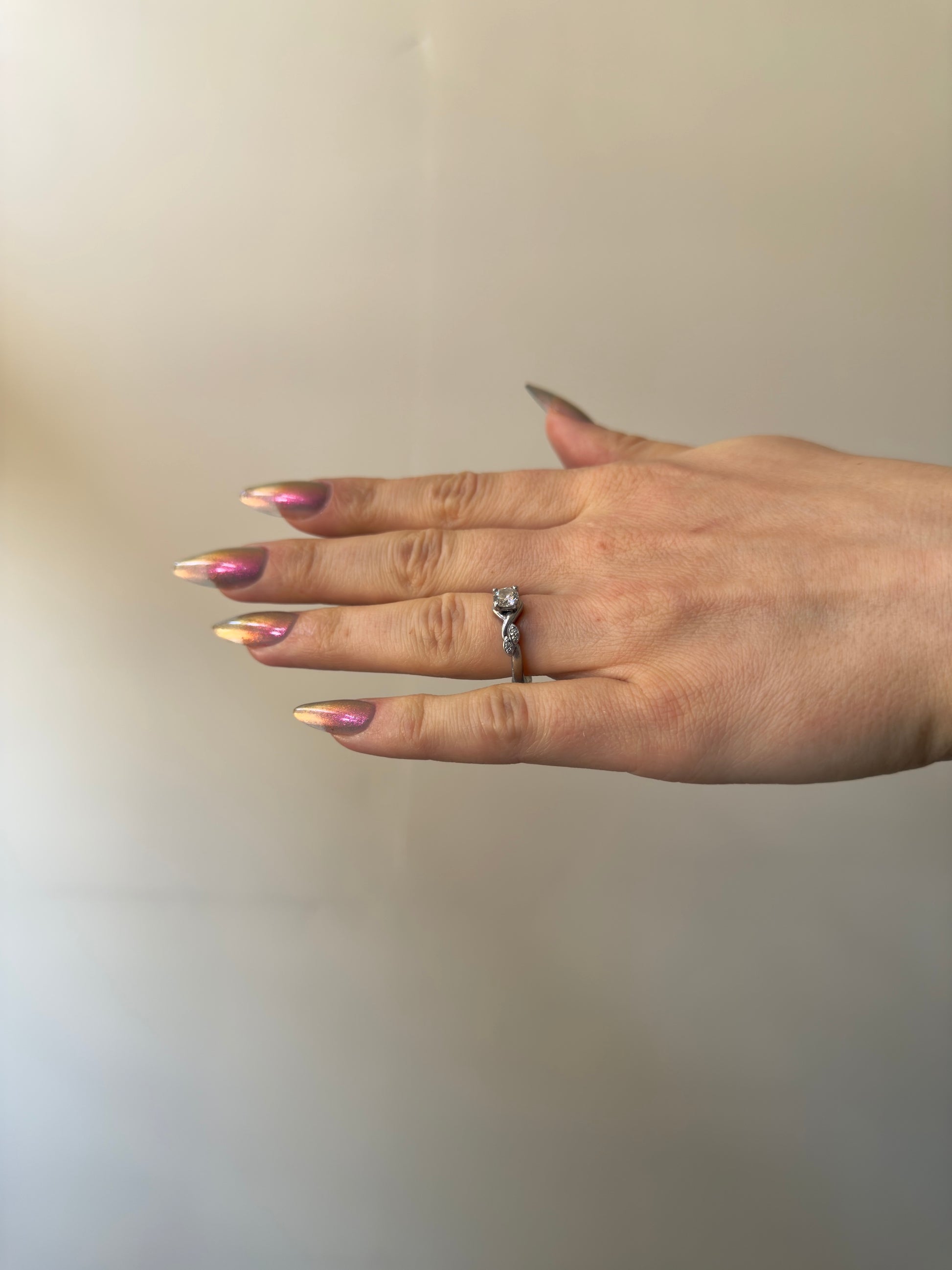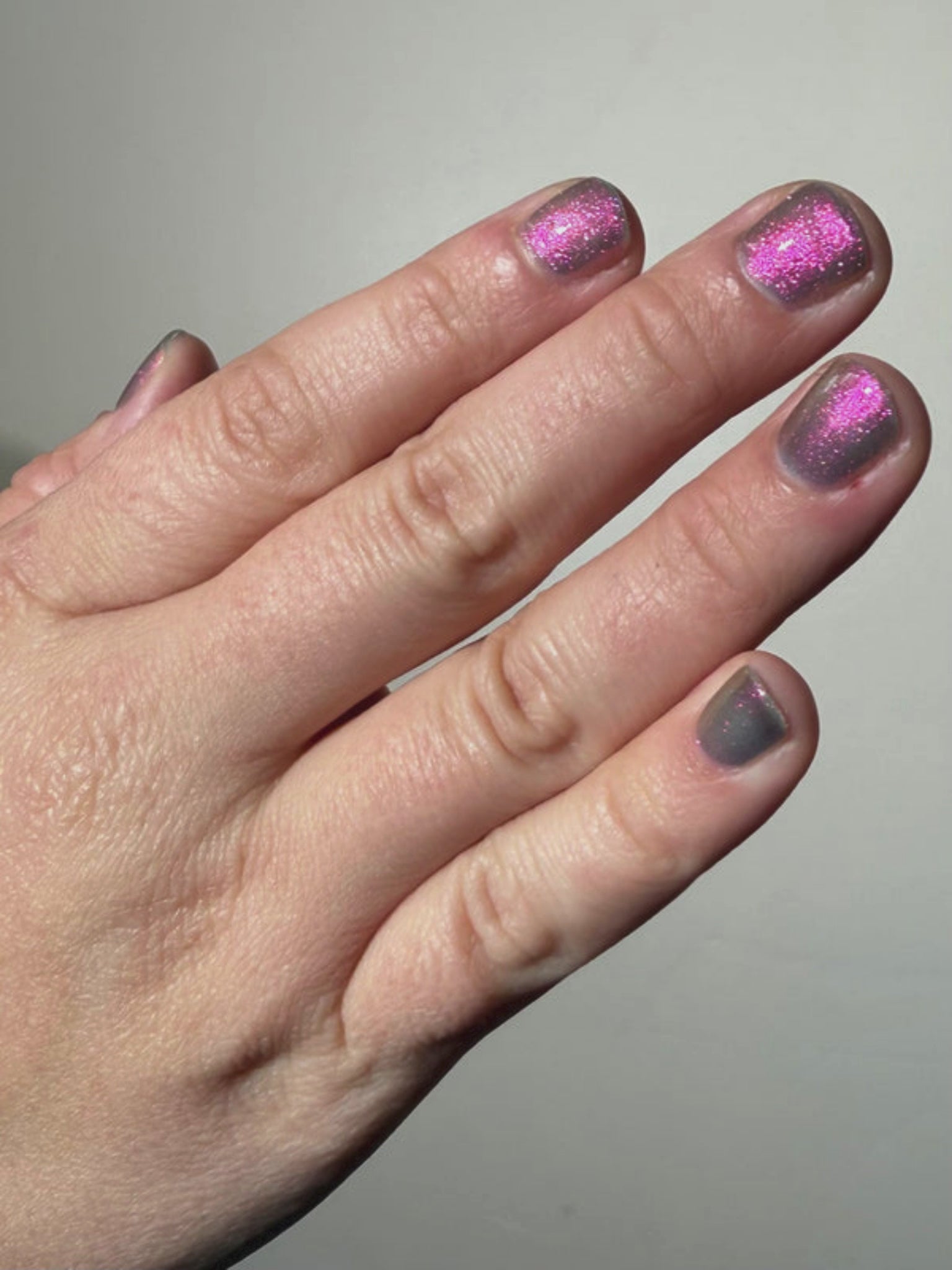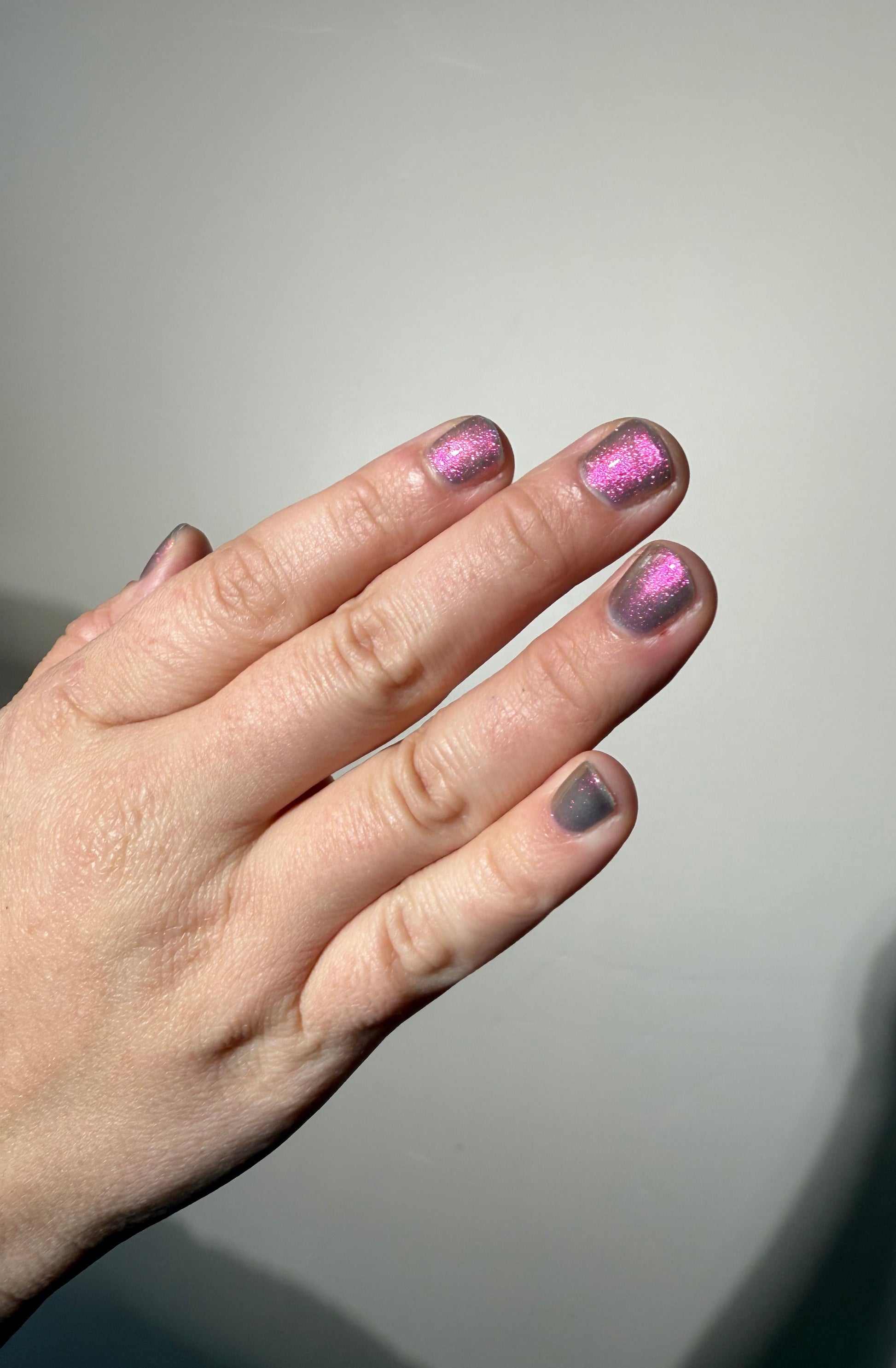 Sheer jelly taupe base with strong multichrome glow changes dramatically under different lighting. Displays bright hot pink in direct light and rose gold, copper, yellow-gold, green, with flashes of teal (at extreme angles) in in-direct light. Metallic silk.Β