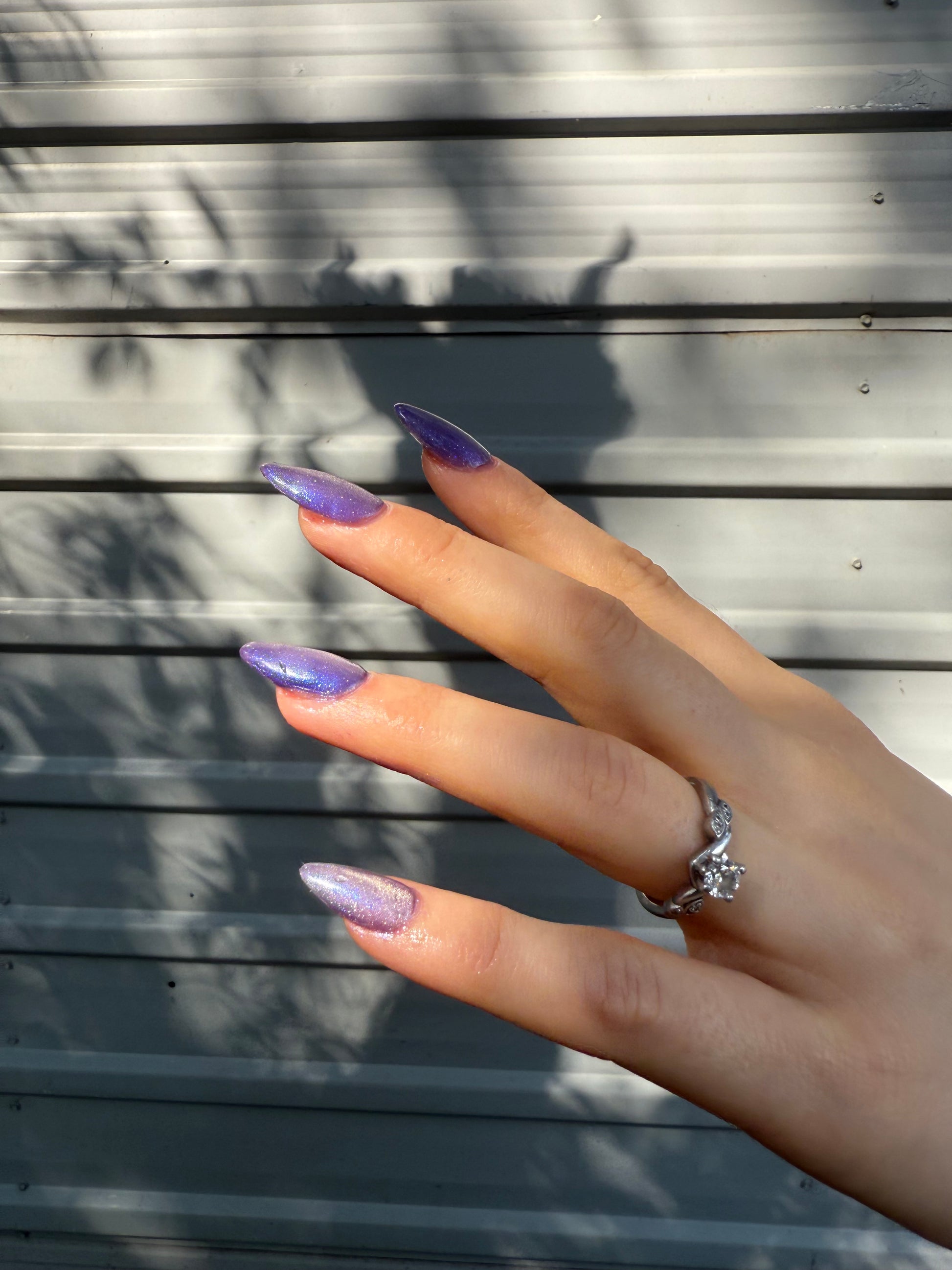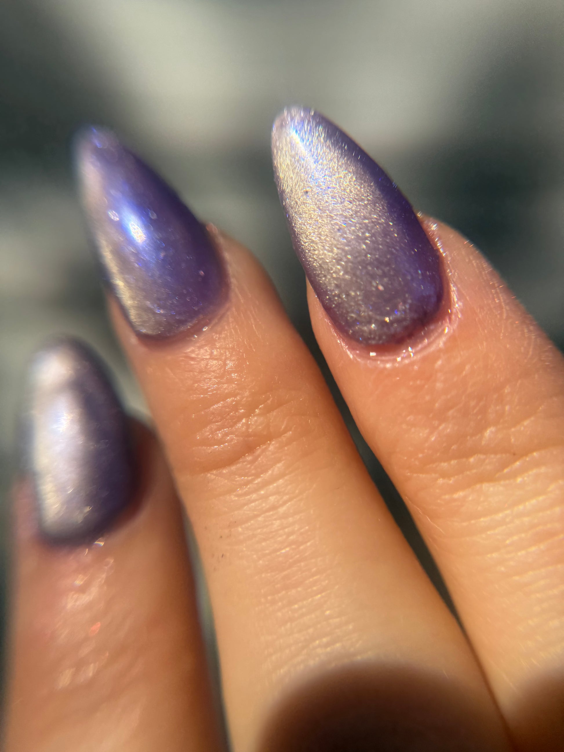 -Cold magnetized - Silvery shell pink magnetic strip cuts through an iris purple base with space-like blue/purple iridescent shimmer scattered throughout.