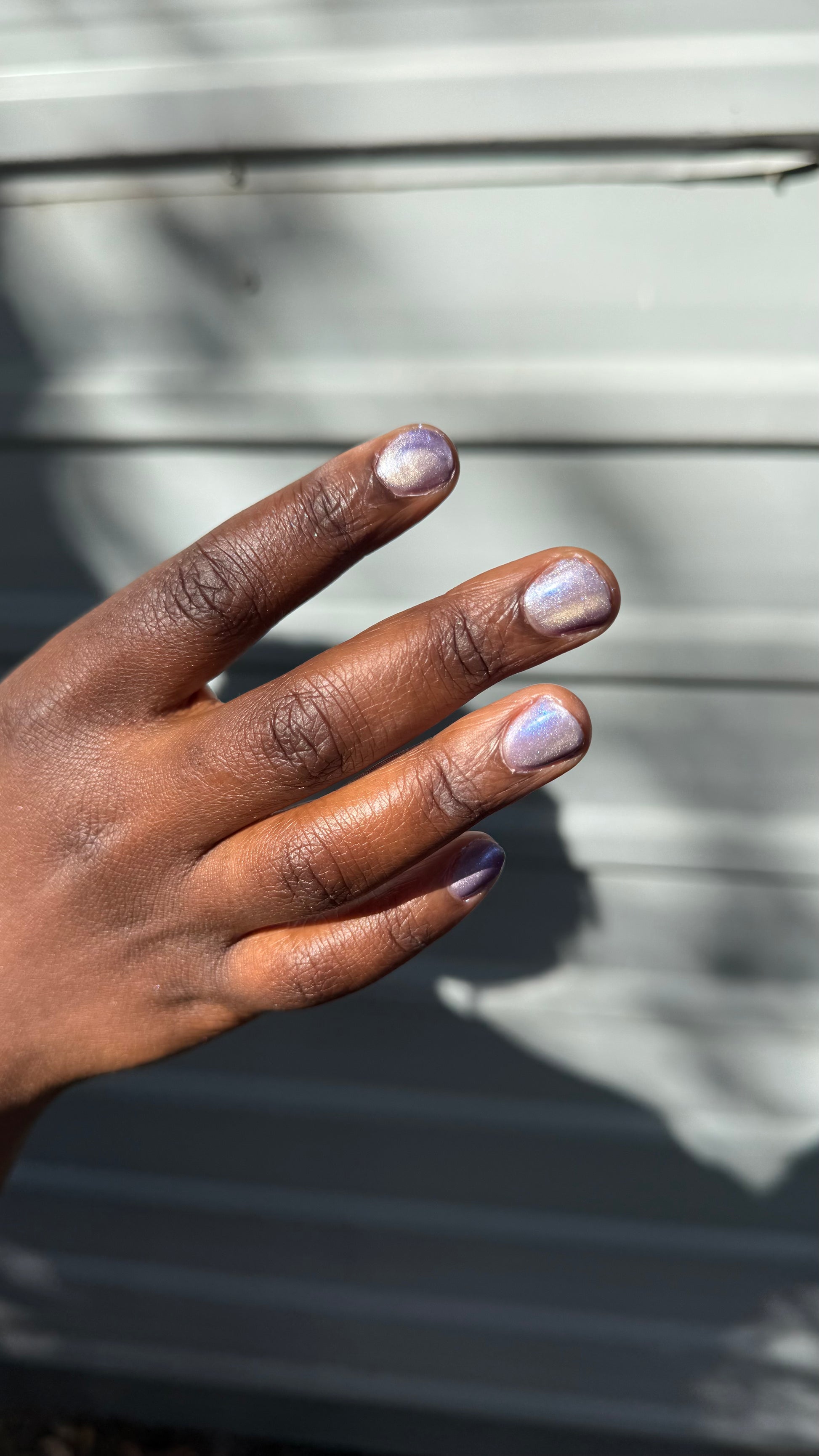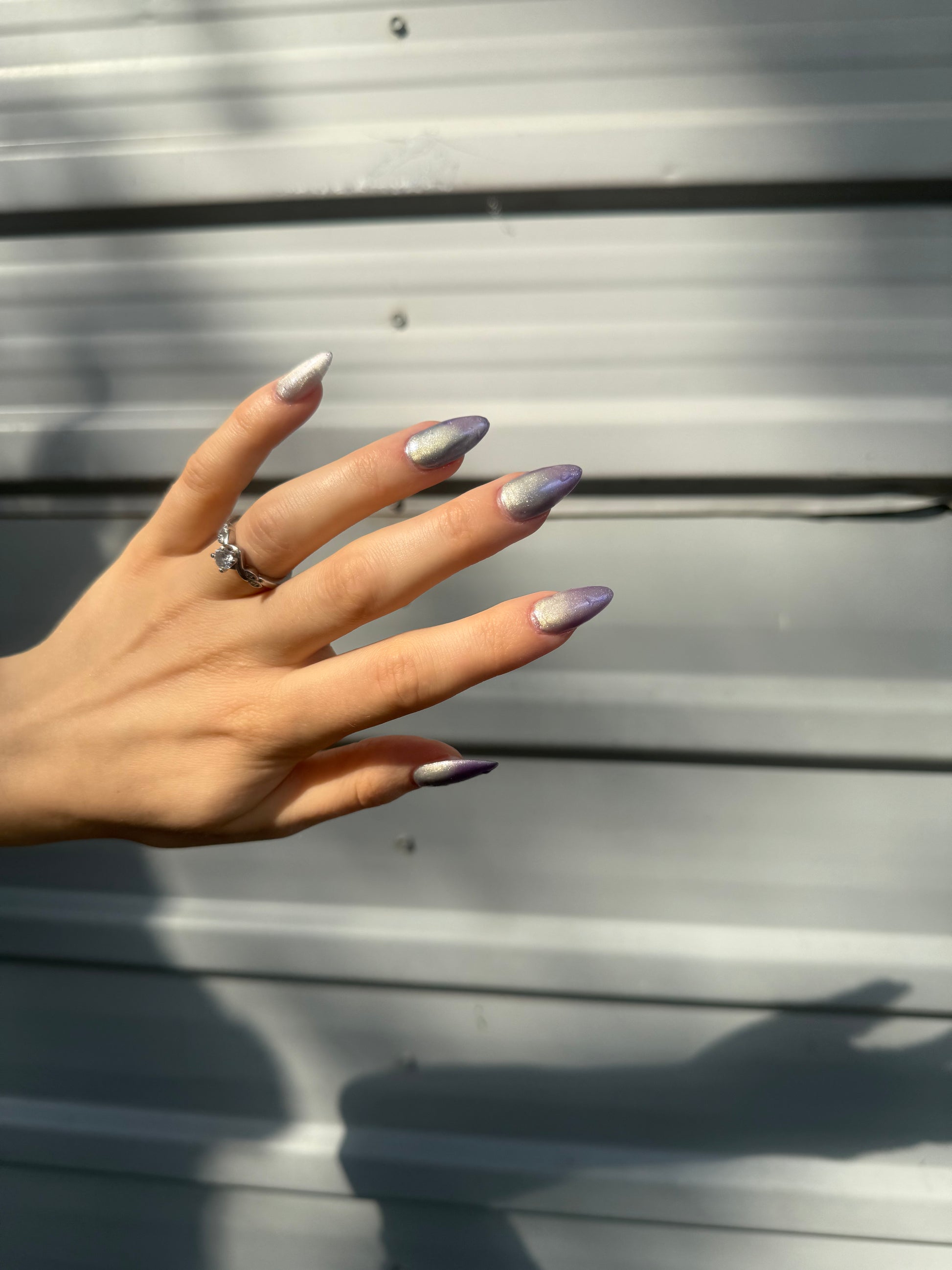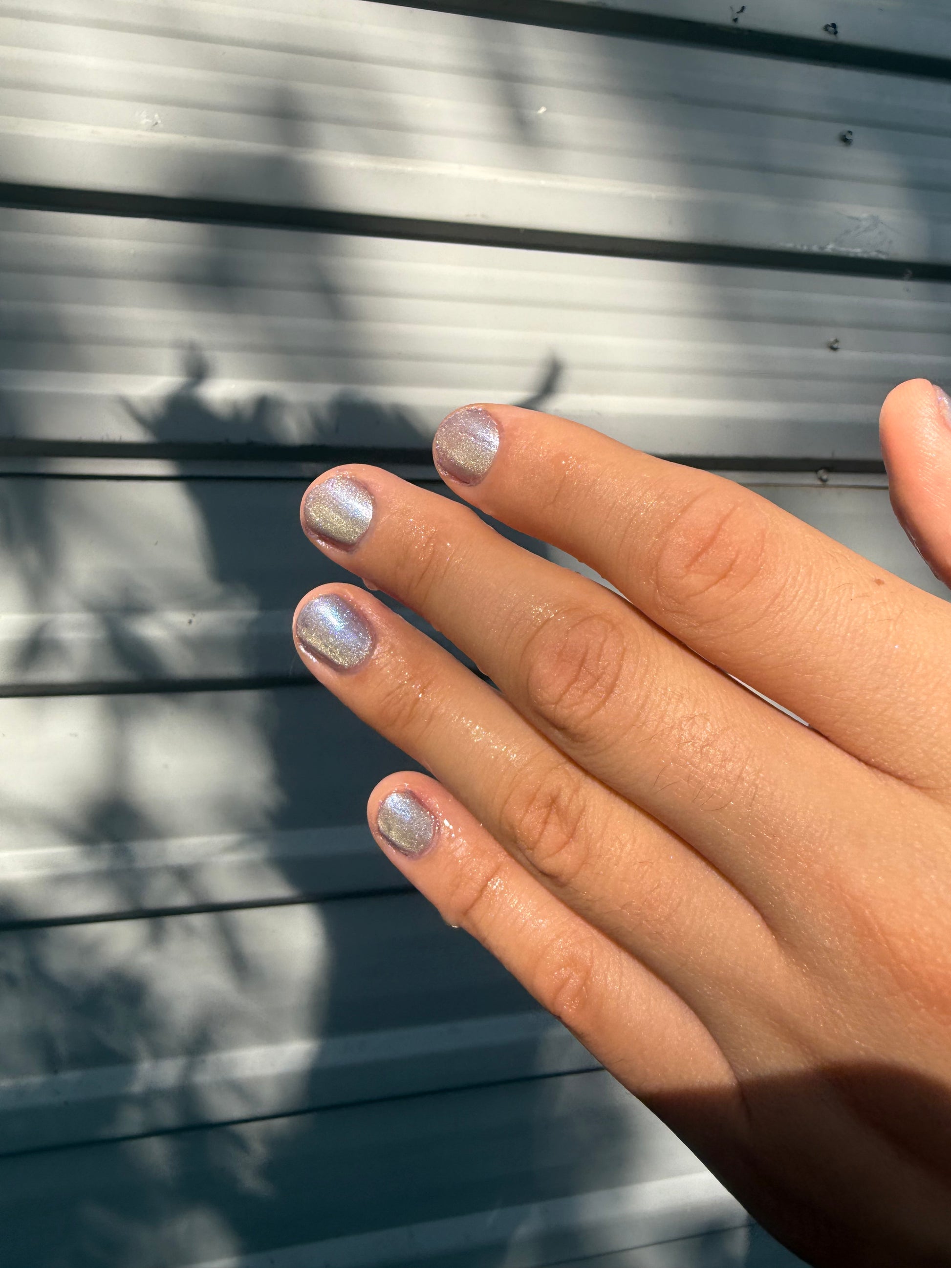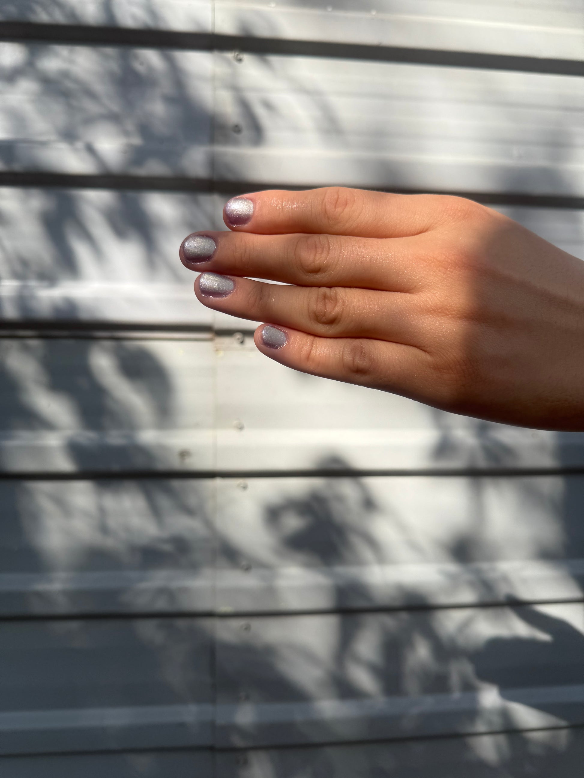 -Hot magnetized - The iris purple base becomes pale silver-lilac and the magnetized strip looks bright champagne-pink.