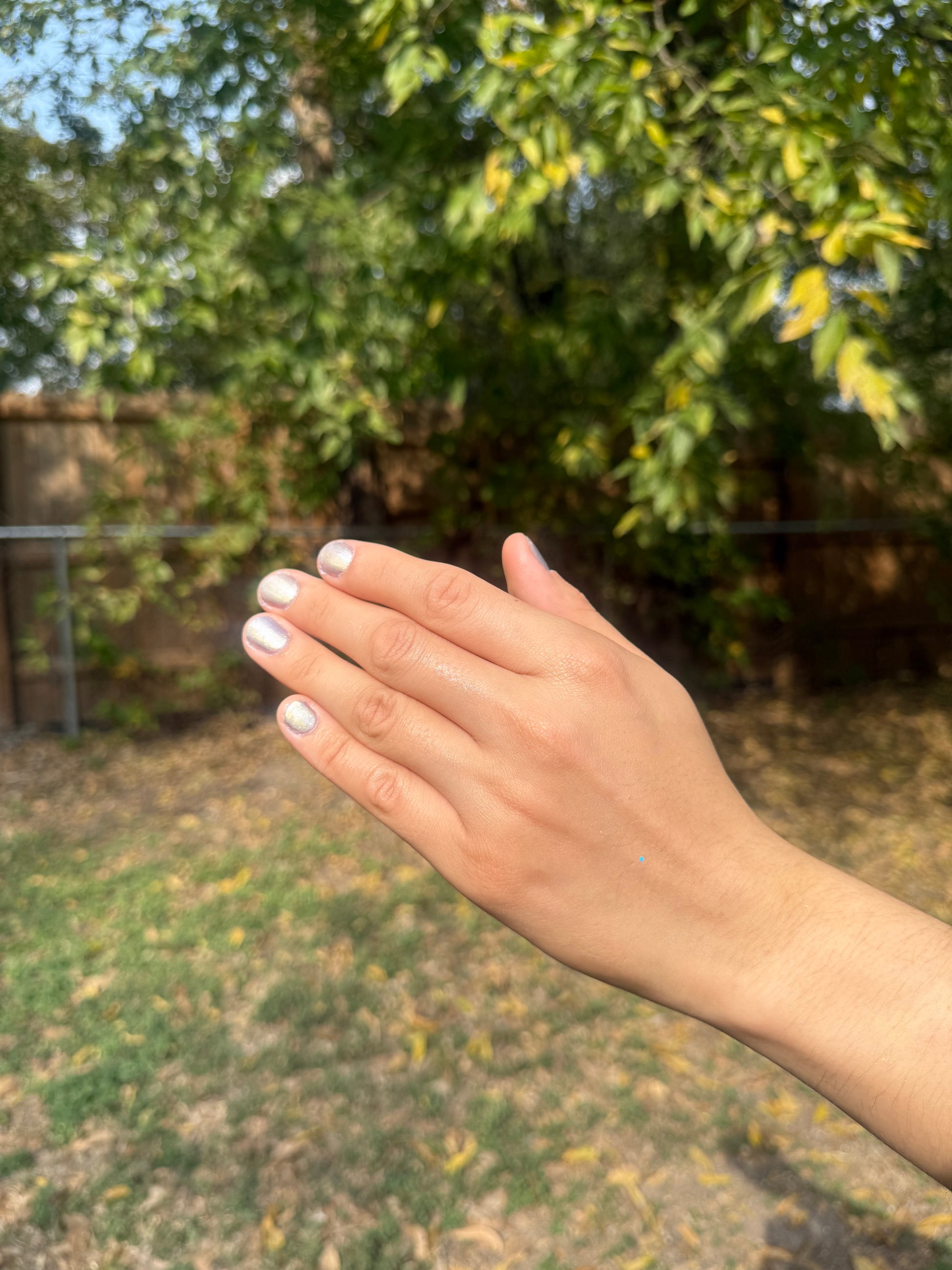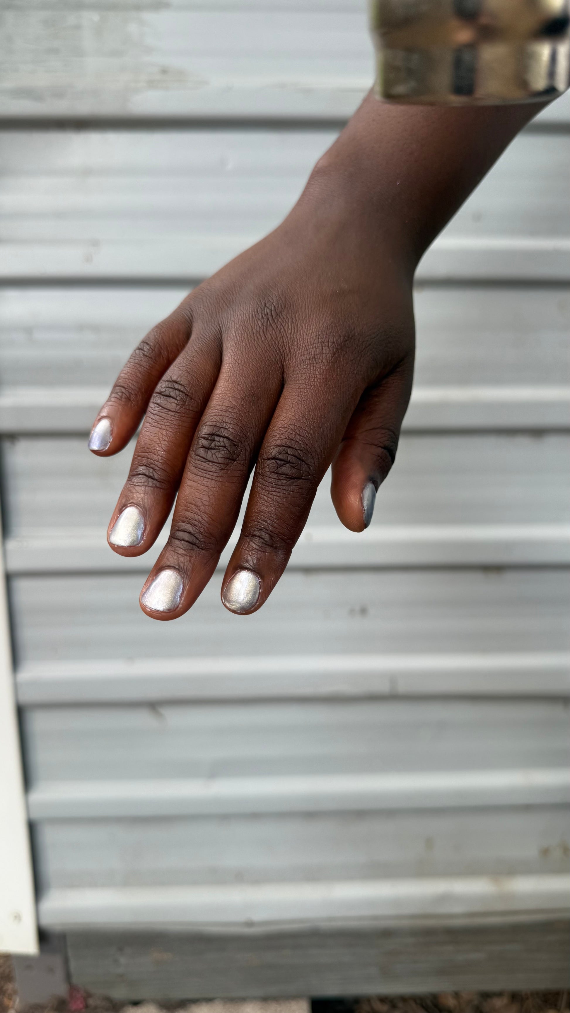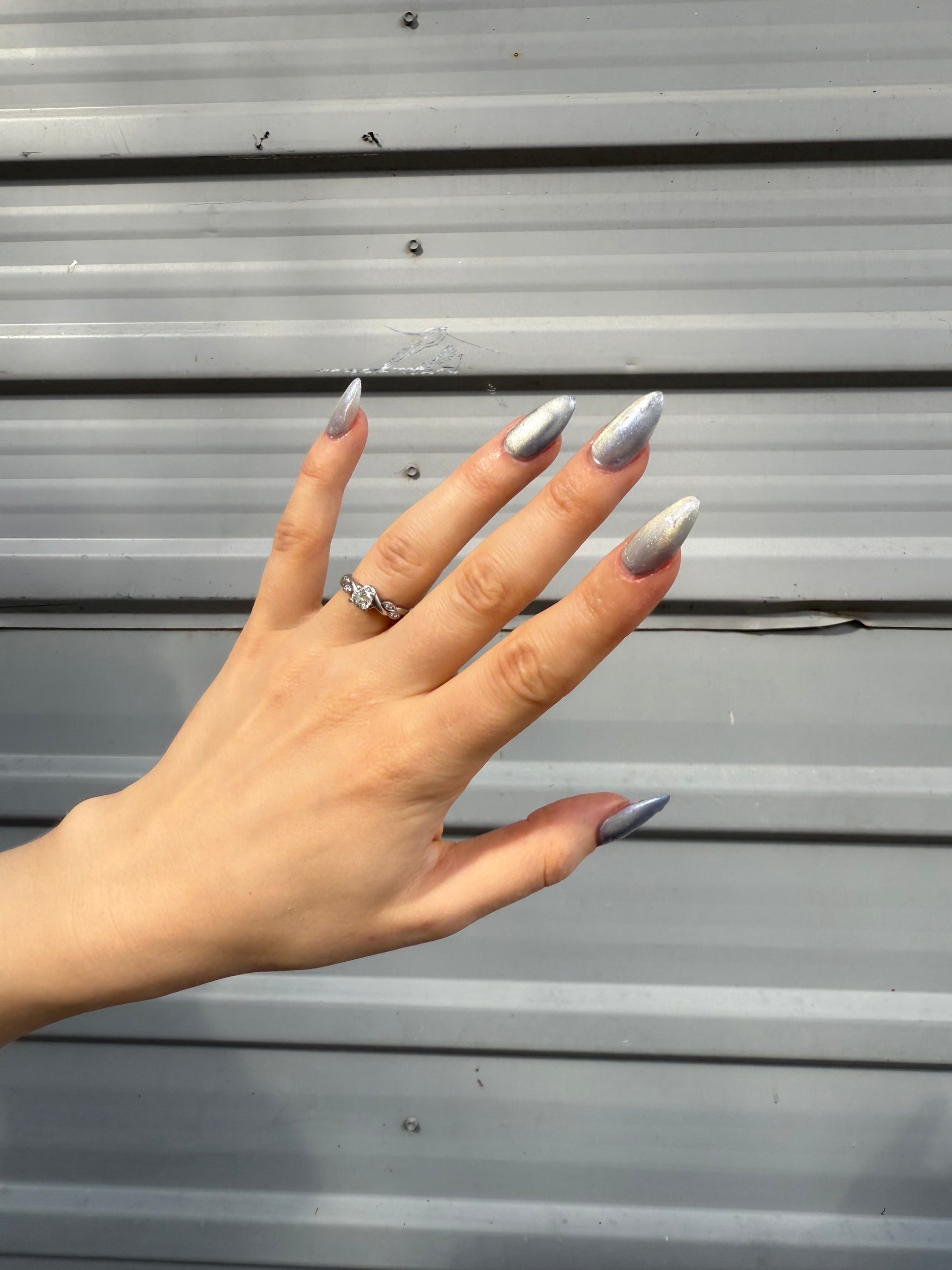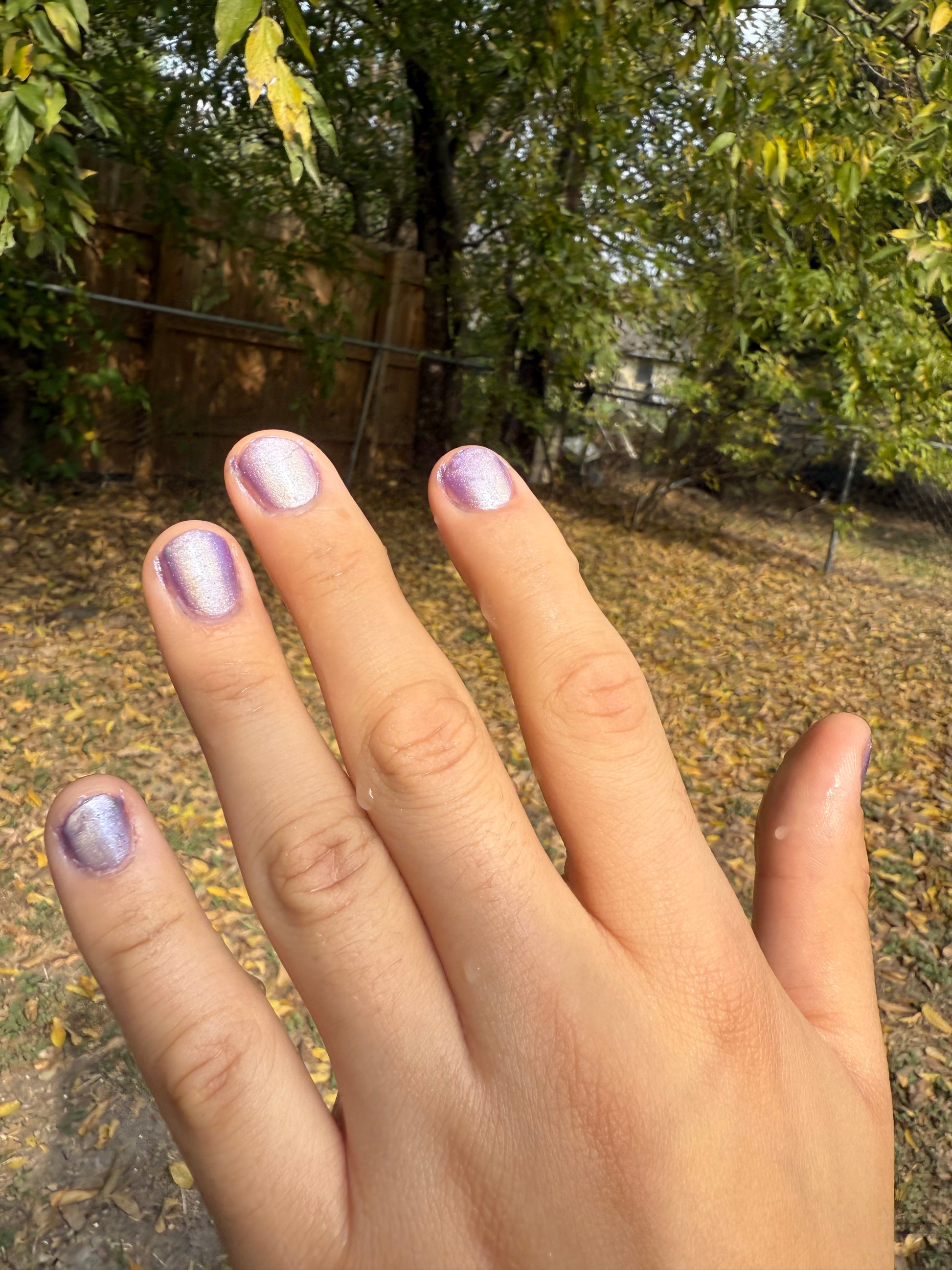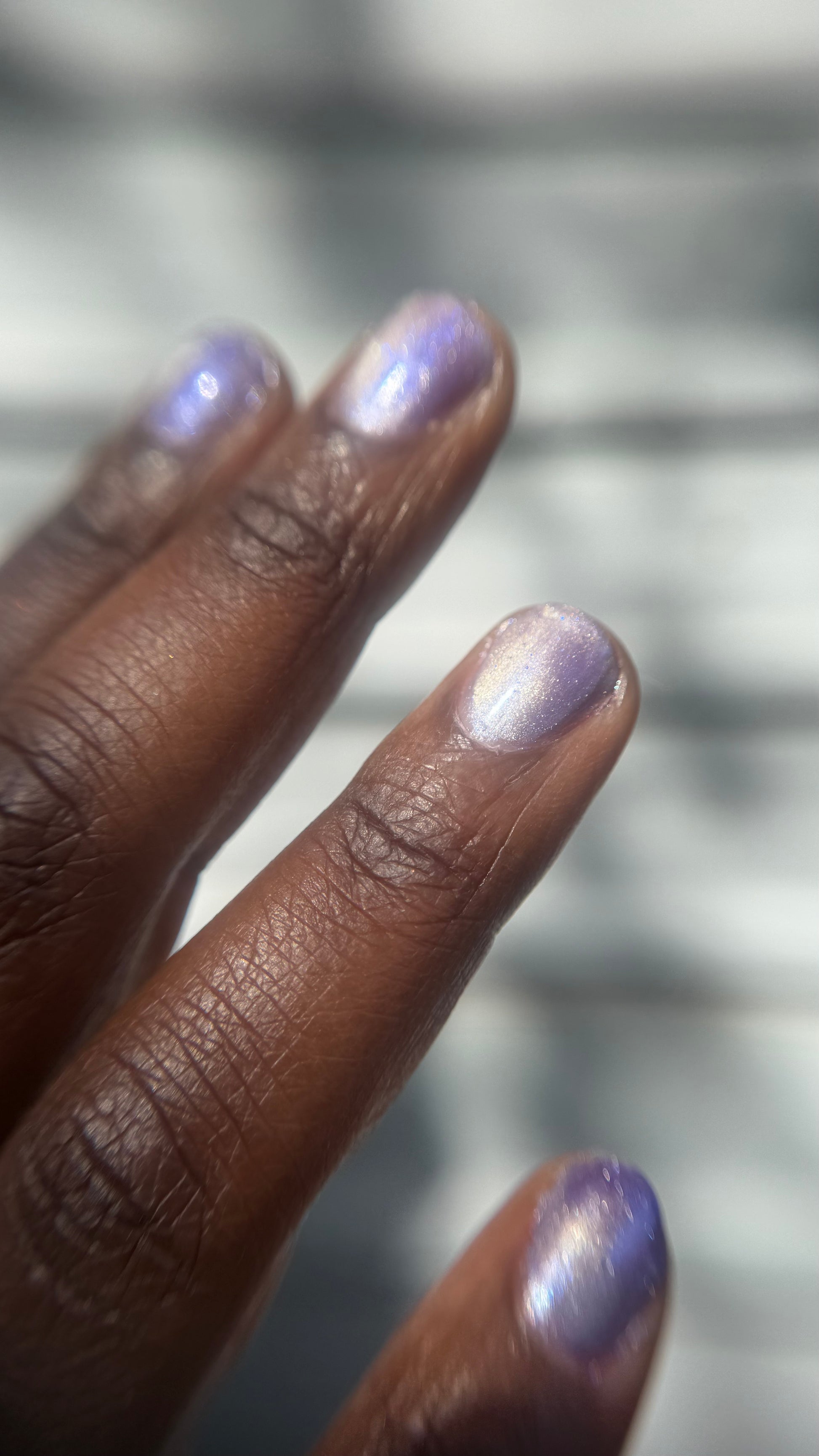-Hot magnetized - The iris purple base becomes pale silver-lilac and the magnetized strip looks bright champagne-pink.