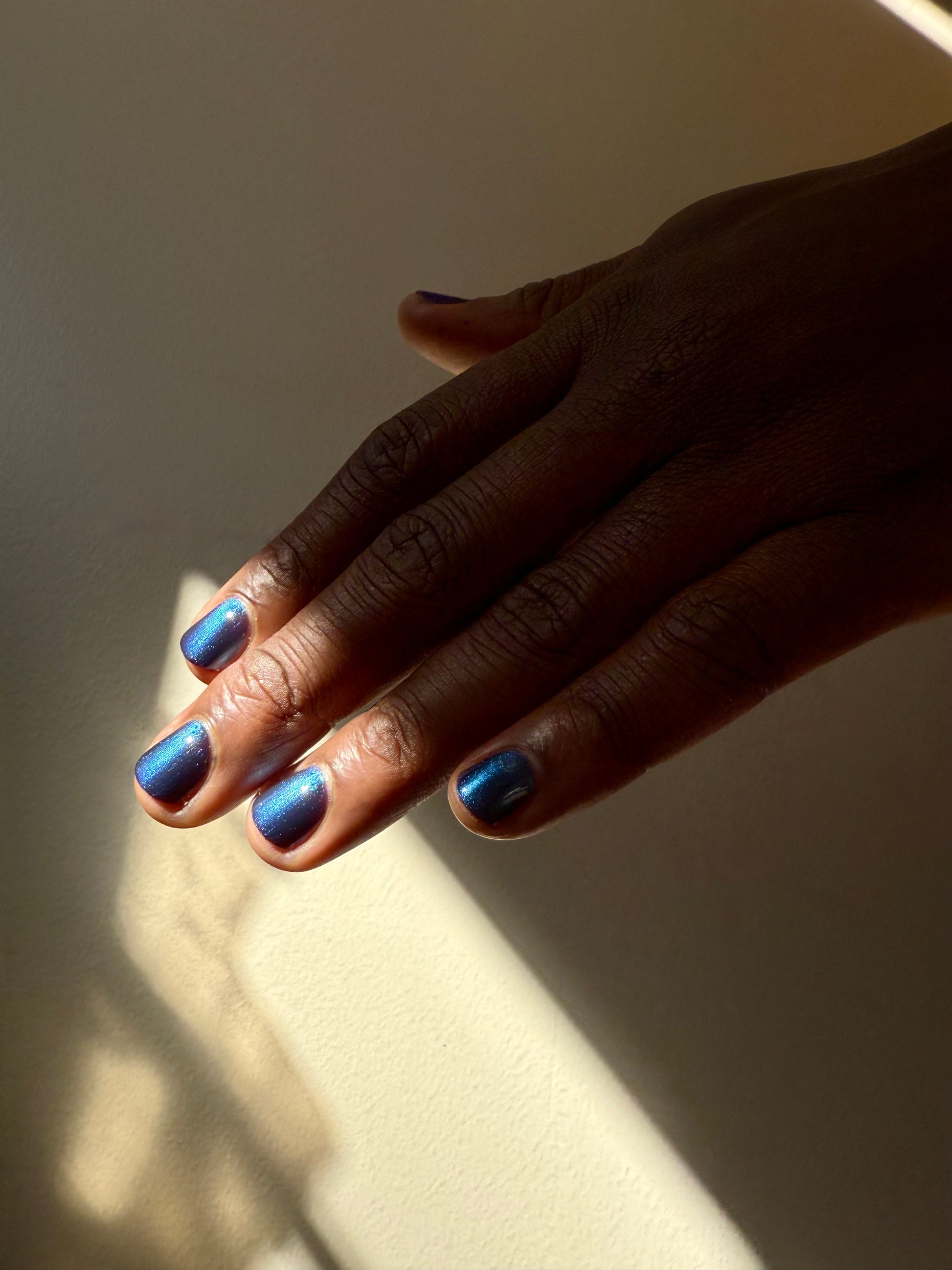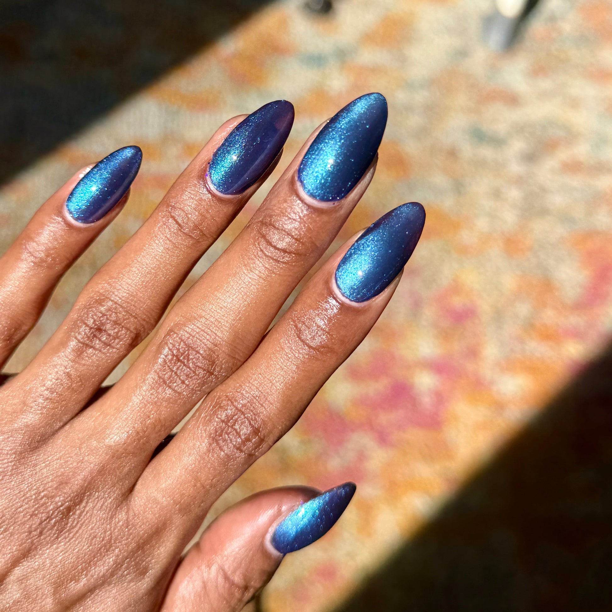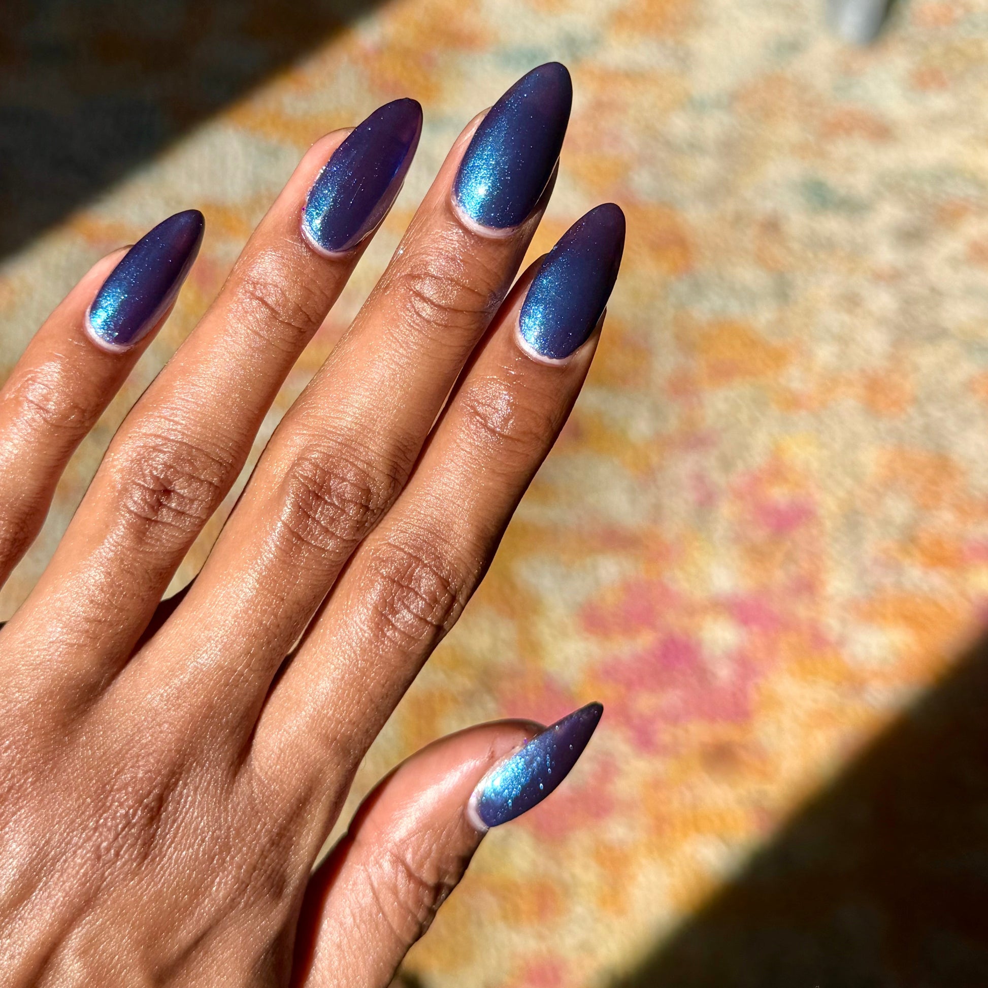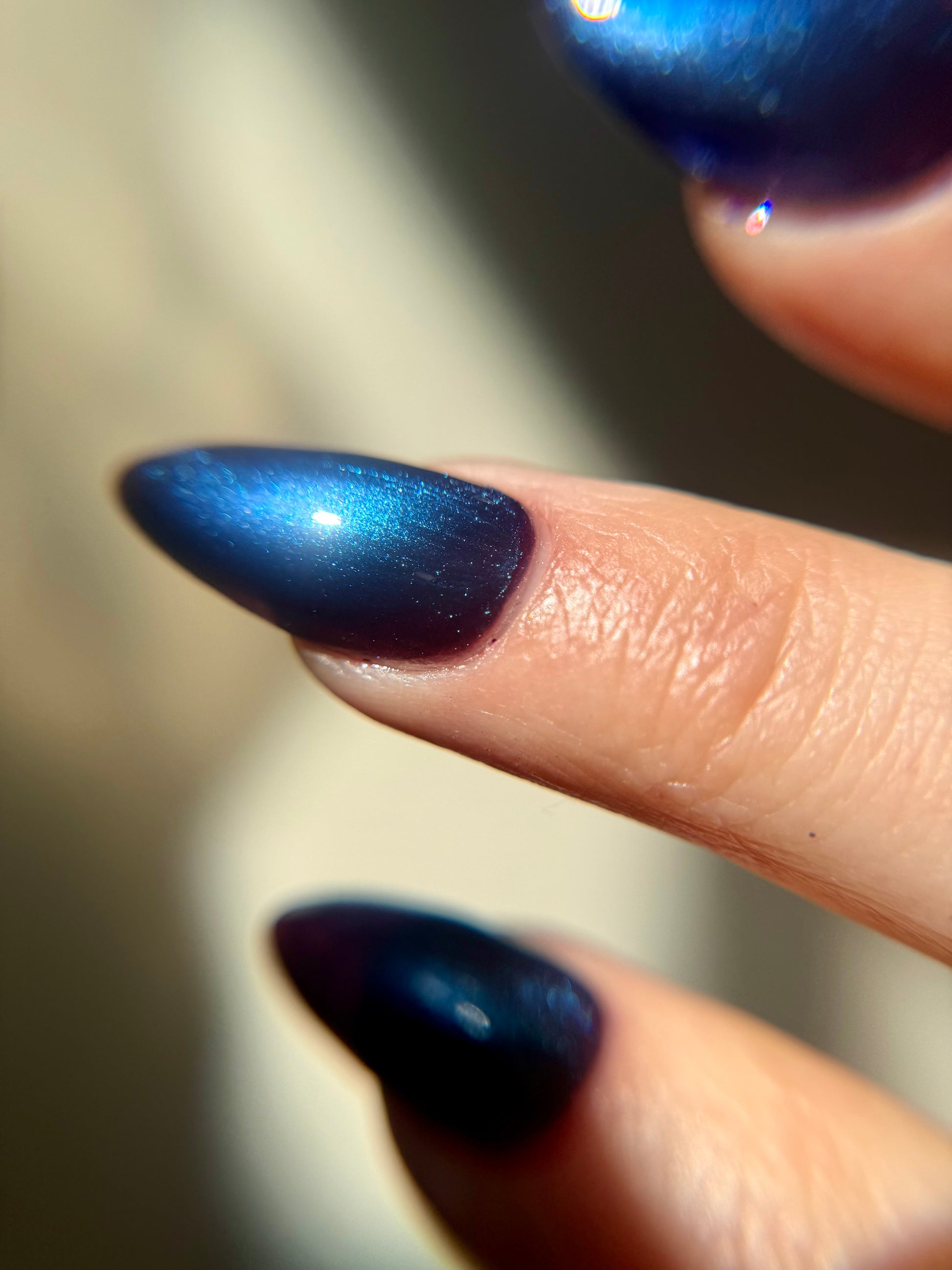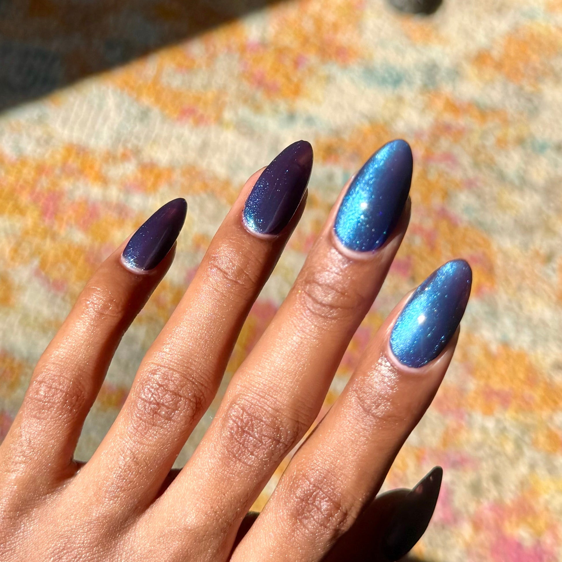 Cool toned plum-brown base with bright steel-blue magnetic pigment. Moonlight cast over tilled soil. Moody and ethereal.